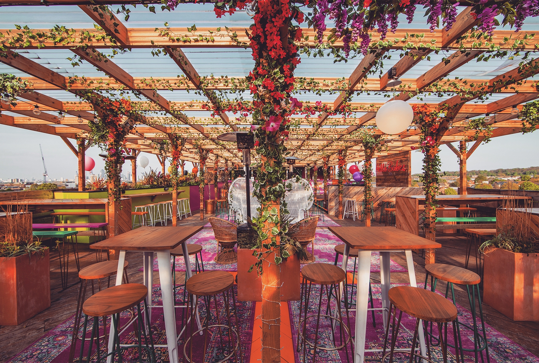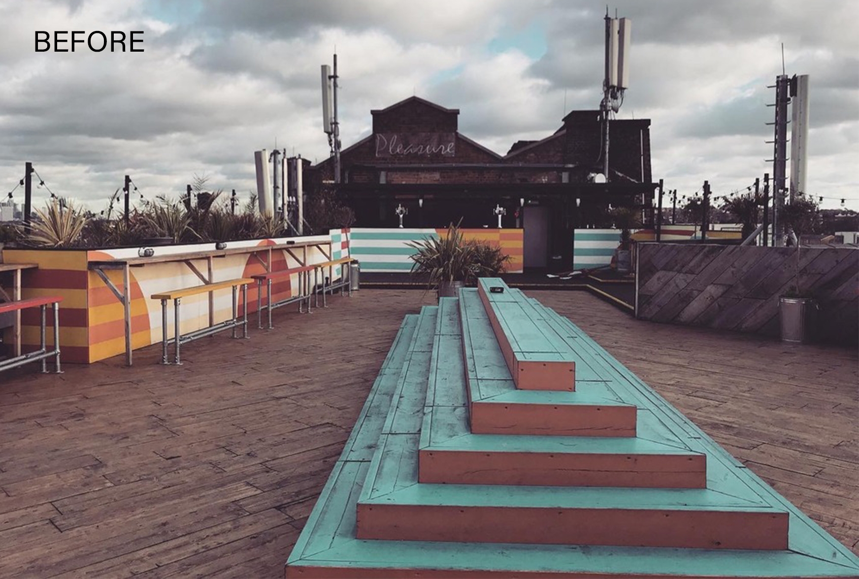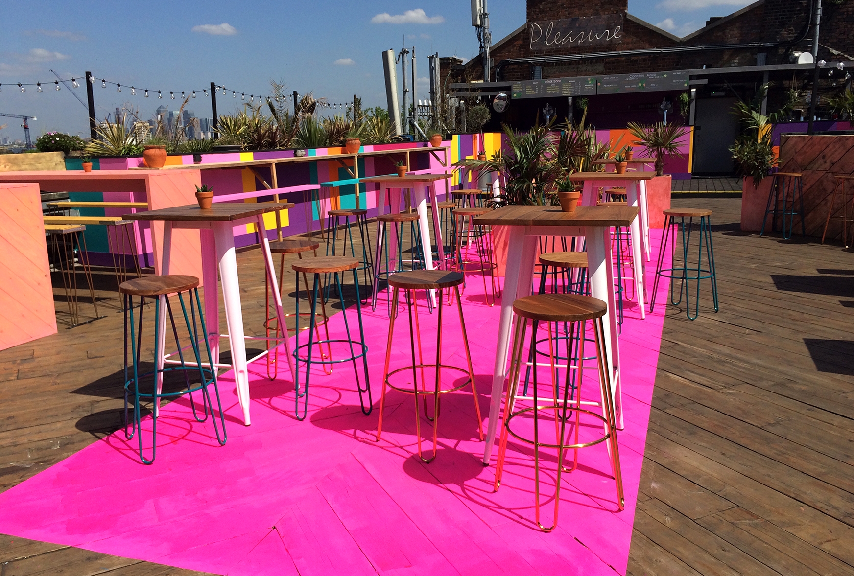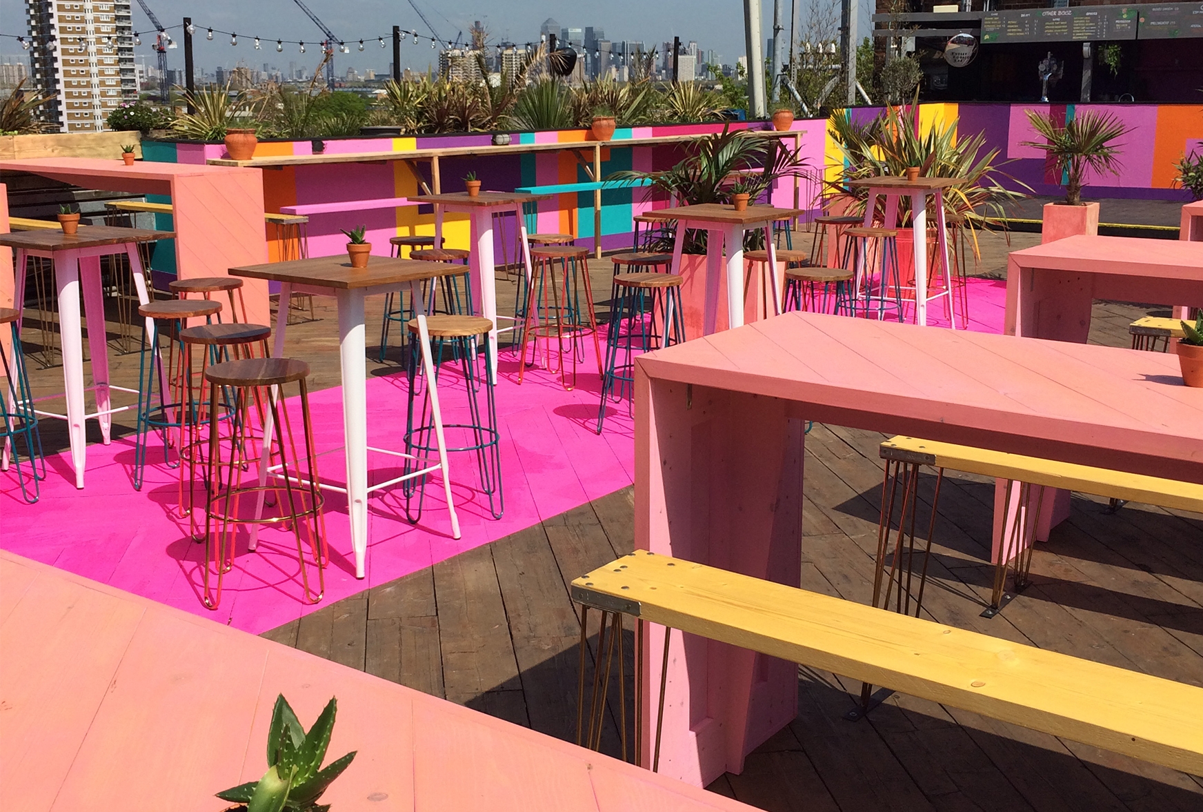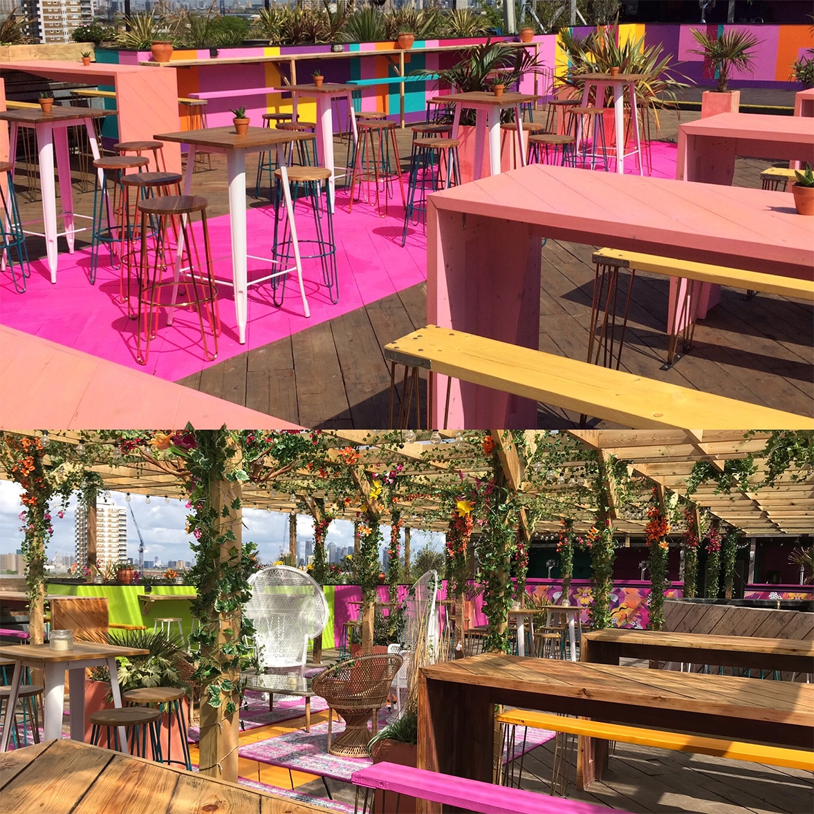 An historical building in South London that occupies a rooftop area with views that overlook the city. In contrast to its urban surroundings, the design intention was to create a colorful installation that created a huge contrast to the saturated views.