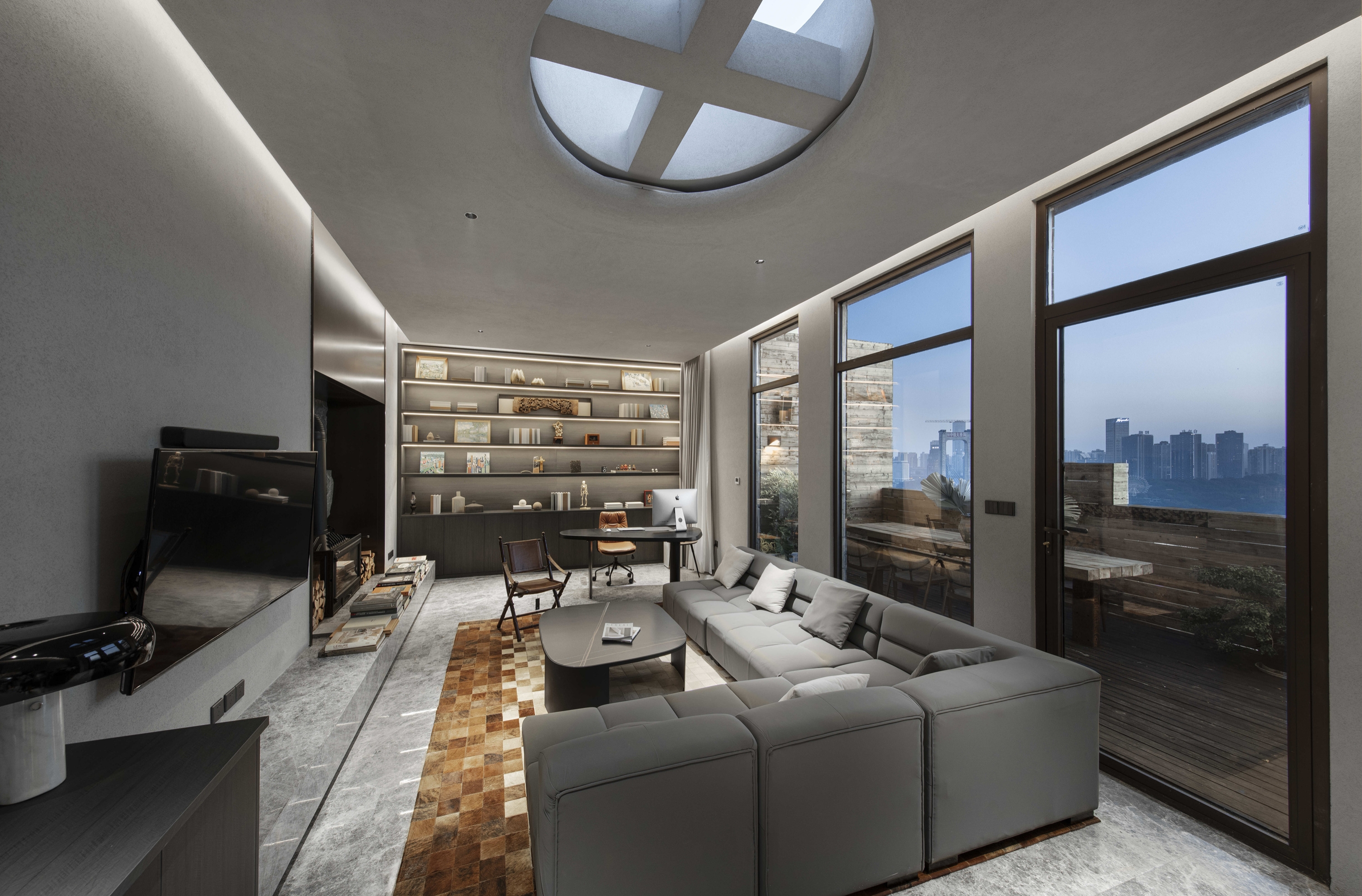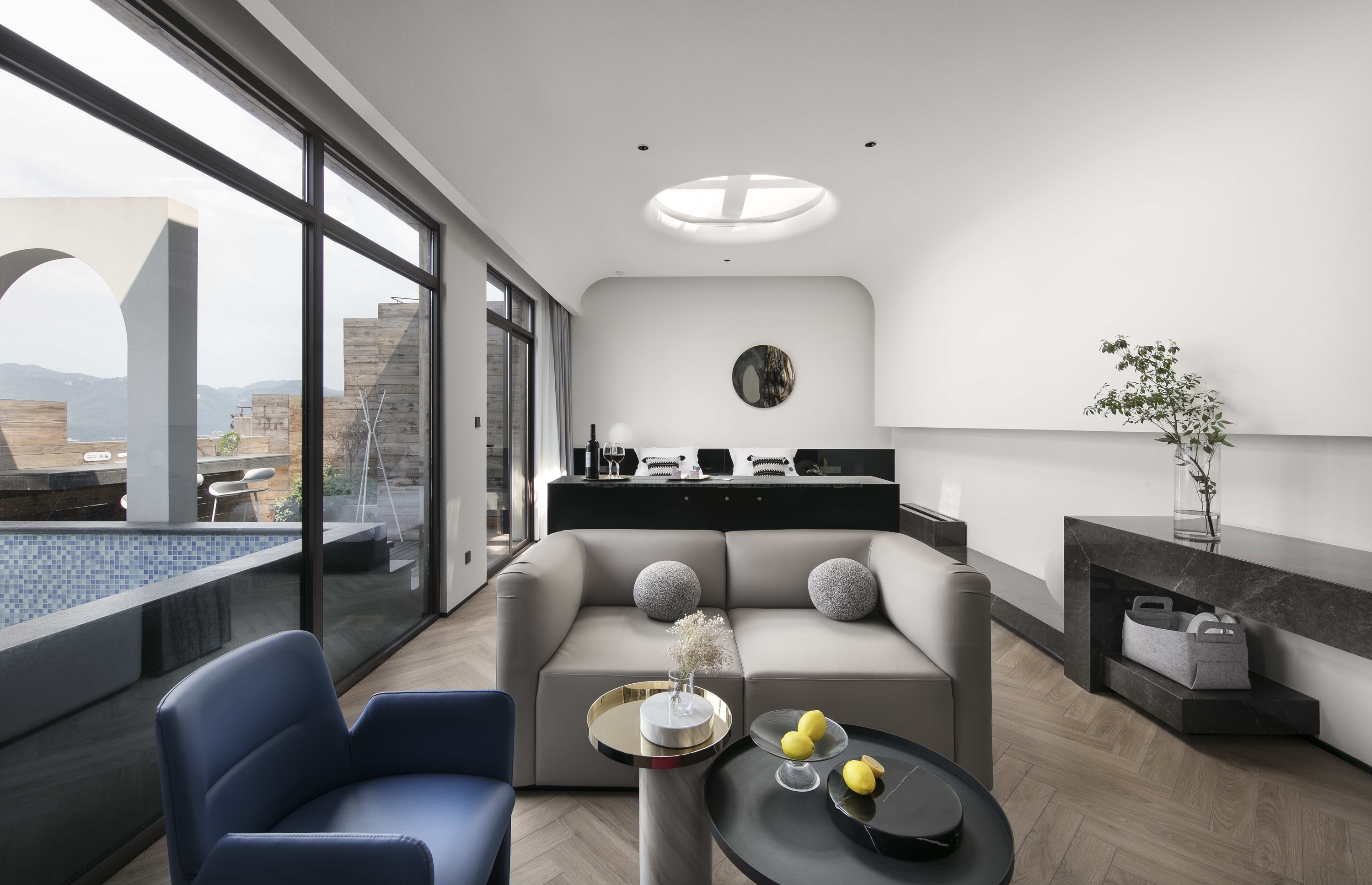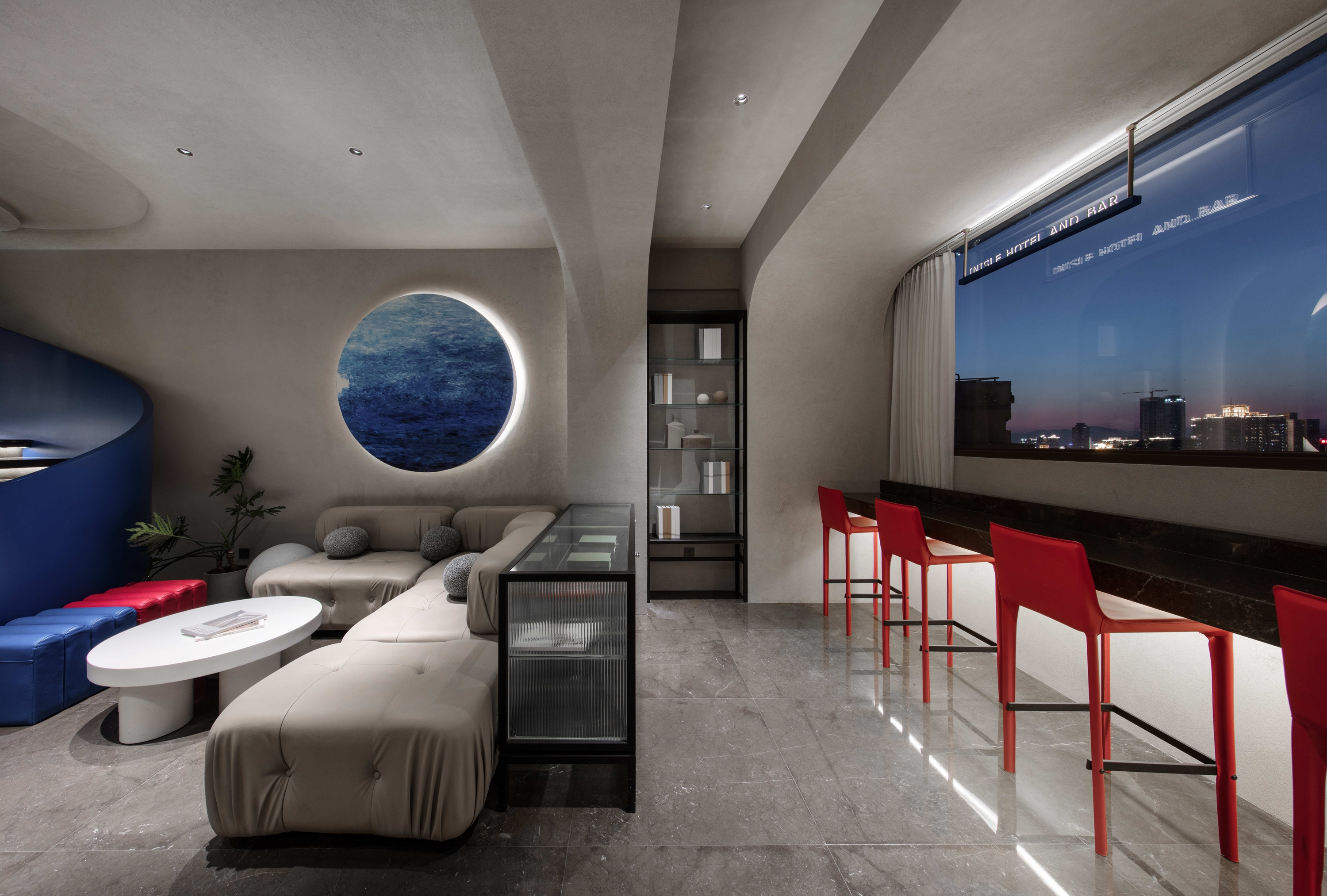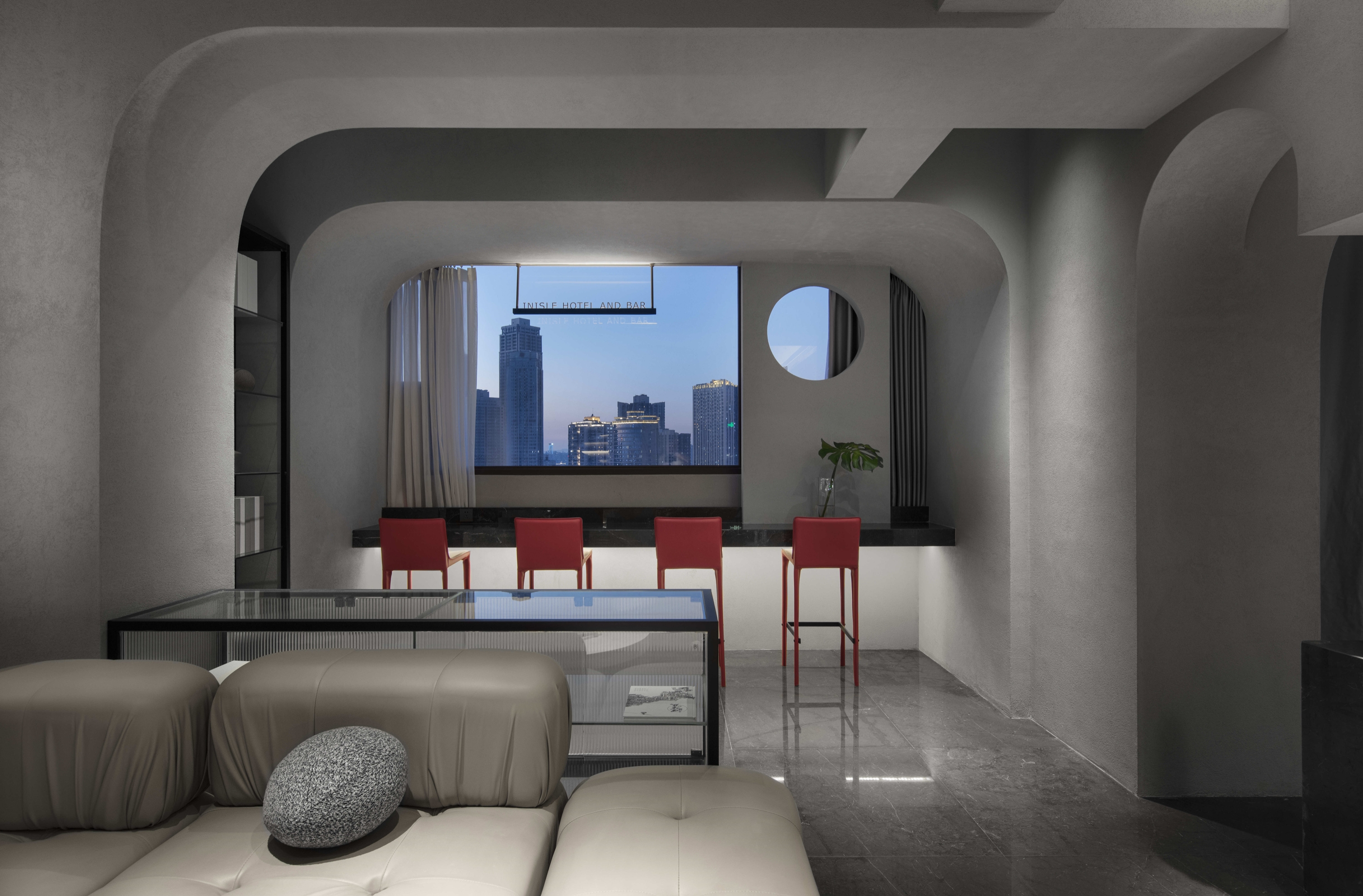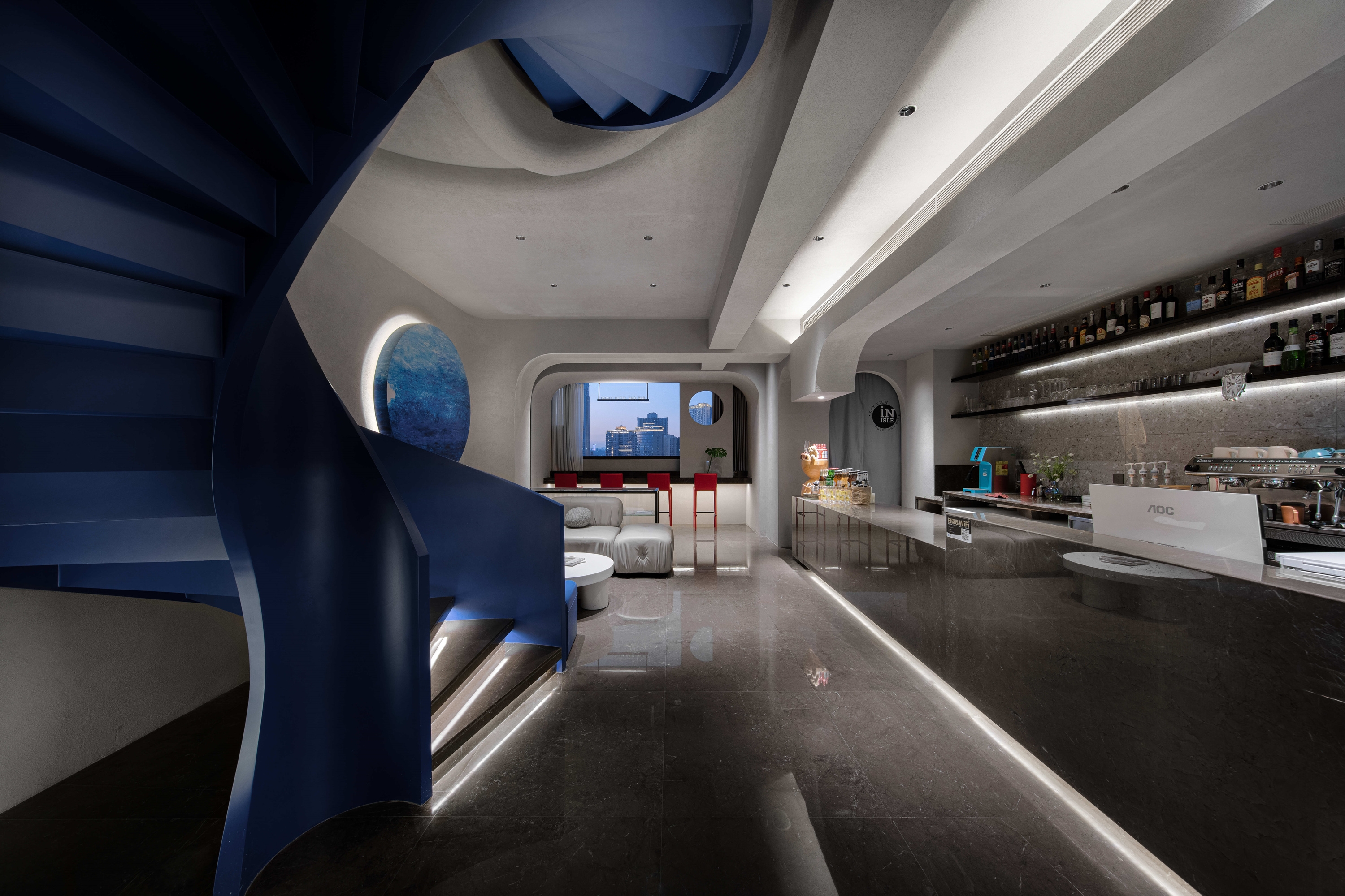 INisle Skyview Hotel And Bar, located on the 38th floor of the core scenic spot of Chongqing Yuzhong Peninsula, is one of the most fashionable designer hotels in downtown Chongqing. It boasts a 360-degree magnificent night view And vast river And mountains. It follows the concept of "MAN, DWELLS ON THIS EARTH POETICALLY-HEIDEGGER". The overall design style is simple, fashionable and poetic, with grey and white as the key, Prussian blue as the main color, Renaissance architectural elements, through the interpretation of modern context, to create a fashionable, soft atmosphere of the space.