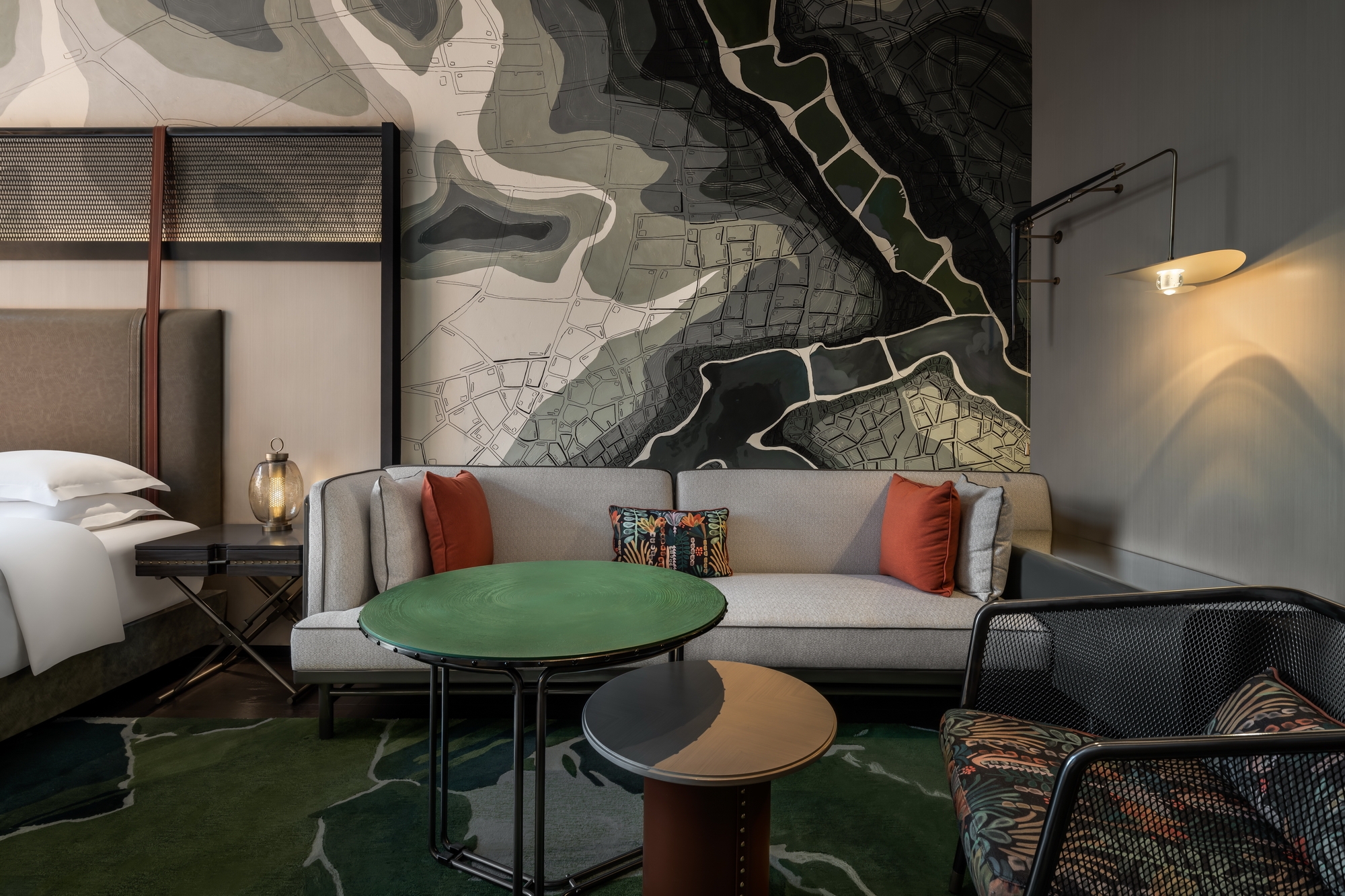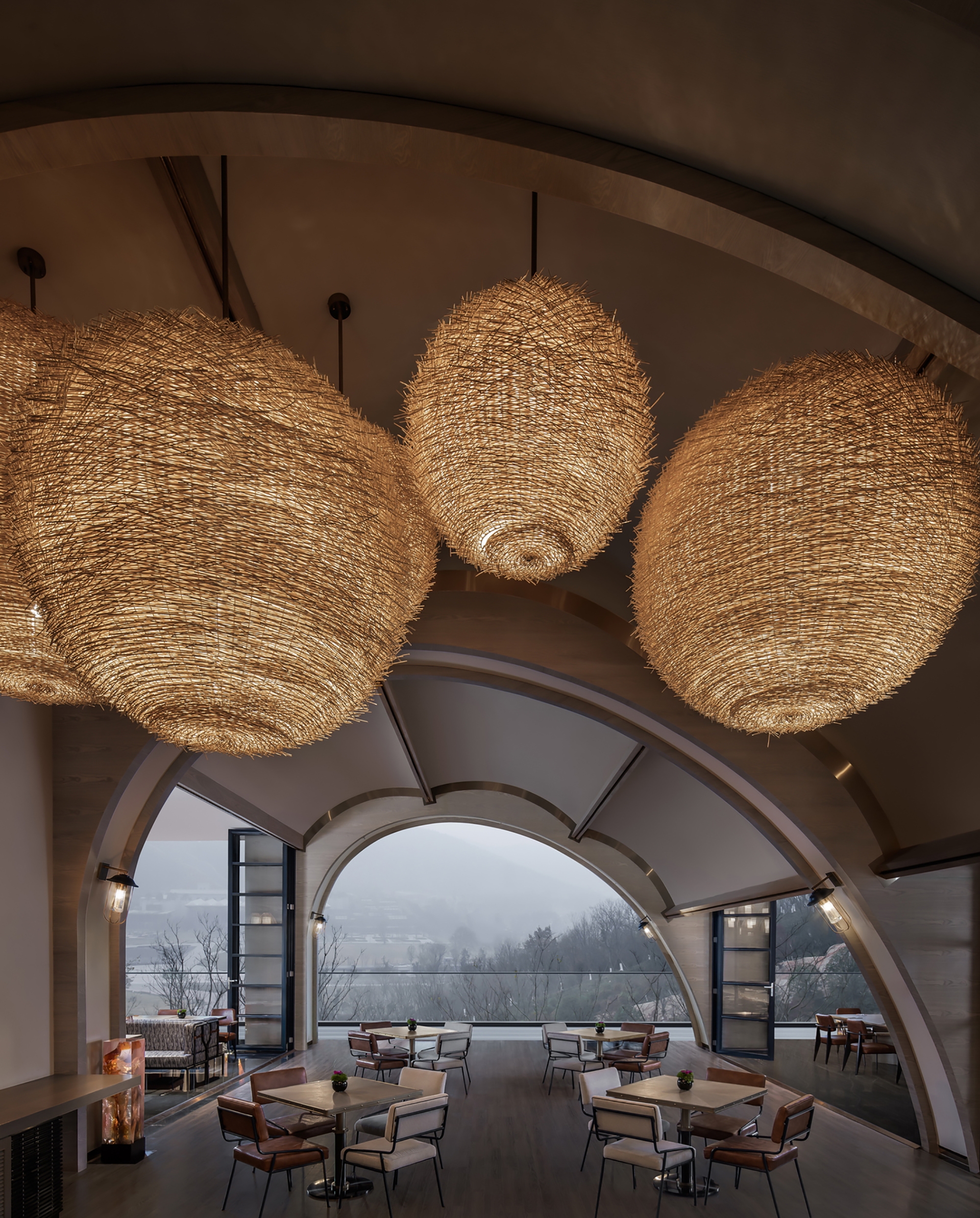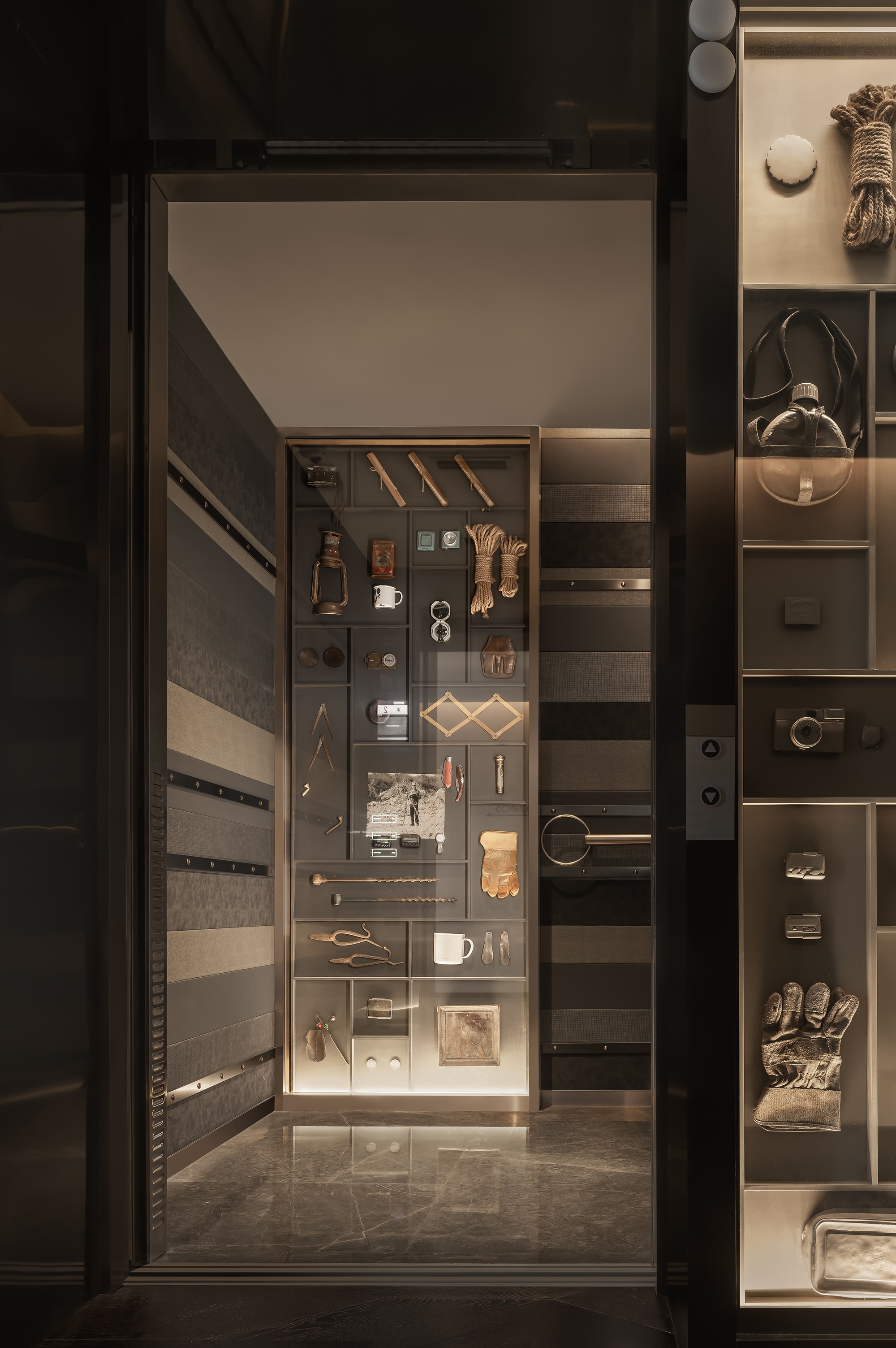 The adoption of colorful glass, metal mirror and acrylic creates a forest-like mood in the lobby area. The design of the lobby bar and the ADD restaurant is inspired by bonfire, miner’s lamp, and the arc shape of the tent, creating a cozy and relaxed atmosphere. The lift lobby and the corridor are transformed into mini exhibition halls for exploration instruments. With the theme of “natural recovery,” the guest rooms bring in forests, plants, and mosses. The minibars and nightstands in the rooms are in the form of mining toolboxes, blended into the surroundings. While delivering the spirit of the place, the design aims to draw attention to the protection of the geological environment in Tangshan.