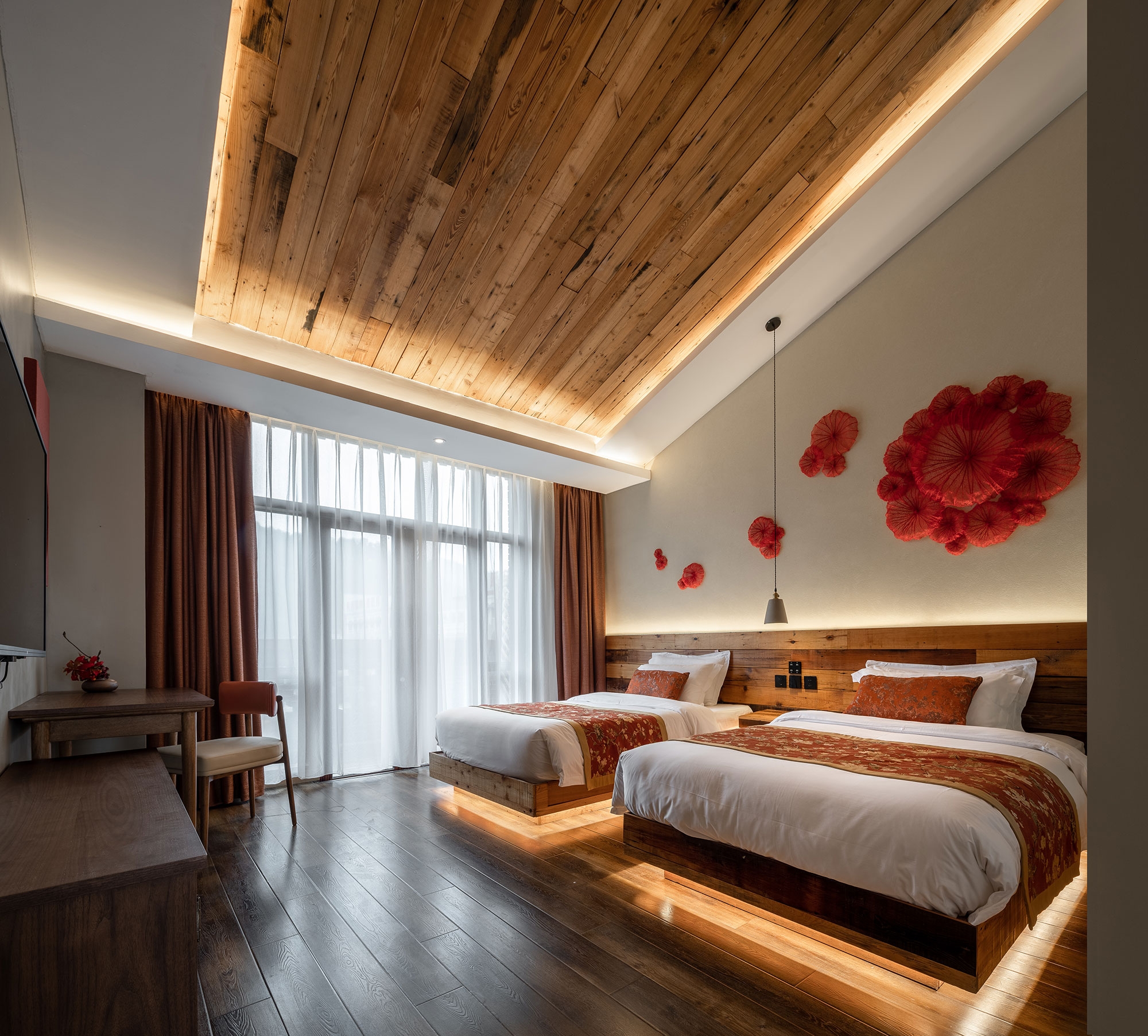 Since the change of space function brings about the change in space requirement, the design should satisfy the primary living needs and create different themes for different room types. The independent rooms need to be changed into living space that is different from the dwelling in daily life. Secondly, it is the processing of spatial scale. The transparent space brings new possibilities for scale creation. Creating a hospitality place with scale changes is a rethinking of bodyness. Thirdly, it is the limitation of spatial behavior. Creating a dramatic contrast to daily life requires defining human behavior in the space, the design needs to create a space that is both congregated and separated, allowing new and unpredictable behaviors to emerge spontaneously.