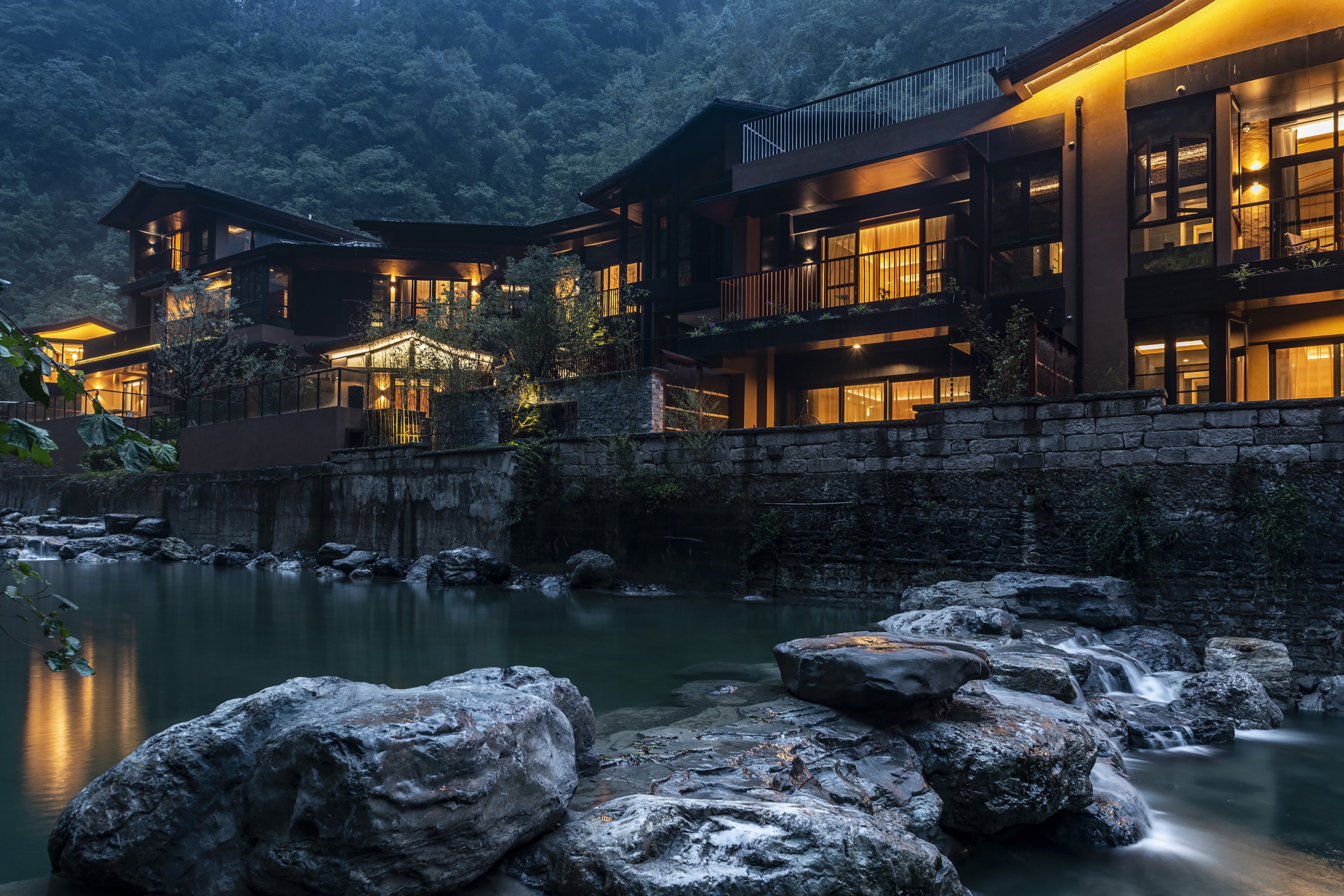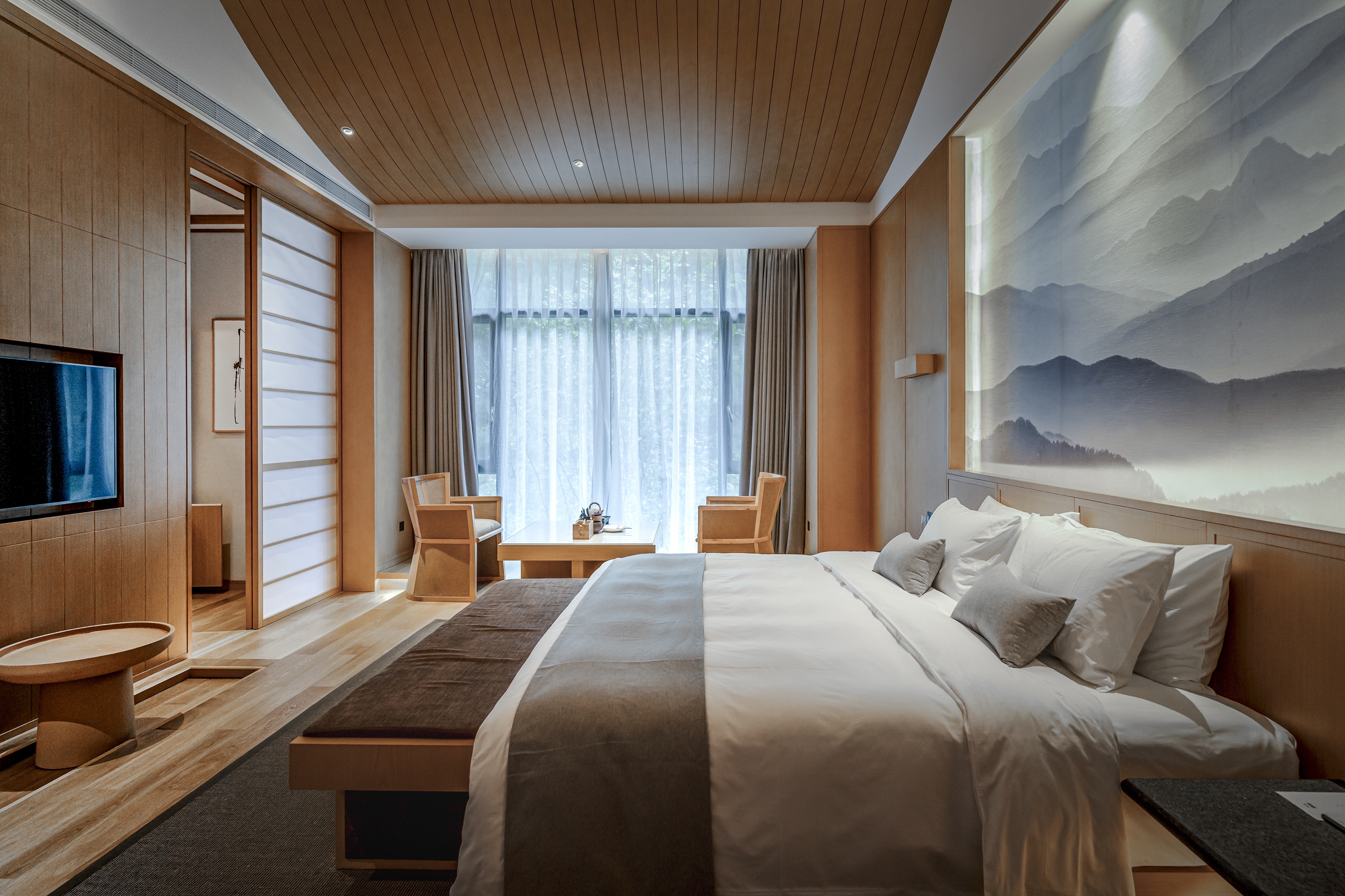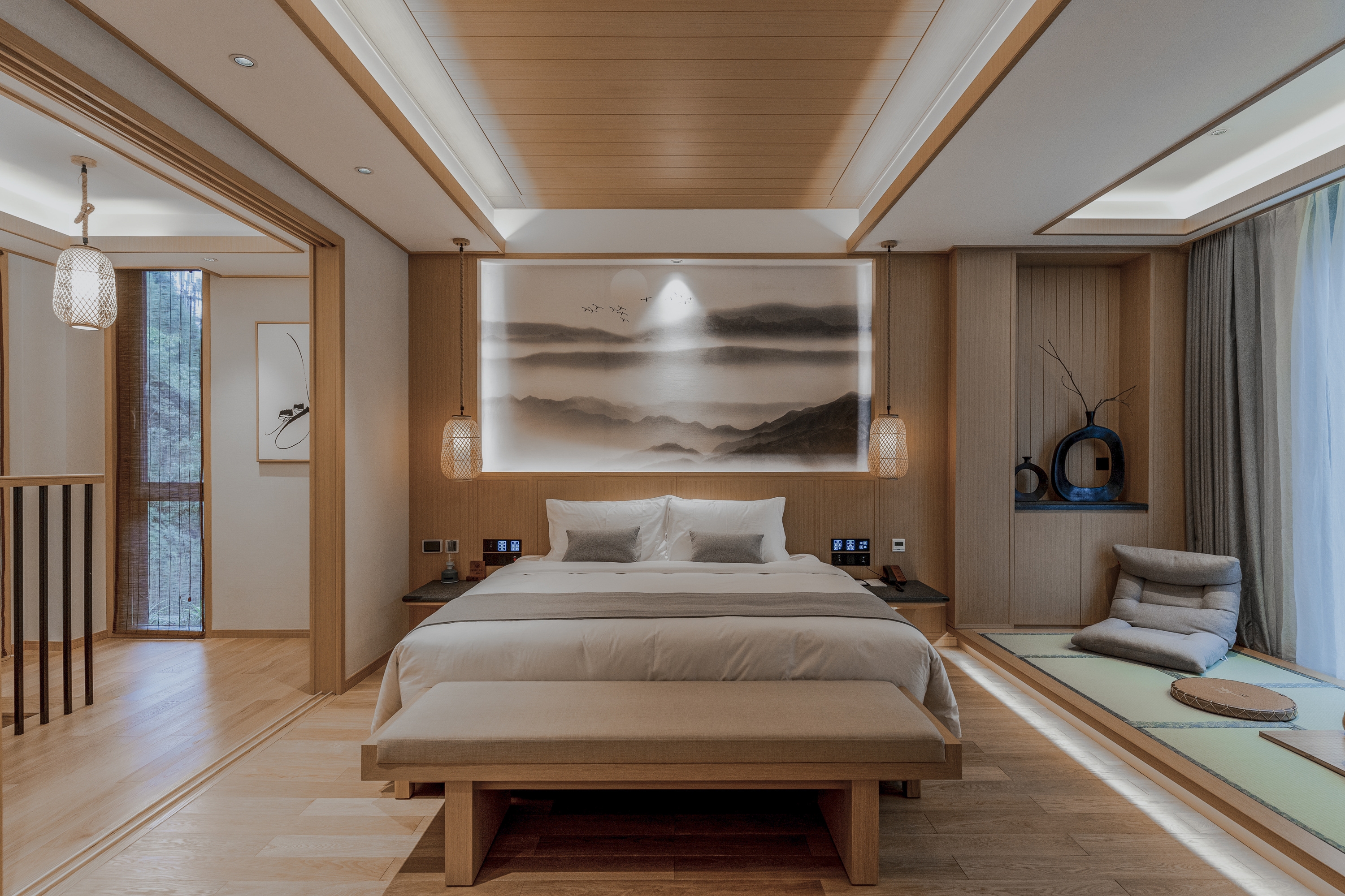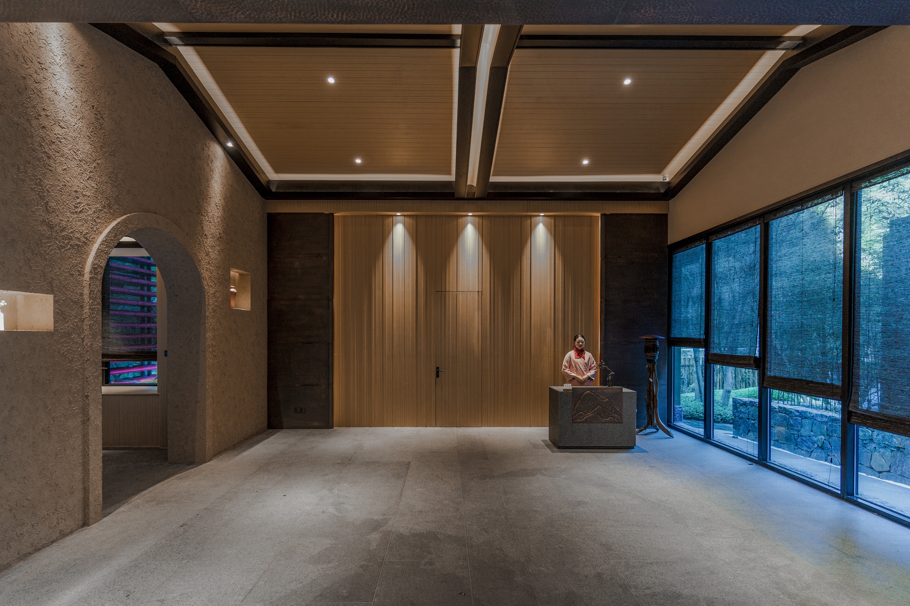PUSHINE is located in Jinfo Mountain, NanchuanDistrict, Chongqing. The whole hotel is symbioticwith nature, creating an extremely secludedenvironment of Zen. In accordance with theBuddhist and Taoist principles, Pushine treatsguests with "Zen", aiming at conditioning the tiredguests' body and mind, cleansing the inner chaosand makine their thoughts become calm. The shape of light and shadow, space and materia the hotel building is a long shape based on the surrounding environment, in accordance with the mountain stream and built in the high and low fields of cottages, Bridges and water, creating a pure,quiet, profound space feeling. Continuing the overall integration of Japanese Zerstyle and modern minimalist style, natural light is the soul of Japanese stvle. In the lobby atrium, arempty patio introduces light into the interior, and fully activates the interaction between sunlight anc the colors inside the space. The simple spatial hierarchy is the aesthetic appeal of modern people.