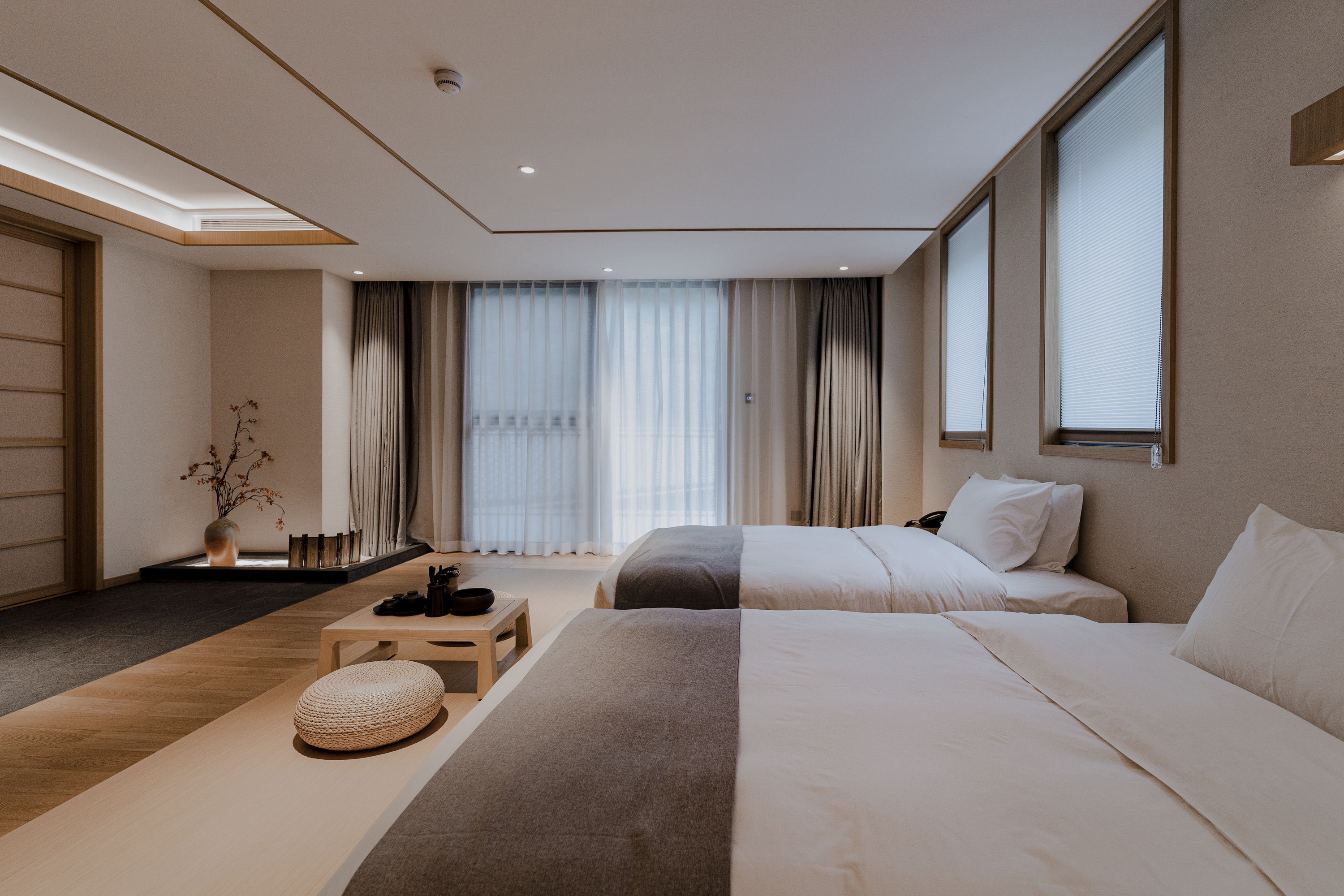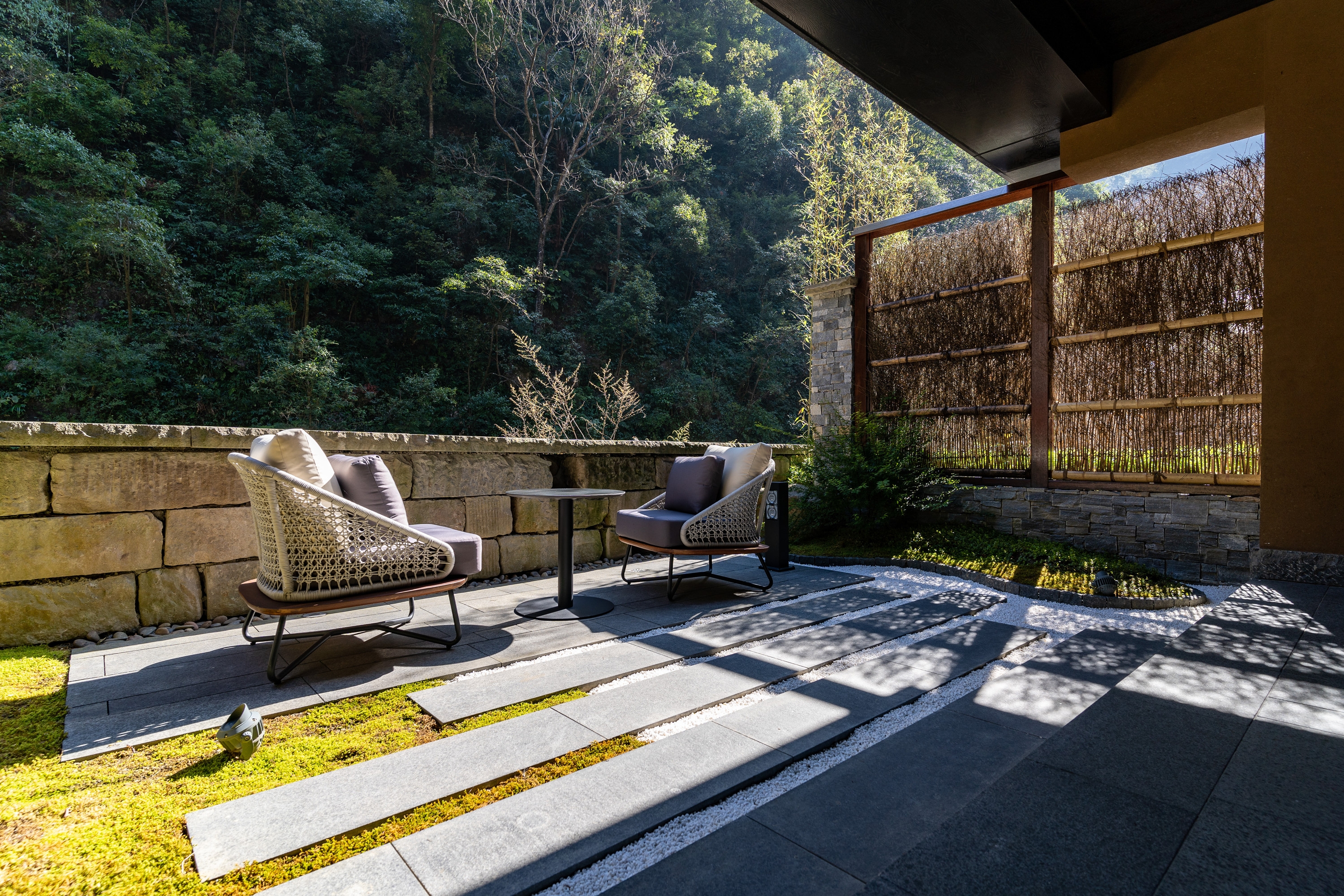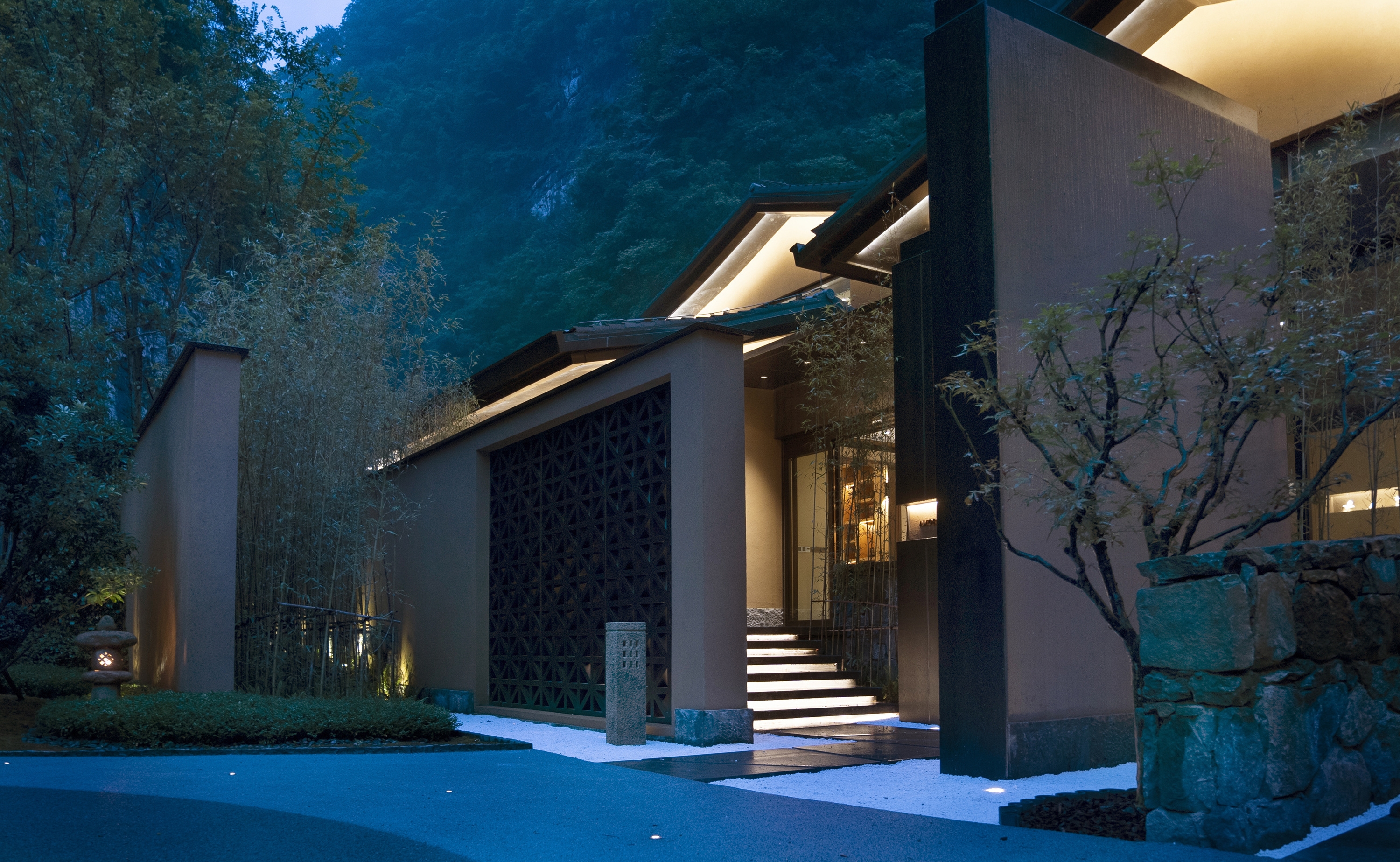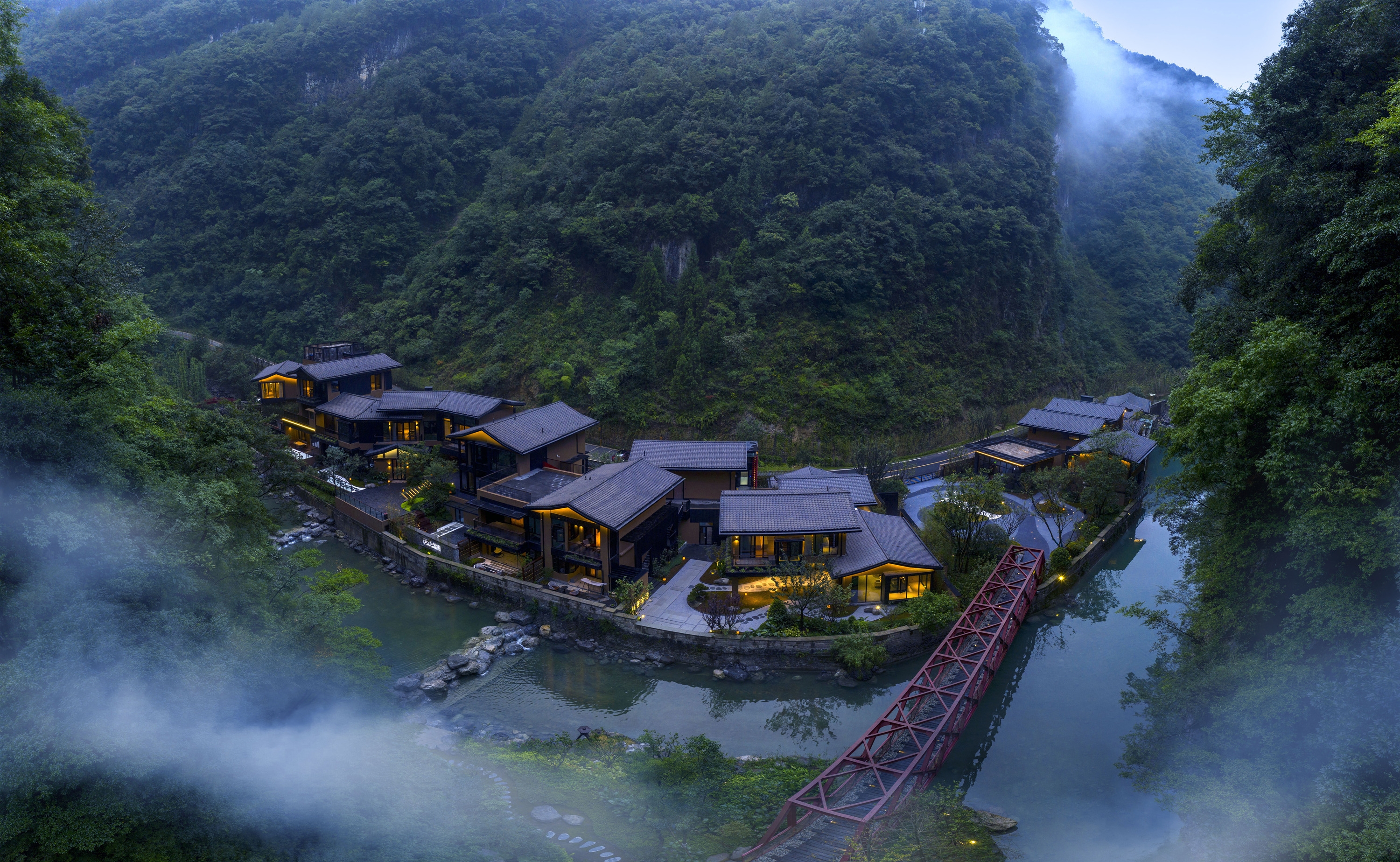 PUSHINE is located in Jinfo Mountain, NanchuanDistrict, Chongqing. The whole hotel is symbioticwith nature, creating an extremely secludedenvironment of Zen. In accordance with theBuddhist and Taoist principles, Pushine treatsguests with "Zen", aiming at conditioning the tiredguests' body and mind, cleansing the inner chaosand makine their thoughts become calm. The shape of light and shadow, space and materia the hotel building is a long shape based on the surrounding environment, in accordance with the mountain stream and built in the high and low fields of cottages, Bridges and water, creating a pure,quiet, profound space feeling. Continuing the overall integration of Japanese Zerstyle and modern minimalist style, natural light is the soul of Japanese stvle. In the lobby atrium, arempty patio introduces light into the interior, and fully activates the interaction between sunlight anc the colors inside the space. The simple spatial hierarchy is the aesthetic appeal of modern people.