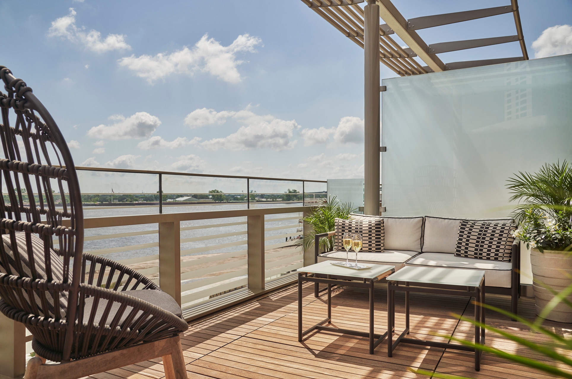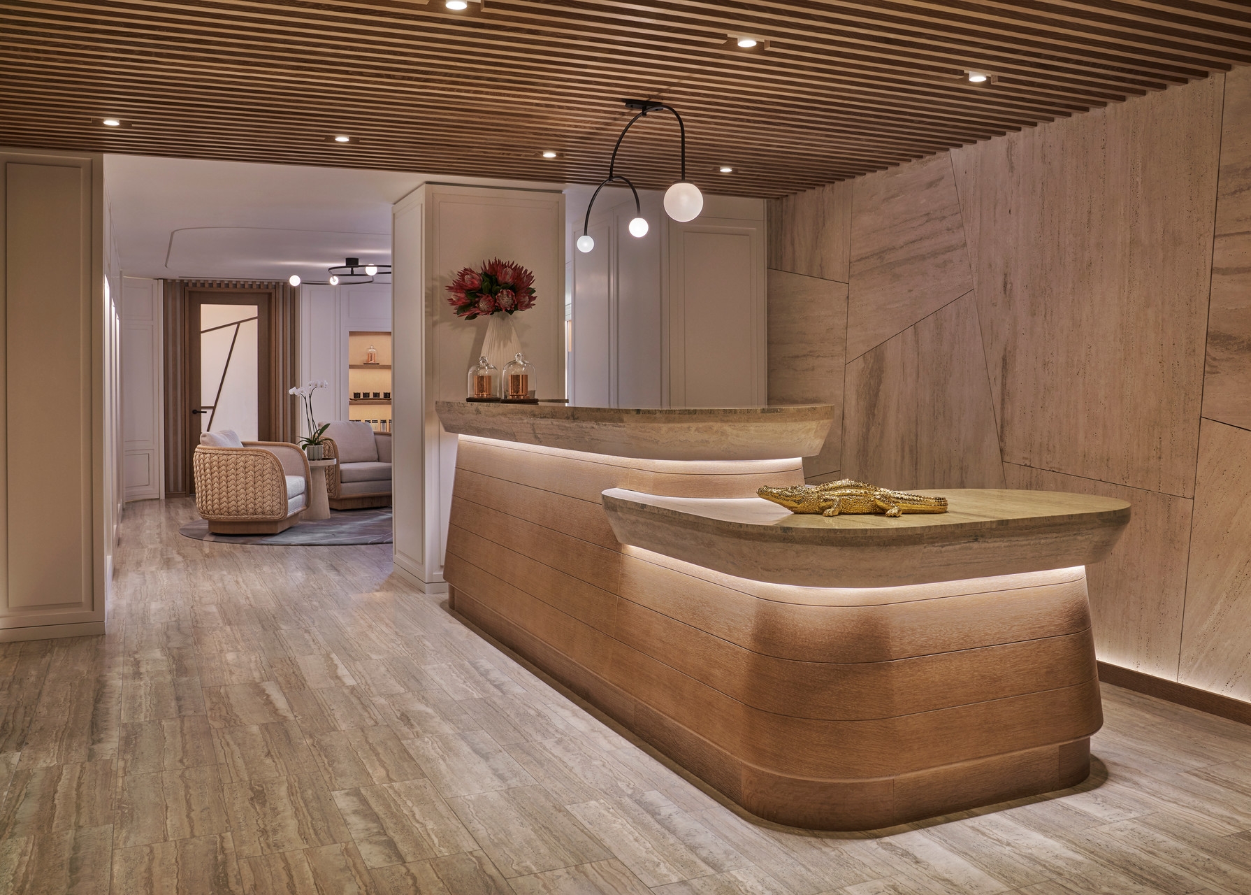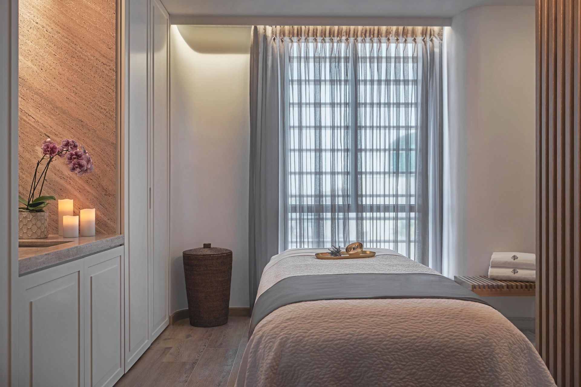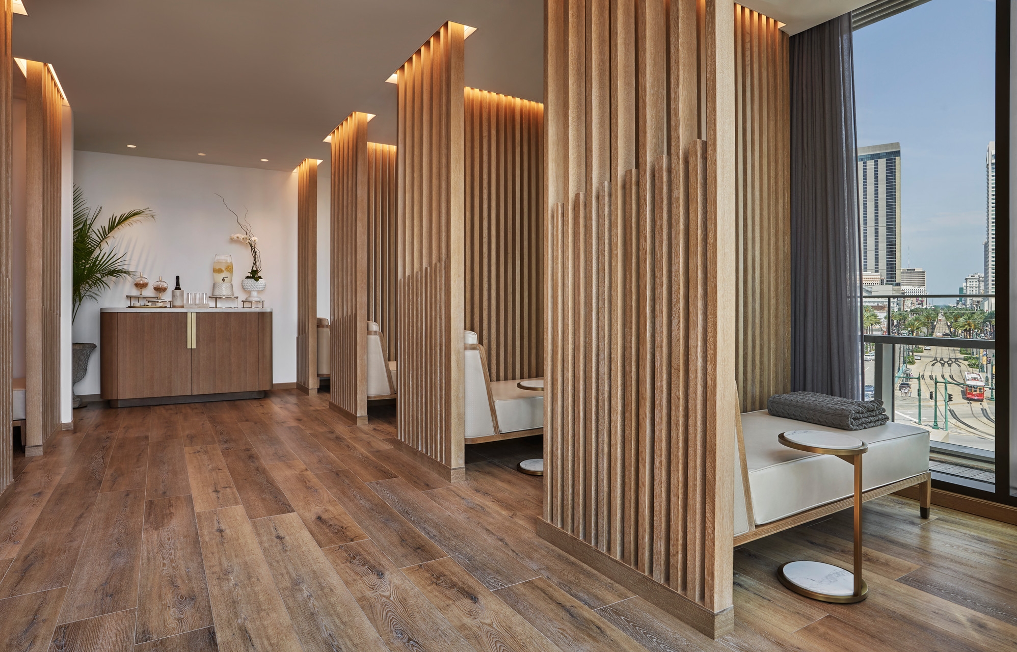 The Four Seasons Hotel New Orleans is uniquely perched above the Mississippi River. The mood at the spa is calm using shiplap oak making a slight connection to New Orleans juxtaposed with the organic forms and patterns. Light and soft travertine stone flooring and ambient lighting create and interior mood of tranquility with select views of the Mississippi River.