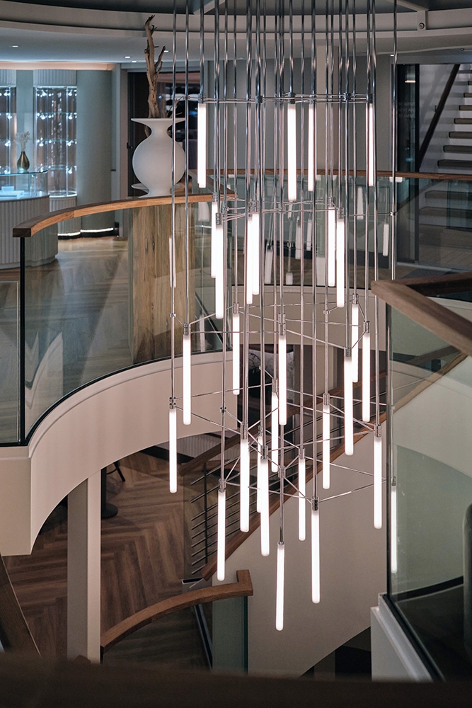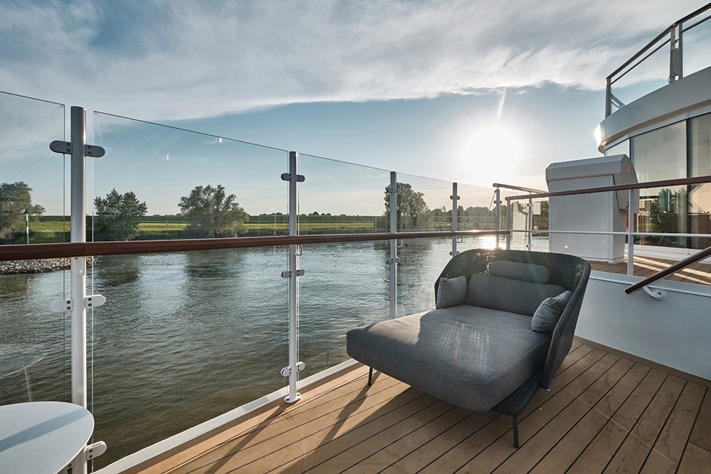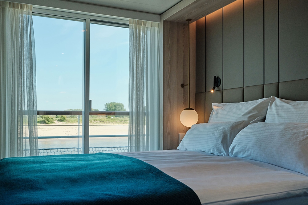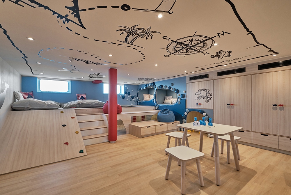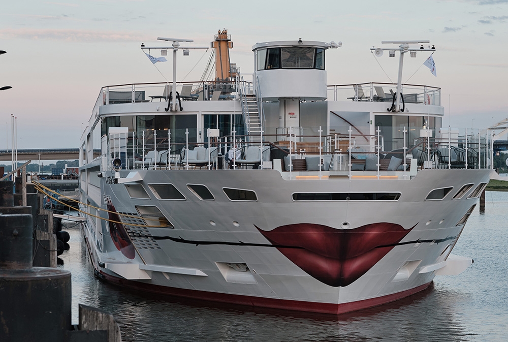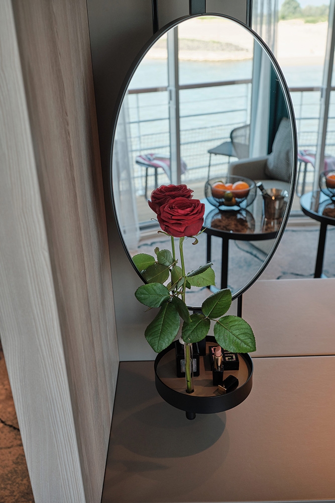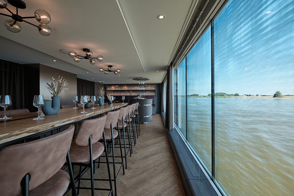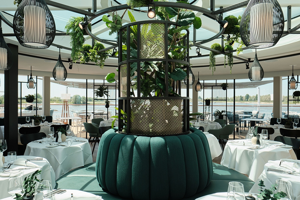 The designers’ land-based flair informed A-ROSA’s new-build, 4-interior level, prototype river vessel SENA aimed at multigenerational families & 40-60-year-olds. The Rhine’s largest vessel reinvents river cruising yet preserves slow travel as an antidote to ‘city hopping.’ Natural finishes make the vista centre stage & suggests residential yachts. Leather, wood & copper give the GRILL warmth; the PAVILION’s rotunda filters sunlight whatever the weather; the MARKET buffet has flexible seating, an exhibition kitchen & a 24-hour café; & wave-like wood fins add drama in the lounge & BAR. The sundeck’s UP AND DOWN BAR recesses into the floor for safety under bridges. Lounge & wingback chairs encircle the spa relaxation room’s fireplace. The 280-pax cabins’ high-end touches include vases for roses presented upon boarding & mirrors with built-in jewellery trays. Watercolour hues harmonise with balconies’ year-round proximity to nature. Dedicated play areas & family cabins are rare on riverboats: bunkbeds with ‘portholes’ encourage imaginations & let adults peek through curtains. Aspects like water bottle refill stations helped SENA win a DISQ German Award for Sustainability Projects 2022.