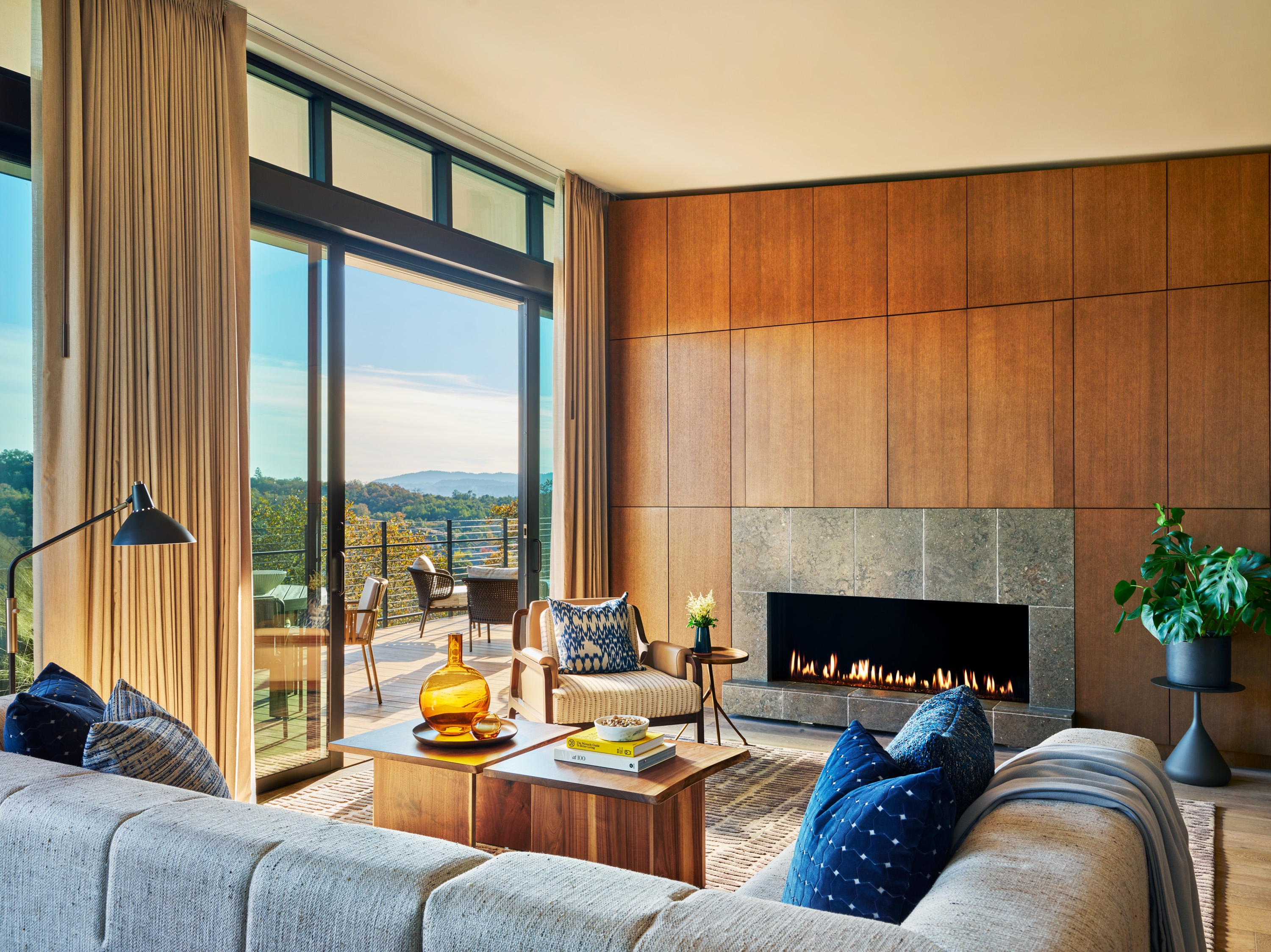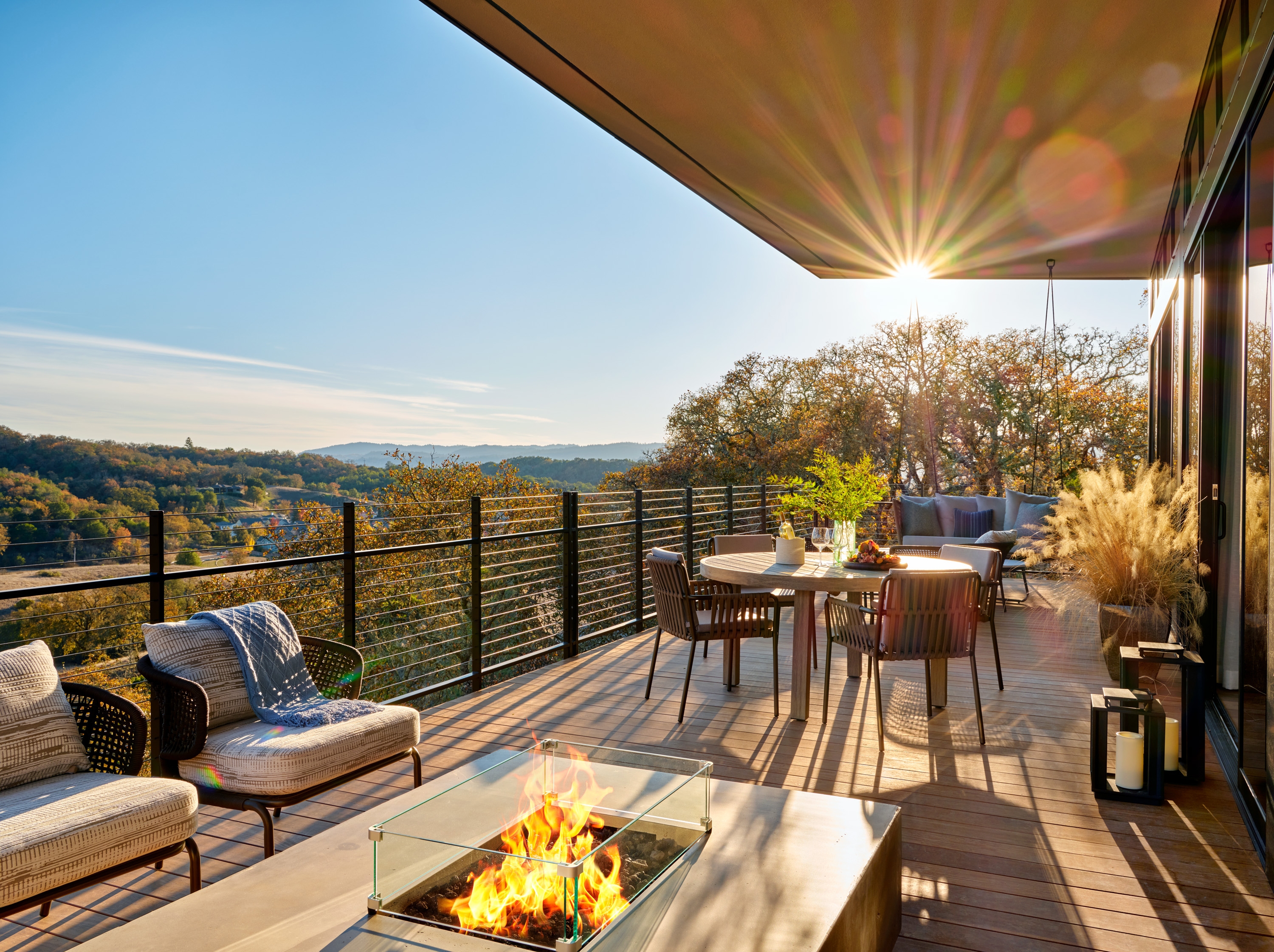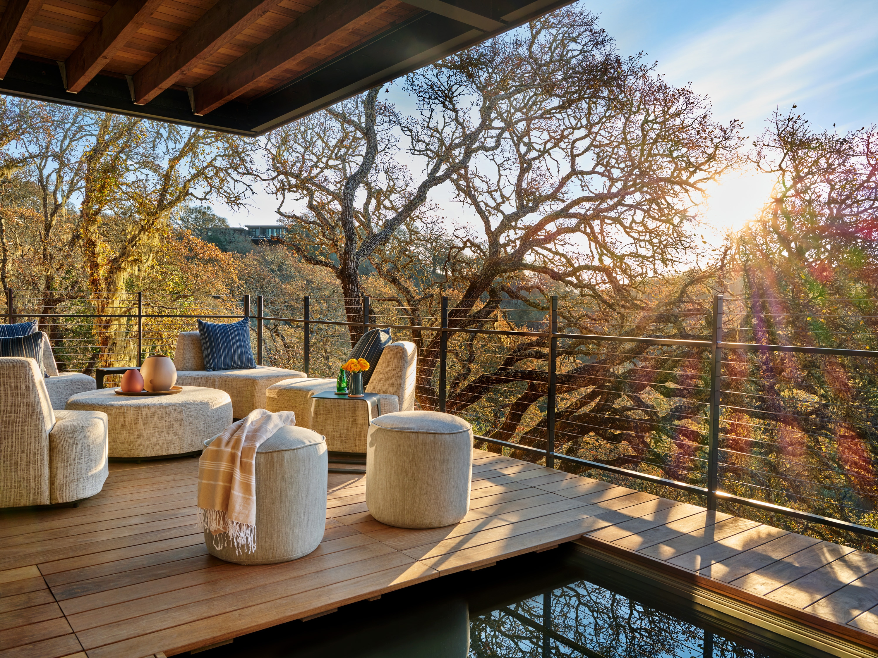 Full-height window walls focus on the hills & trees beyond. Cantilevered terraces feature large fire pits & inviting seating groups. On the living level, a custom stainless steel soaking tub is integrated into the deck. On the bedroom terrace, the outdoor swing is already an owner favorite.
