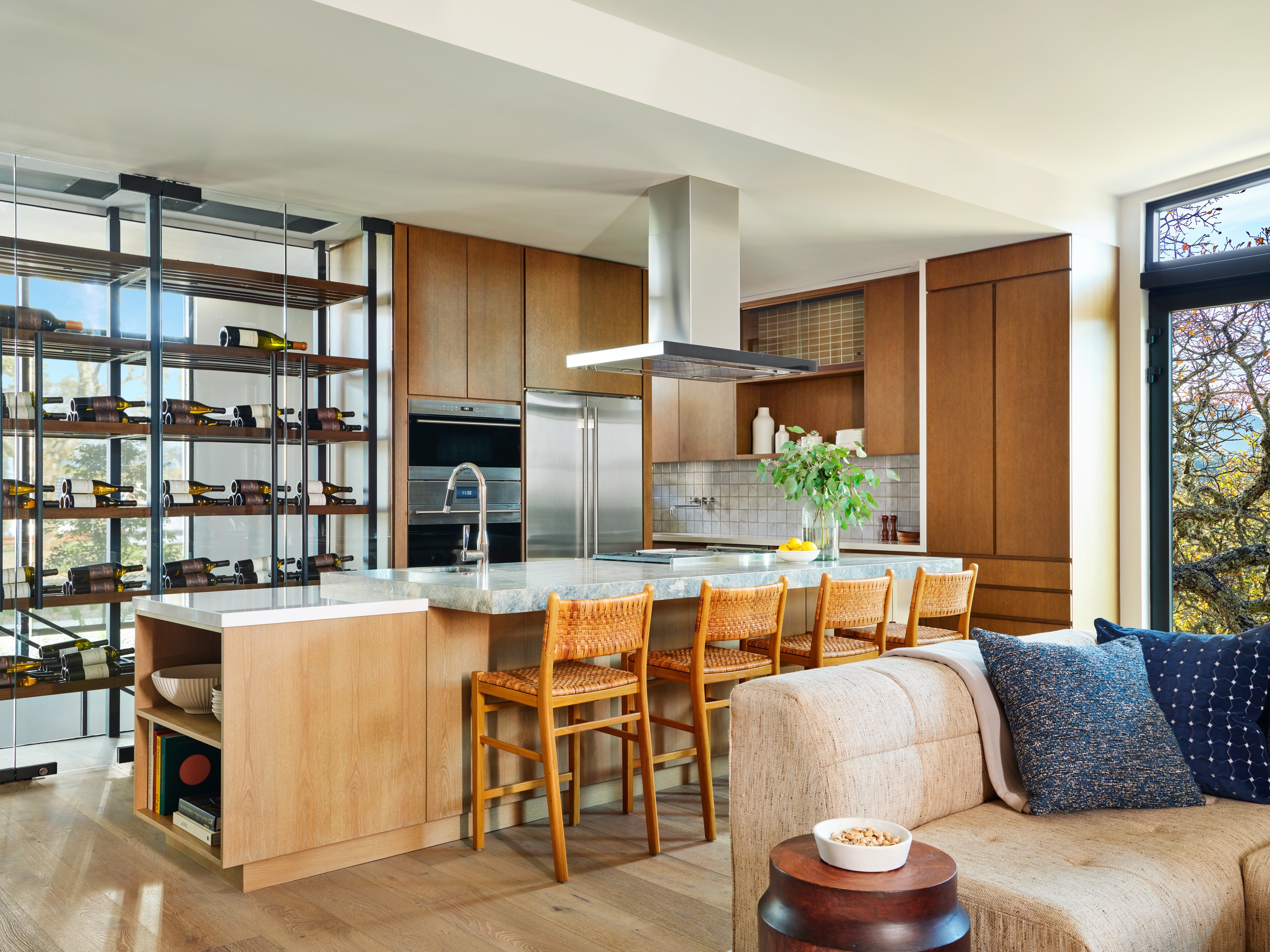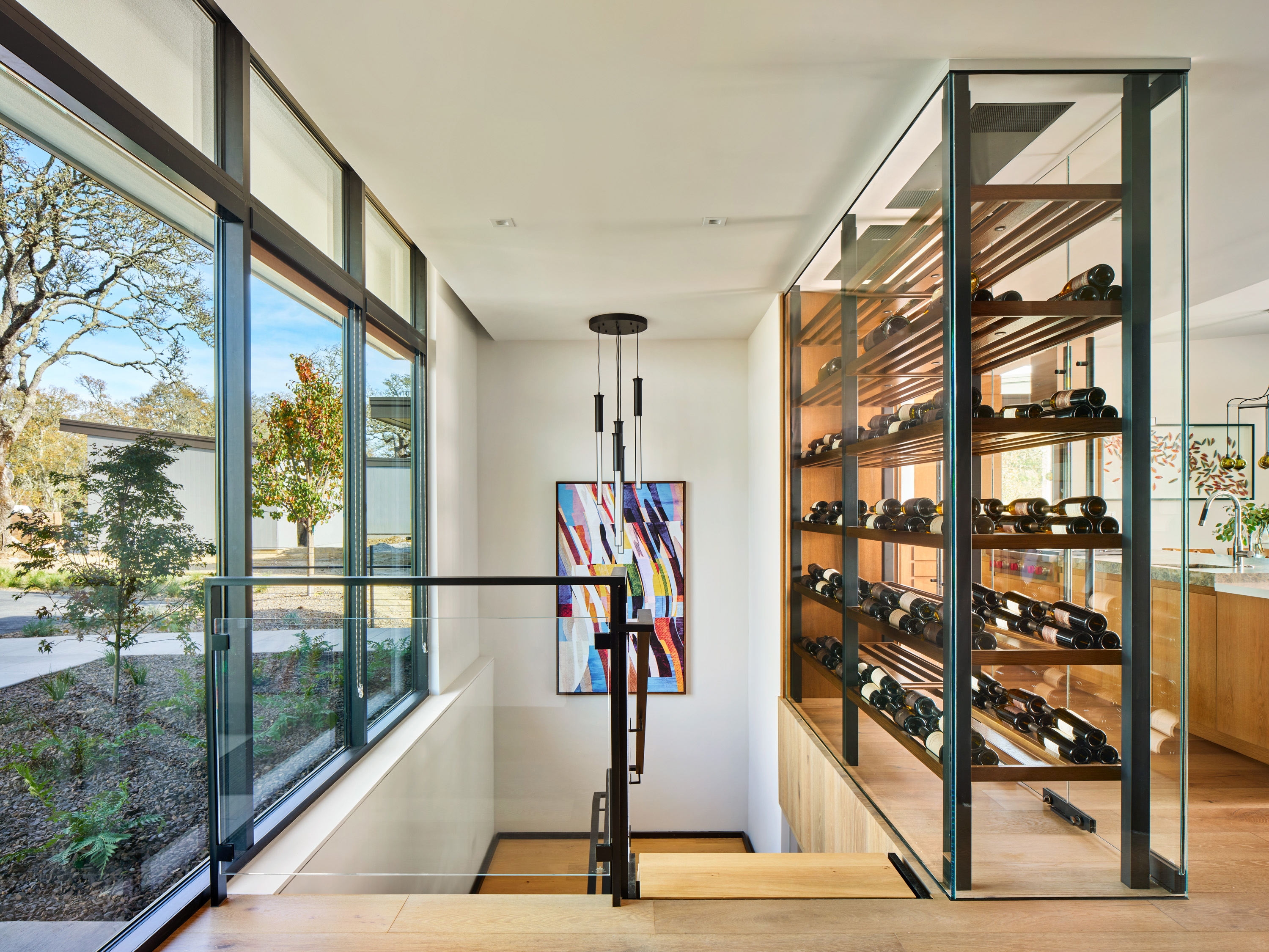 A 200-bottle wine case greets the owner at entry. The open kitchen, living & dining rooms are all oriented toward the views. The floating staircase introduces dramatic art & locally made lighting. The interior palette–with hand-tufted wool rugs, nubby fabrics & leather-wrapped furnishings–creates relaxing, urbane spaces. Natural curves contrast the linear architecture.