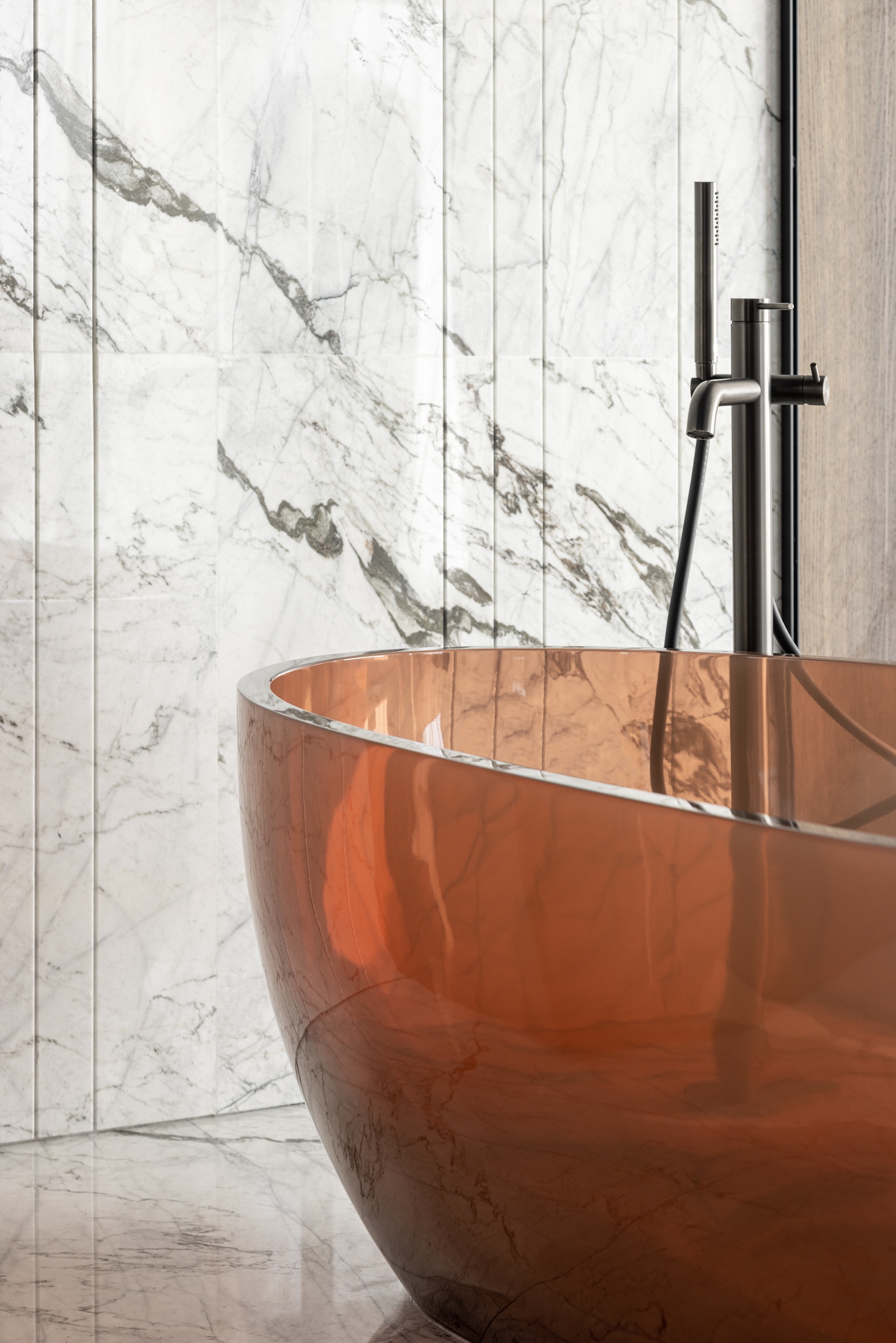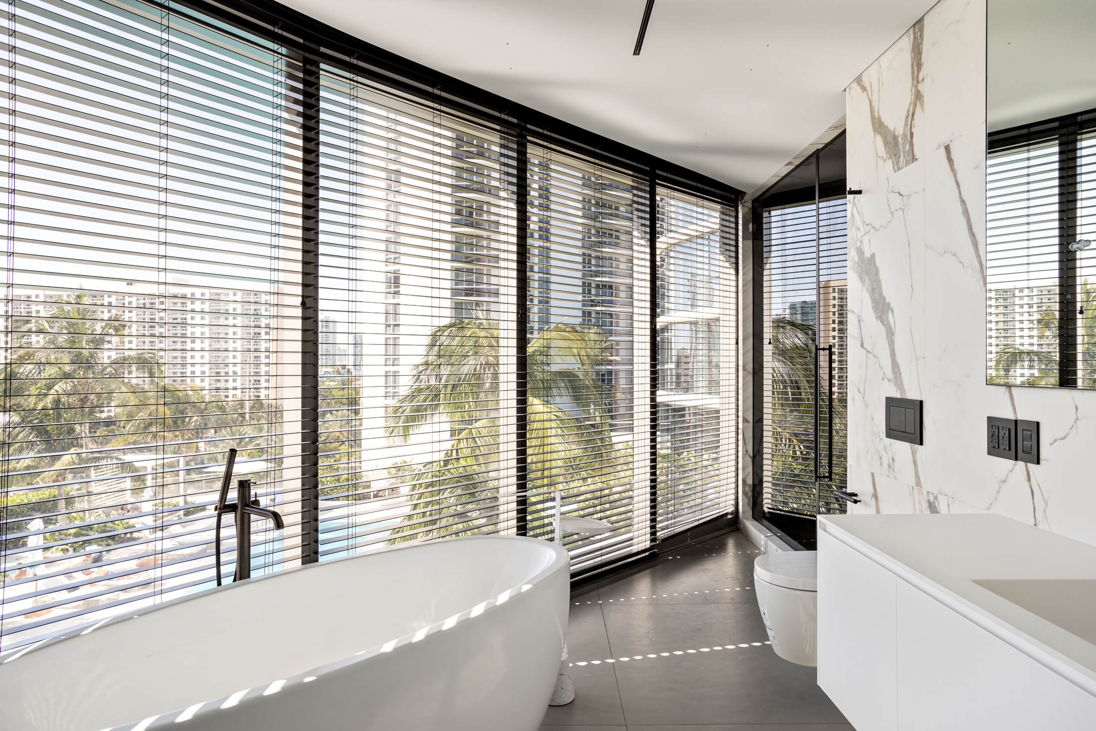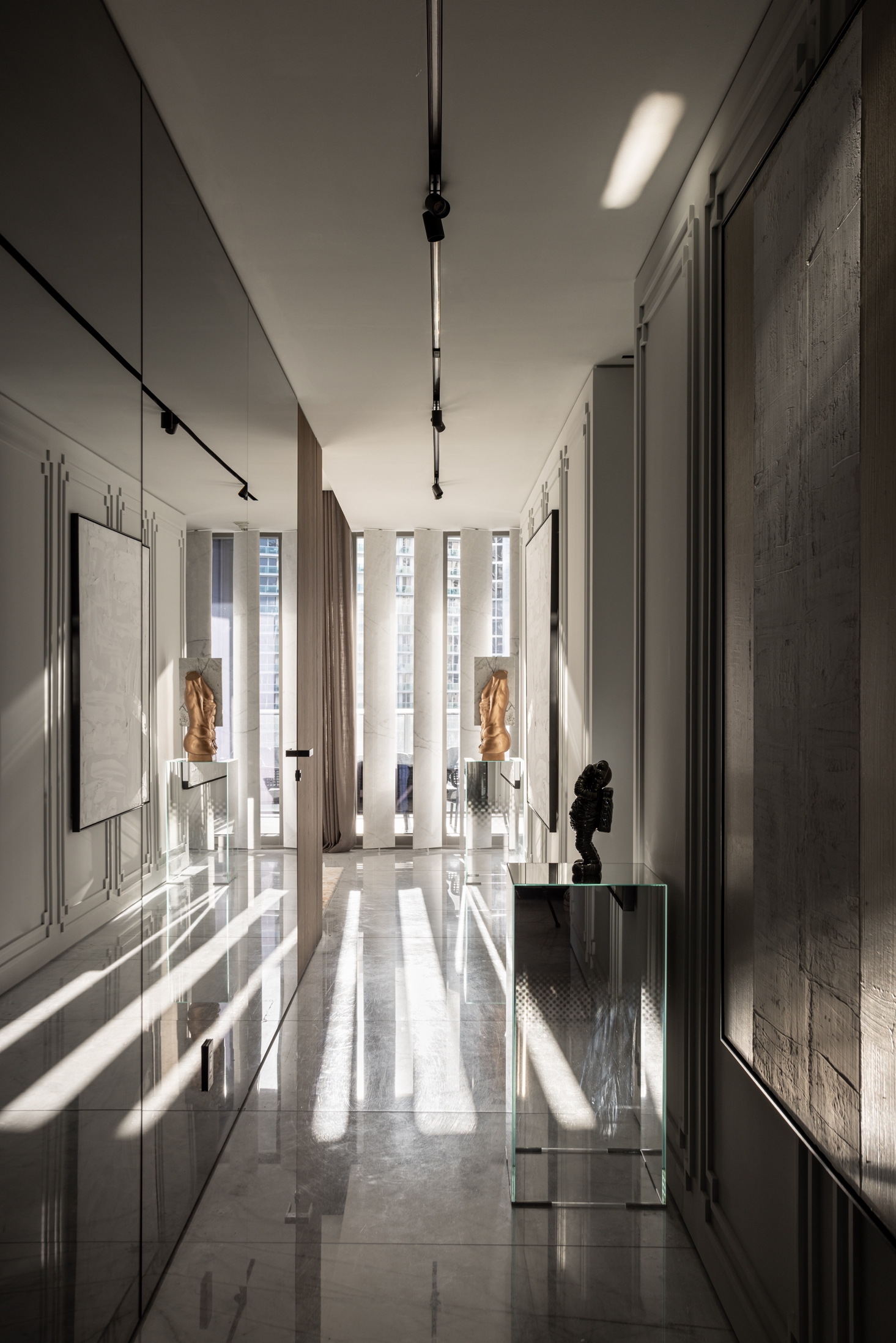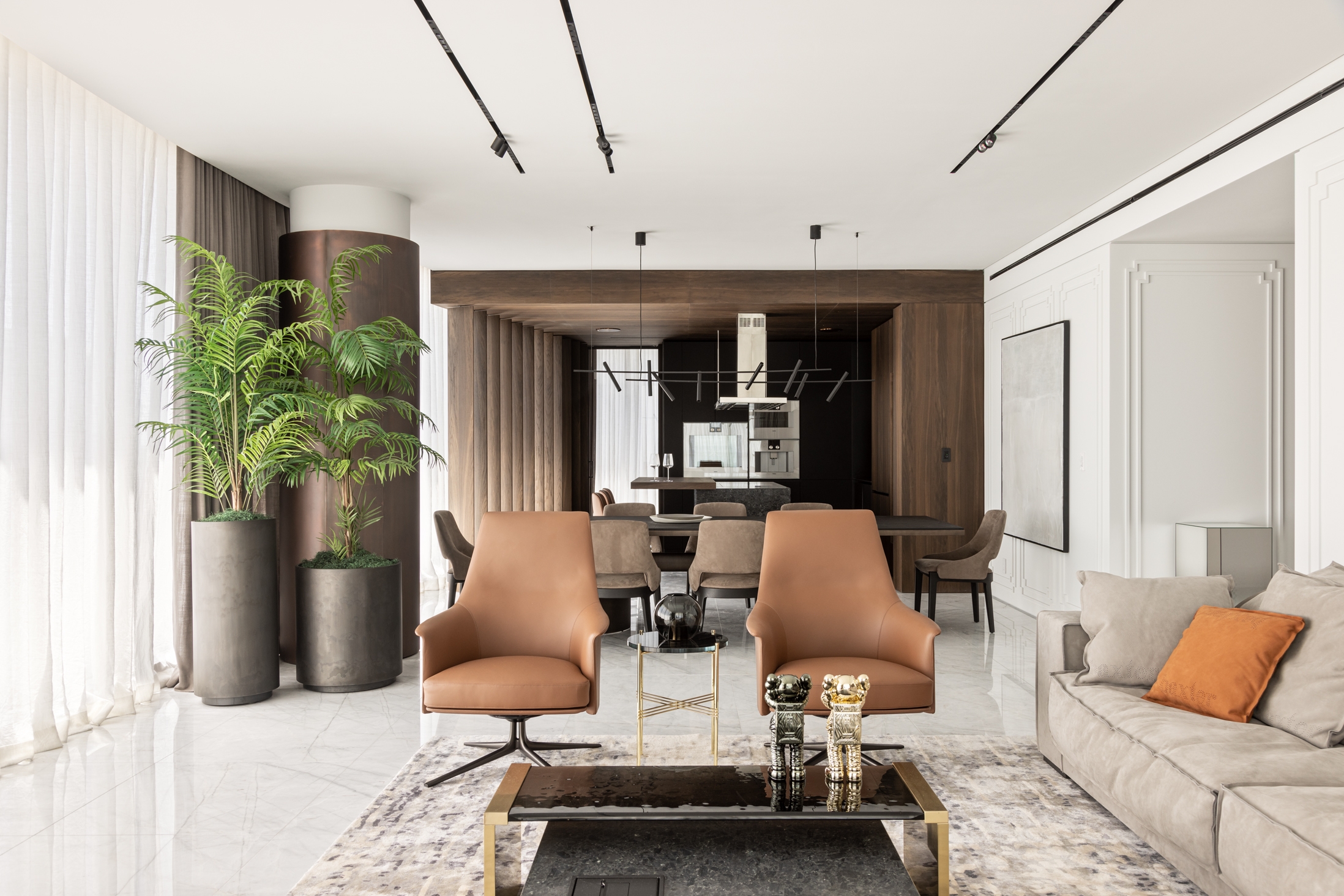 Demilune is a 4,115 square feet apartment located on the 5th floor of Ritz-Carlton Residences in Sunny Isles Beach. The residence got its unusual name due to its radial shape, and the abundance of panoramic windows that make it glow and open the views of the ocean, the city, and the Intracoastal Waterway. The season here stands motionless because the color palette of the interior and its accents immerse residents in the feeling of eternal summer.