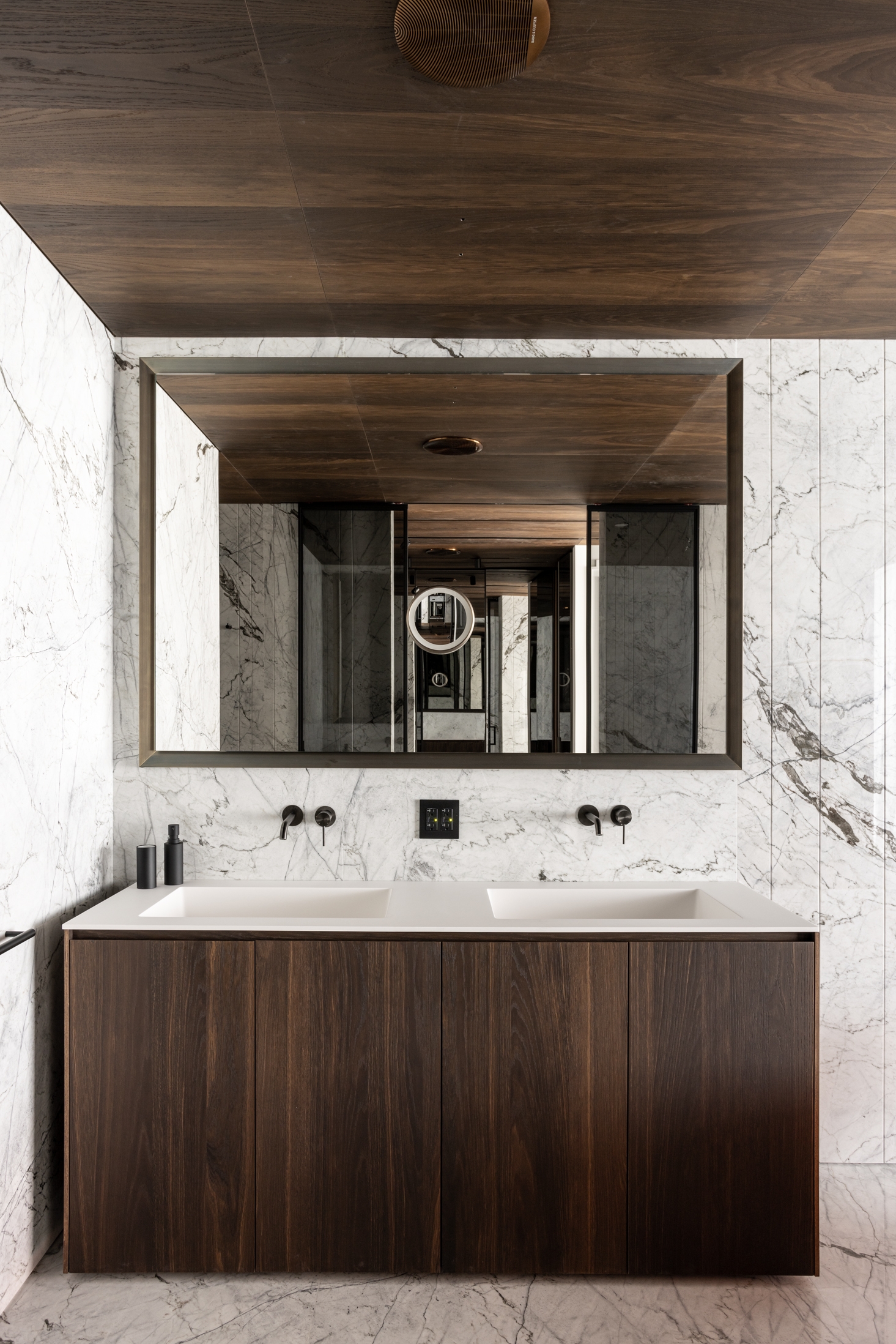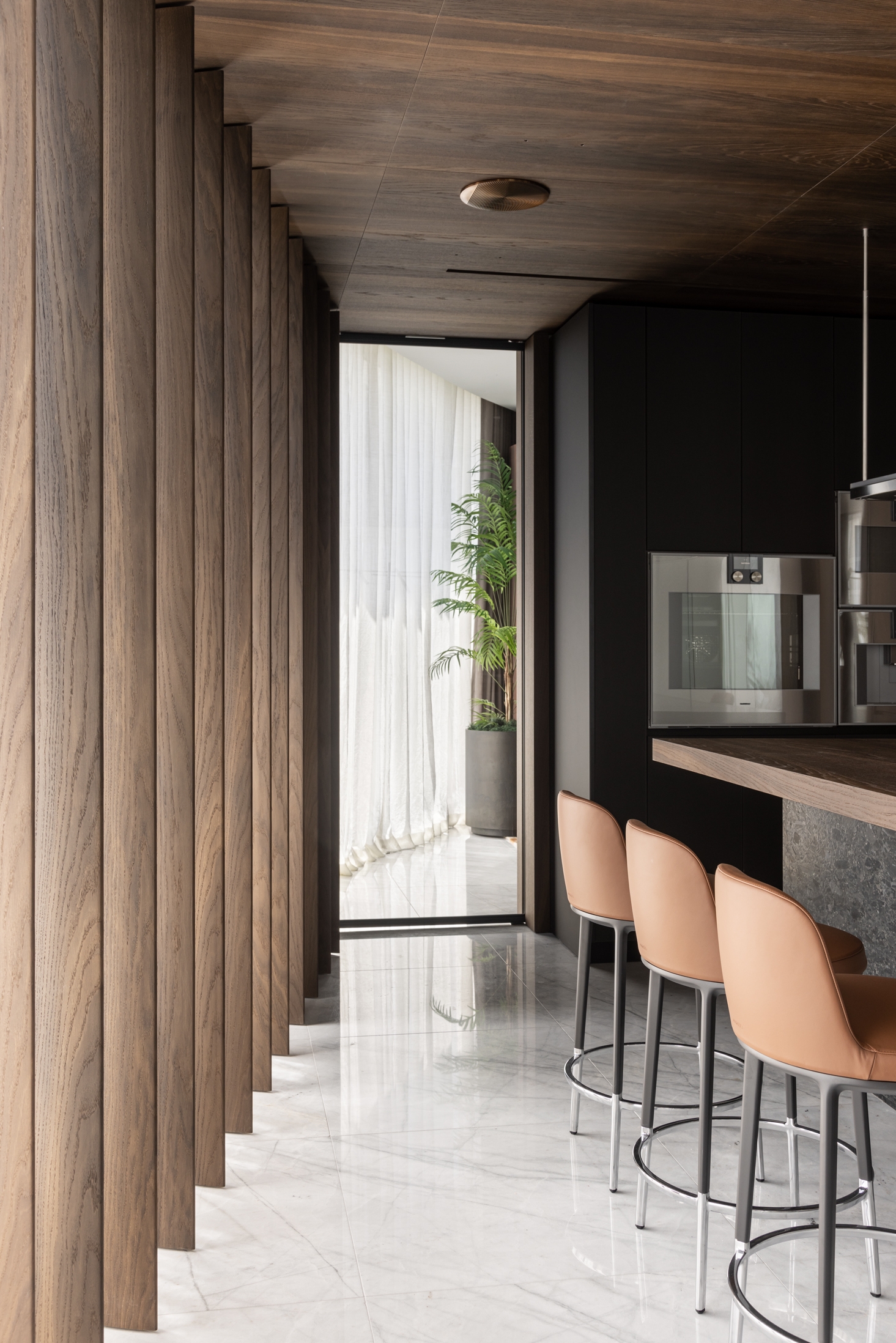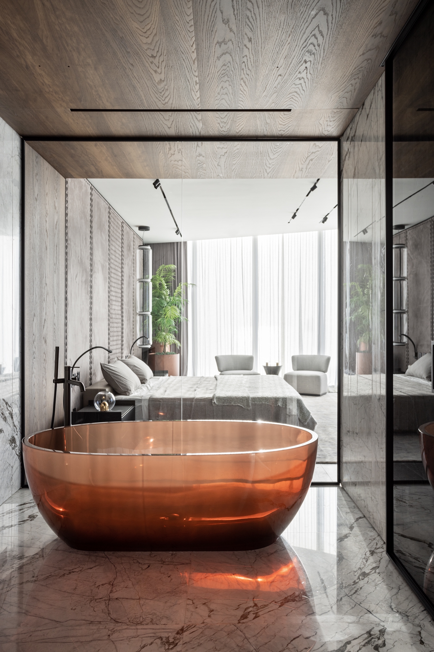 Also, this project stands out in the quantity and choice of natural materials. Oak is one of the favorite materials of the designers, but here they have used it in an unusual way. Oak veneer sheathes not only the walls but also the ceilings in the kitchen area and the master bedroom. Moreover, oak also appears in swing panels, which seem to string this material to the floor. This technique allows playing more with the light coming from the panoramic windows.