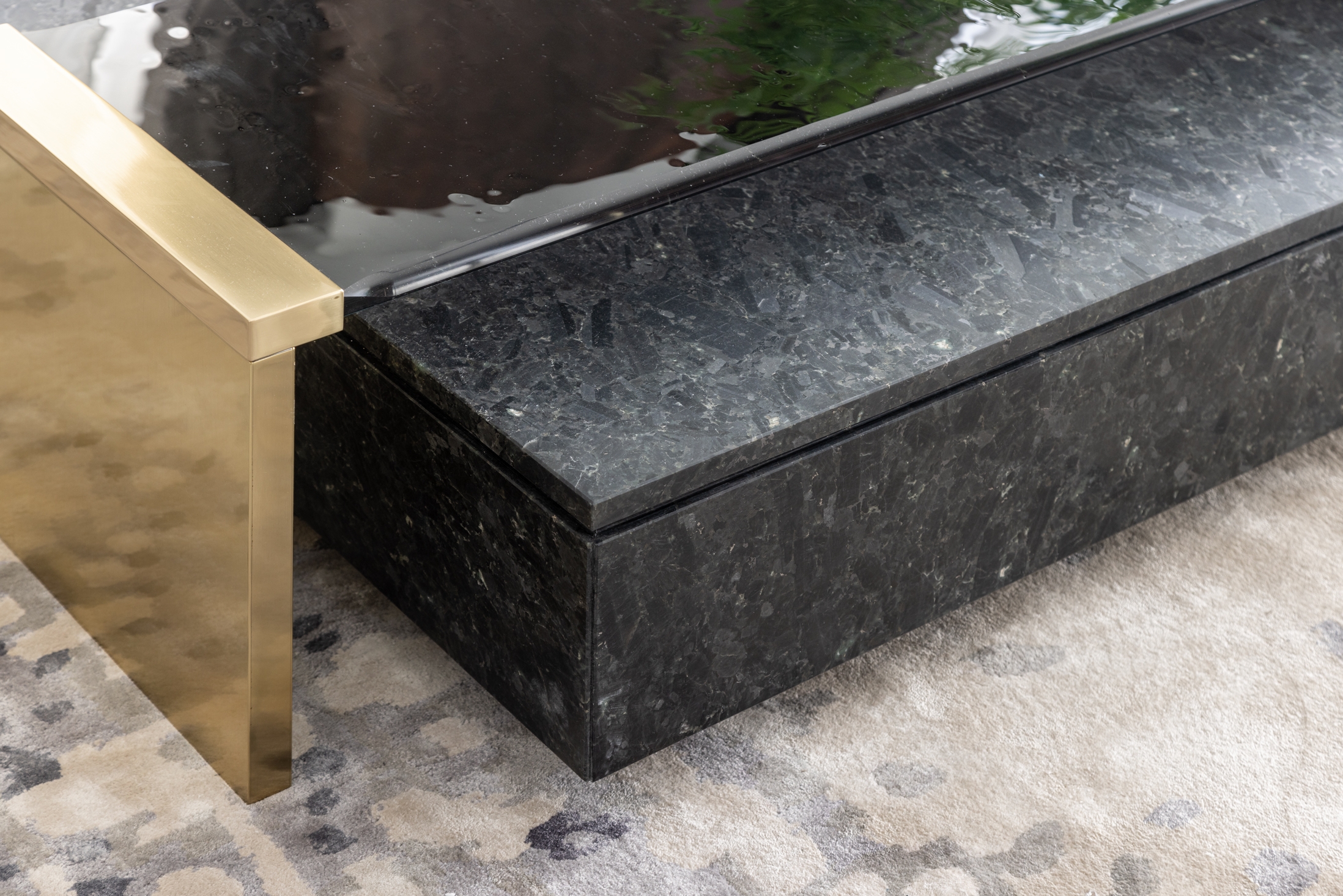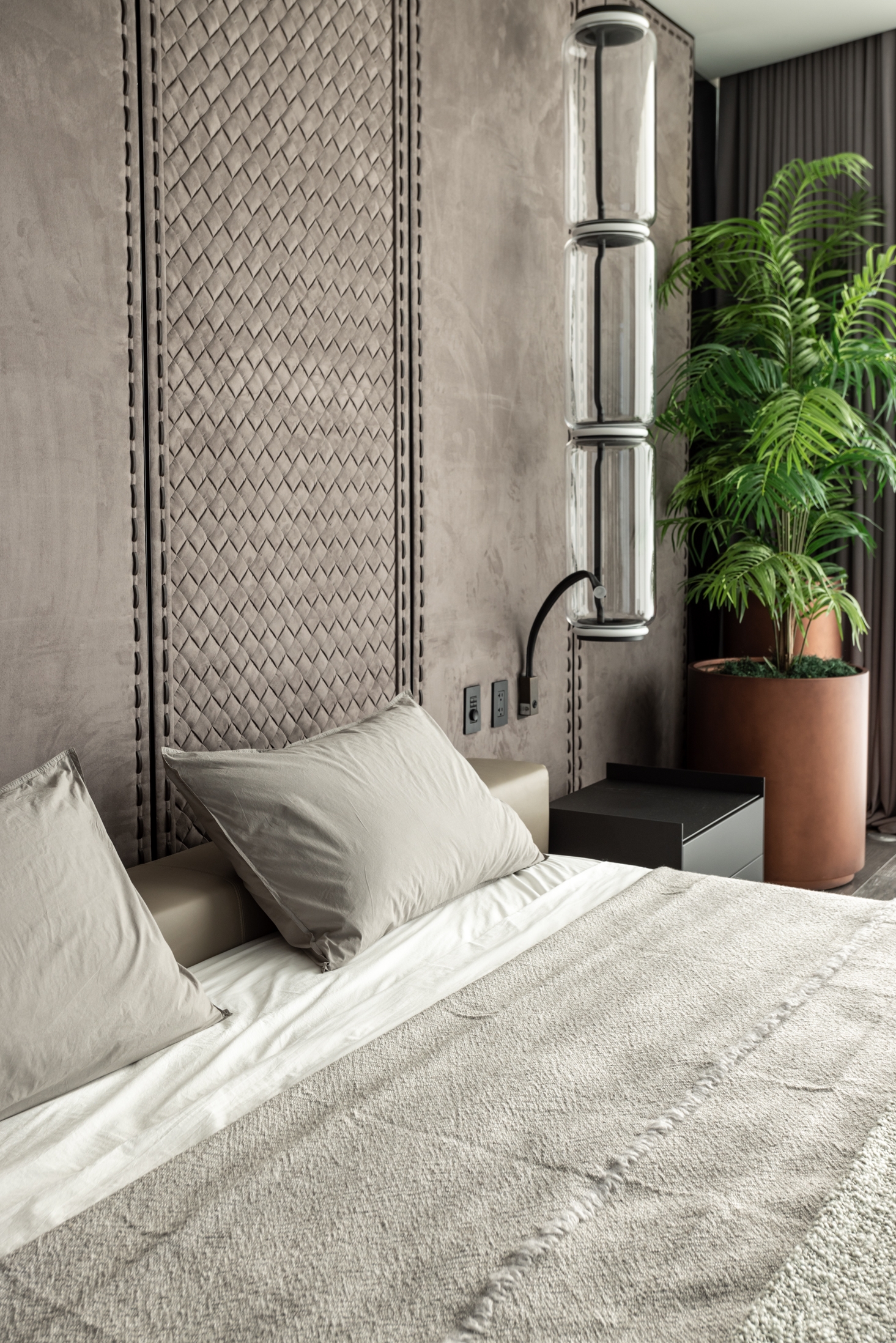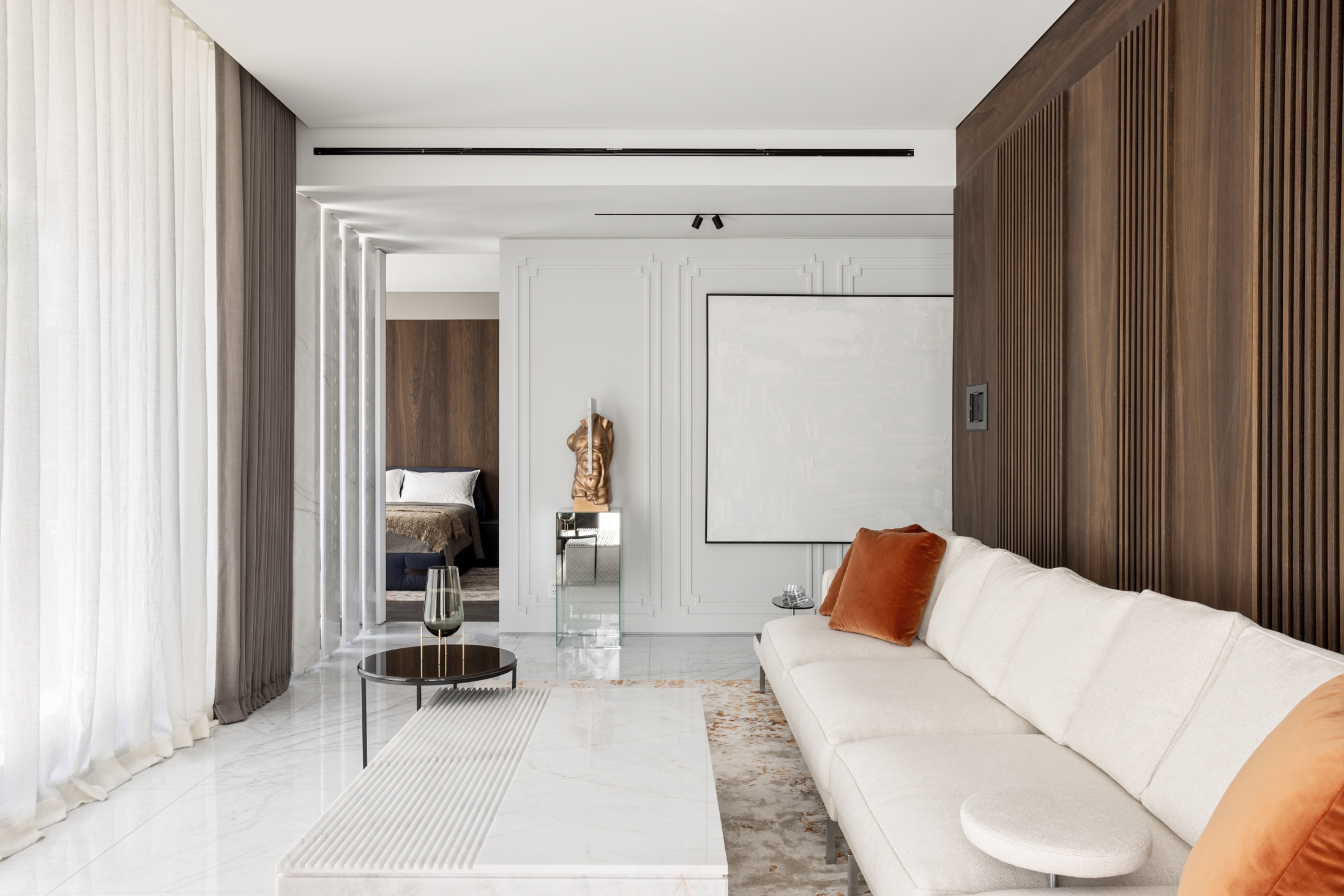 All the studio’s features are here: a combined common area, a spacious master block, an abundance of natural wood and stone, a muted palette with a bright accent stretched throughout the apartment, and custom-made furniture and art.