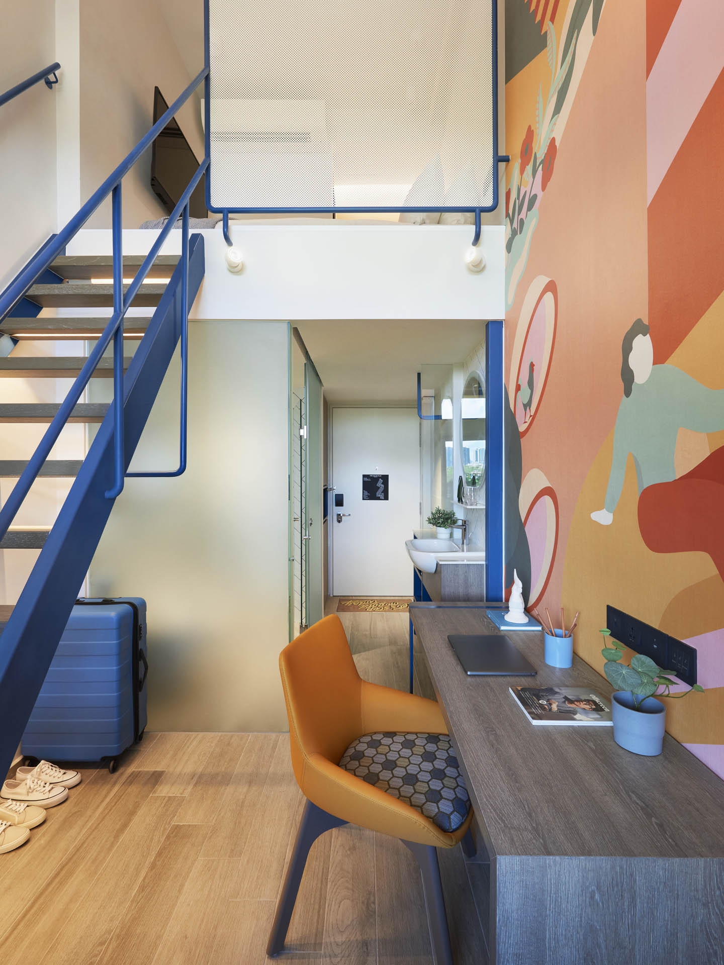 Mirroring the use of forced perspectives & angles in the architecture of the building, the interior design of lyf one-north uses elements such as anamorphic artwork & visual features to create a dynamic sense of space in the property. This experience is layered seamlessly from the lobby through to the rest of spaces, creating a cohesive & seamless guest experience.