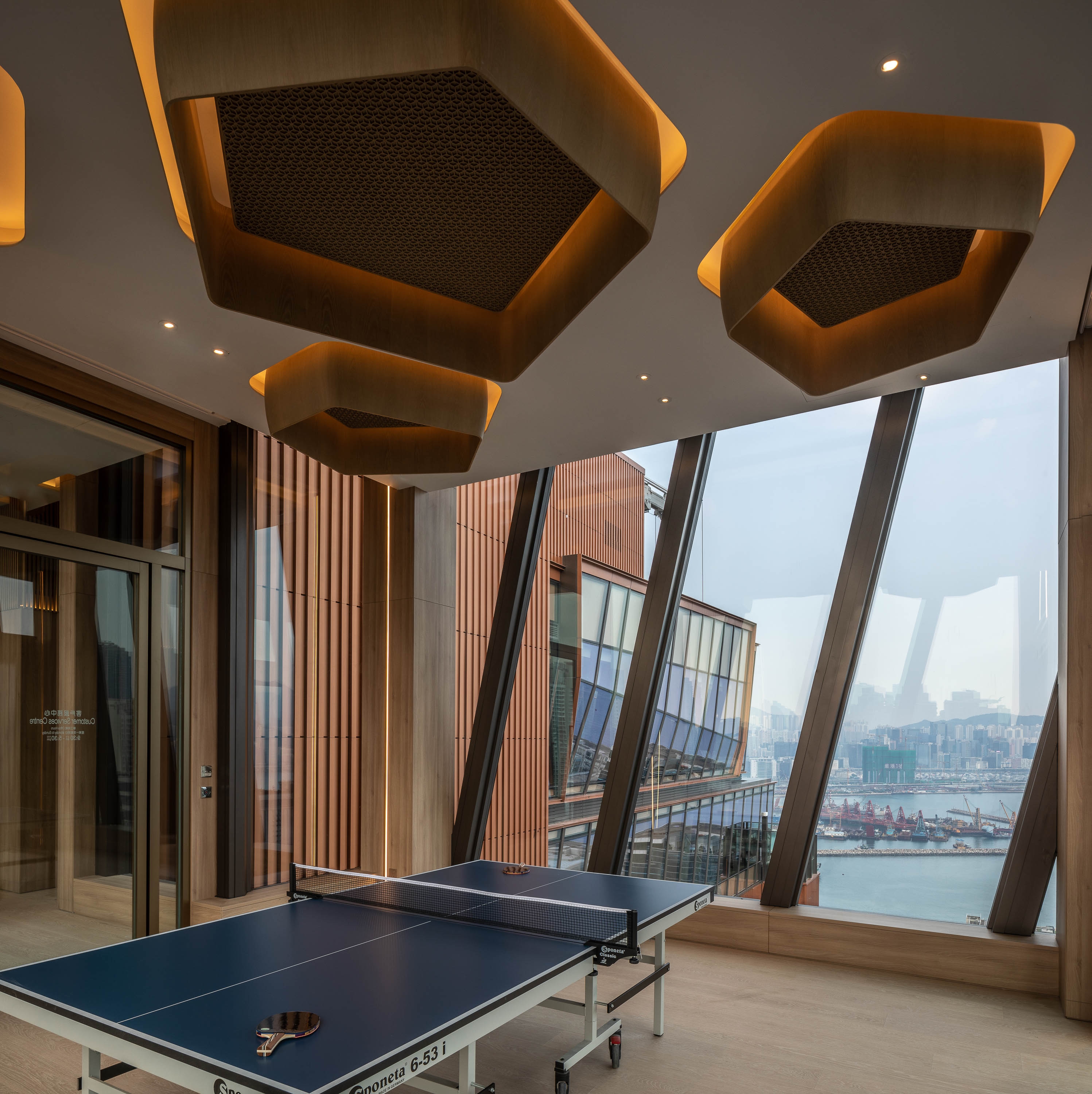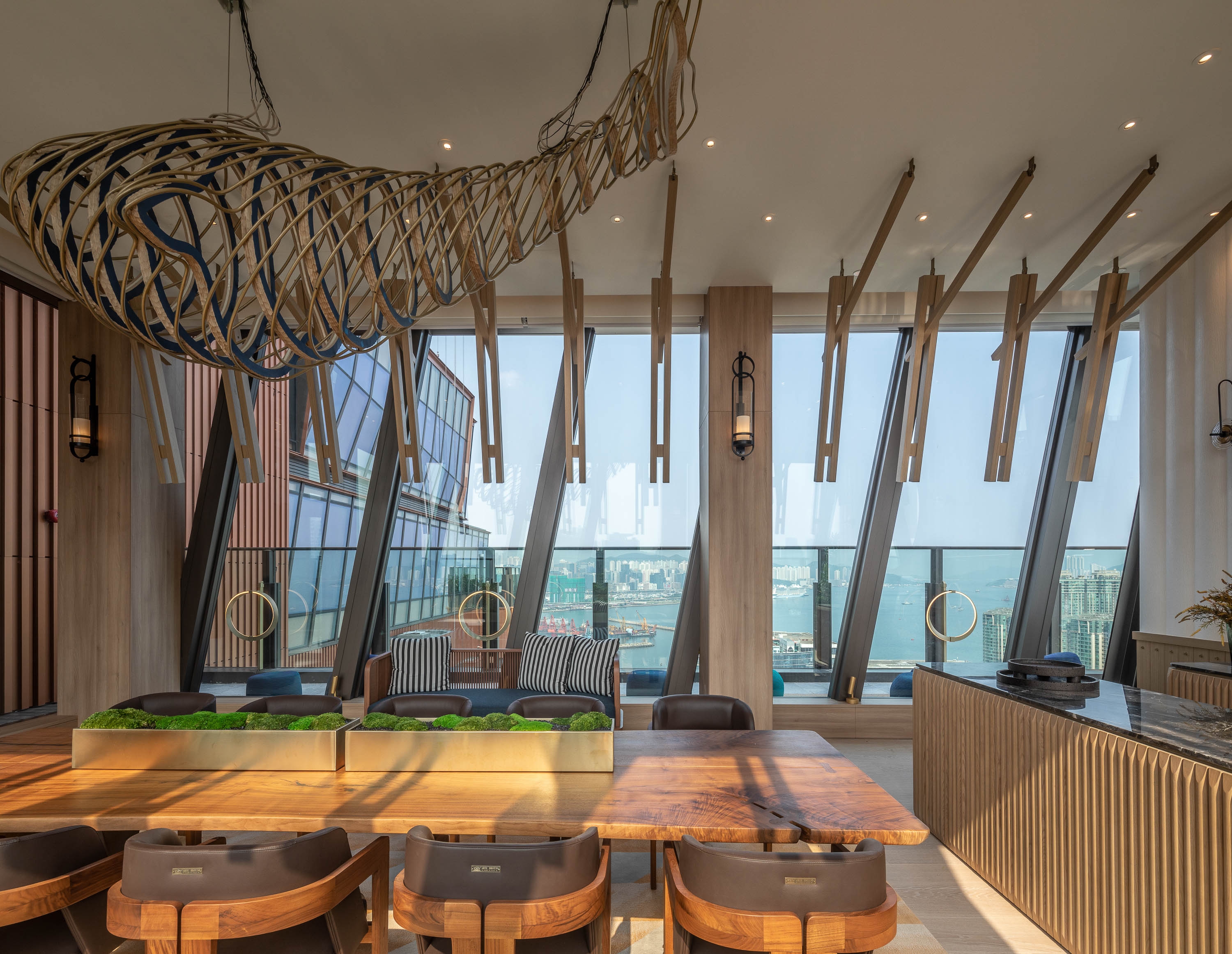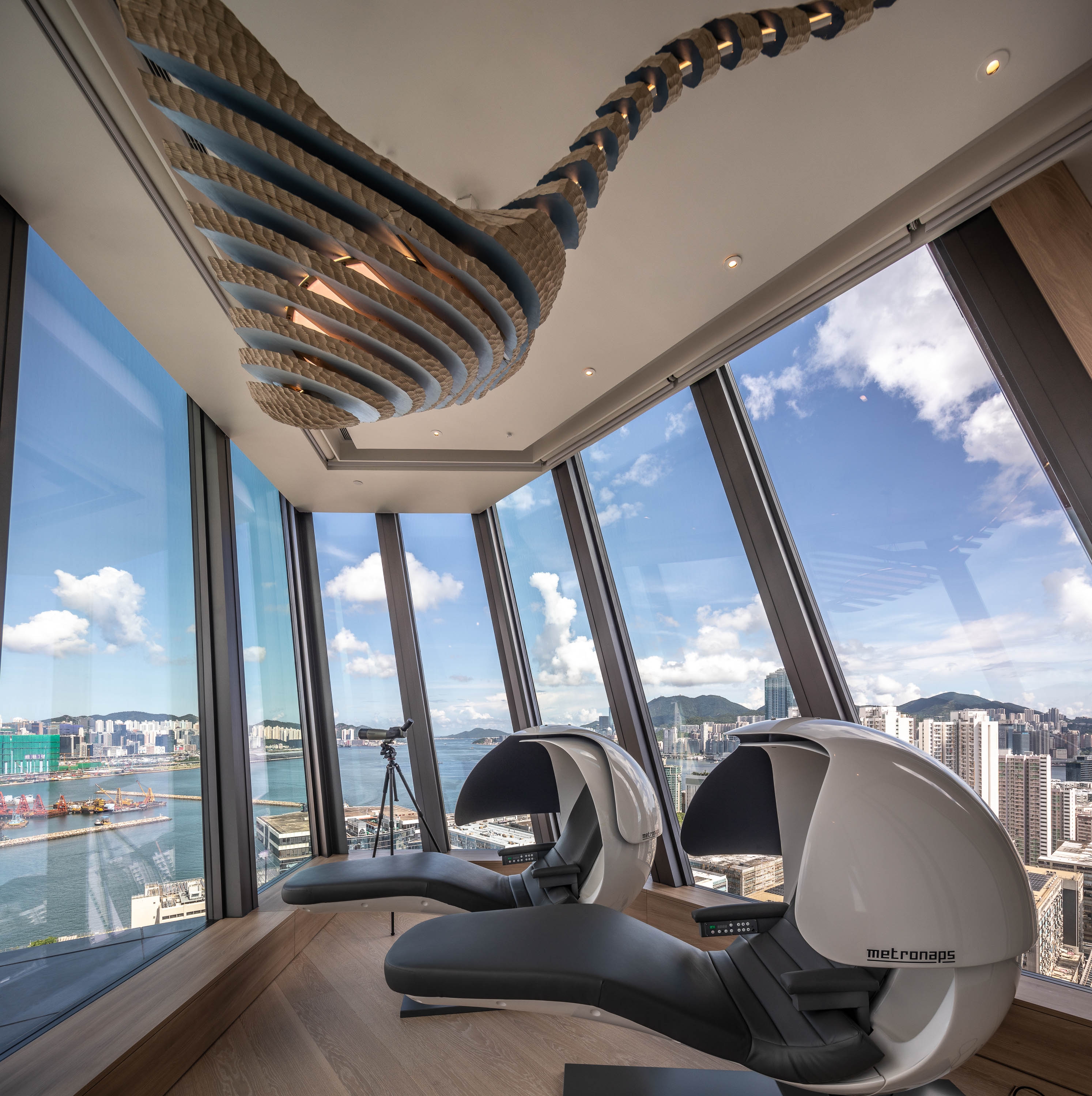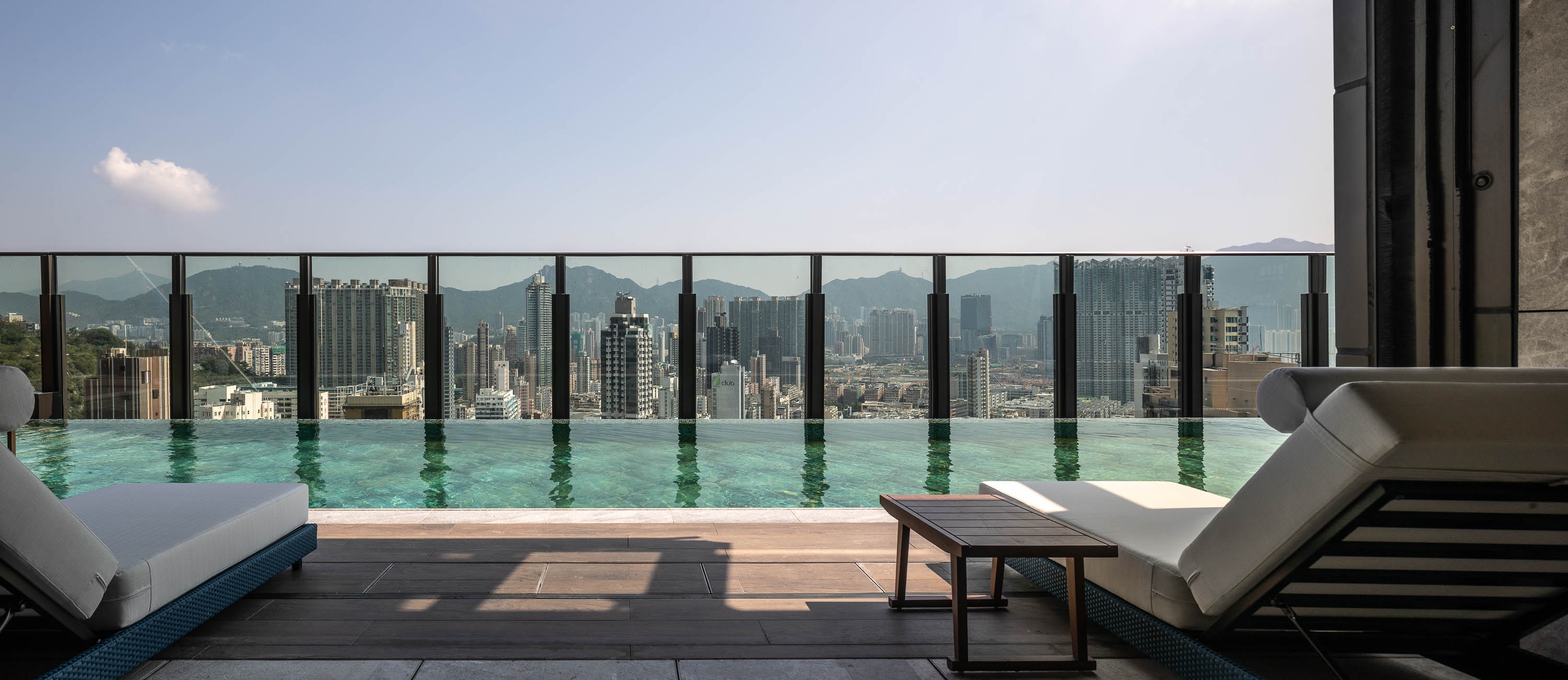 The Club Cruiser looks like a spaceship landed on top of the building. Inside, looking out to the sea, you could imagine touching down somewhere like Phuket. The interiors give the feel of a private resort floating above Kai Tak, and the interiors are connected with nature rather than the city below.