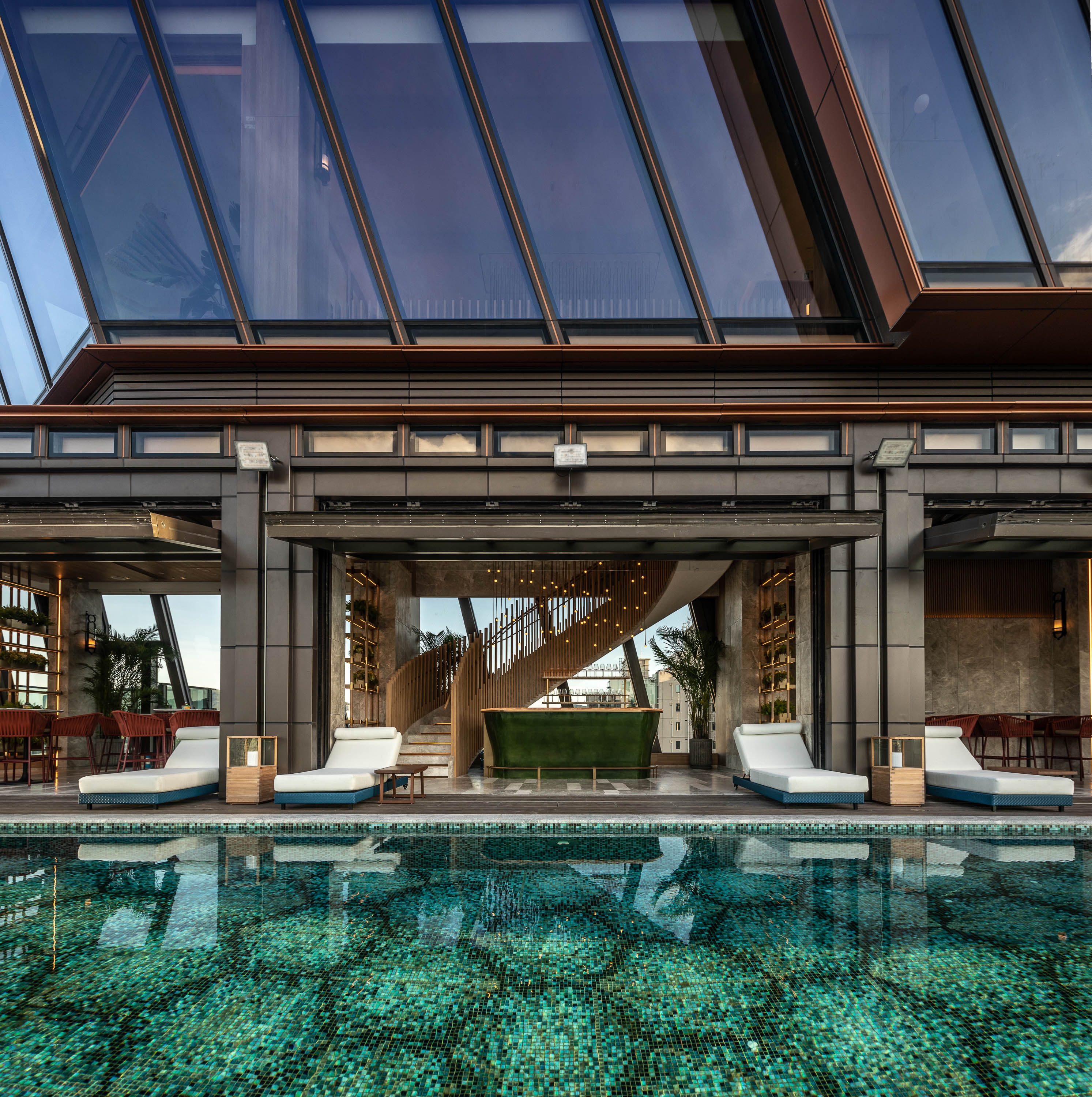 The Club Cruiser is relatively narrow. To create a sense of greater width and to 'decompress' the internal spaces, large glazed up-and-over doors between the bar area and the pool are introduced to effectively create one big open-air social space.