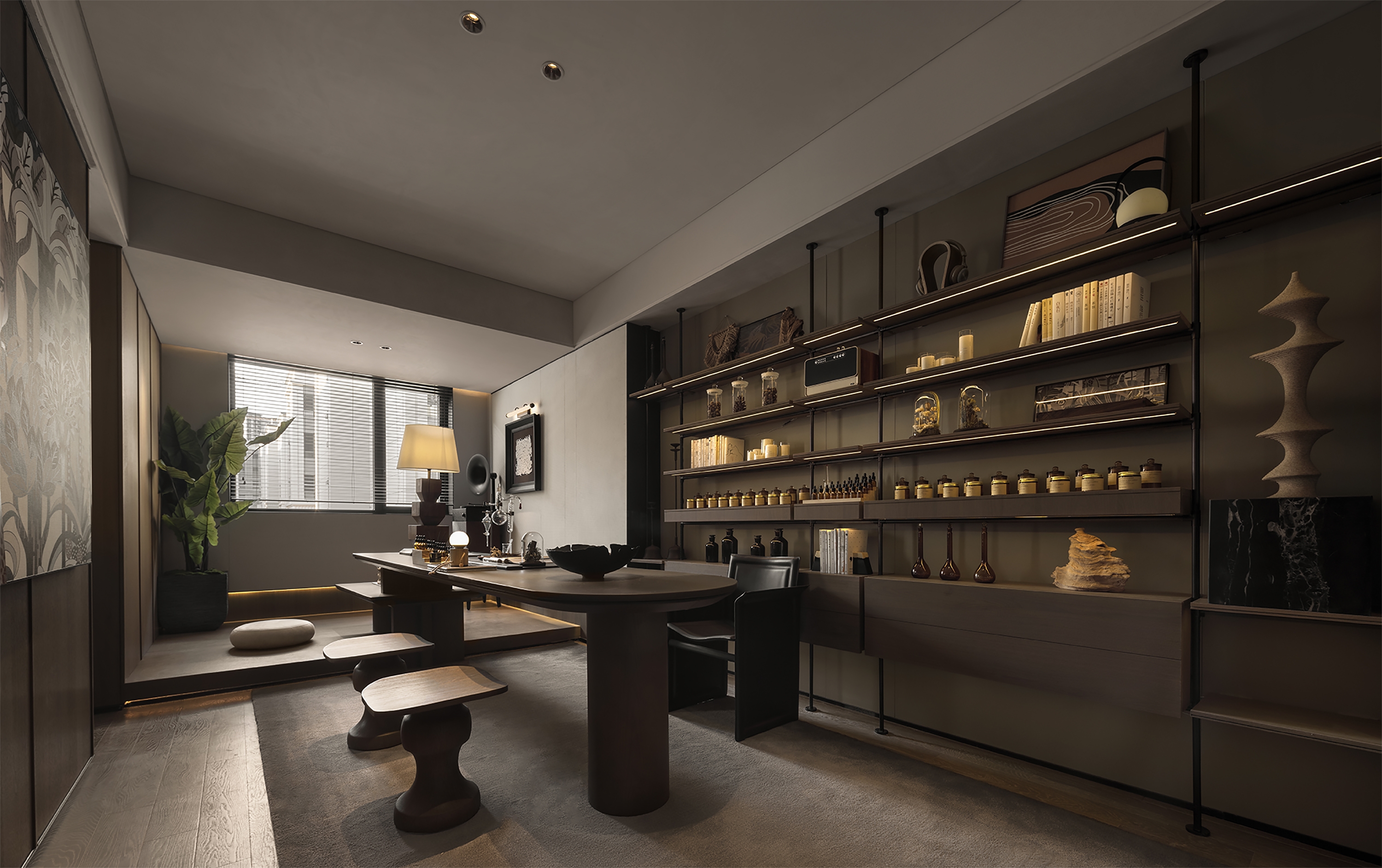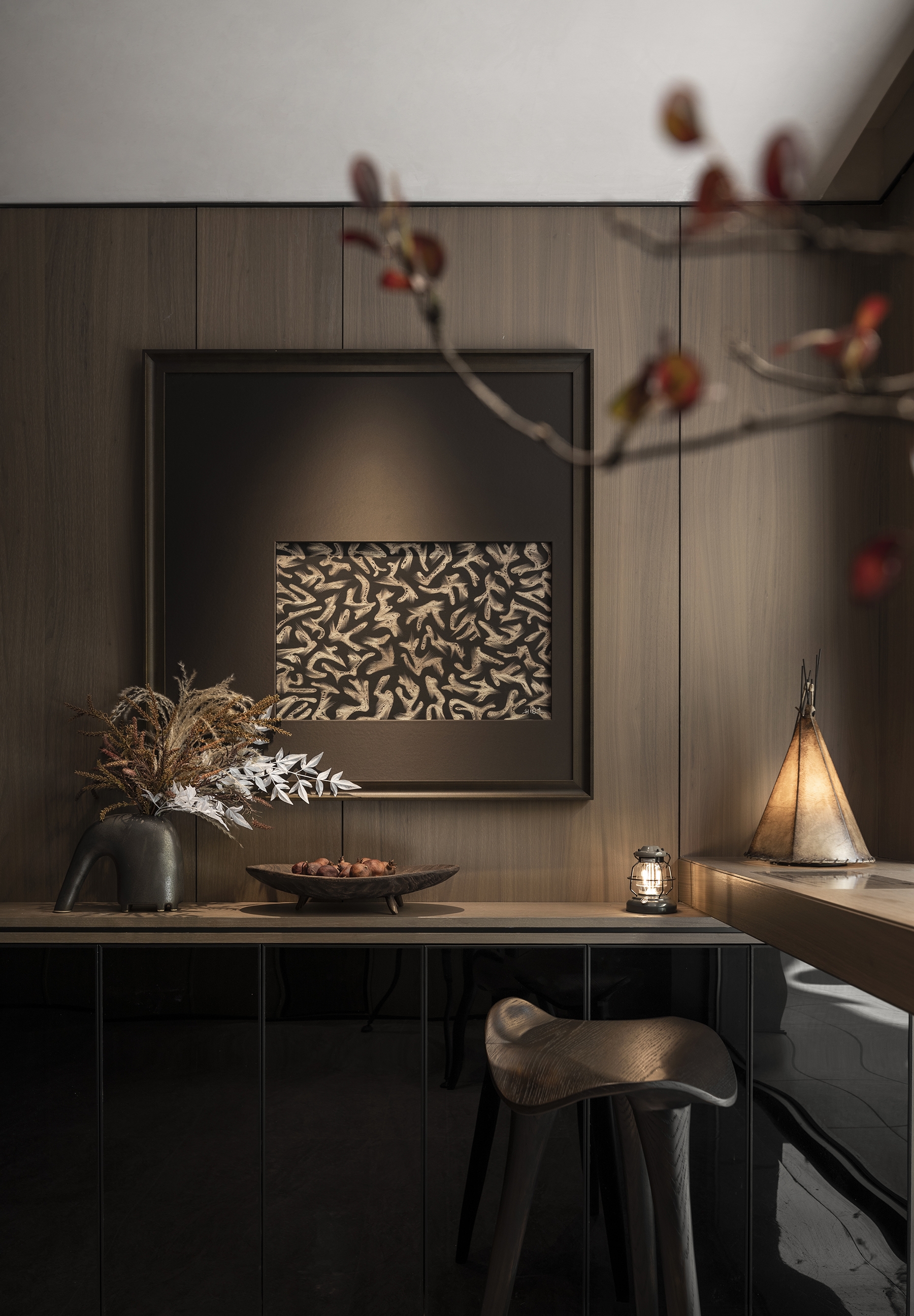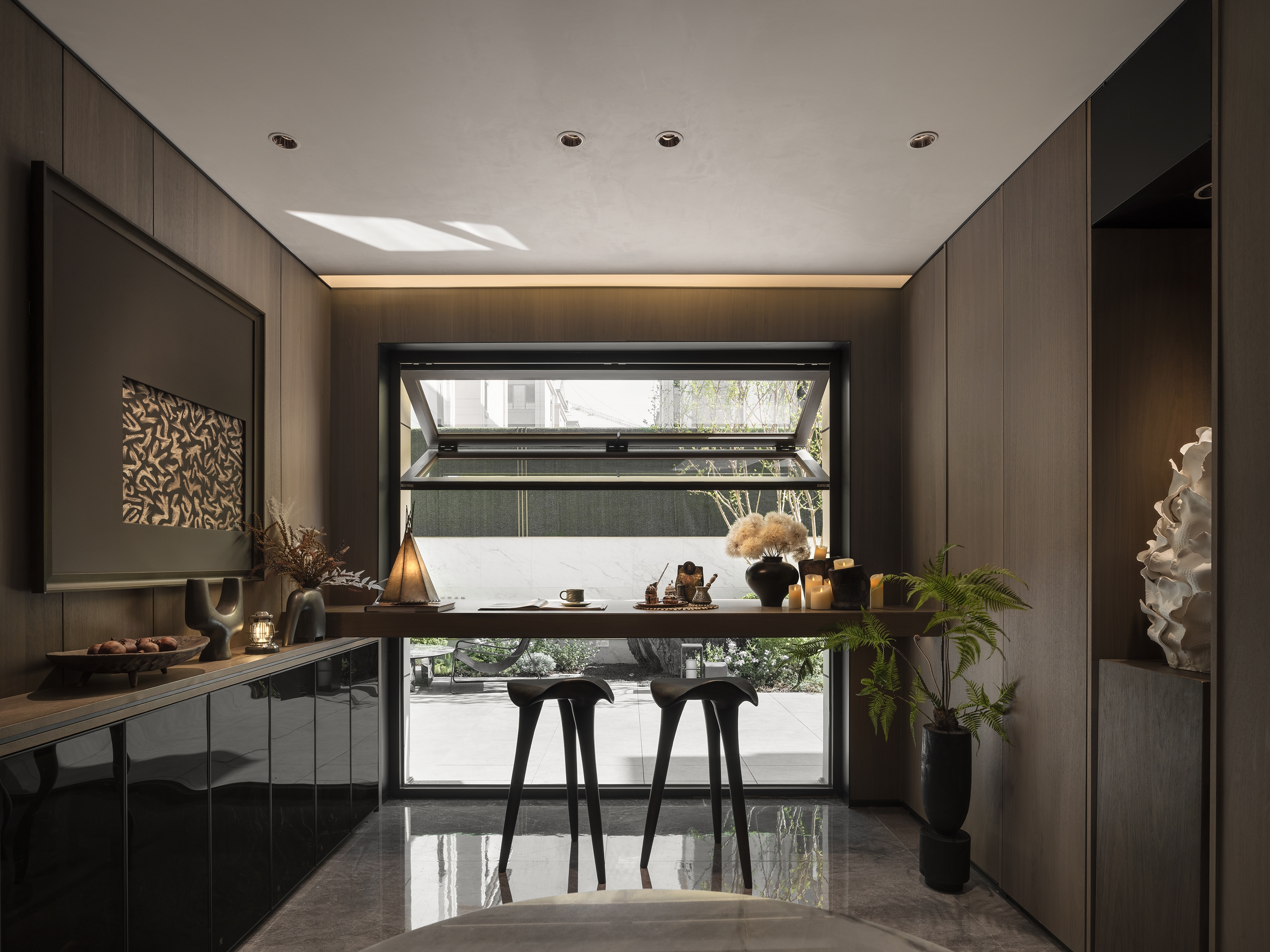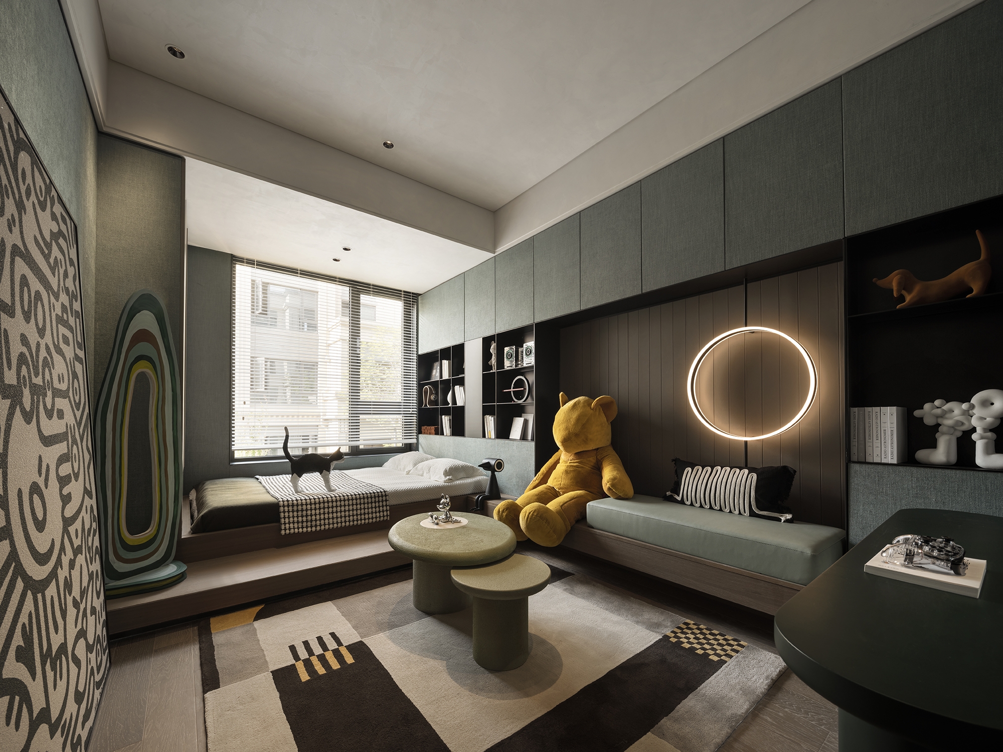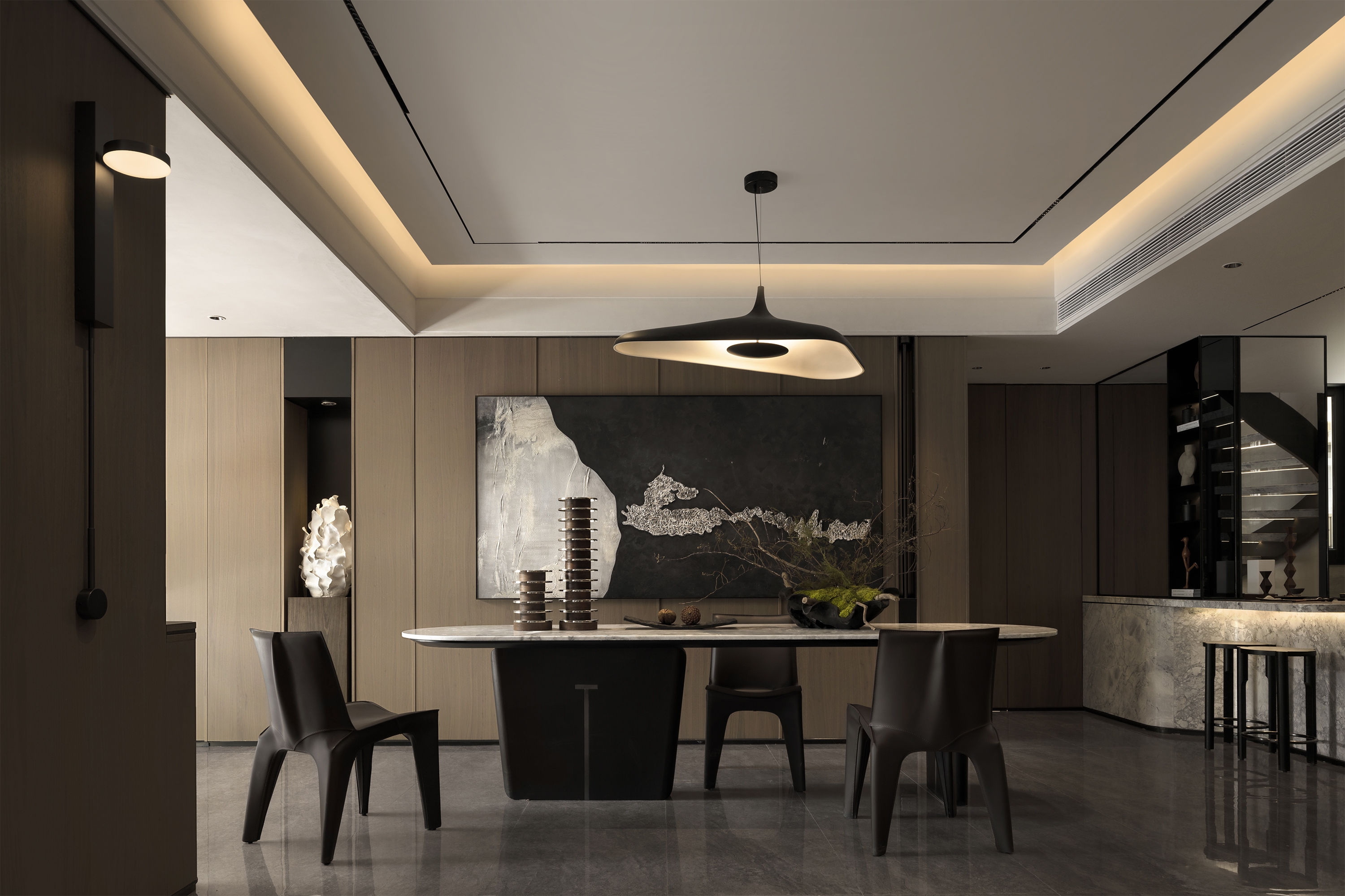 Inspired by the wabi-sabi style (Japan's natural aesthetics), it draws the wildness of art and the vitality of nature to mobilize emotional expression. The living room collides with dark and light colors, interspersed with dark green and Chinese red, supplemented by the elegant leather sofa, bonfires, vessels, and sculptures for decoration. The green plants add a fresh atmosphere to the space. The master bedroom exudes a soft and warm vibe with appropriate lighting and art installations. Each function of the study is relatively independent and perfectly combined. Sharing, reading, communicating, displaying, and listening are all possible. The tatami facing the window and plush toys evoke the children's passion for exploring life and satisfy their curiosity. In this context, the tension of space and the delicacy of materials help residents pursue the true nature of life between perfection and purity.