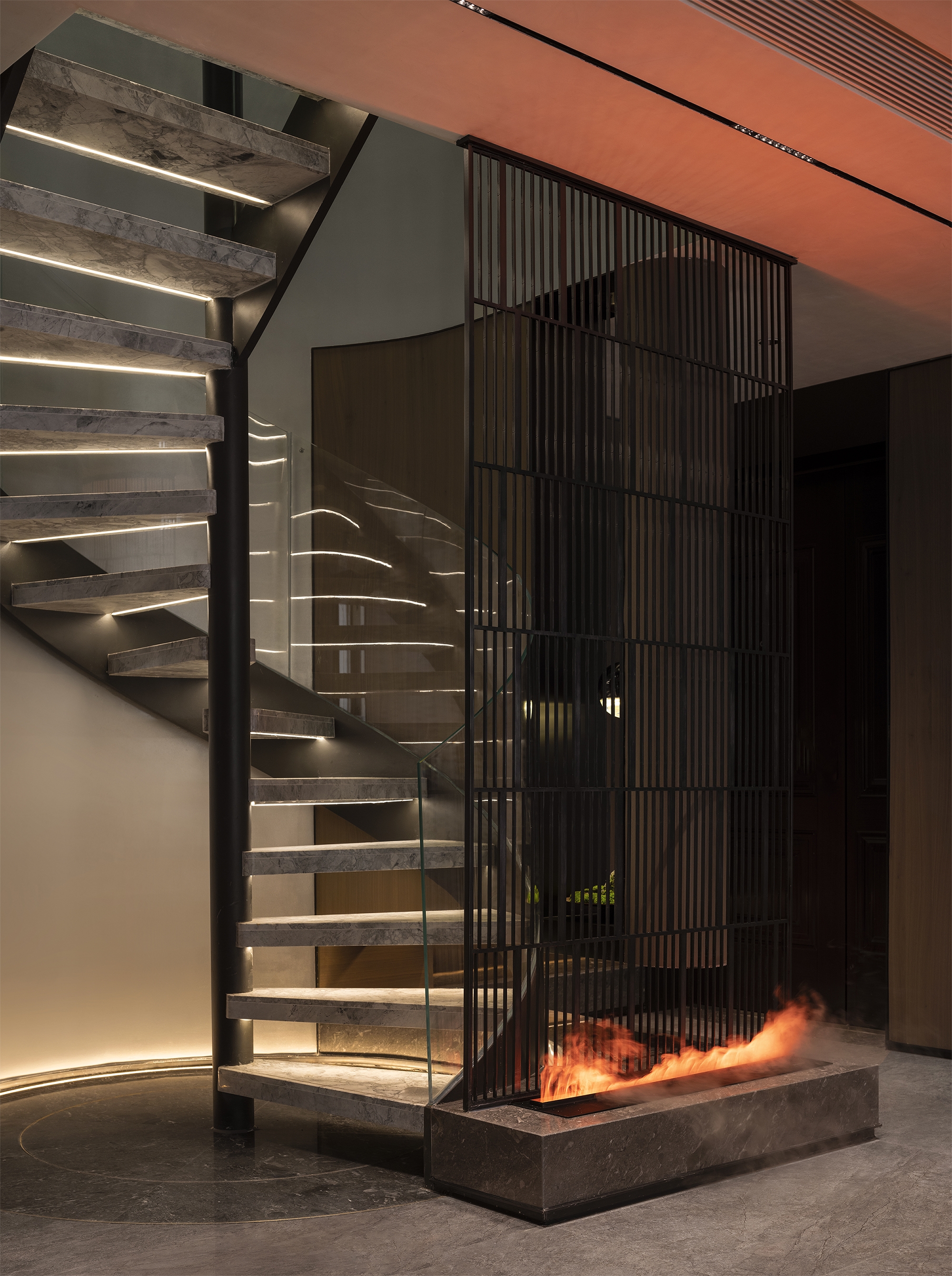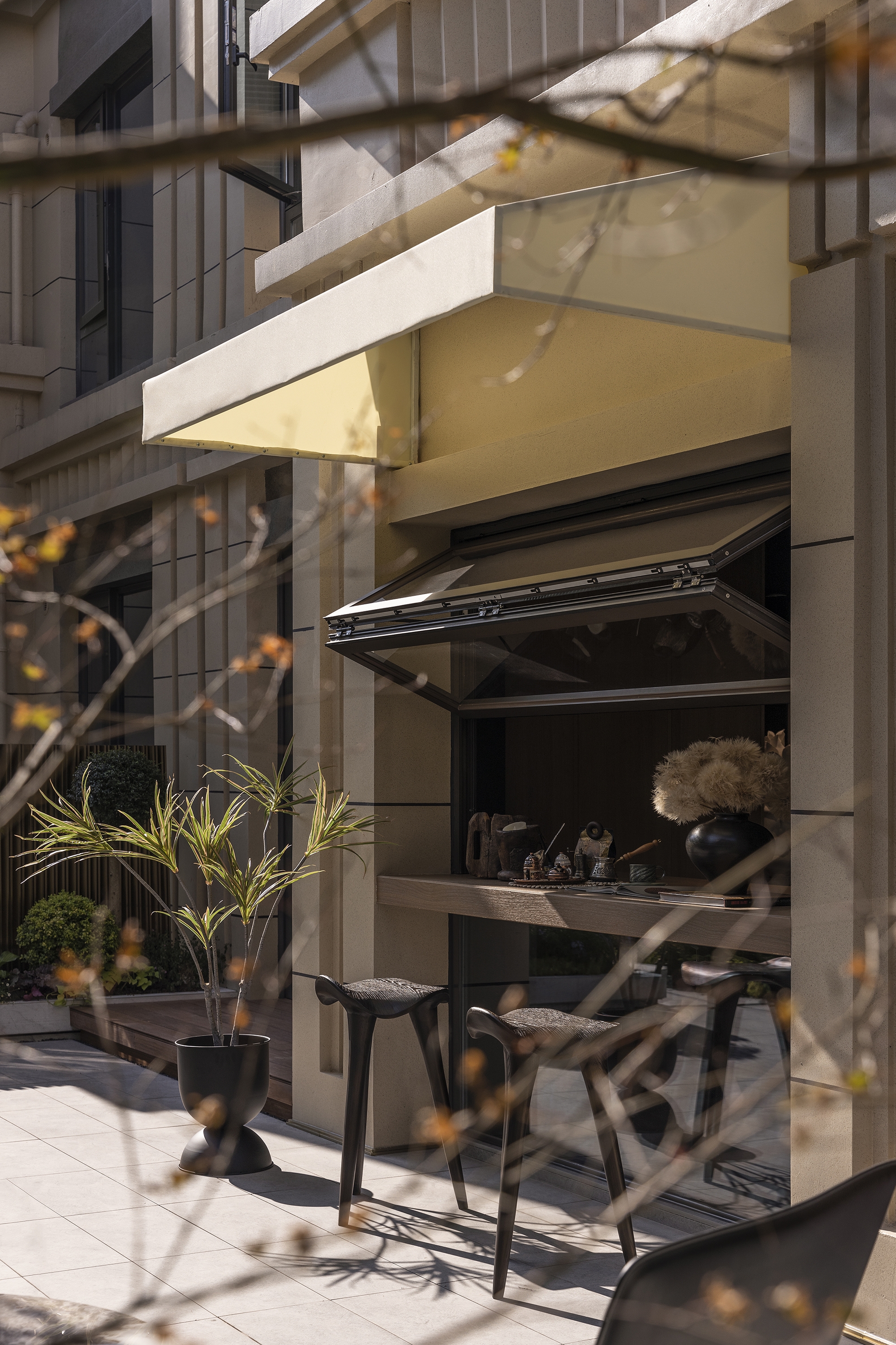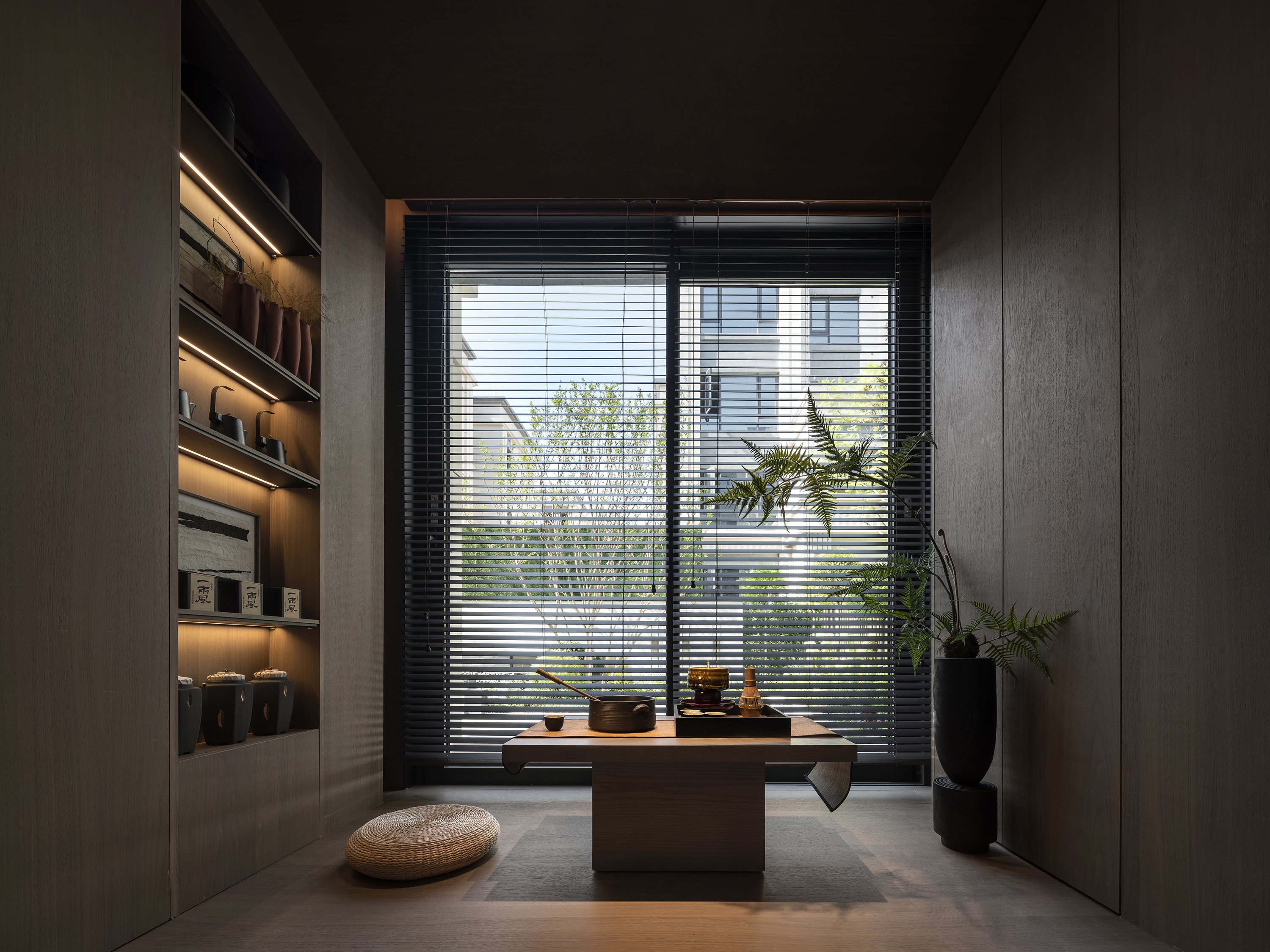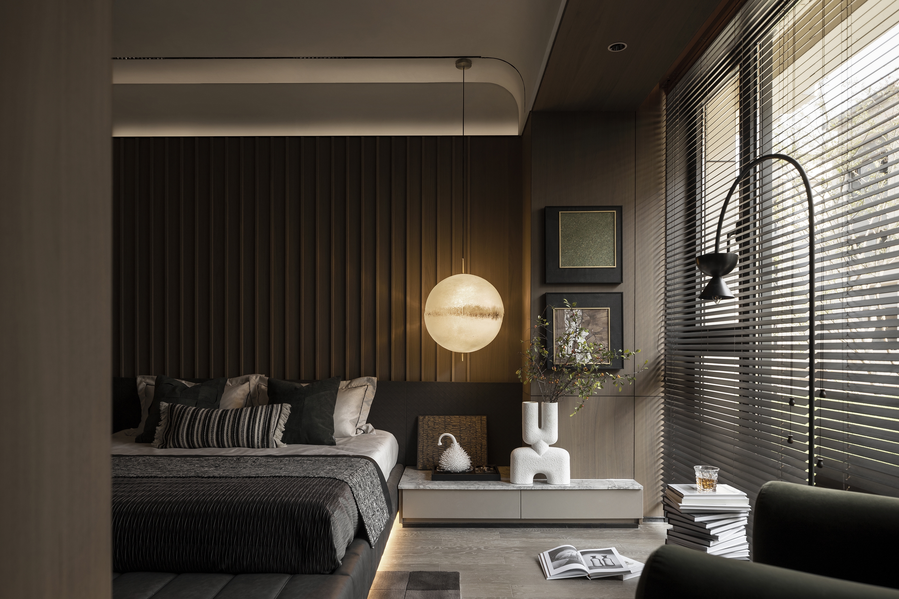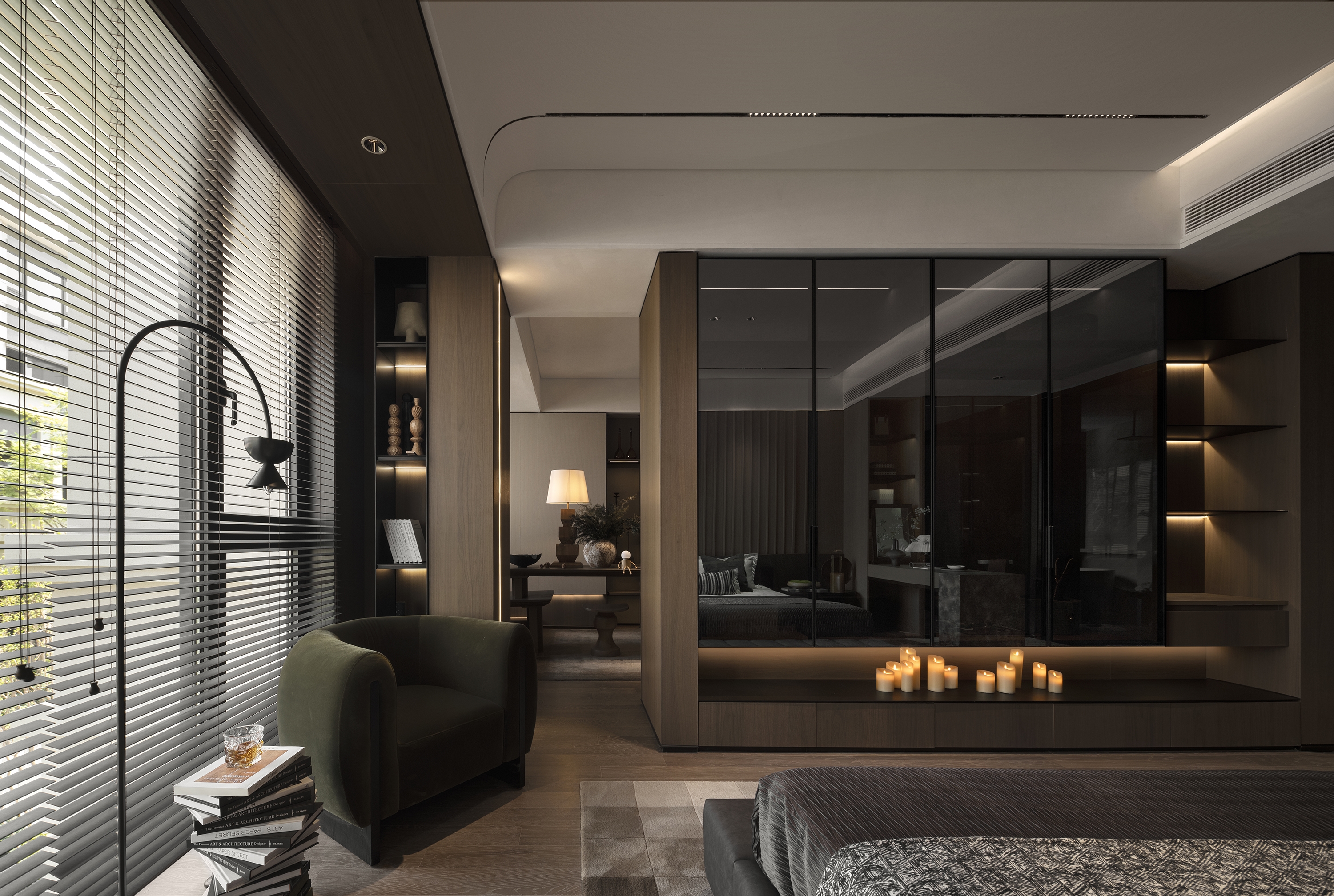 Inspired by the wabi-sabi style (Japan's natural aesthetics), it draws the wildness of art and the vitality of nature to mobilize emotional expression. The living room collides with dark and light colors, interspersed with dark green and Chinese red, supplemented by the elegant leather sofa, bonfires, vessels, and sculptures for decoration. The green plants add a fresh atmosphere to the space. The master bedroom exudes a soft and warm vibe with appropriate lighting and art installations. Each function of the study is relatively independent and perfectly combined. Sharing, reading, communicating, displaying, and listening are all possible. The tatami facing the window and plush toys evoke the children's passion for exploring life and satisfy their curiosity. In this context, the tension of space and the delicacy of materials help residents pursue the true nature of life between perfection and purity.