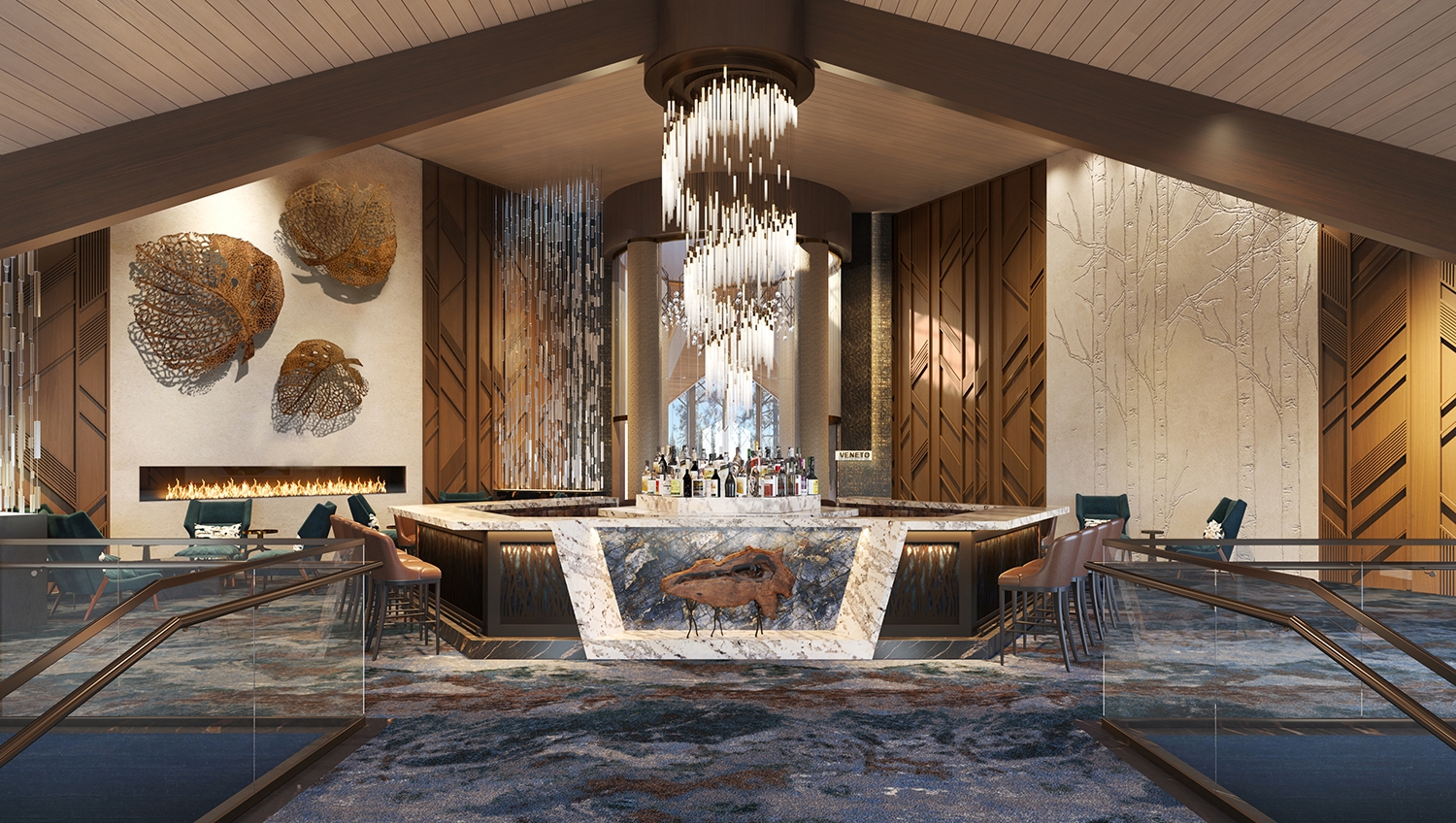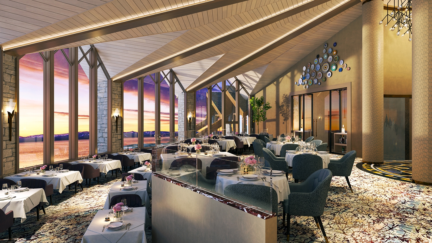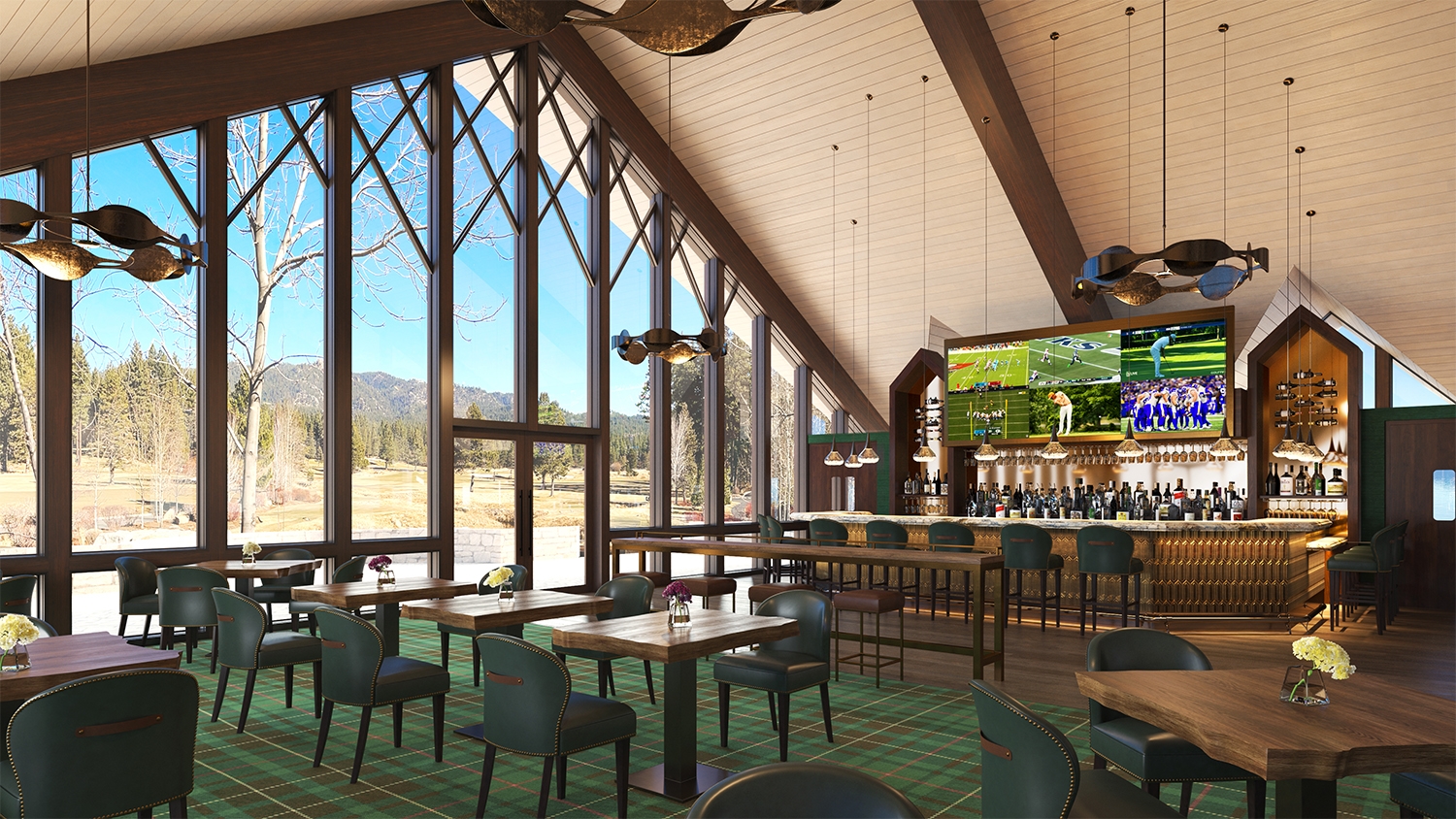 The Edgewood Tahoe Resort & Clubhouse is an iconic Mountain 5 Star destination where casual luxury meets lakeside experiences featuring South Tahoe’s only lakefront golf course. The Clubhouse interior design is a “modern mountain” vocabulary. Iconic triangular windows reveal glorious views of blue skies, clouds with magnificent views of Lake Tahoe. Custom chandeliers were inspired by ice sickles and mountain tops. Our vision is to revitalize the interiors with an ambience that harmonizes with the existing resort's interior language. A new central bar is strategically designed to activate the space. Textural elements such as hand-hued wood columns, bronze and carved limestone walls adorn the space. Flooring is created with custom Axminister carpets inspired by the nearby forest, rippling lake and snow-capped mountains. The Specialty Northern Italian Dining venue features unparalleled vistas of the lake and mountains beyond for a romantic view. Brooks Bar features nature's cozy green plaids infused with wood elements, bronze and copper hues. The indoor outdoor space focuses the view out towards the 1st tee.