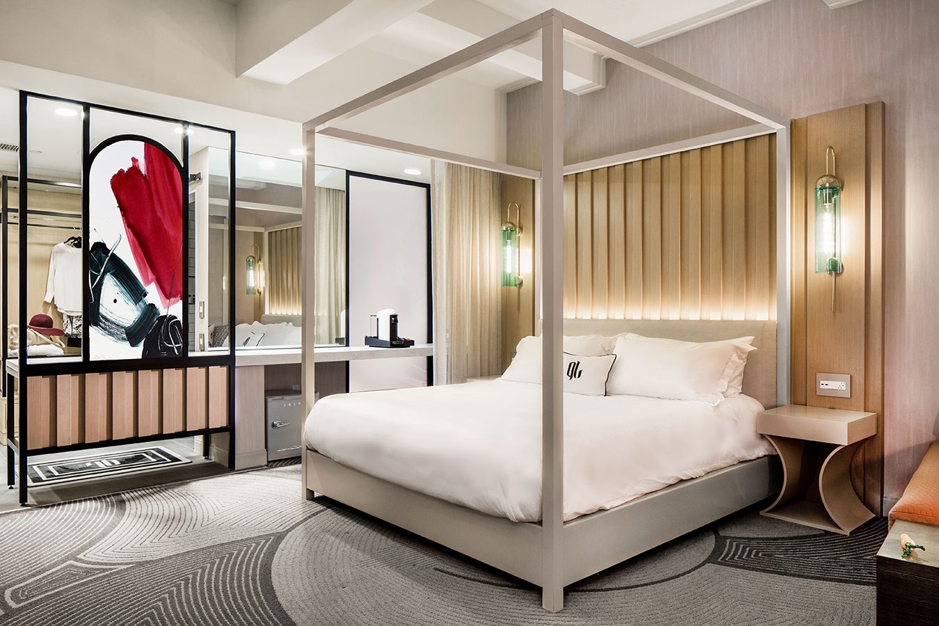 The process of glassmaking, incorporating the elements of sand, fire, and air, is played out in curated, whimsical details in the hotel’s spaces; guestrooms are specifically envisioned as a play on the glassblower’s studio. Art is inspired by the color chips used for glassblowing. In the public spaces, the glass art takes center stage; a marriage of wood and glass details further nod to the glassmaking process, while iconic commissioned and one-of-a-kind pieces from Chihuly, Peter Bremers, Stephen Powell, Lino Tagliapietra, and others serve as a catalyst for larger conversations surrounding the artistry, inherent authenticity, and actual creation of glass. The showstoppers? Two custom, life-size glass bunnies by Bremers—one greeting guests at reception and another draped across the bar—casted and molded in Bremers’ studio in the Netherlands specifically for this hotel.