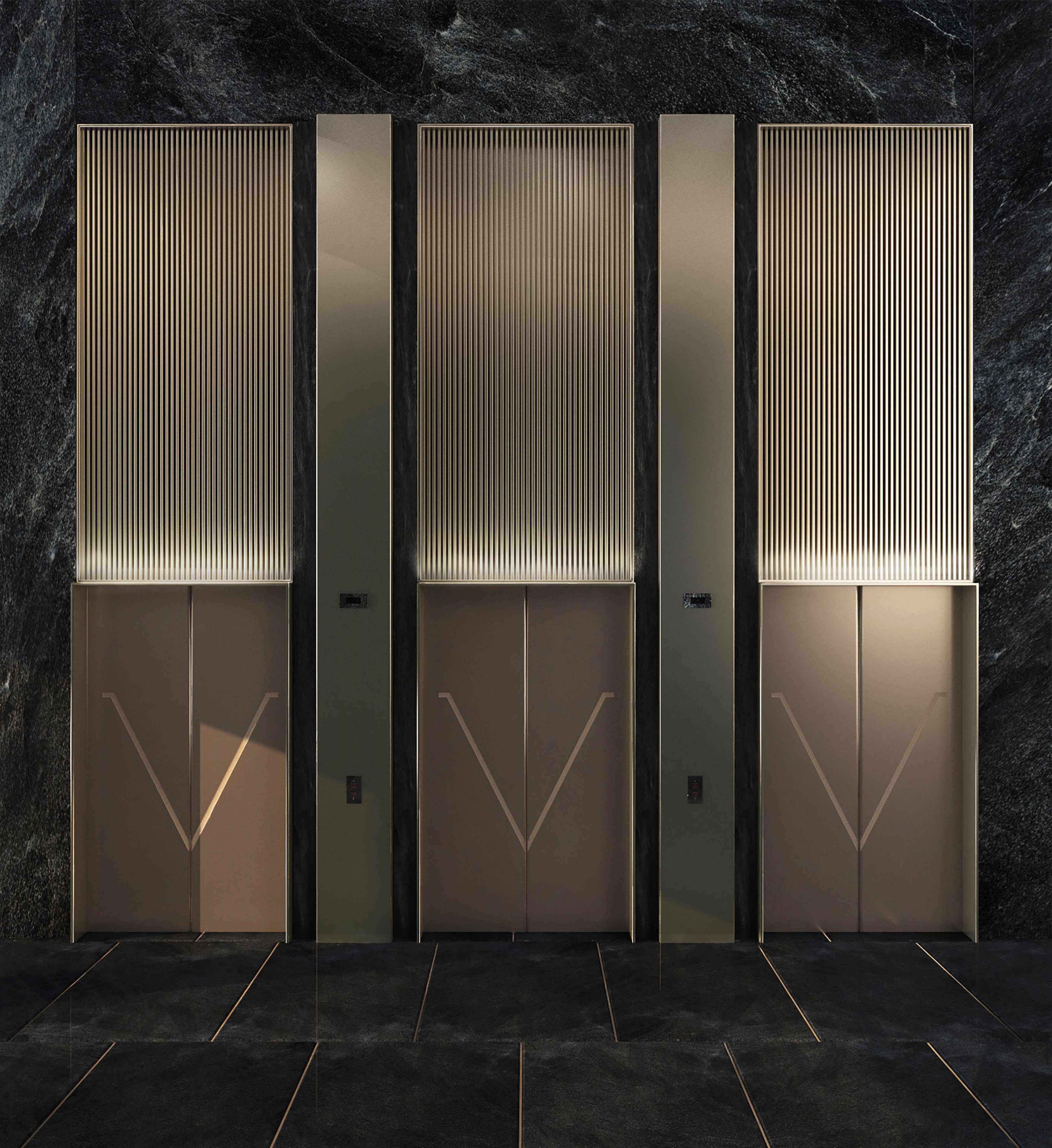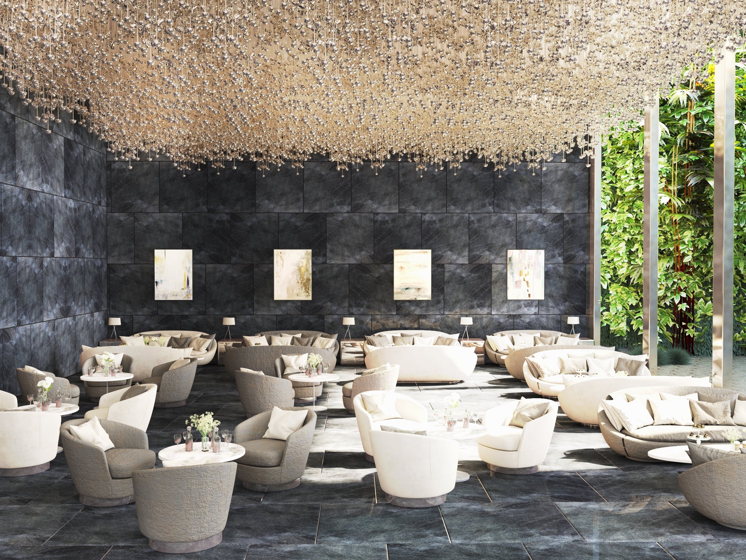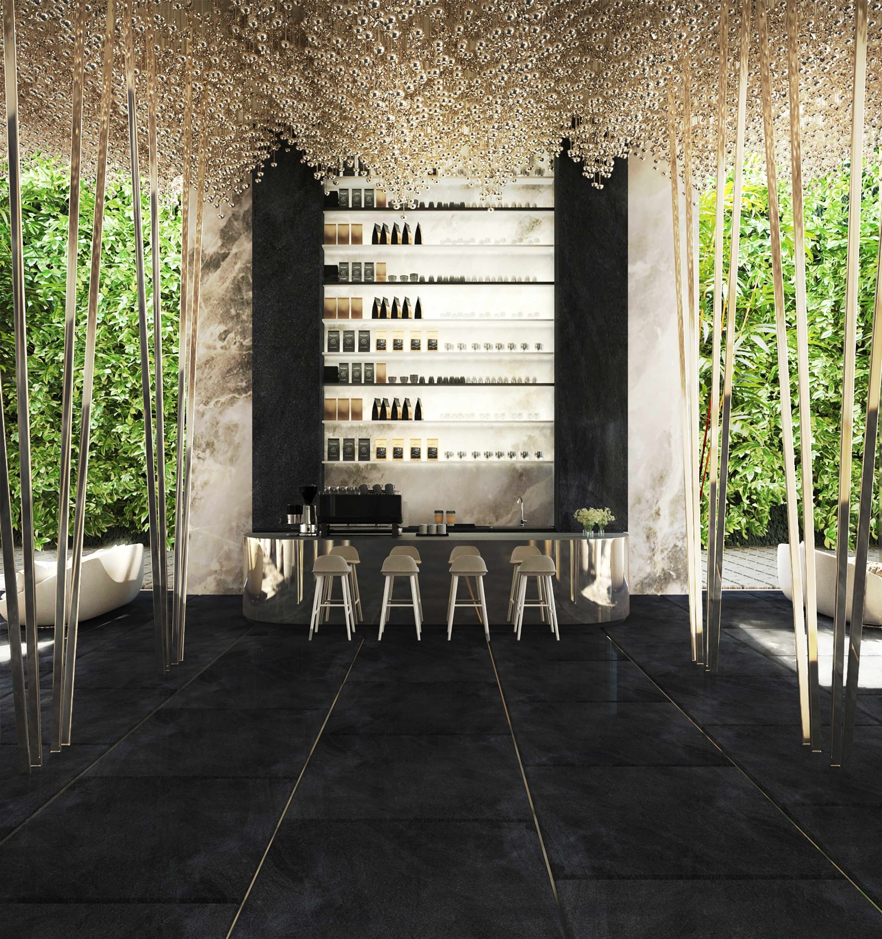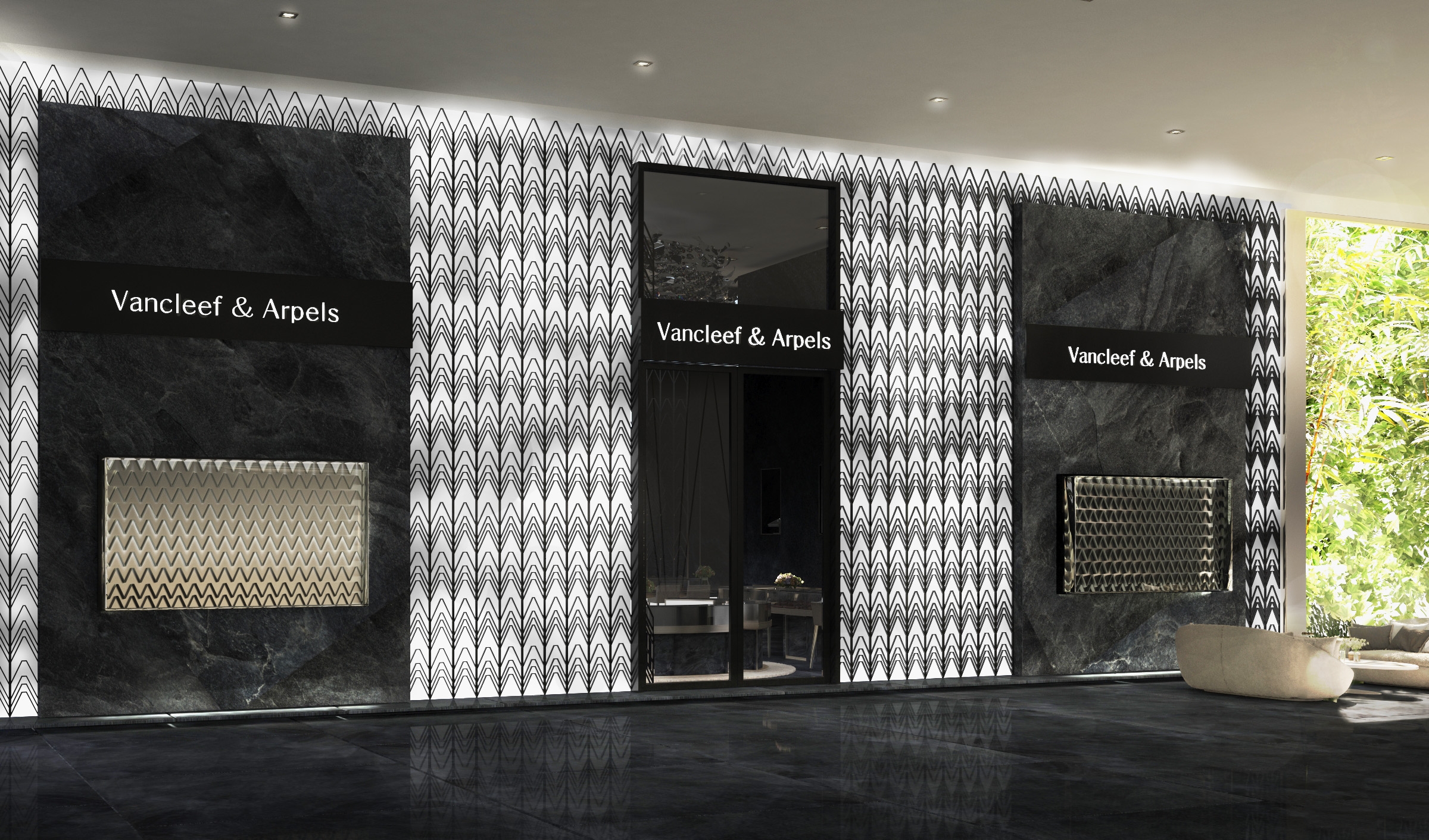 Jewelry brand Van Cleef & Arpels inspires this Hotel and will represent how jewelry and hotel space is connected. Jewelry is made out of pieces of natural stone. In this respect, inspired by the leaf which is defined as a piece of forest, the leaves are expressed by not only a mysterious atmosphere that has forest but also patterns on the wall in hotel Van Cleef & Arpels.