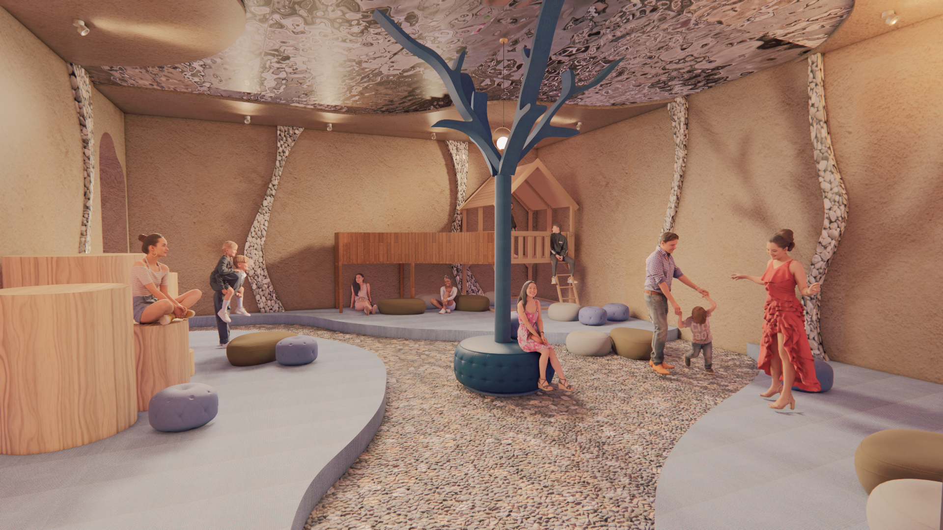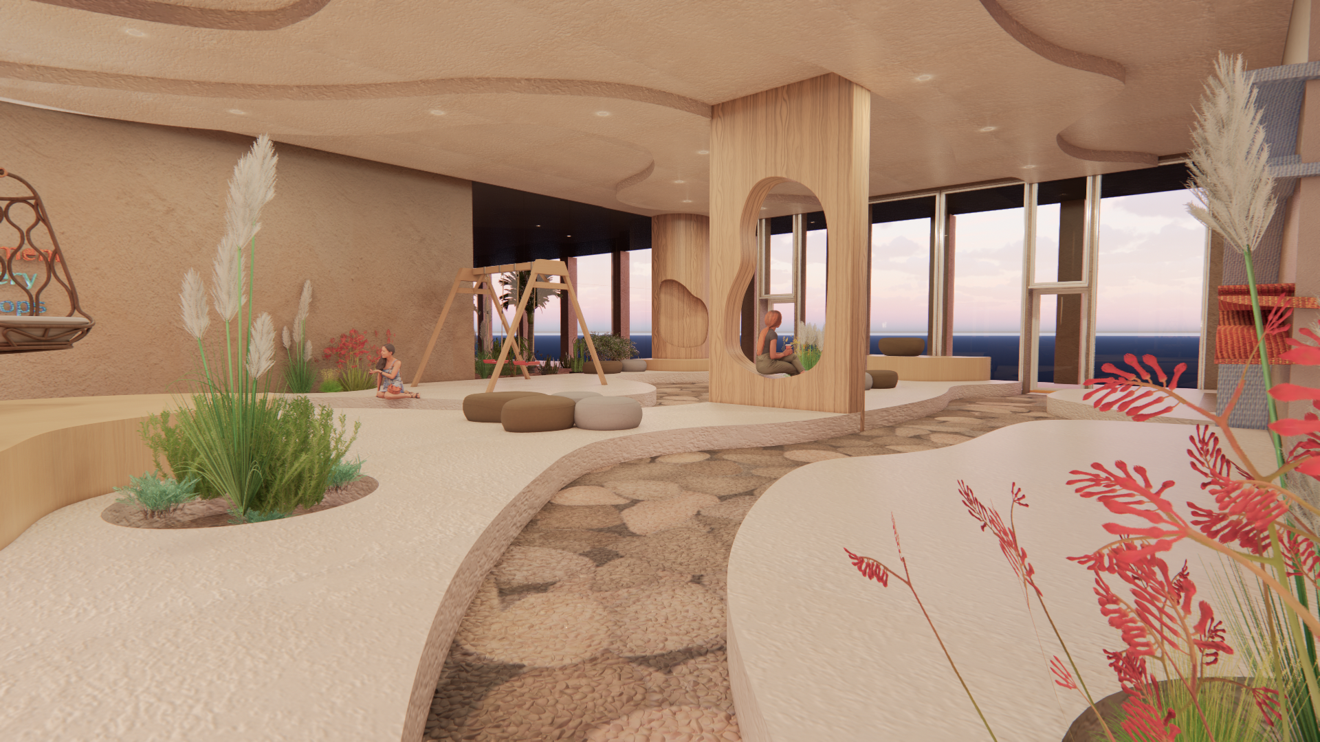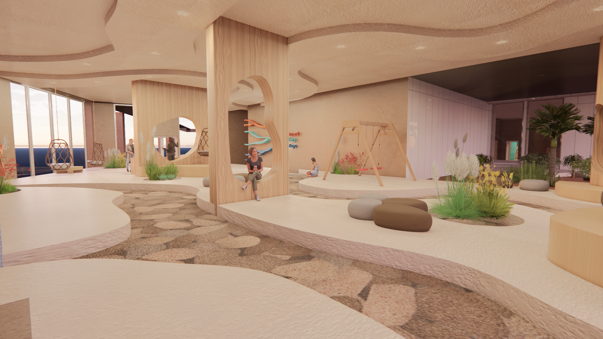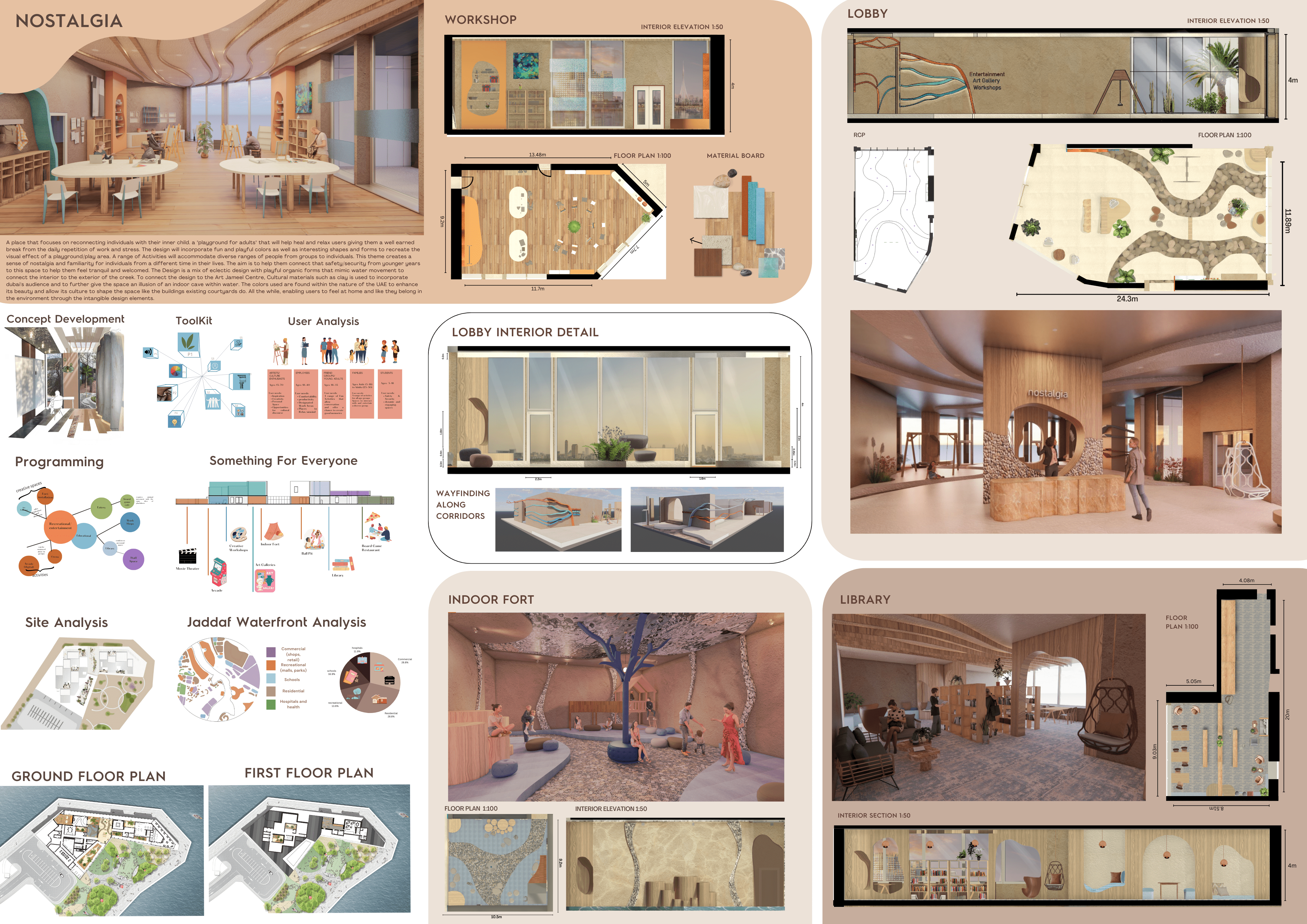 The Proposals Focus is to reconnect individuals with their inner child. A "playground for adults" that will help heal and relax users giving them a well earned break from the daily repetition of work/stress. The design will incorporate fun and playful colors as well as interesting shapes and forms to recreate the visual effect of a playground/play area. A range of Activities will accommodate diverse ranges of people from groups to individuals. This theme creates a sense of nostalgia and familiarity for individuals from a different time in their lives. The aim is to help them connect that safety/security from younger years to this space to help them feel tranquil and welcomed. The Design is a mix of eclectic design with playful organic forms that mimic water movement to connect the interior to the exterior of the creek. Culturally significant Materials such as clay is used to further give the space an illusion of an indoor cave within water. The color's used are found within the nature of the UAE to enhance its beauty and allow its culture to shape the space. All the while, enabling users to feel at home and like they belong in the environment through the intangible design elements.