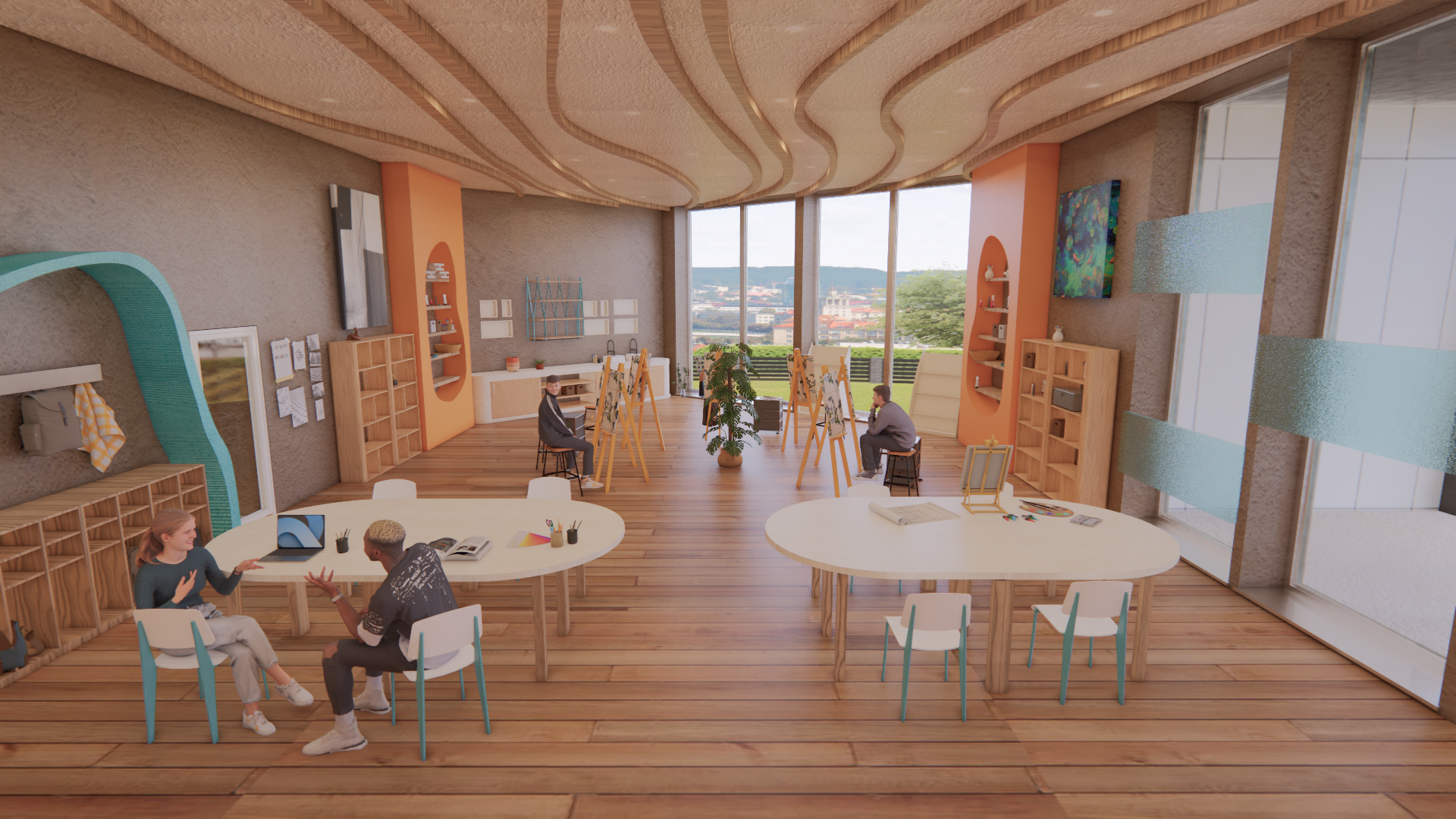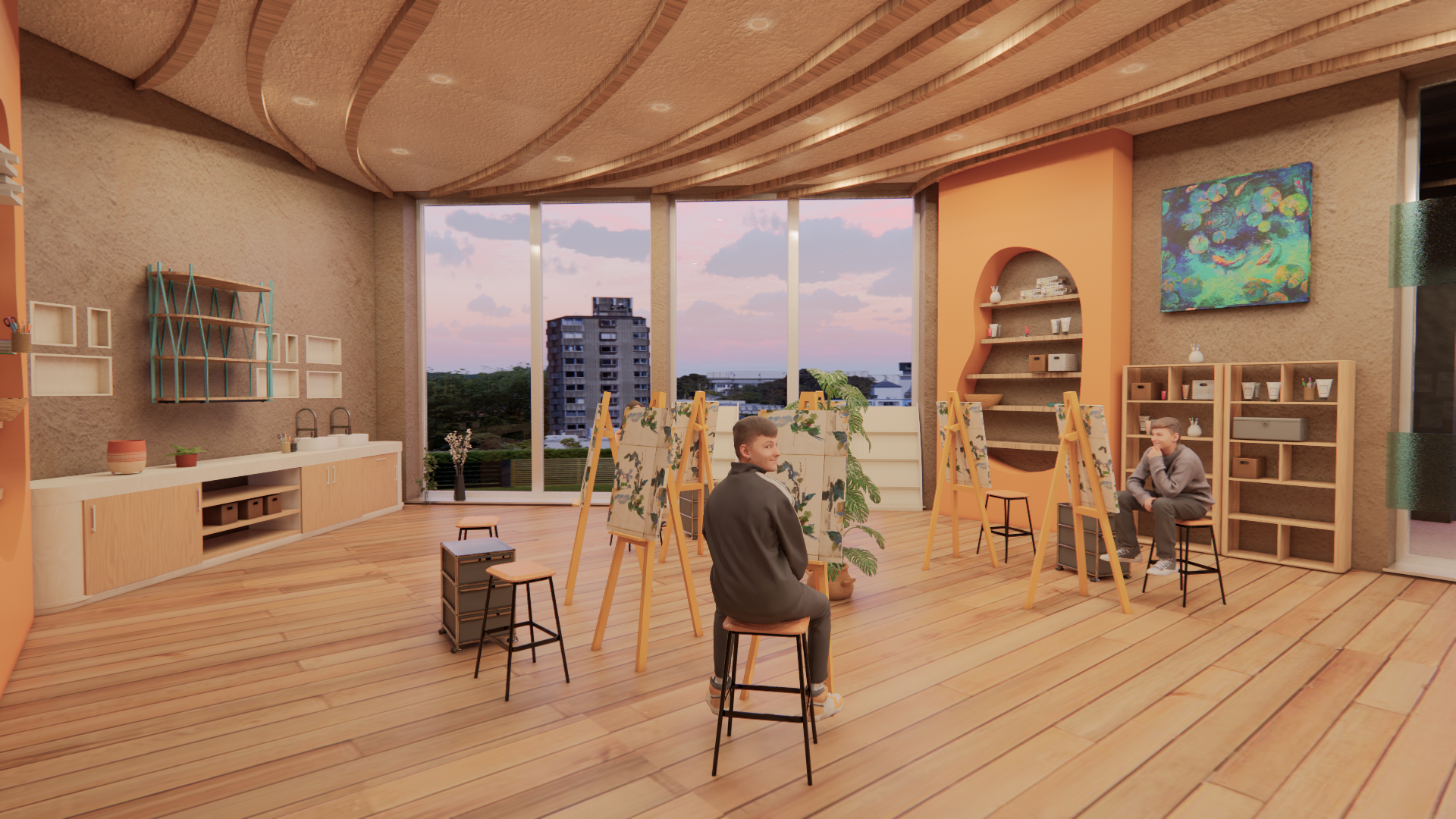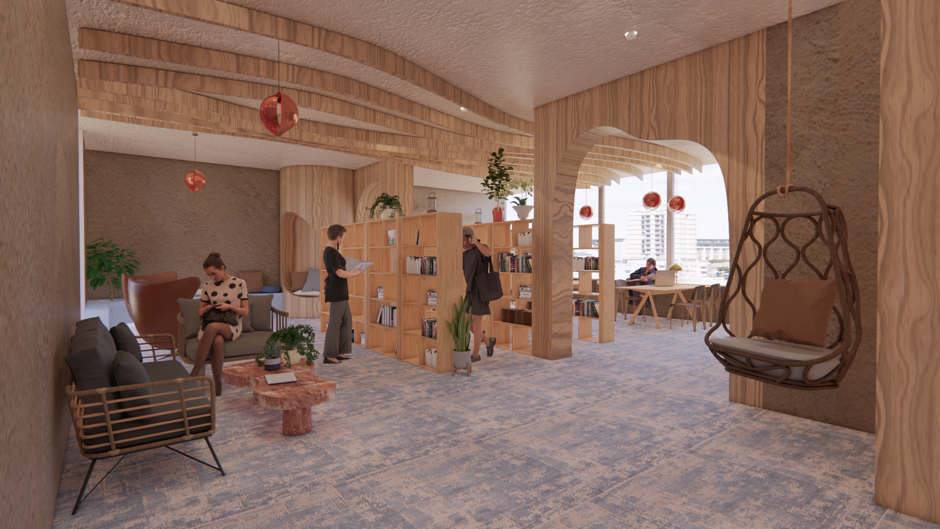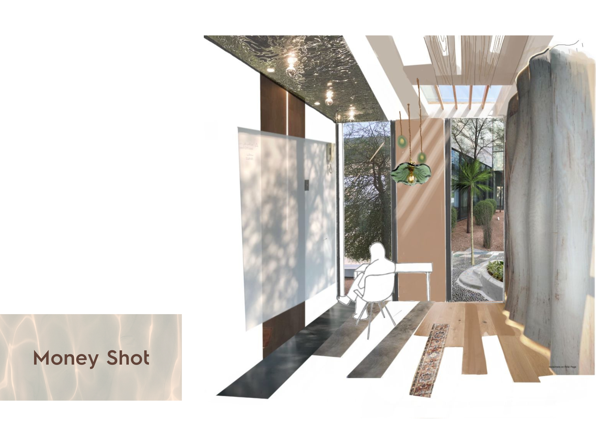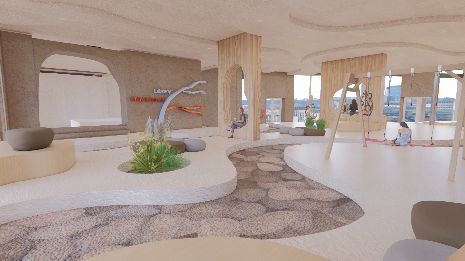 The Proposals Focus is to reconnect individuals with their inner child. A "playground for adults" that will help heal and relax users giving them a well earned break from the daily repetition of work/stress. The design will incorporate fun and playful colors as well as interesting shapes and forms to recreate the visual effect of a playground/play area. A range of Activities will accommodate diverse ranges of people from groups to individuals. This theme creates a sense of nostalgia and familiarity for individuals from a different time in their lives. The aim is to help them connect that safety/security from younger years to this space to help them feel tranquil and welcomed. The Design is a mix of eclectic design with playful organic forms that mimic water movement to connect the interior to the exterior of the creek. Culturally significant Materials such as clay is used to further give the space an illusion of an indoor cave within water. The color's used are found within the nature of the UAE to enhance its beauty and allow its culture to shape the space. All the while, enabling users to feel at home and like they belong in the environment through the intangible design elements.