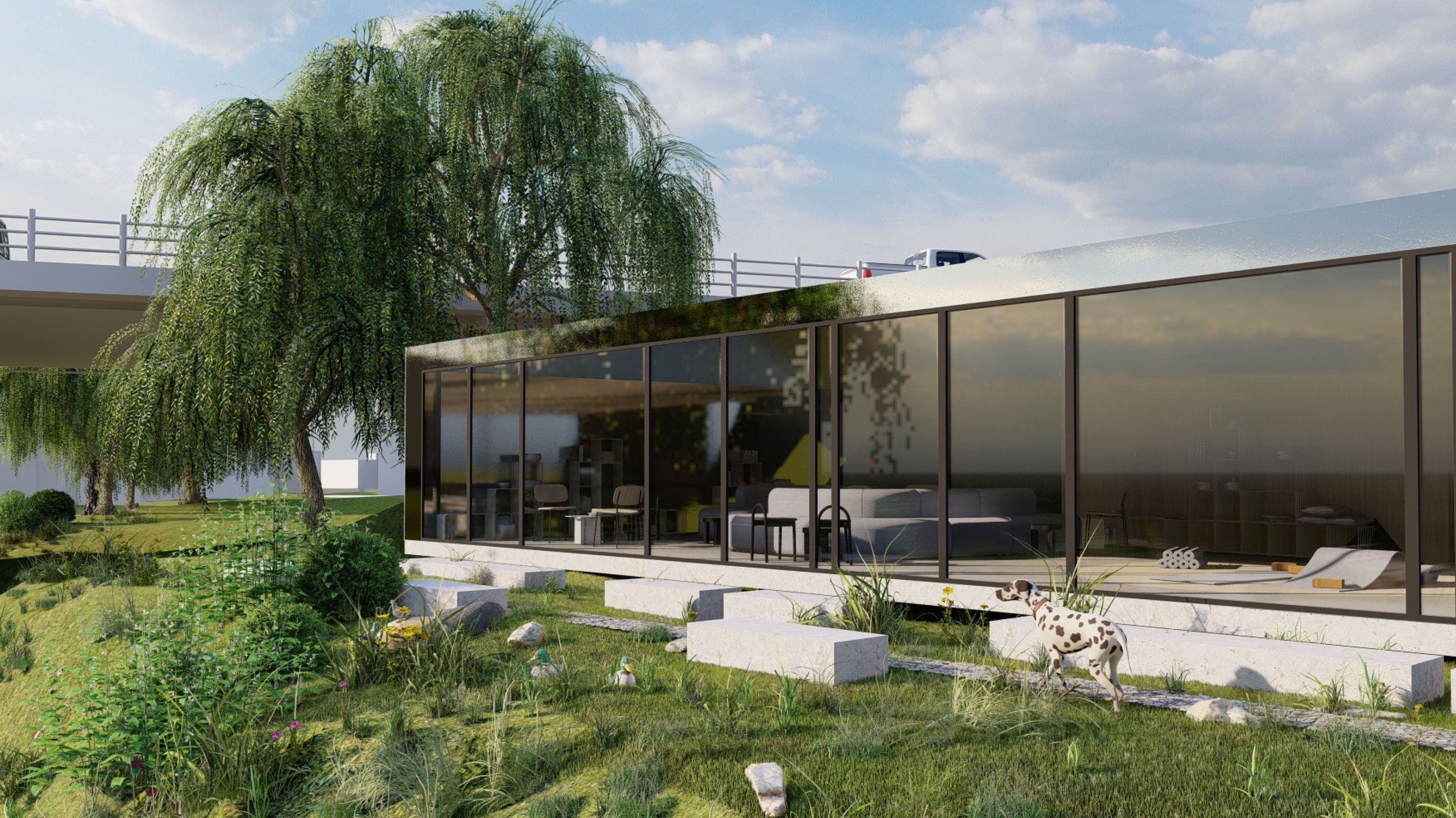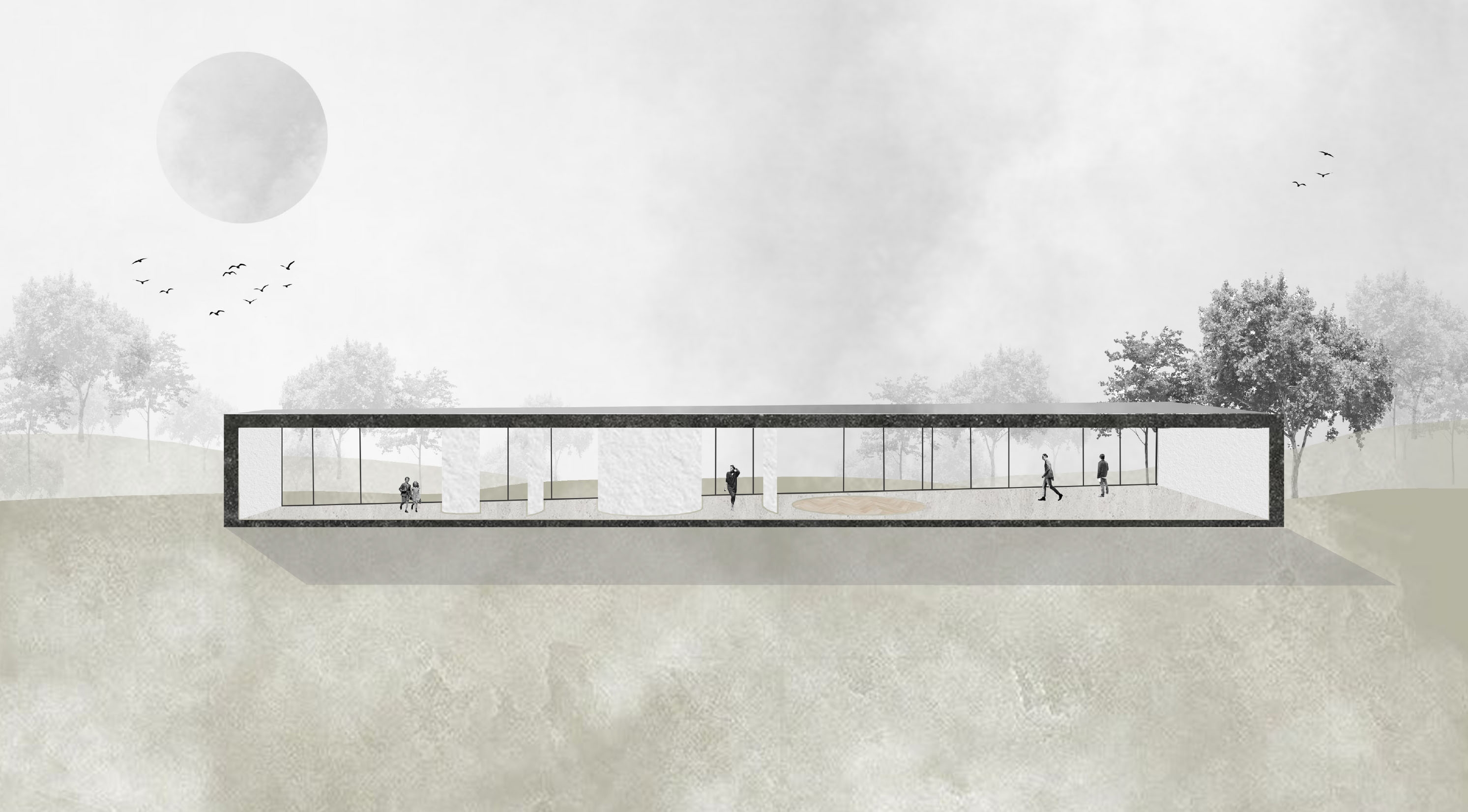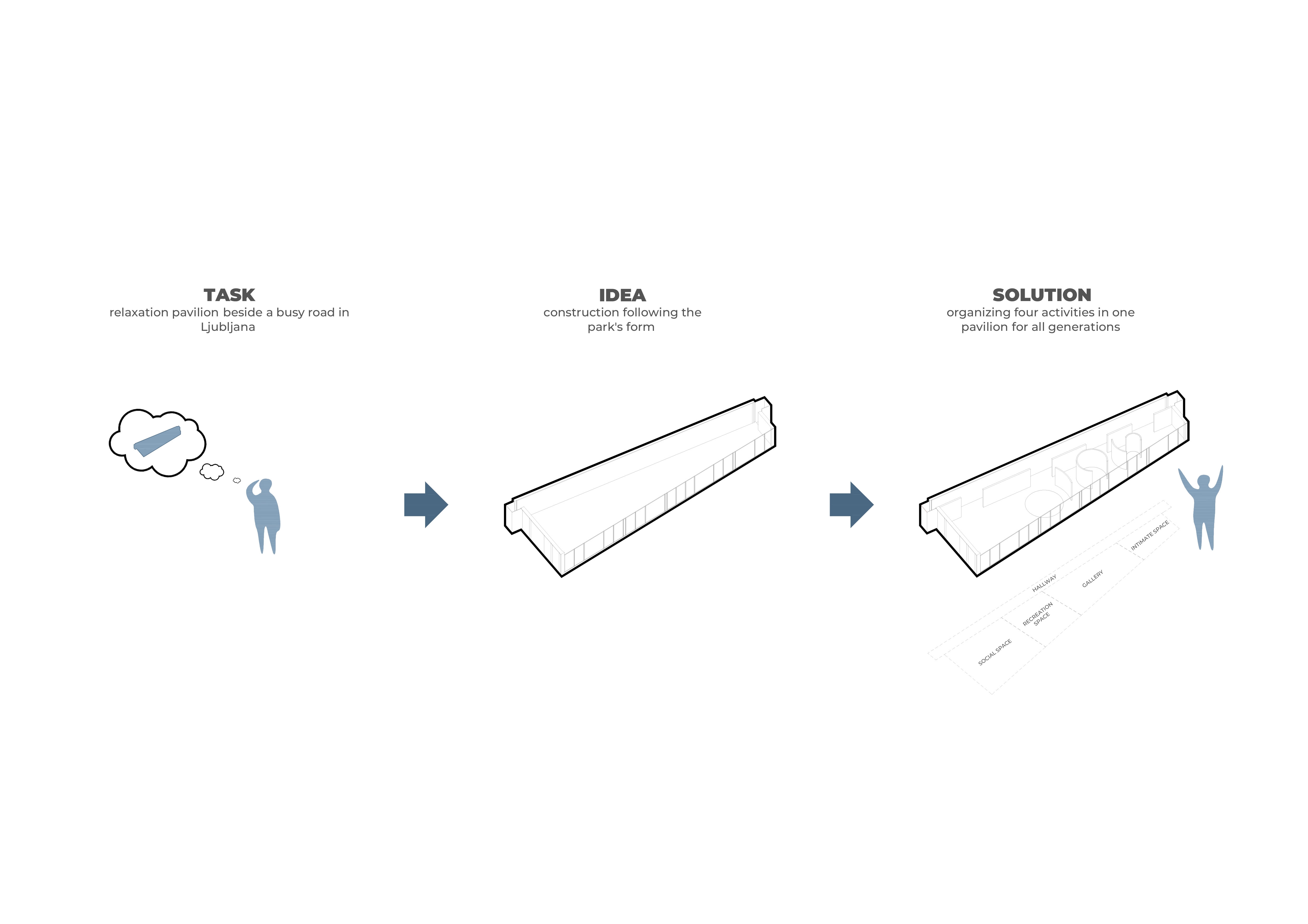 The pavilion is designed designed with a simple form, whose shape follows the space in which it is placed - Gradascica Park, Ljubljana. The resulting construction is likemost of the elements in the park - linear. From east to west, the structure narrows, asdoes the space in which it is set. The facade is made of a high-polished reflective metal, making the structure almost invisible. At the southern end, the pavilion opens out onto the park, where visitors can enjoy the view. By narrowing the structure, a more private part of the interior is created, and a more open part for those who come in company or do not need so much intimacy.