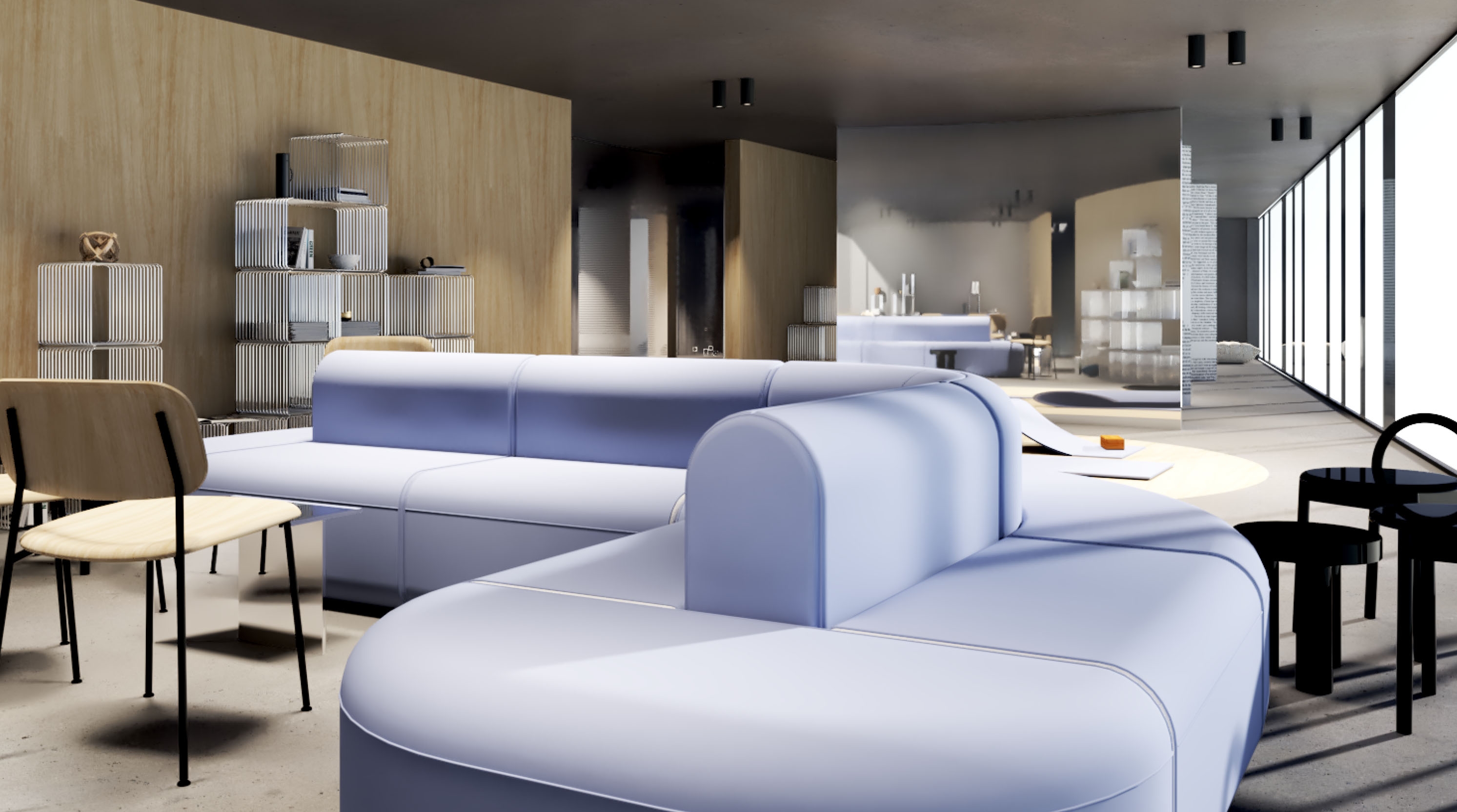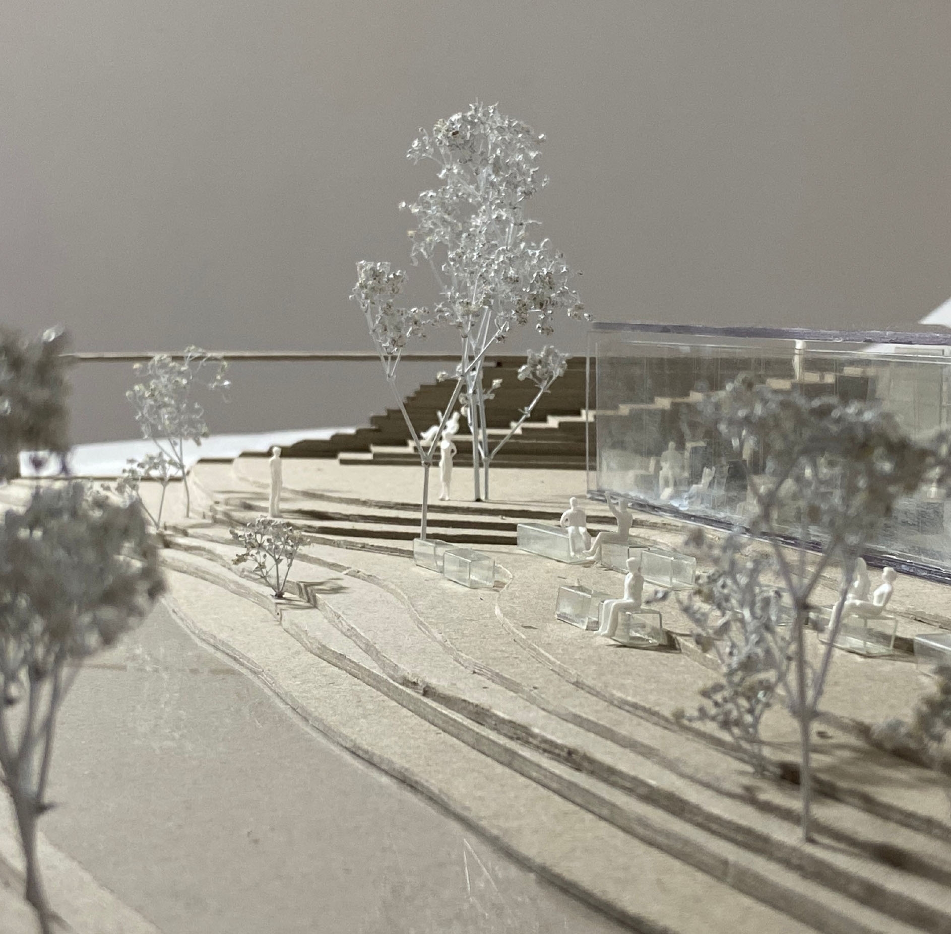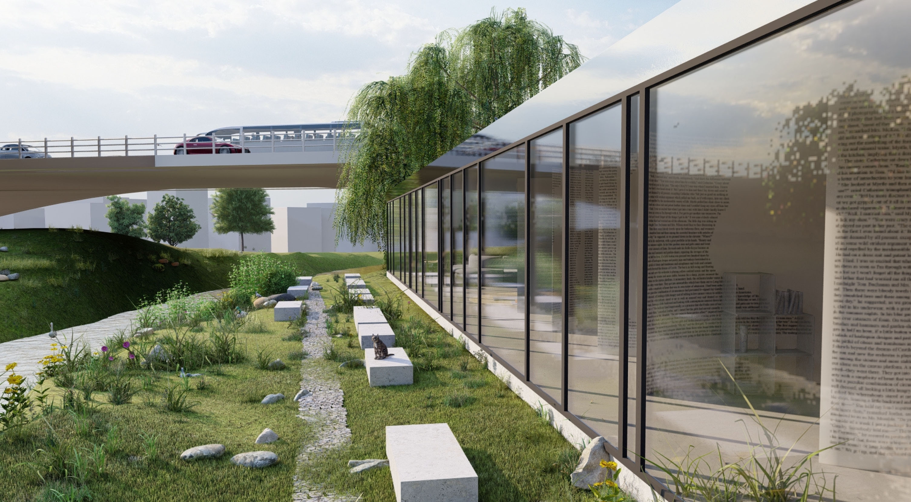 The pavilion is designed designed with a simple form, whose shape follows the space in which it is placed - Gradascica Park, Ljubljana. The resulting construction is likemost of the elements in the park - linear. From east to west, the structure narrows, asdoes the space in which it is set. The facade is made of a high-polished reflective metal, making the structure almost invisible. At the southern end, the pavilion opens out onto the park, where visitors can enjoy the view. By narrowing the structure, a more private part of the interior is created, and a more open part for those who come in company or do not need so much intimacy.
