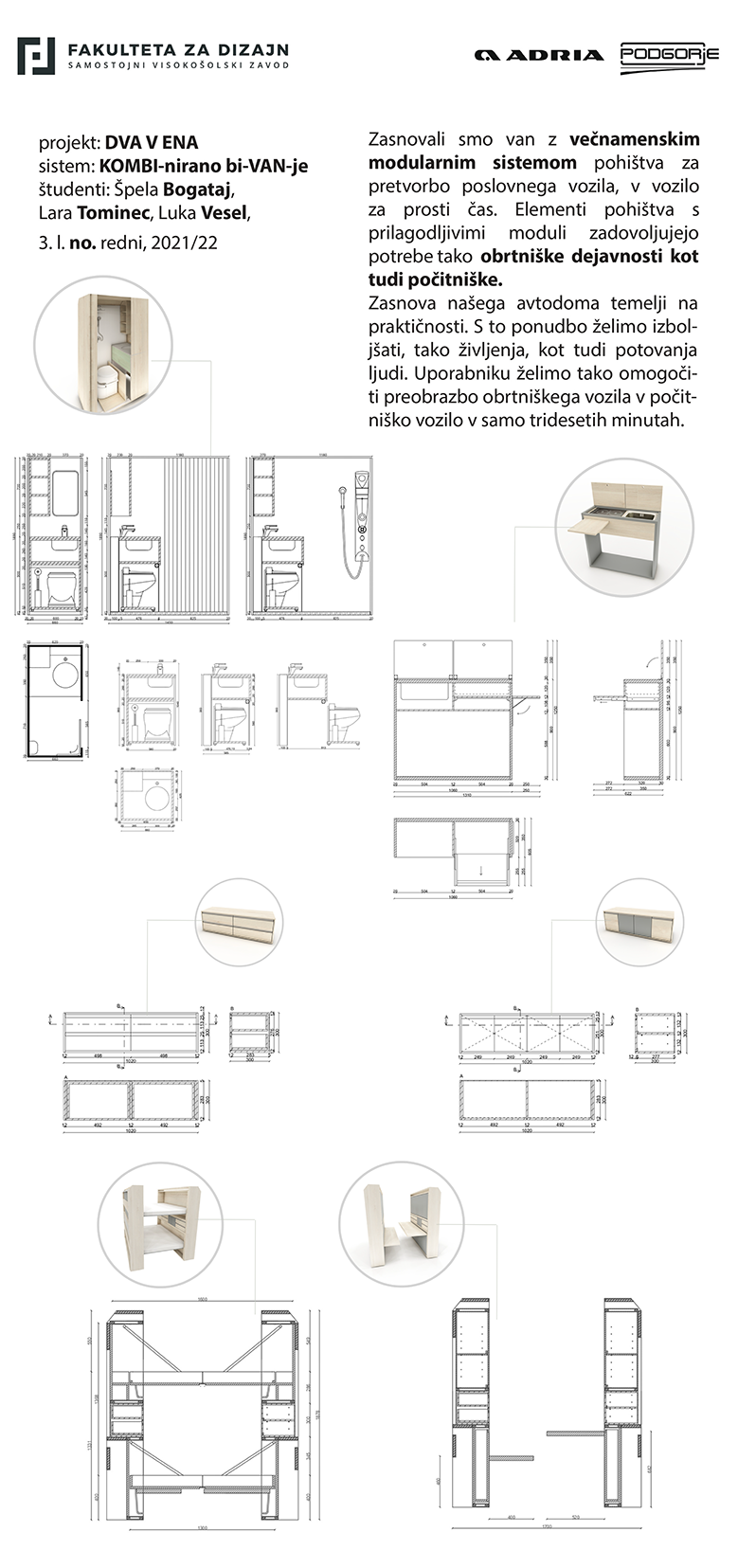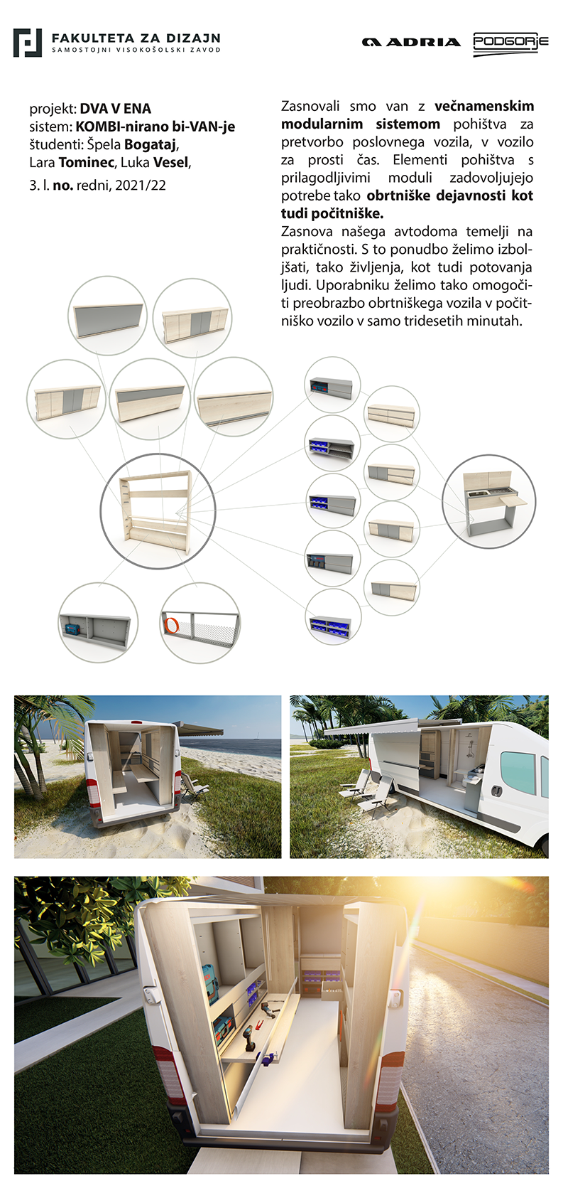 In these circumstances, two leading companies in the European caravanning industry came up with an initiative to collaborate with the faculty in the development of a multi-functional van. Therefore, in the academic year 2021/2022, we implemented a project entitled Two in One. Students of the third year of the Interior Design course participated in the project. The starting point of the task was how to design a system solution of modular furniture, with which the owner transforms a normal van, which is used for business or private purposes during the week, into a functional vacation vehicle in less than 30 minutes.