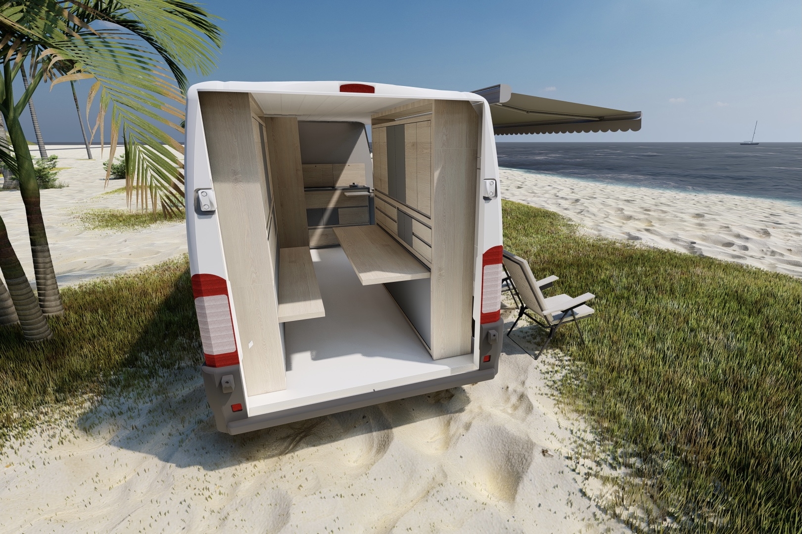 The presented project is designed as a multifunctional modular furniture system, the central element of which is a modular wall, which is complemented by system elements adapted for different functions. The advantage of the modular wall is the design, which enables an extremely quick transformation of a craft vehicle into a holiday vehicle.