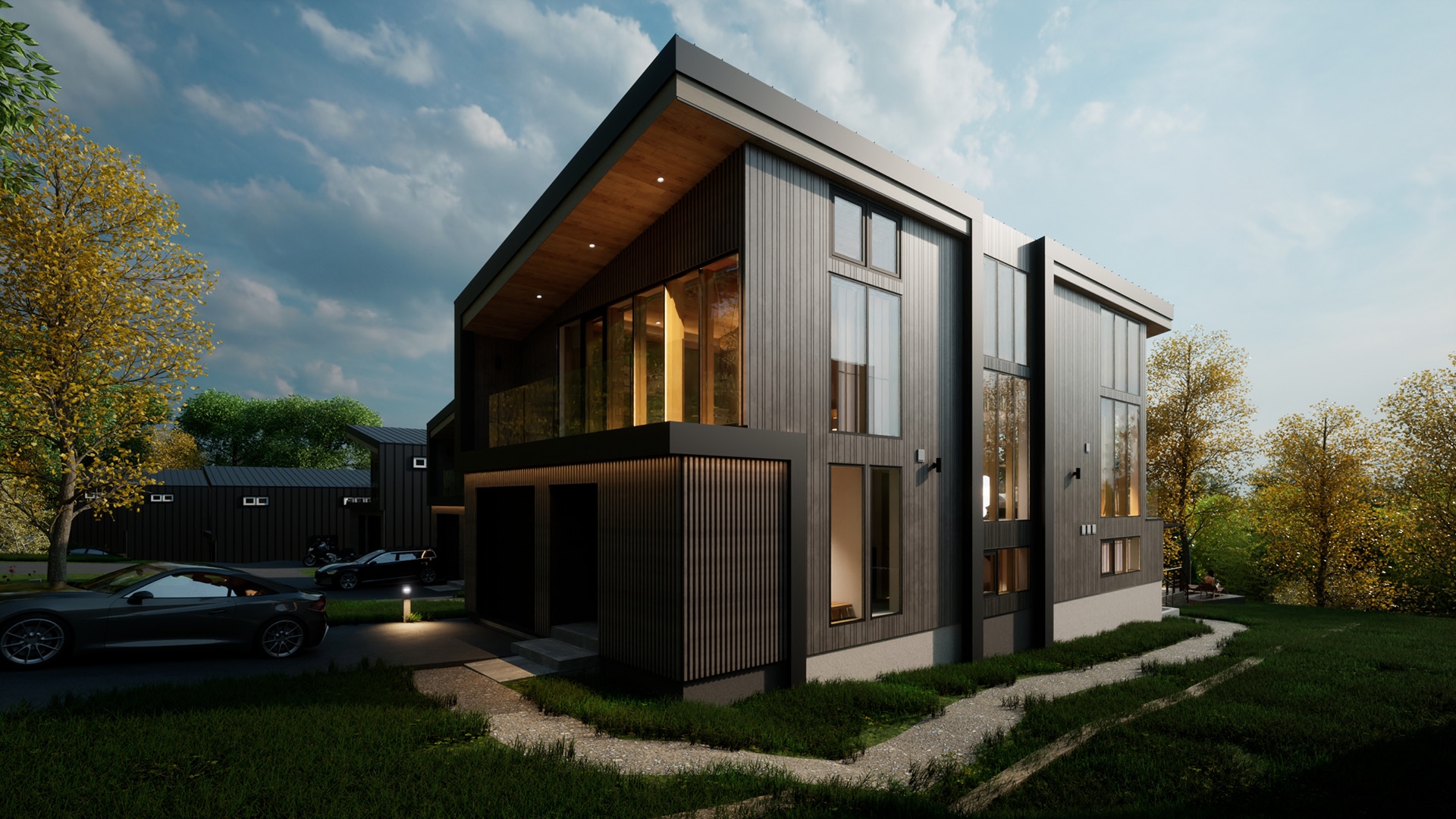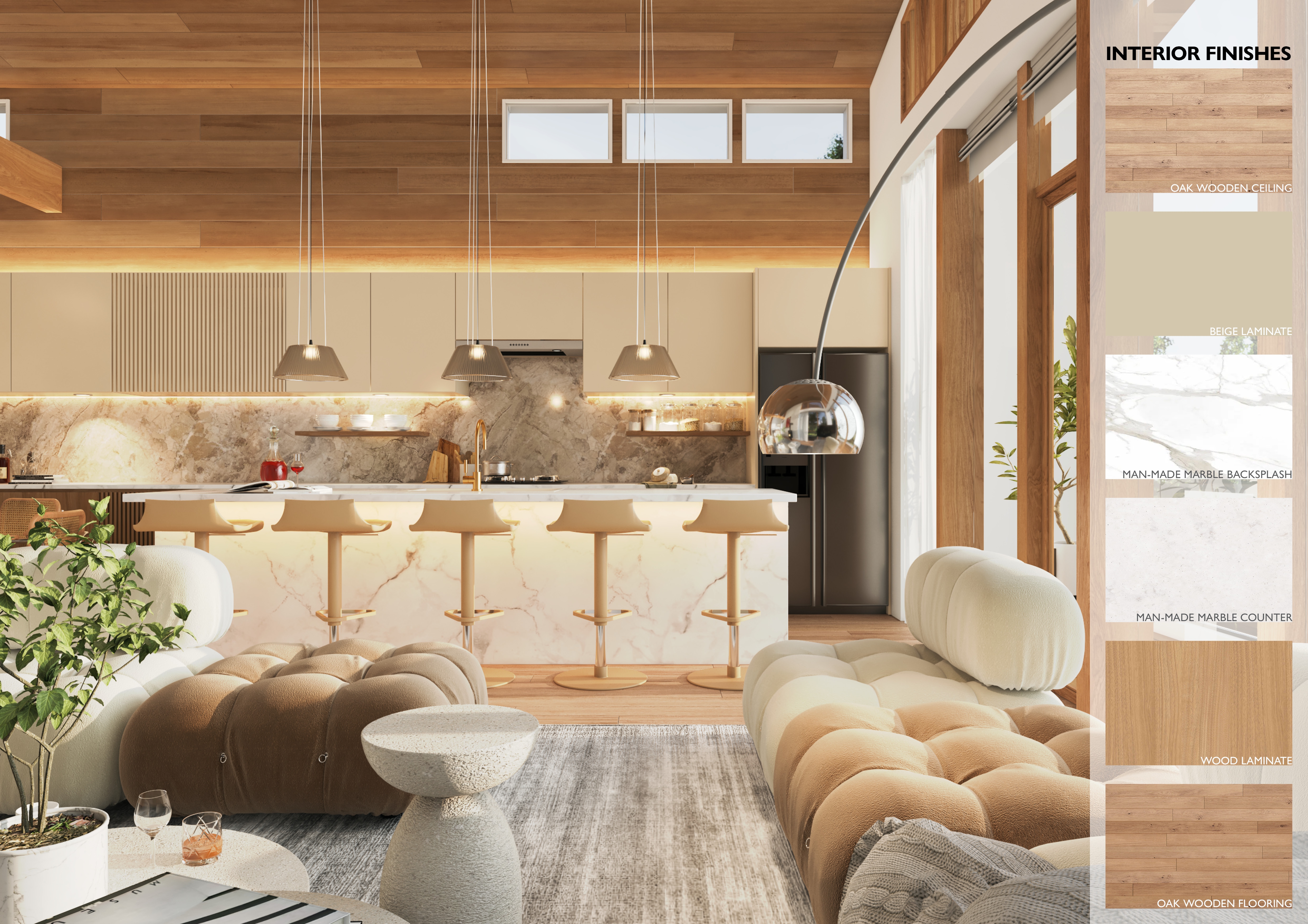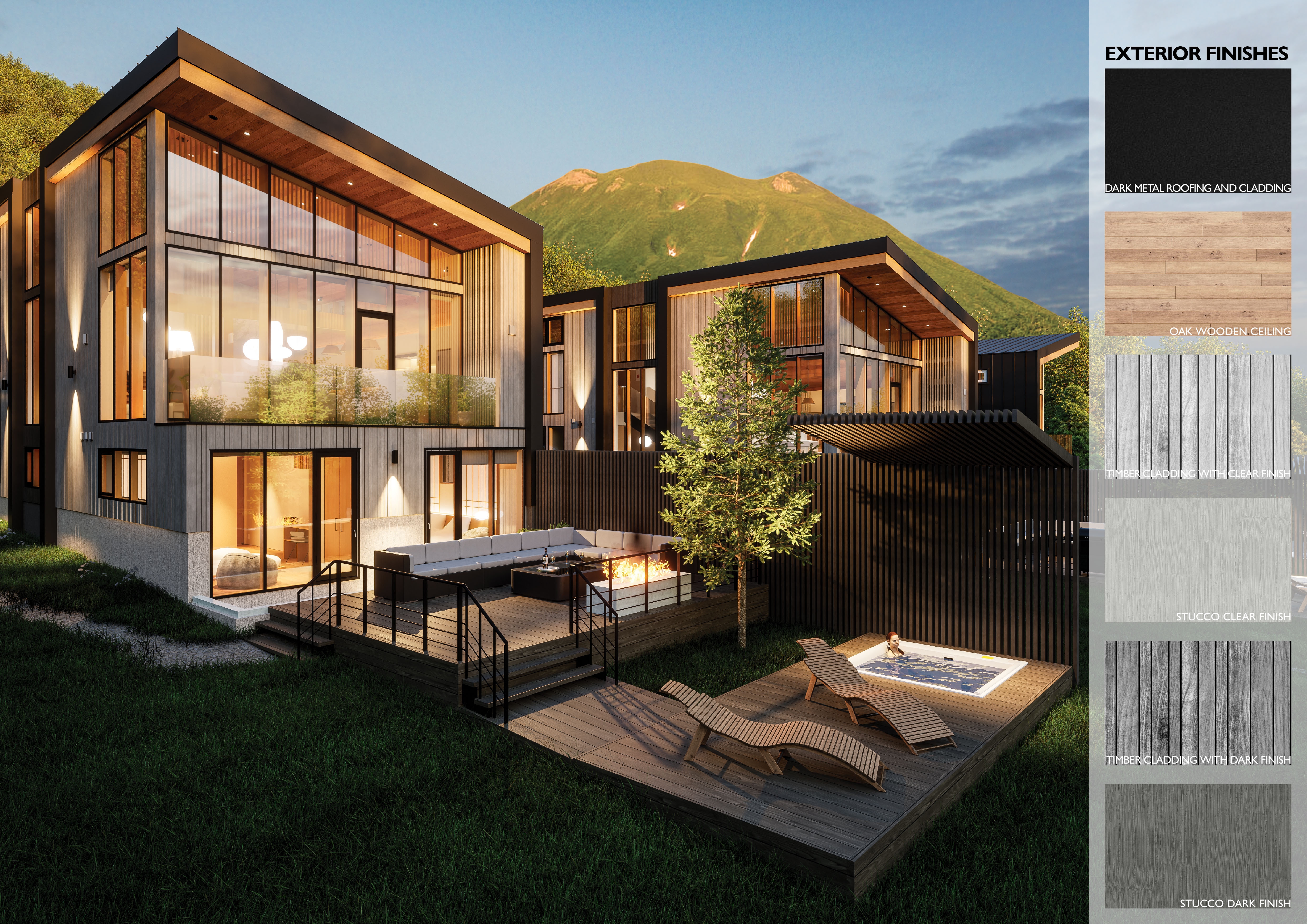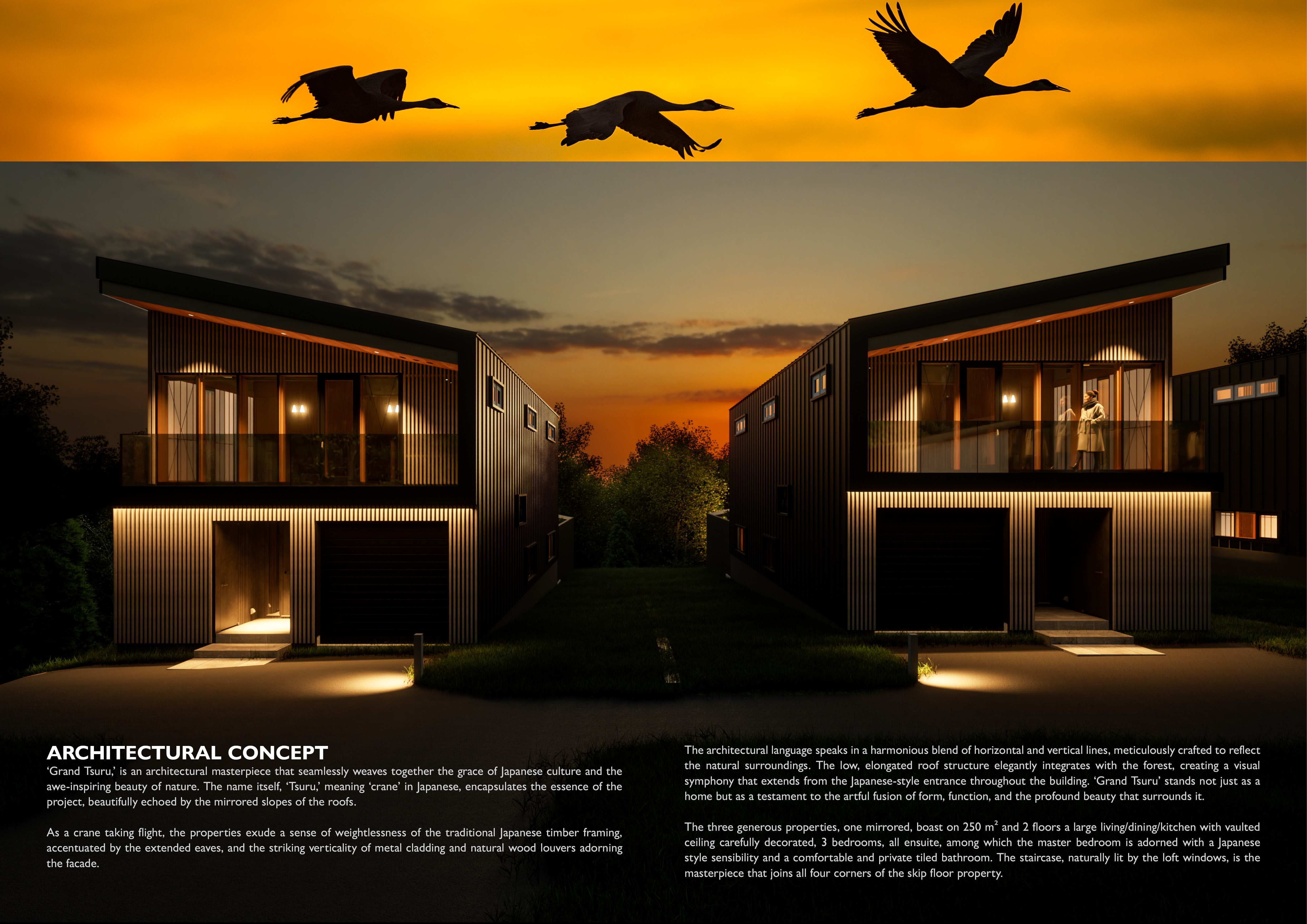 Inspired by Japanese culture and nature's beauty, 'Grand Tsuru', meaning 'crane' in Japanese, symbolizes the project's essence, reflected in the mirrored roofs. The properties exude a sense of weightlessness of traditional timber framing, accentuated by extended eaves.