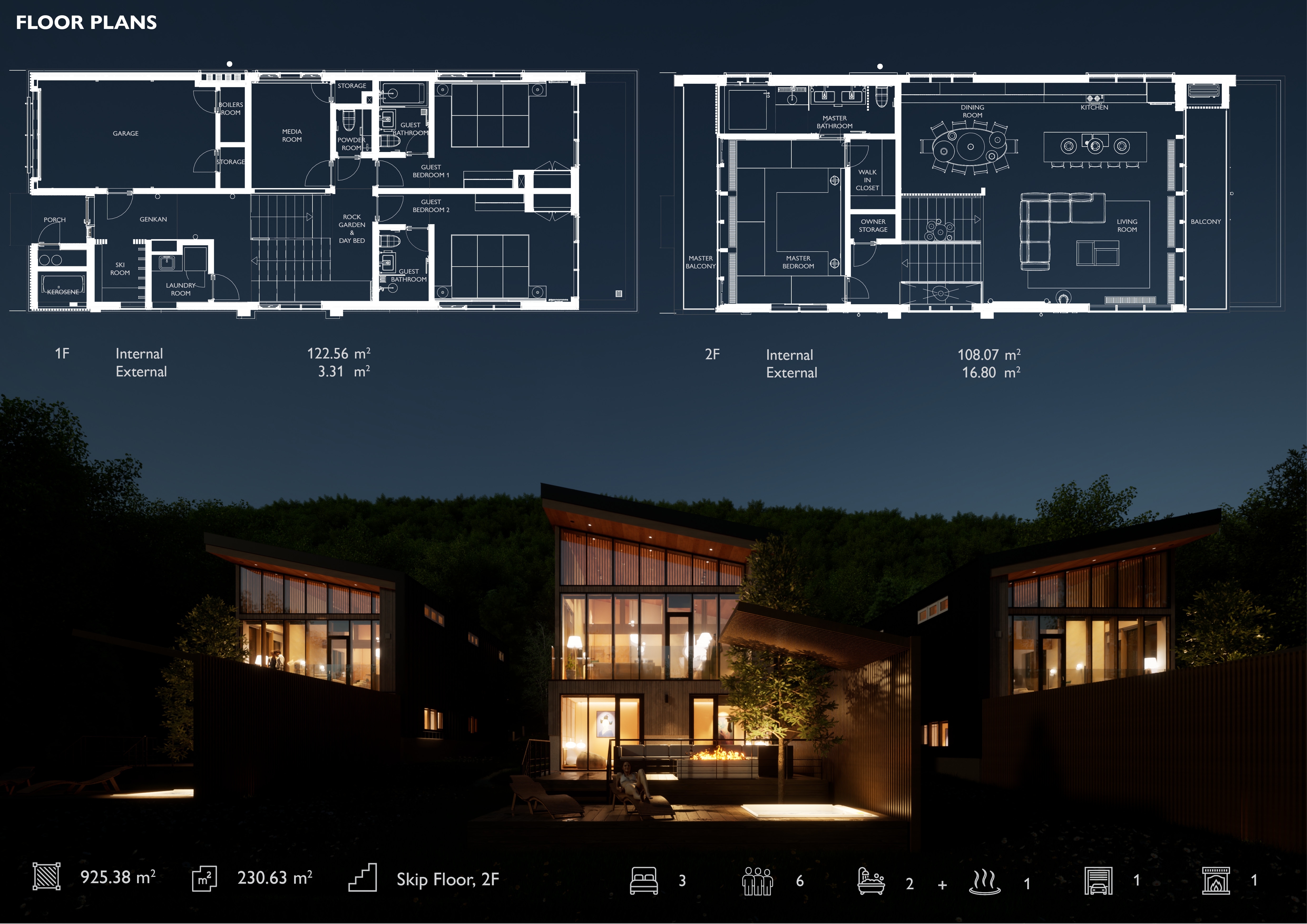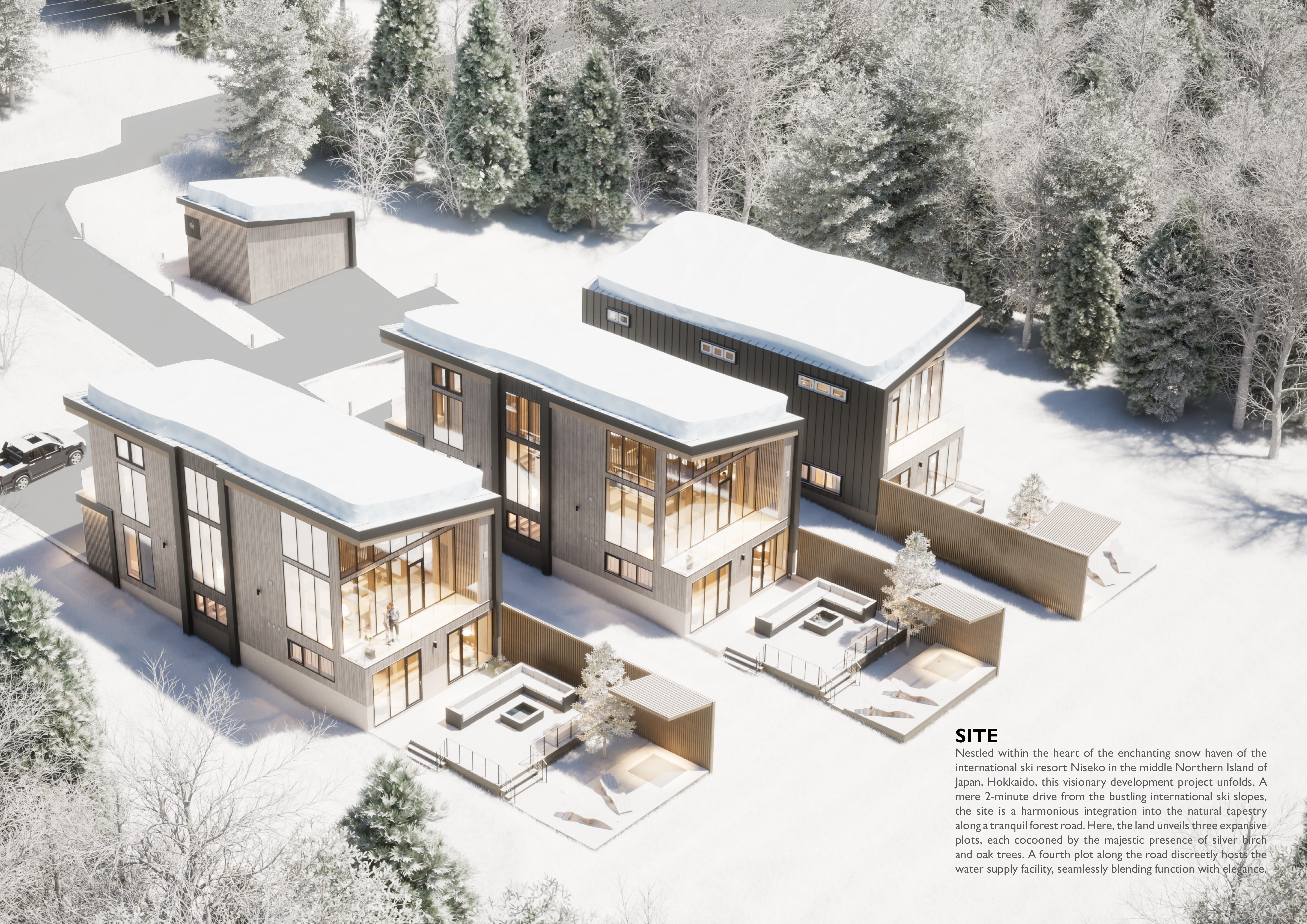 Nestled in the heart of the captivating snow haven of Niseko, the international ski resort in Japan, a visionary development project named 'Grand Tsuru' unfolds. Situated just a 2-minute drive from the lively ski slopes, the project seamlessly integrates into the natural landscape along a serene forest road.