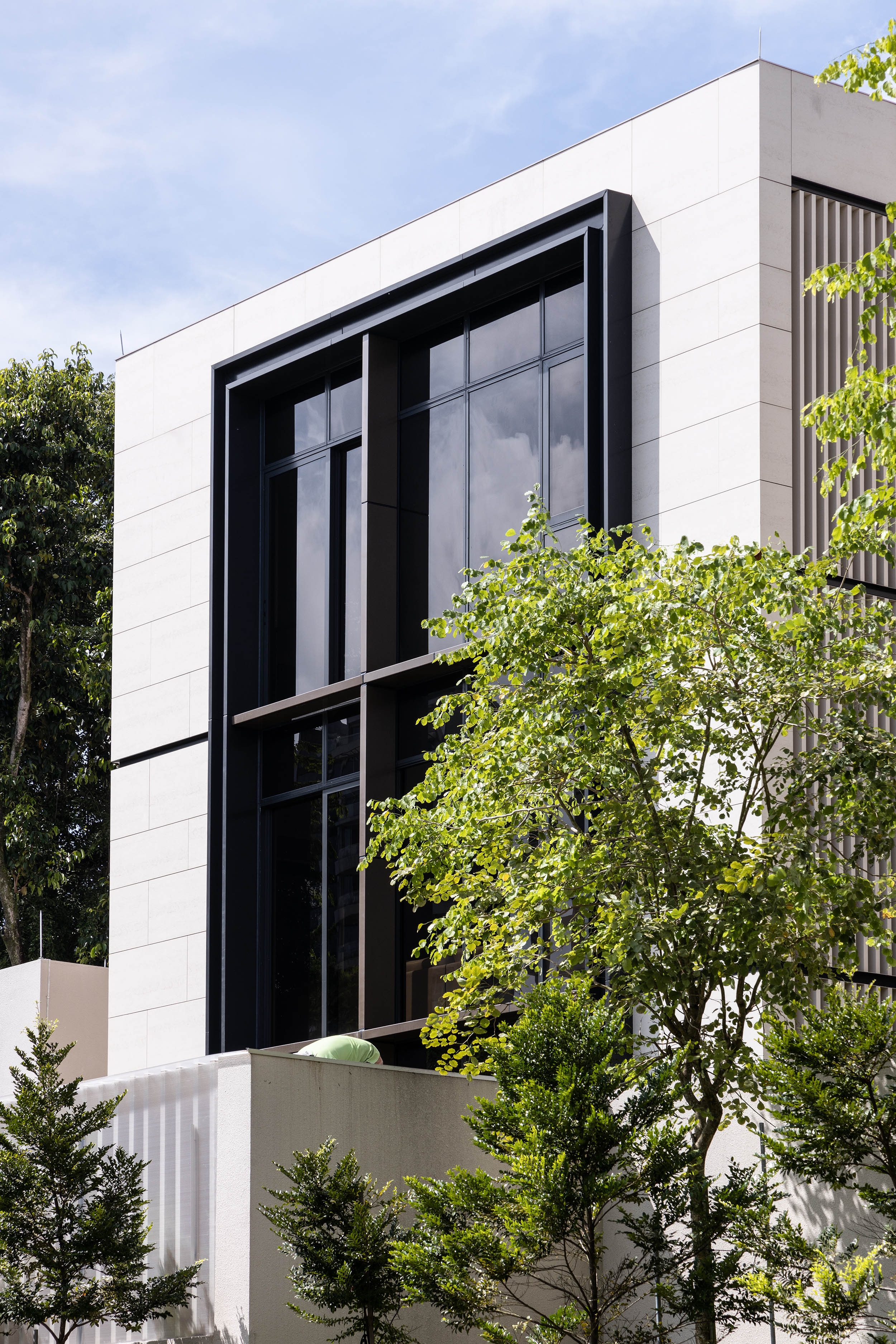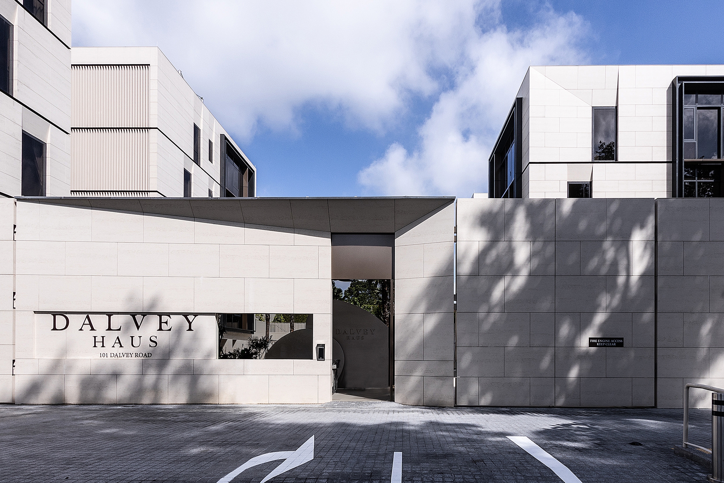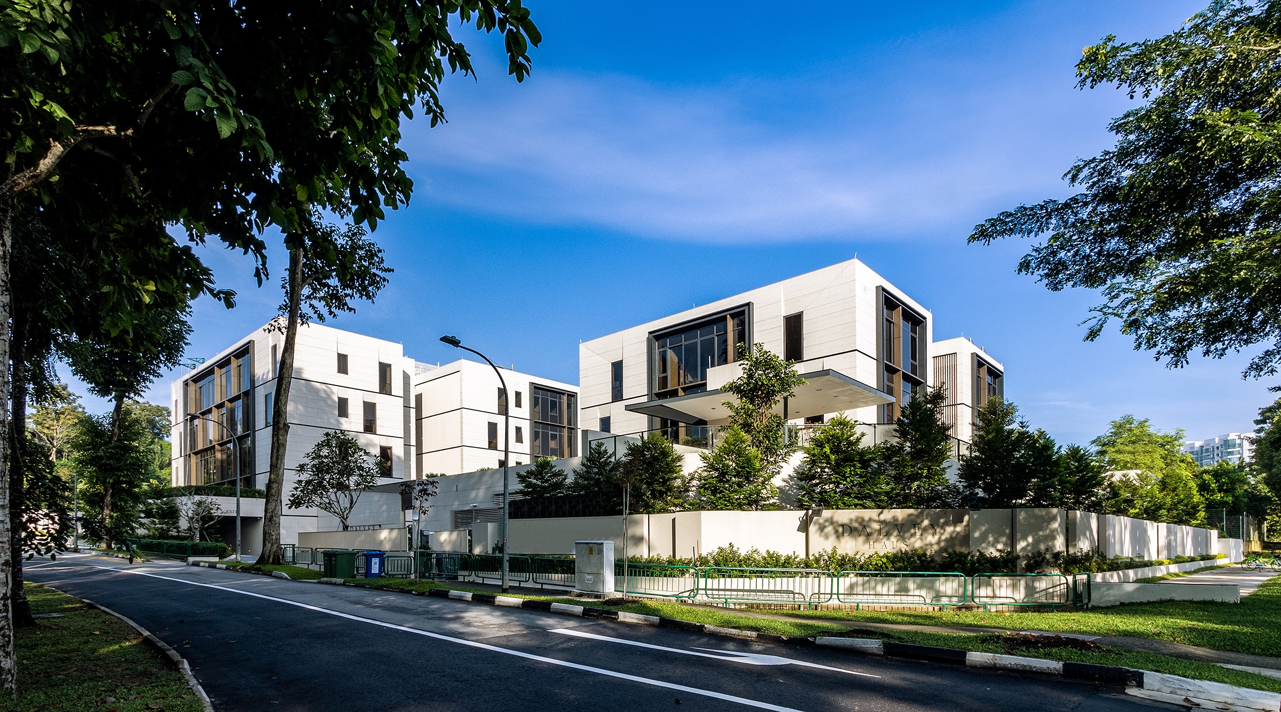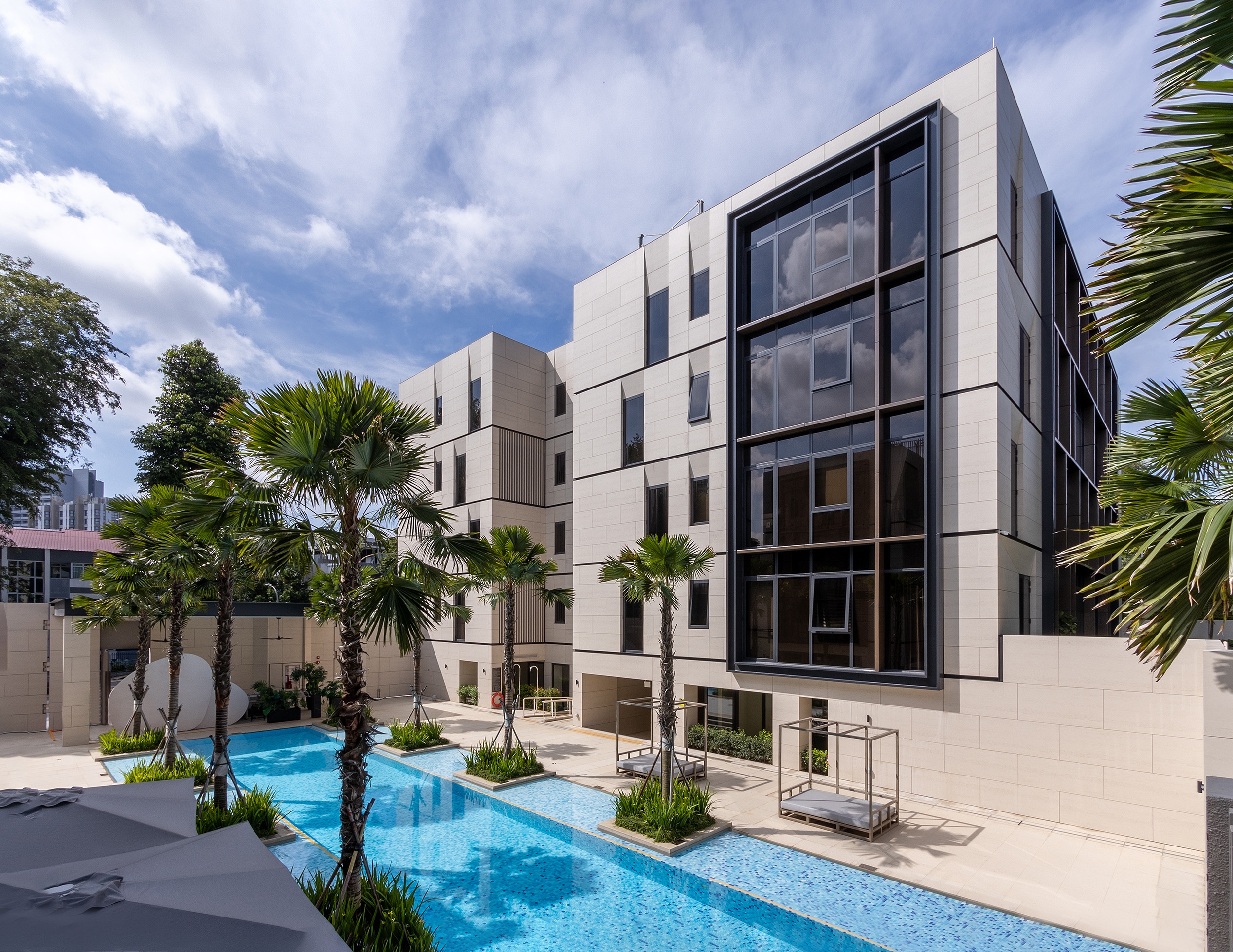 Situated in Singapore District 10's prestigious Good Class Bungalow enclave, Dalvey Haus is a freehold luxury condominium near the Tanglin-Orchard district and the UNESCO Heritage Site, the Singapore Botanic Gardens. Comprising two low-rise blocks, Dalvey Haus offers an exclusive collection of 17 units. The project’s design principles revolve around sustainability, functionality, and a seamless connection with the surrounding environment, reflecting a commitment to progressive and forward-thinking design. The clean architectural lines and the cubic structure of the residential development was juxtaposed against the foliage of the surroundings, further alluding to the concept of merging Dalvey’s dynamic richness with the lush greenery that surrounds it. The façade, finished with grounded stone has inset windows placed in strategic locations, in order to create multiple vantage points that frame the views of the surrounding environment. The pared-down look is a timeless façade that concentrates on the details and articulations, exuding tranquility and tropical lushness, where elegance pervades.