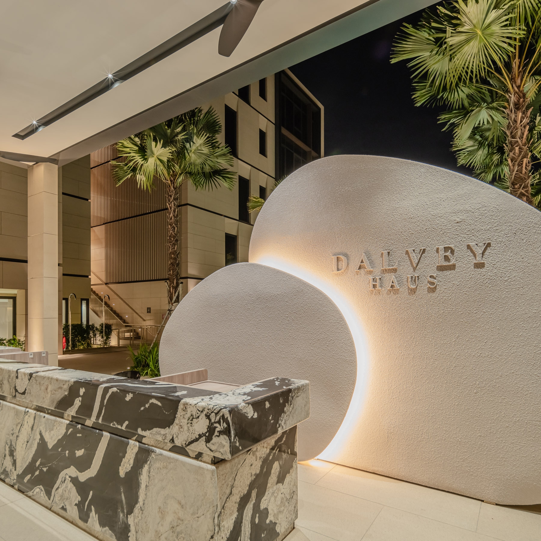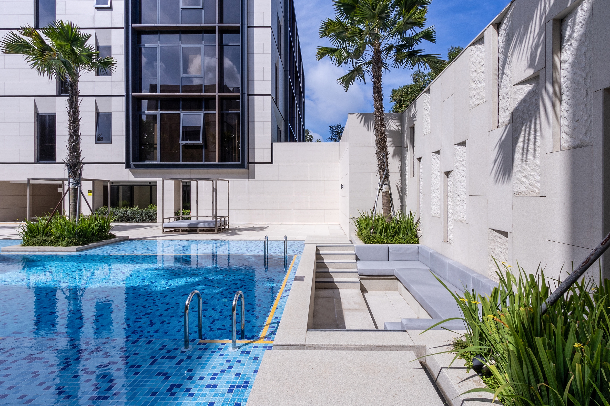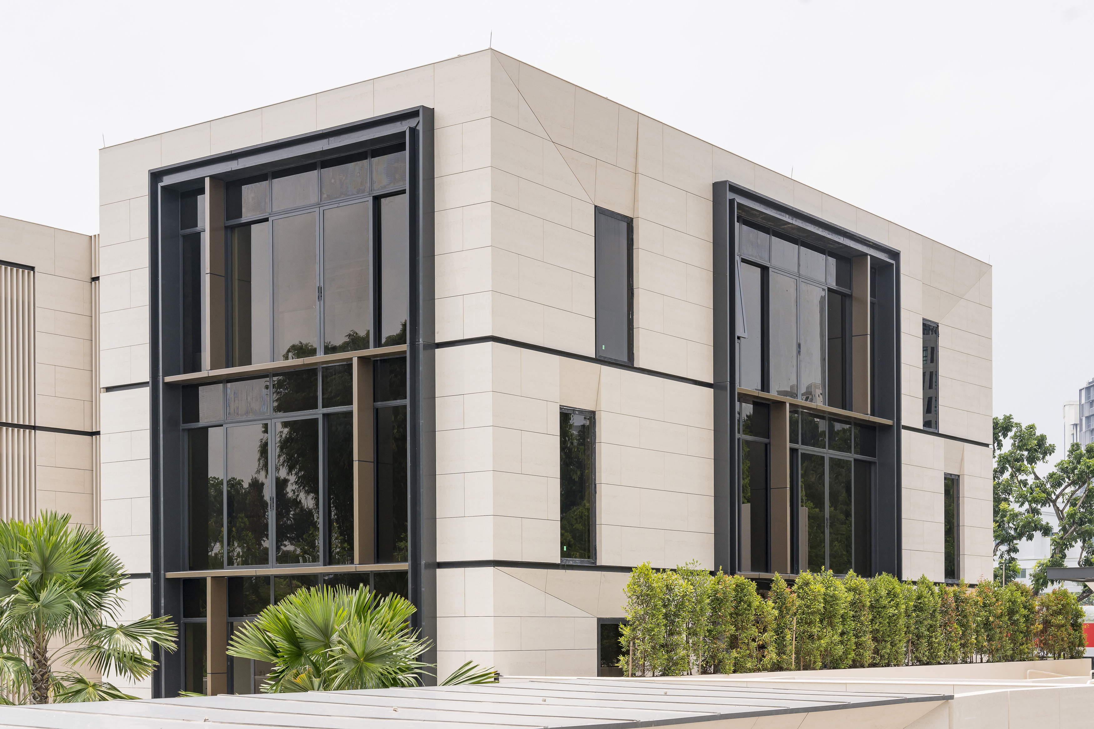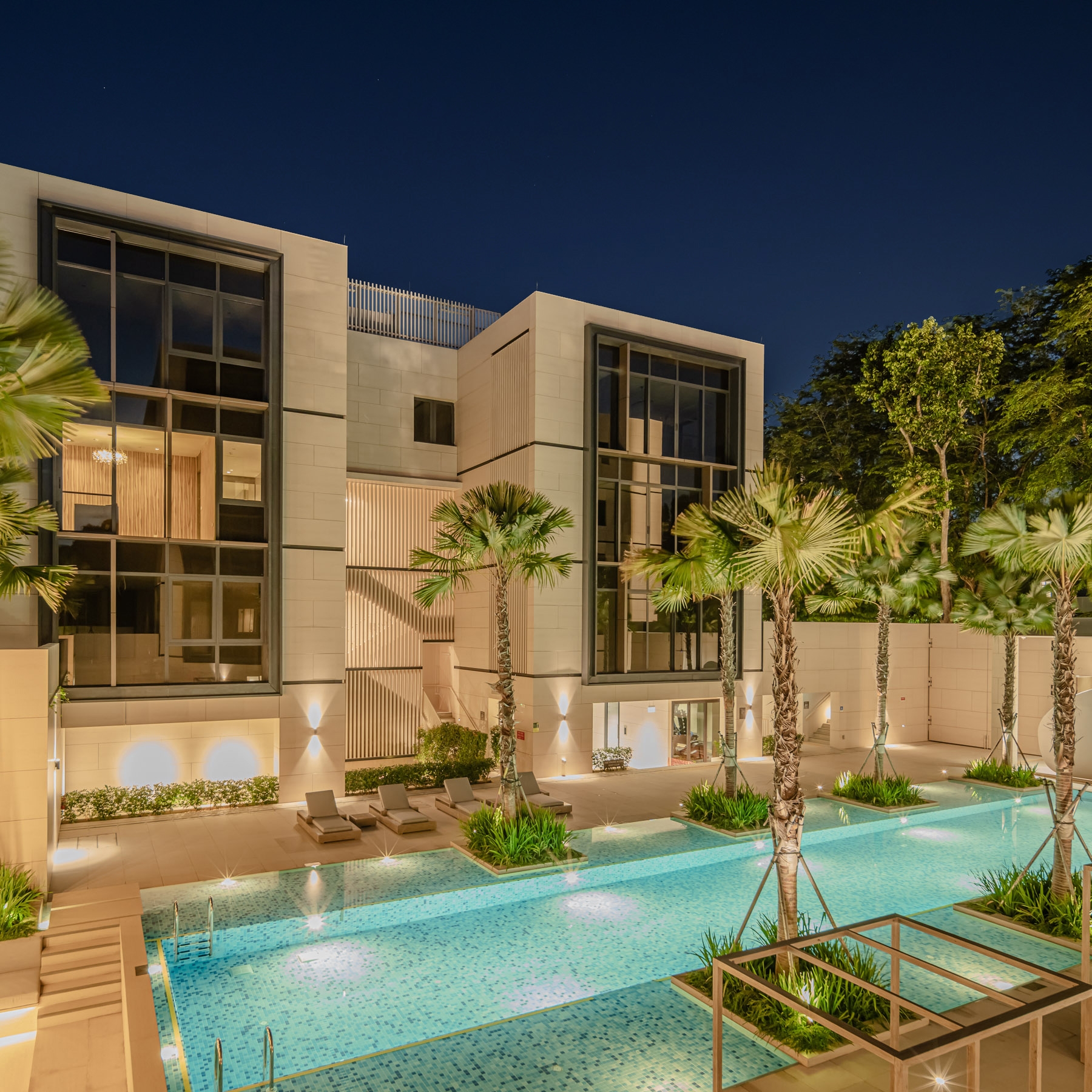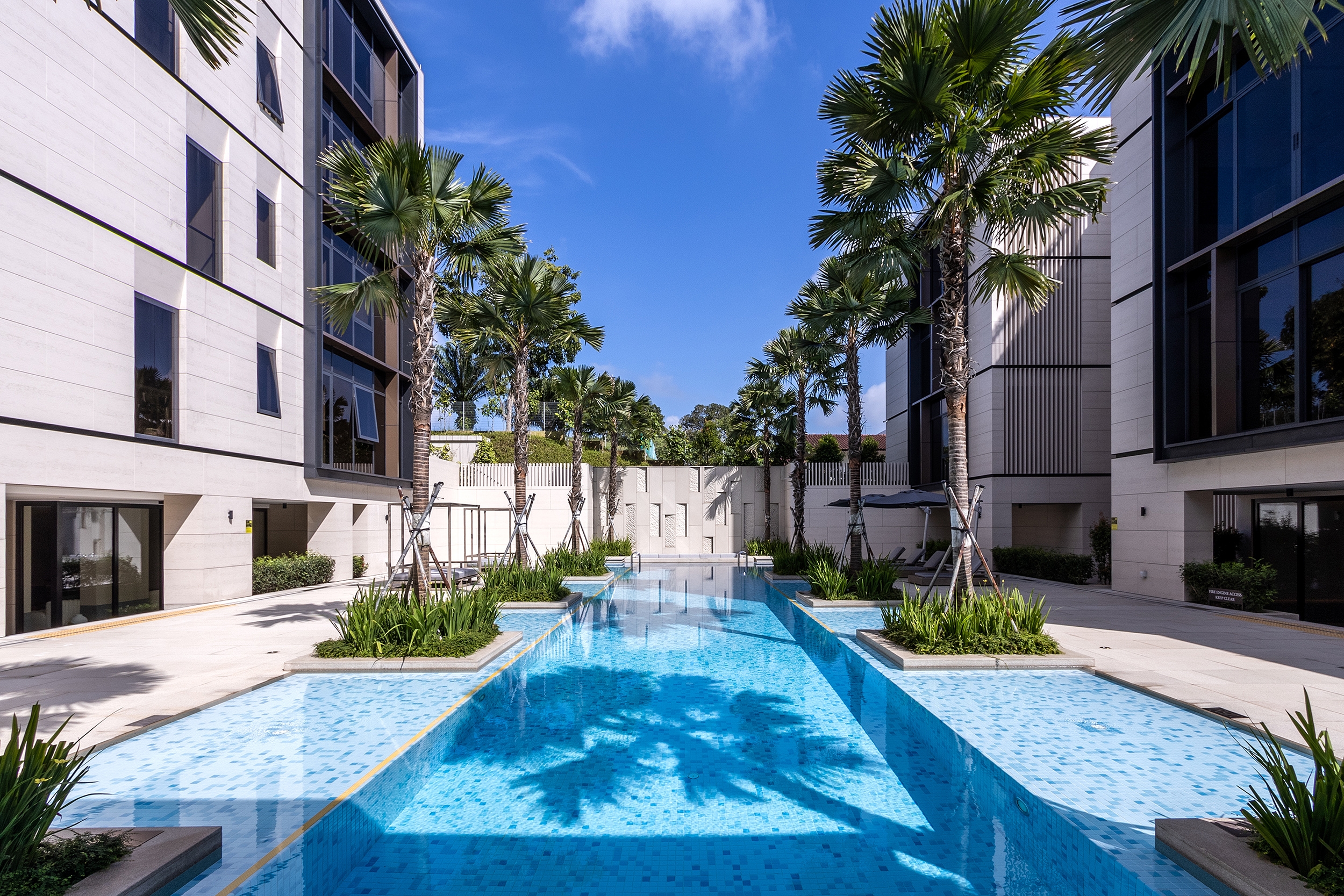 Situated in Singapore District 10's prestigious Good Class Bungalow enclave, Dalvey Haus is a freehold luxury condominium near the Tanglin-Orchard district and the UNESCO Heritage Site, the Singapore Botanic Gardens. Comprising two low-rise blocks, Dalvey Haus offers an exclusive collection of 17 units. The project’s design principles revolve around sustainability, functionality, and a seamless connection with the surrounding environment, reflecting a commitment to progressive and forward-thinking design. The clean architectural lines and the cubic structure of the residential development was juxtaposed against the foliage of the surroundings, further alluding to the concept of merging Dalvey’s dynamic richness with the lush greenery that surrounds it. The façade, finished with grounded stone has inset windows placed in strategic locations, in order to create multiple vantage points that frame the views of the surrounding environment. The pared-down look is a timeless façade that concentrates on the details and articulations, exuding tranquility and tropical lushness, where elegance pervades.