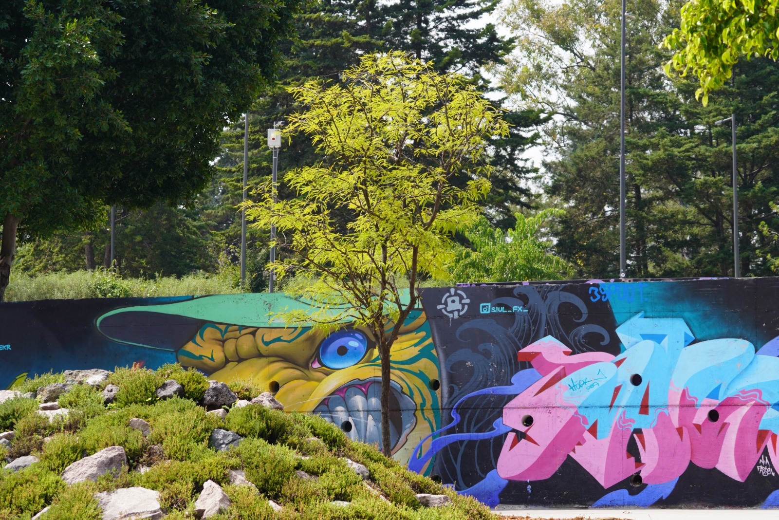 The landscape design team developed an inclusive plan to build a variety of amenities including a skate park (bowl and street plaza), footpaths, exhibition areas, a café, an open-air forum, an agora cinema, a parking area, restrooms and a great number of walls that welcome graffiti artists to create a site of artistic expression