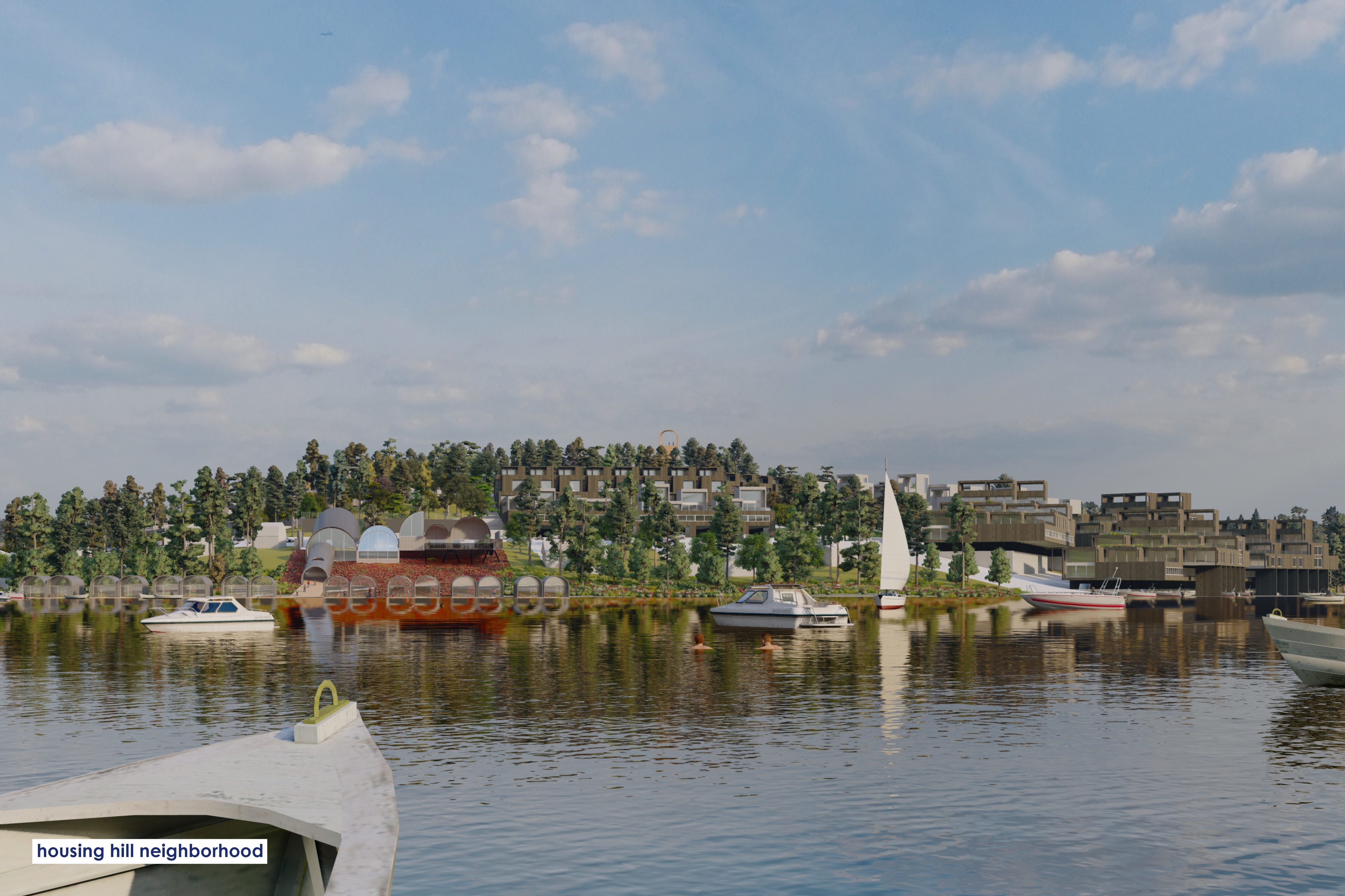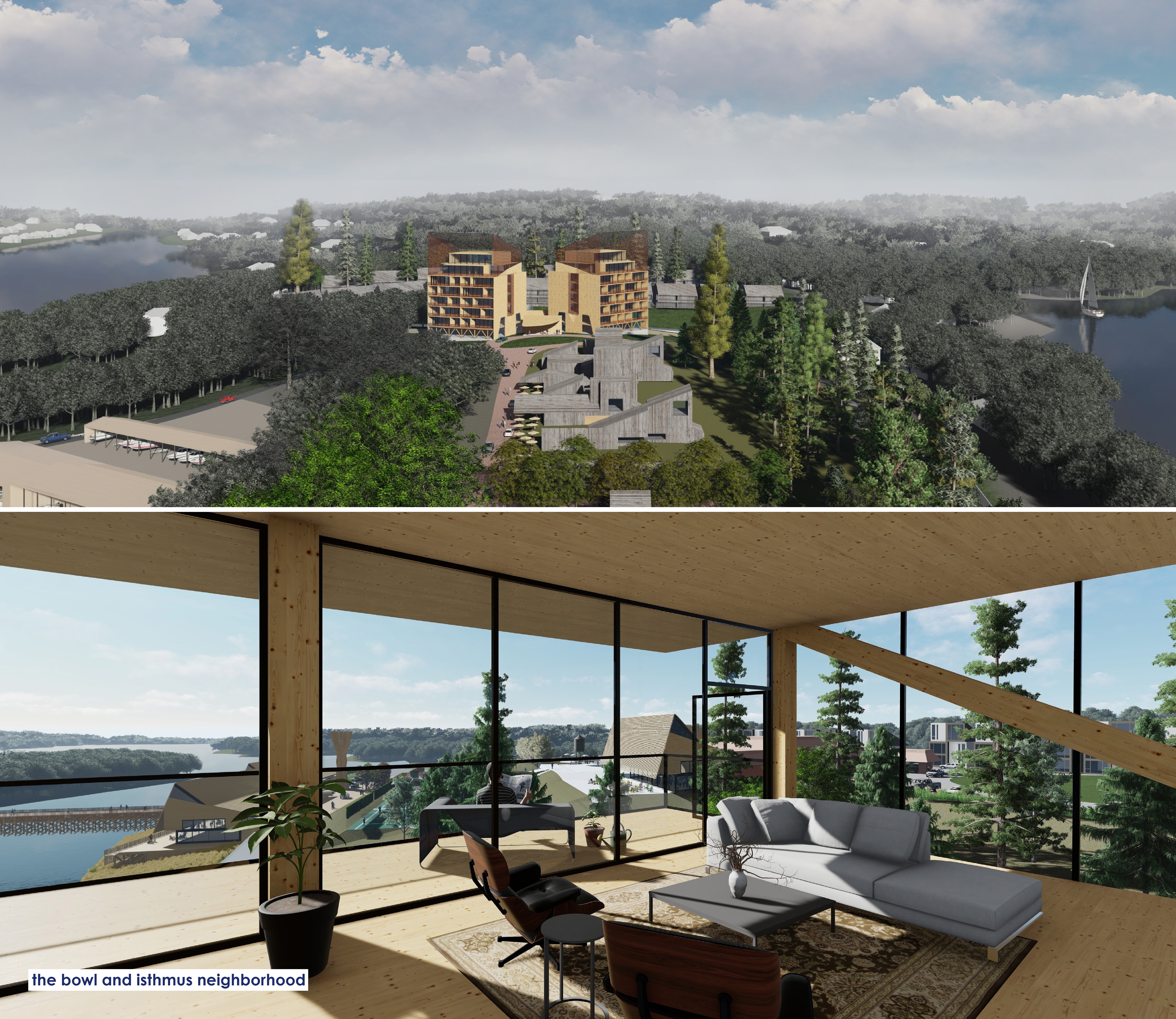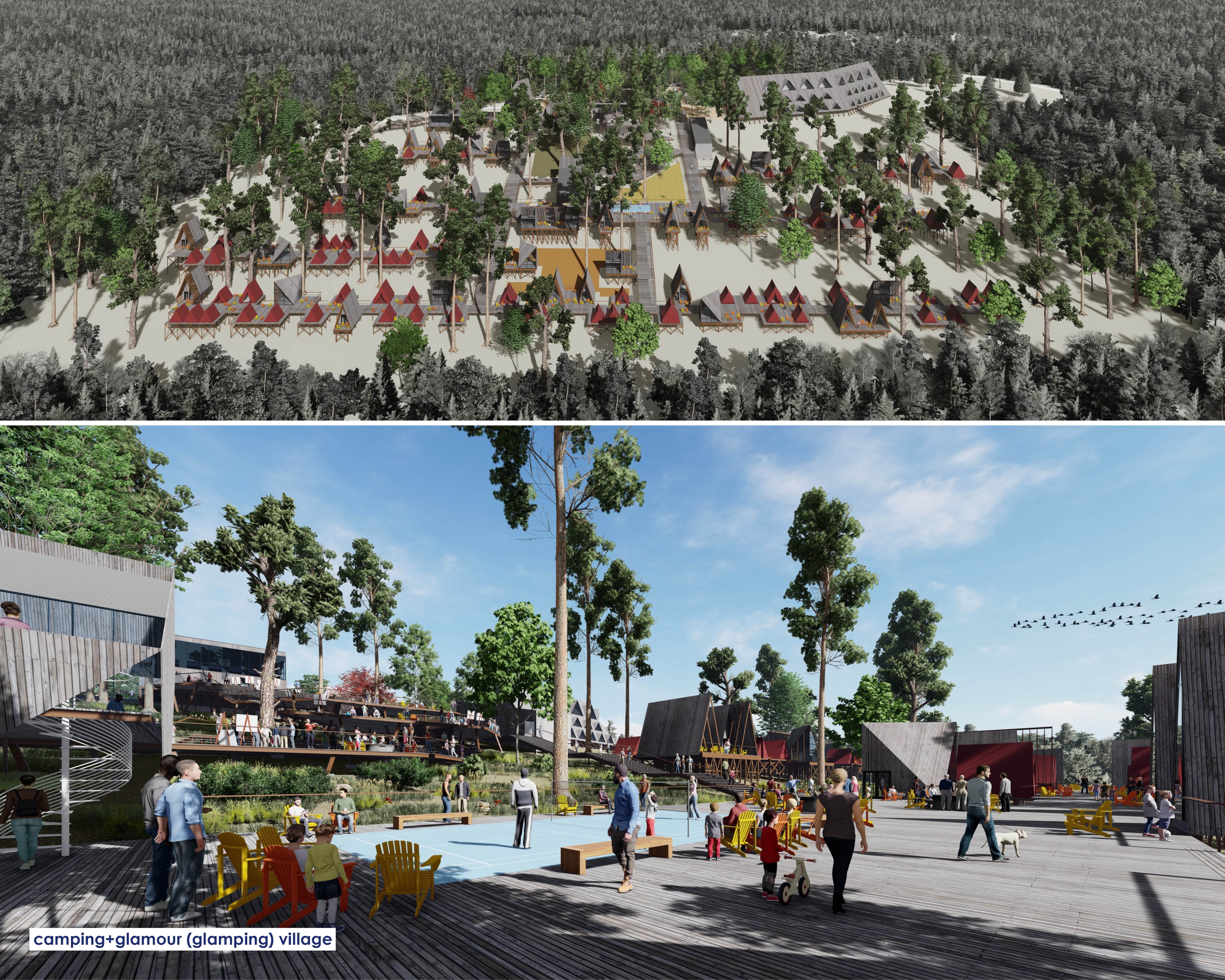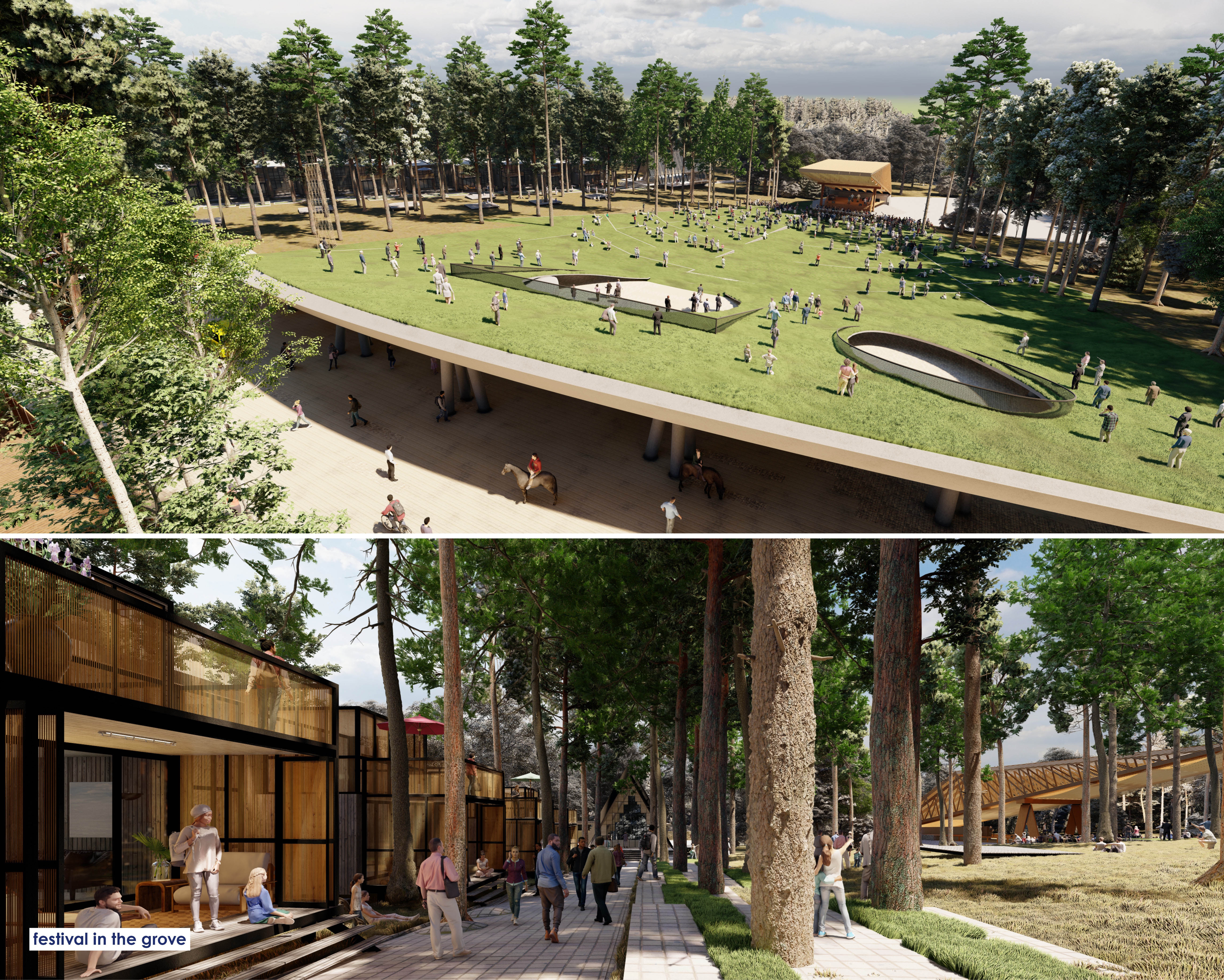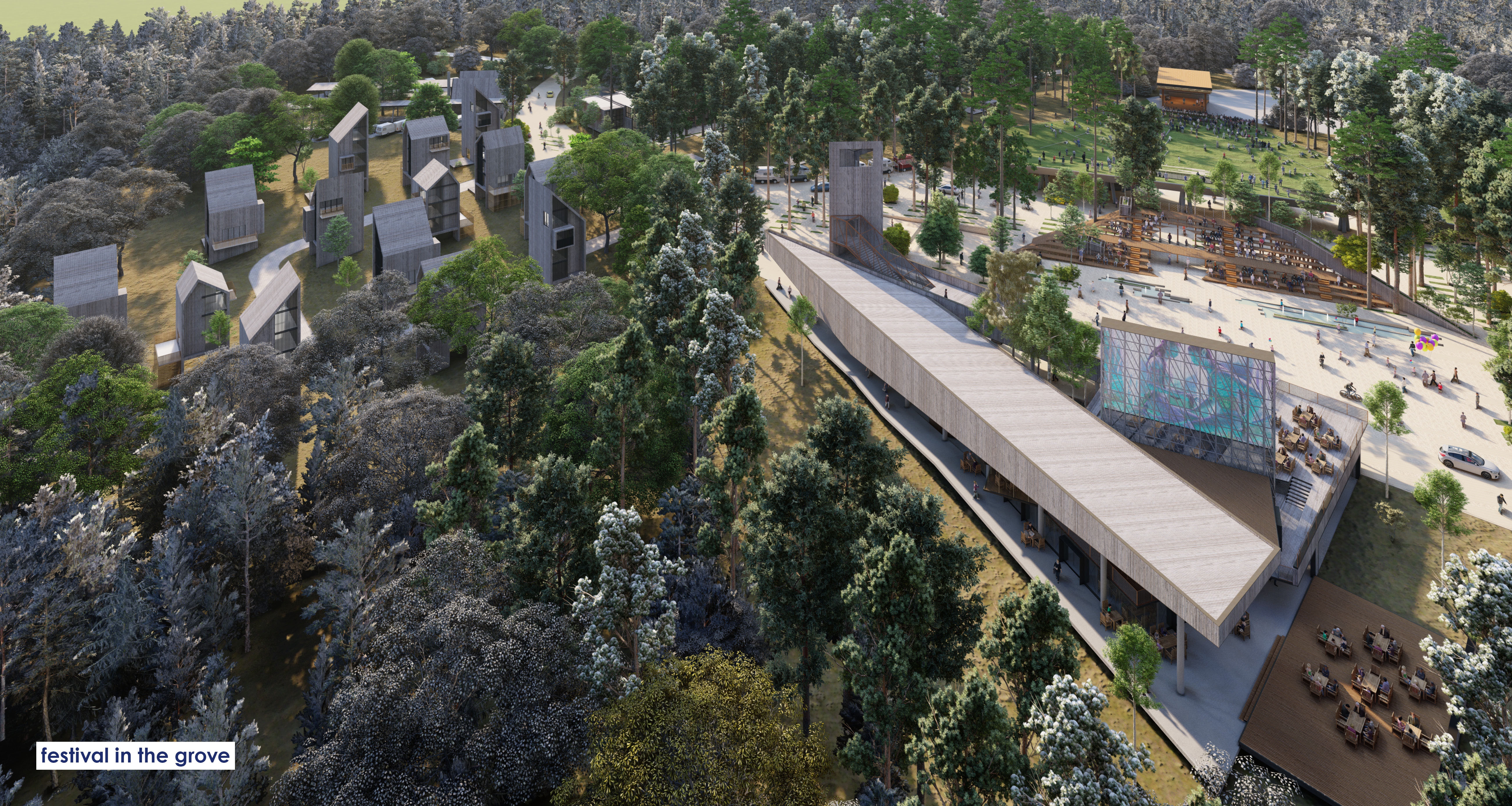 Development for the Village is reset around hospitality and living cooperatively beyond midcentury’s commitment to the nuclear family. We envision a city in the woods, inspired by a subaltern tradition of camp meetings, revival grounds, artsy resort culture, scouting camps, and countercultural theater in the Ozark Highlands—powerful but forgotten urban forms that civilized the Ozarks. These communal forms share a common orientation toward hospitality: moving one beyond the self and the sovereign toward being a guest as the ultimate form of citizenship. Hospitality amplifies unfulfilled potential in the Village’s residential environment.