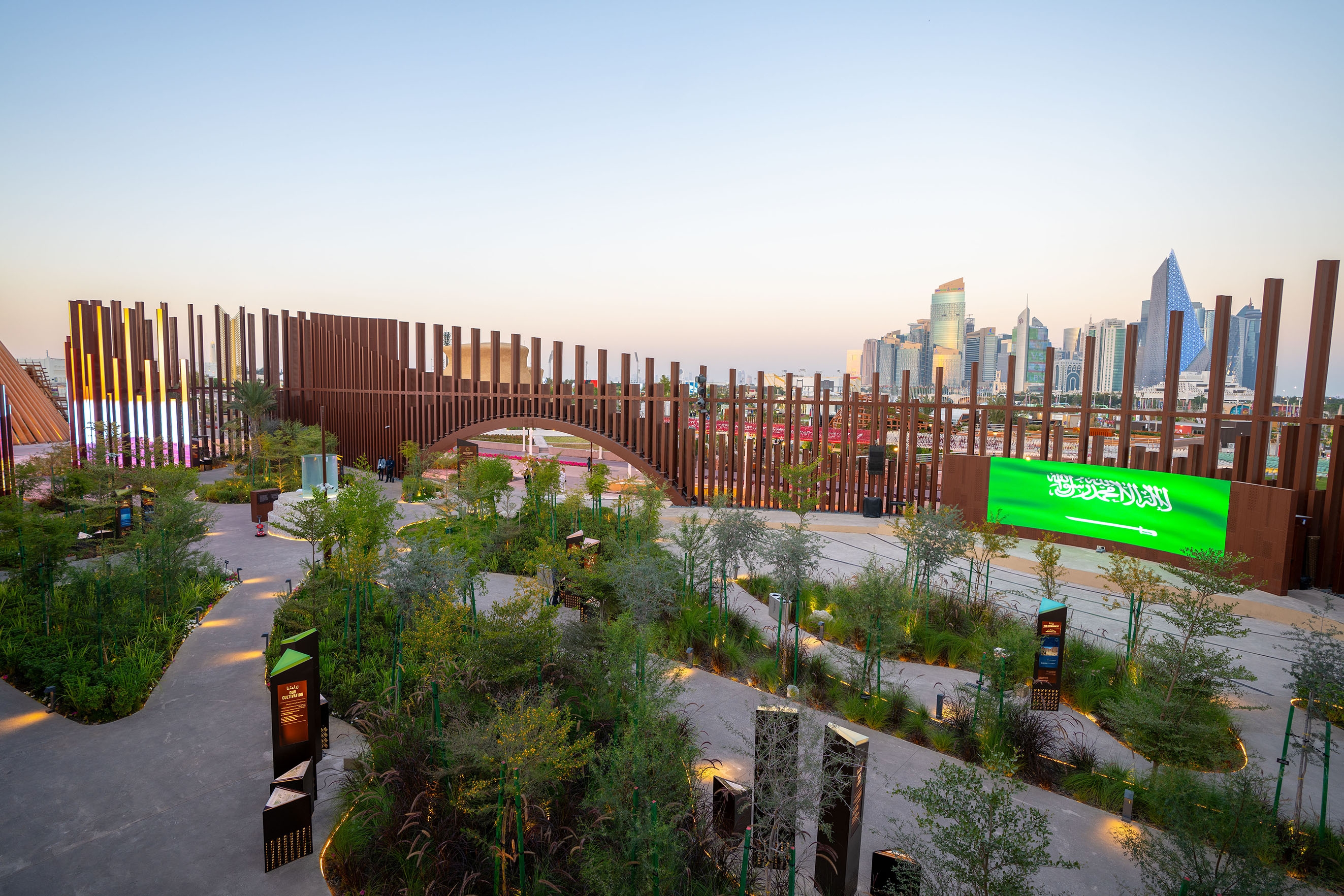 Our innovative design for the KSA Pavilion articulates KSA’s Tuwaiq mountain into the architectural frame of the pavilion, inside which is a lush garden representing a greener future. Sustainability is more than a central focus in our storytelling, but a goal pursued throughout production; the frame is a fully re-usable LED media façade, and the pavilion’s main material is raw steel, which will be repurposed.