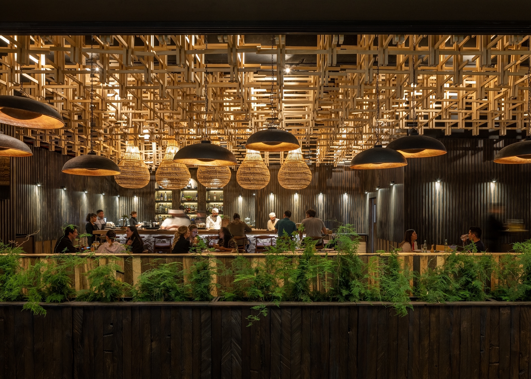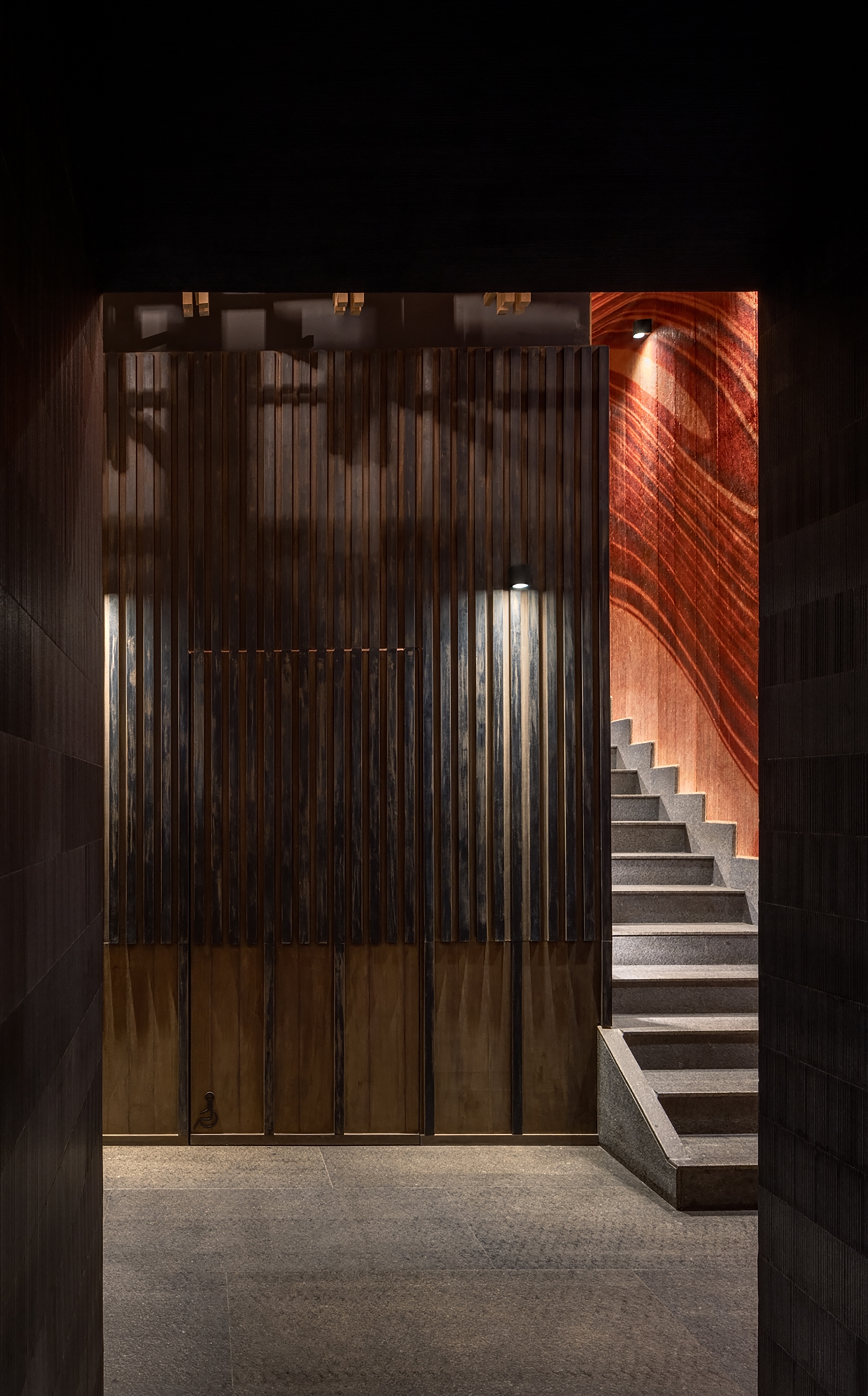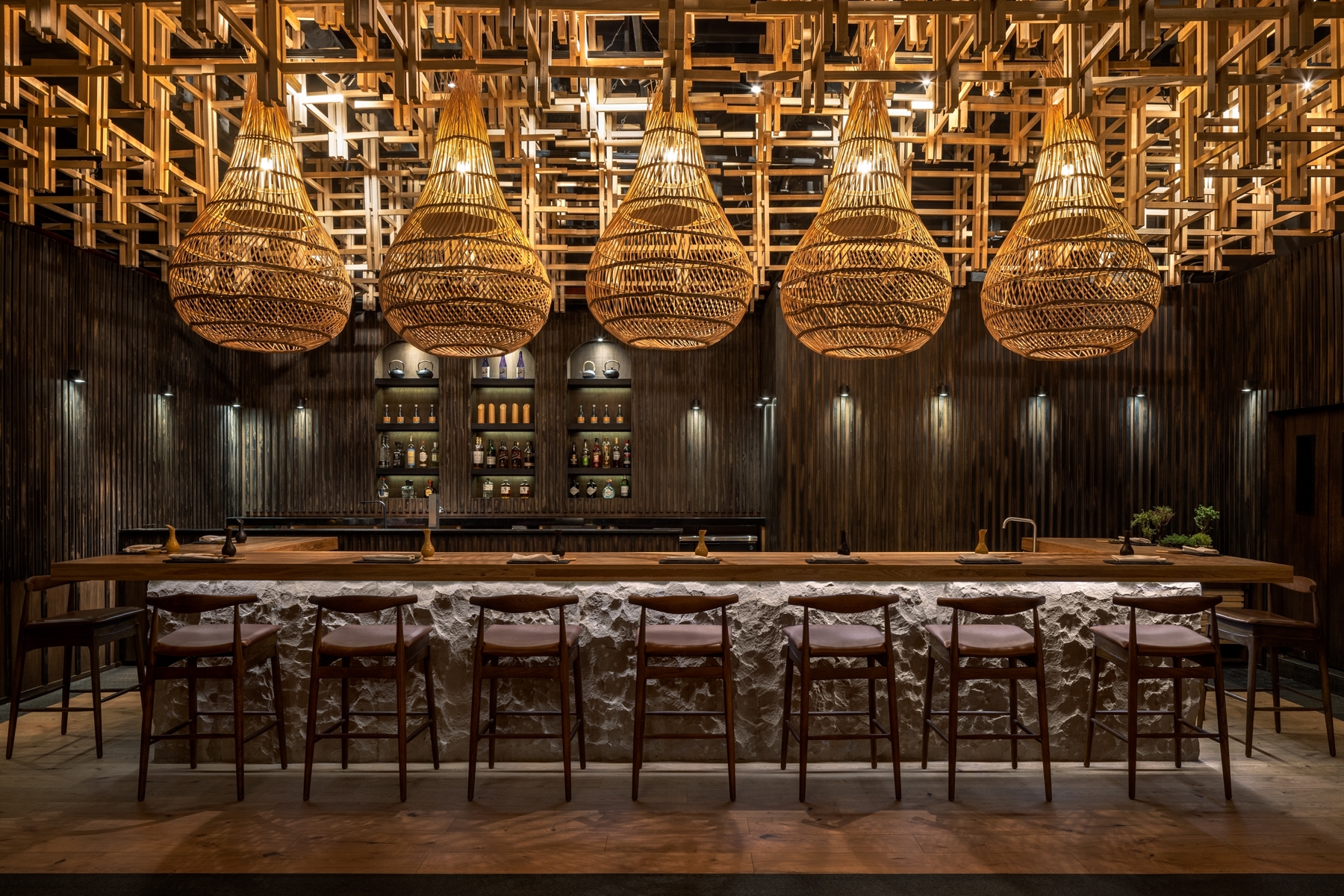 This condition leaves the greatest depth of the space in the farthest part of the premises. This is why the access is located next to the other restaurants and through a compressed space that reminds us of the narrow accesses of the traditional buildings in the center of Kyoto, you enter to discover.