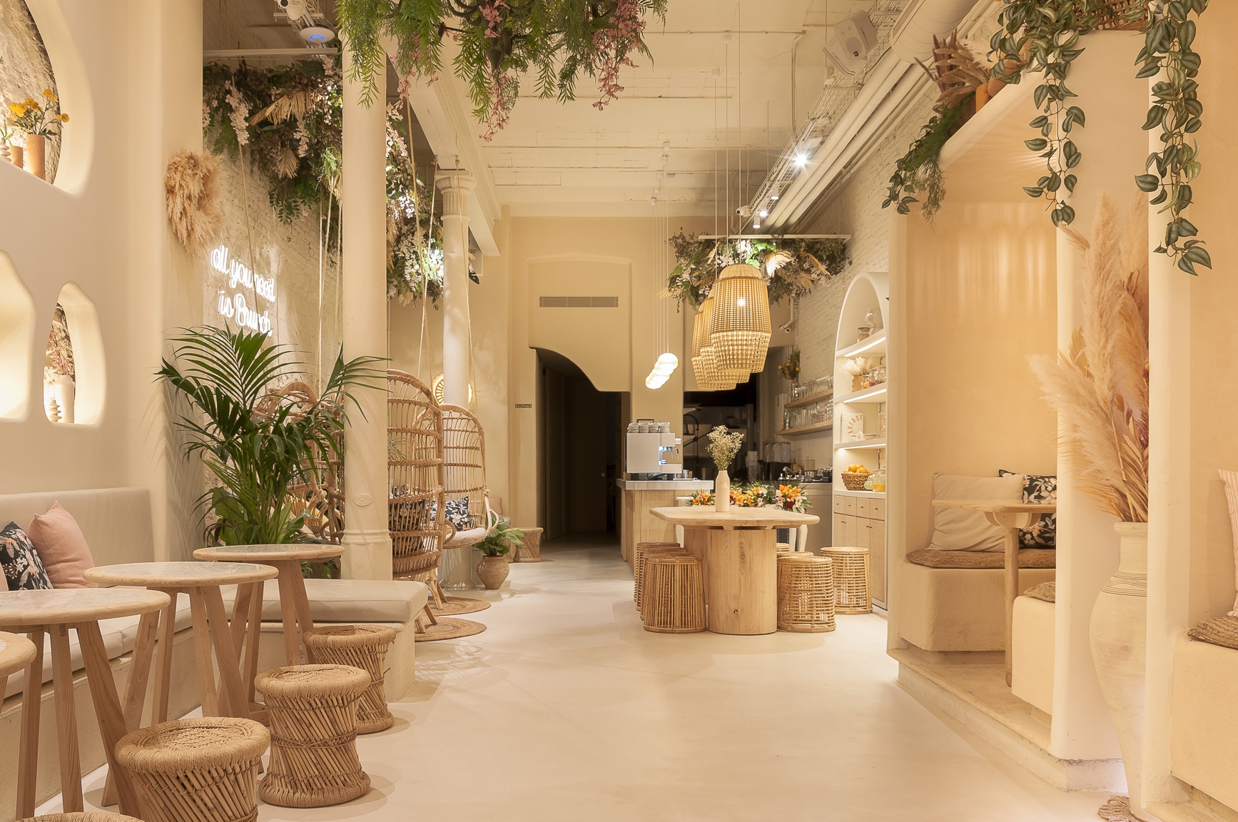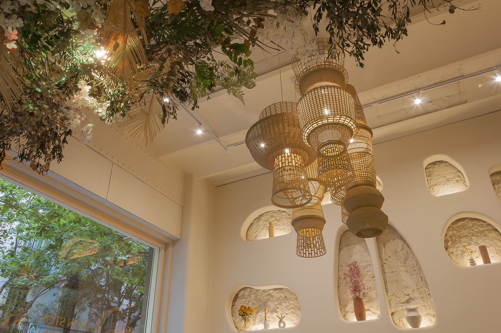 The challenges of the project included creating a space where one can experience tranquility in the heart of the city, a place to relax, eat healthily, and be in a natural environment. To achieve this, all the furniture was crafted from natural wood, rattan or textile lamps, natural fabrics such as cotton, raffia, and jute, natural and preserved plants, ceramic-fired vases, tables and counters made from natural stone, marble, granite, and terrazzo, and the walls were treated and painted with organic lime.