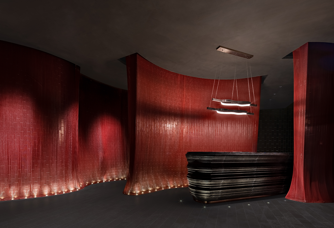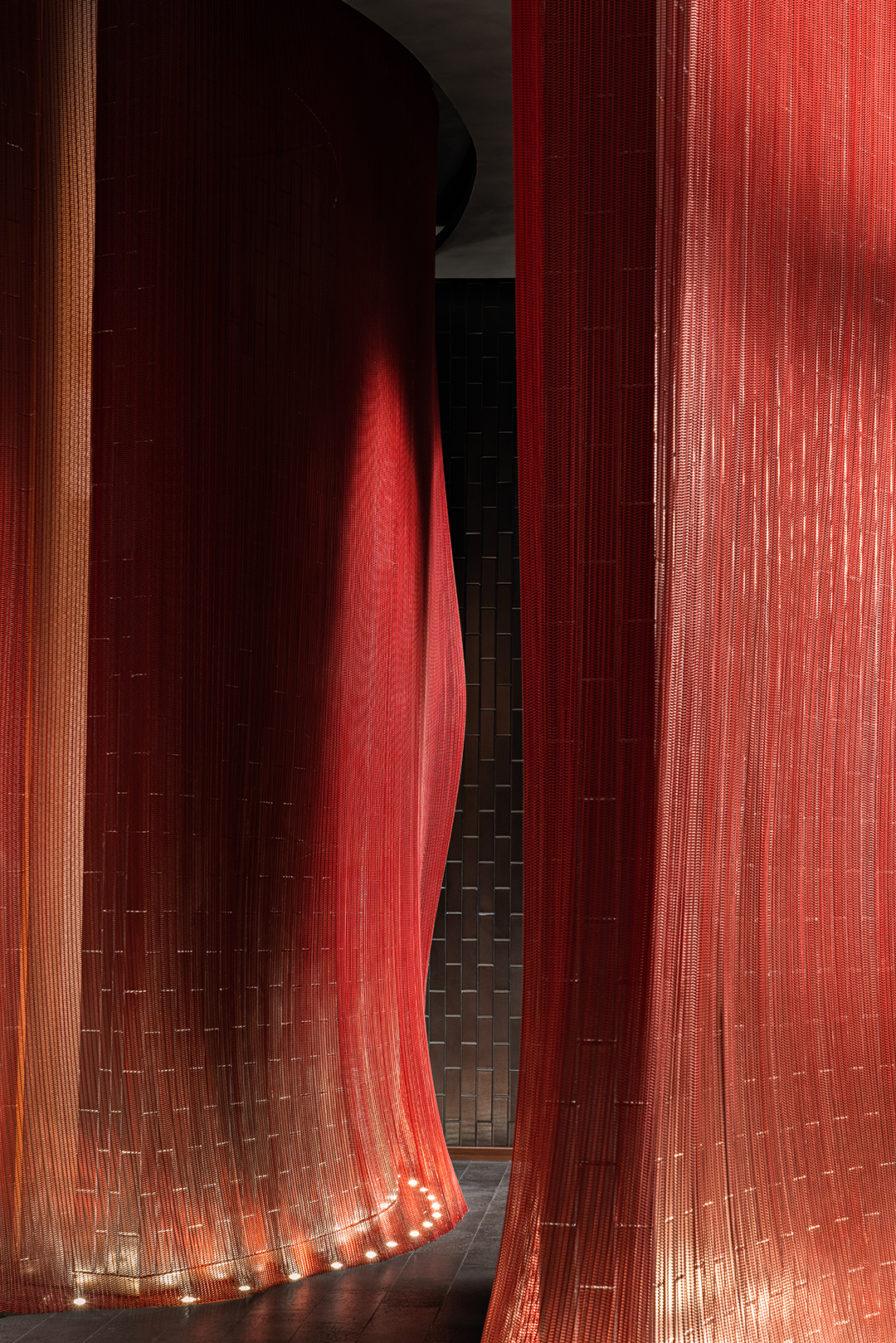 With a striking matrix of sequences and hierarchical shapes formed by geometric proportions. The interior of the wall is manually constructed with bricks made of stainless steel, which is inspired by the red brick element commonly employed in ancient Chinese architecture. In conjunction with the red metal mesh, the wall is lightly wrapped with an innovative material and technique to accomplish a collision and fusion between the old and the new.