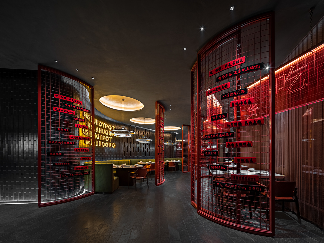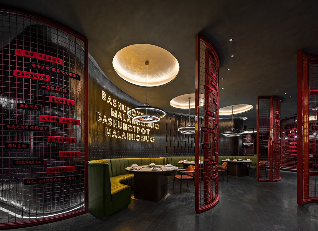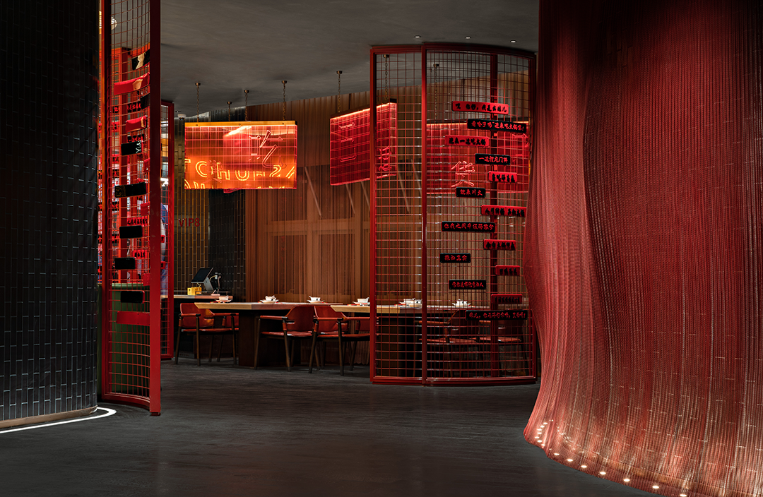 For the sake of accentuating the brand theme and interestingness of the space, the design has chosen to introduce a distinctive mahjong element installation on the entrance side based on a large-scale dark stainless steel brick wall, which elaborates and exhibits the traditional activity of playing mahjong, an indispensable part of the life of Sichuan people in a modern and trendy manner. This mahjong art wall with custom-made red shaped lines of original furniture regularly draws people to stop and admire, and take photos for memory.