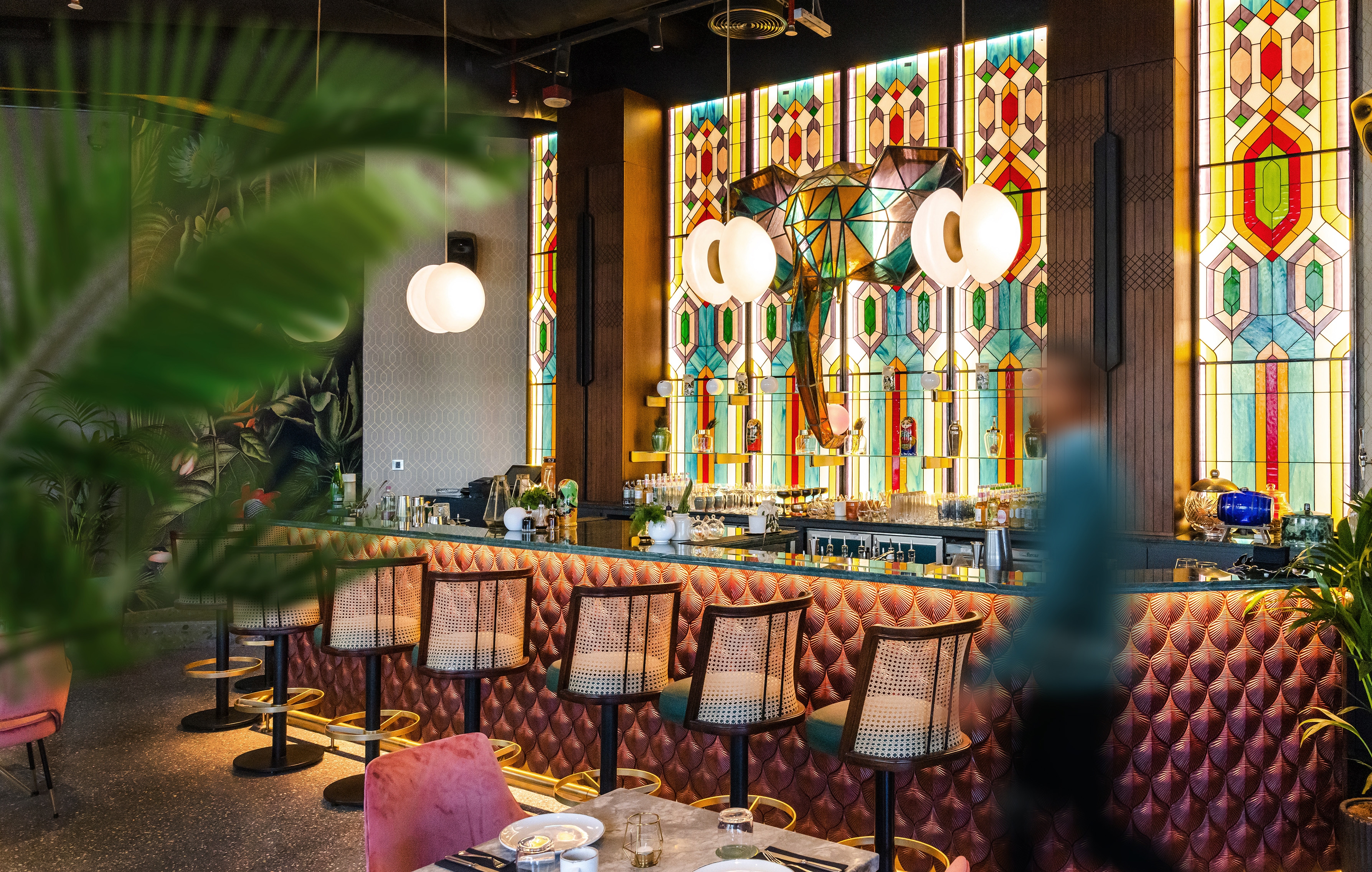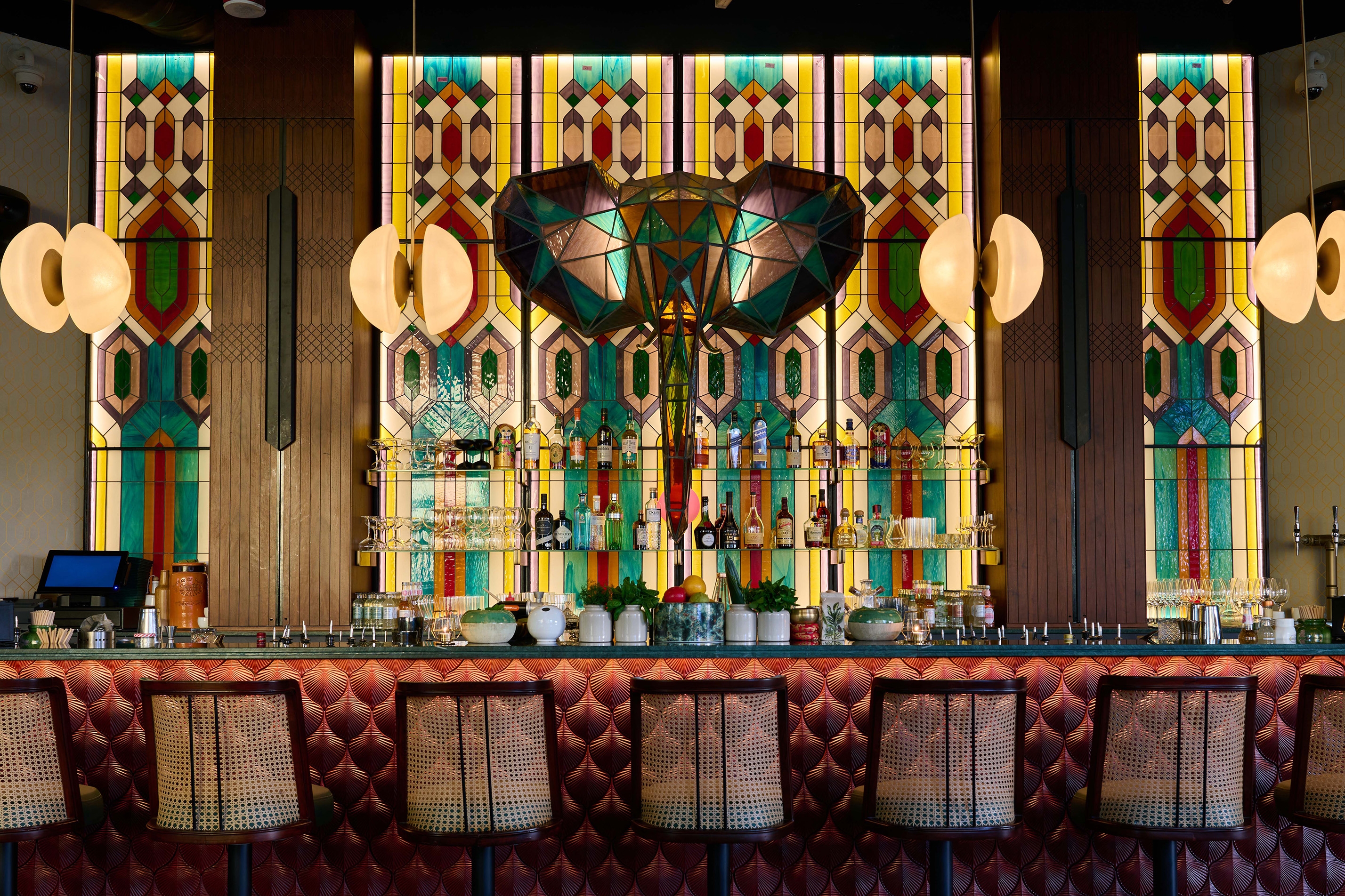 The repurposed gin screen, for eg, becomes a portal to the bar with the now-familiar stained-glass elephant. Handcrafted in stained glass, green quartzite, and wood, it sets the precedent for the rest of the space, with exaggerated spinoffs of flora and fauna in different mediums.