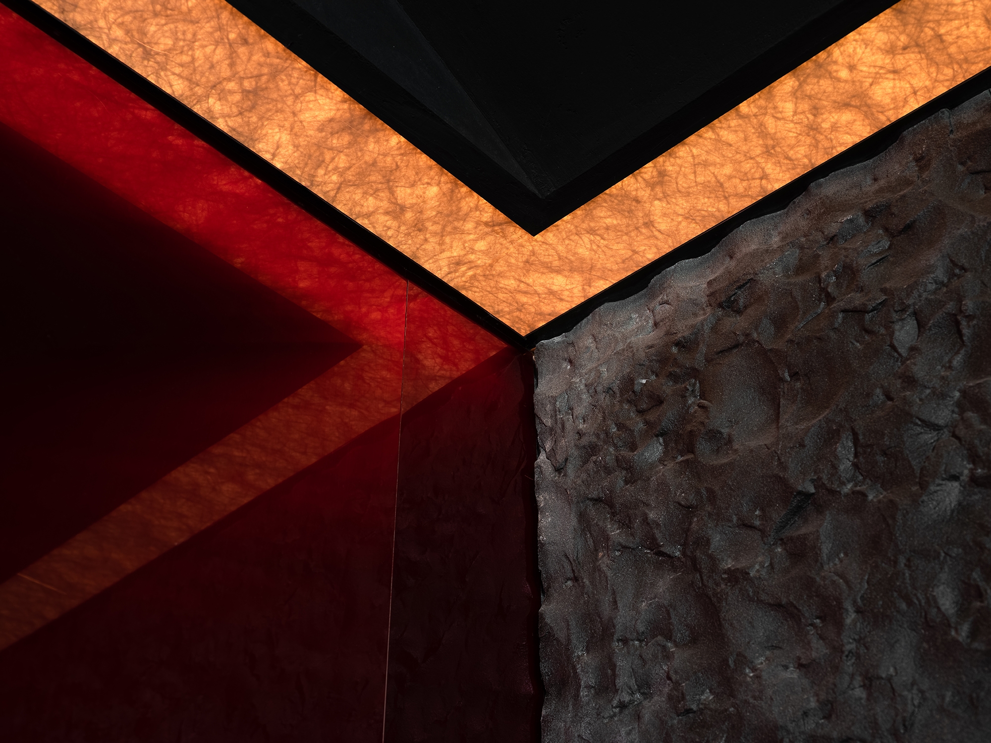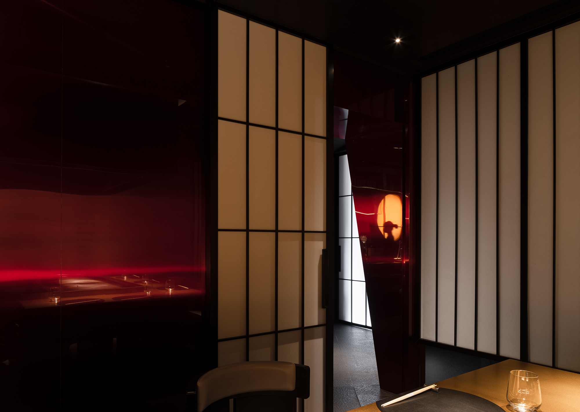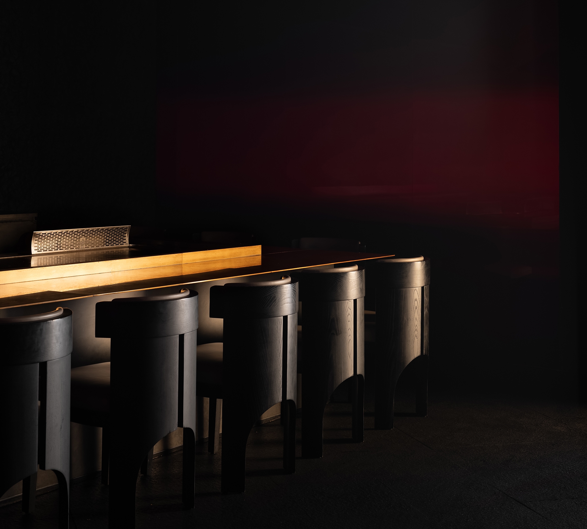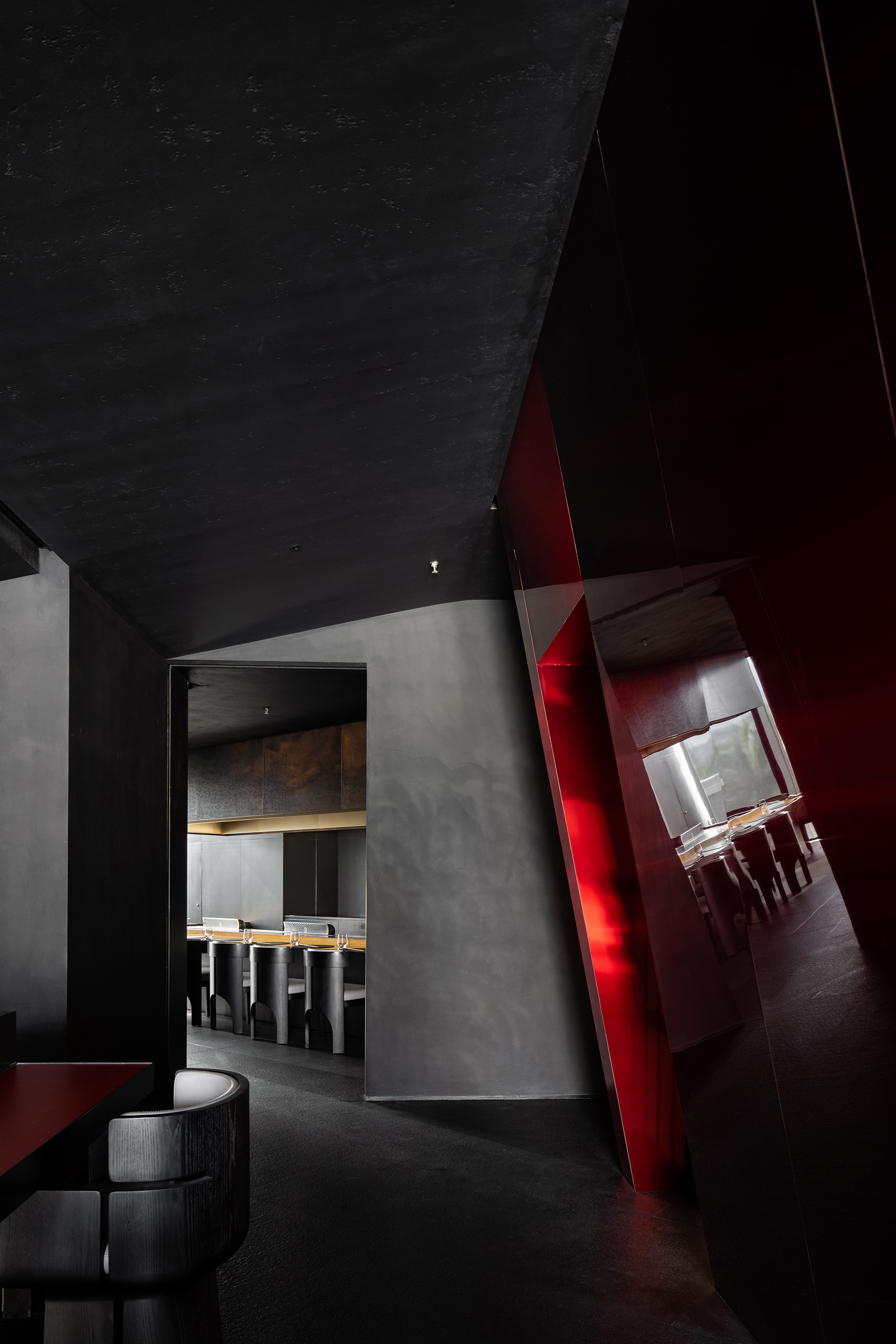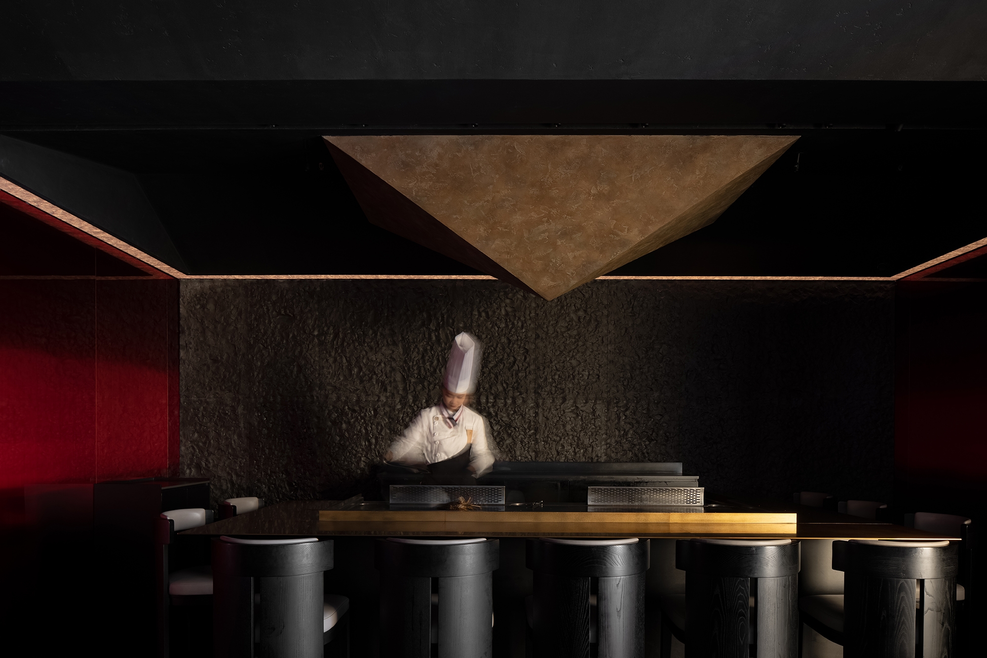 The open hall features a unique layout of the dining area, creating an atmosphere with a sense of distance formed by social emotions. The circulation design lays out the physical form for segmented social places, while the elegant, mixed, and blurred lighting effect creates a luxury brand image. The Omakase operational counter, located in the center of the black and red space, serves as the first functional visual focus and provides auxiliary functions for all seating areas. Its location closest to each dining area maximizes its functions and emphasizes an open spatial mood in the mysterious field.
