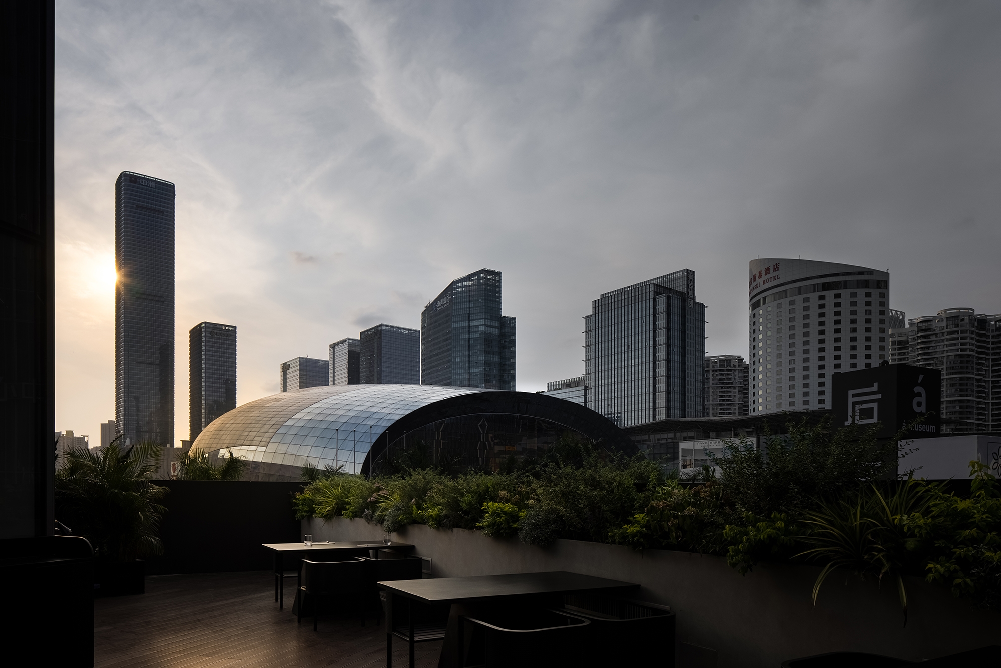 The space exudes an air of luxury and comfort because of the collision between the stone-texture paint wall and etched metal. The soft lighting further enhances the ambiance, creating a sense of weight in the area. The floor-to-ceiling glass makes the scene and field superpose, and the inversion of a heavy volume results in a dramatic yet balanced feeling.