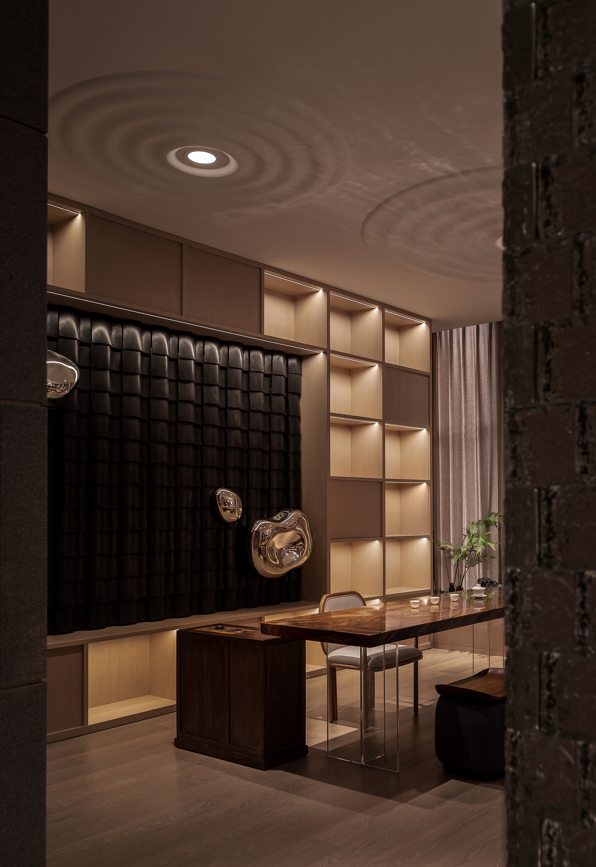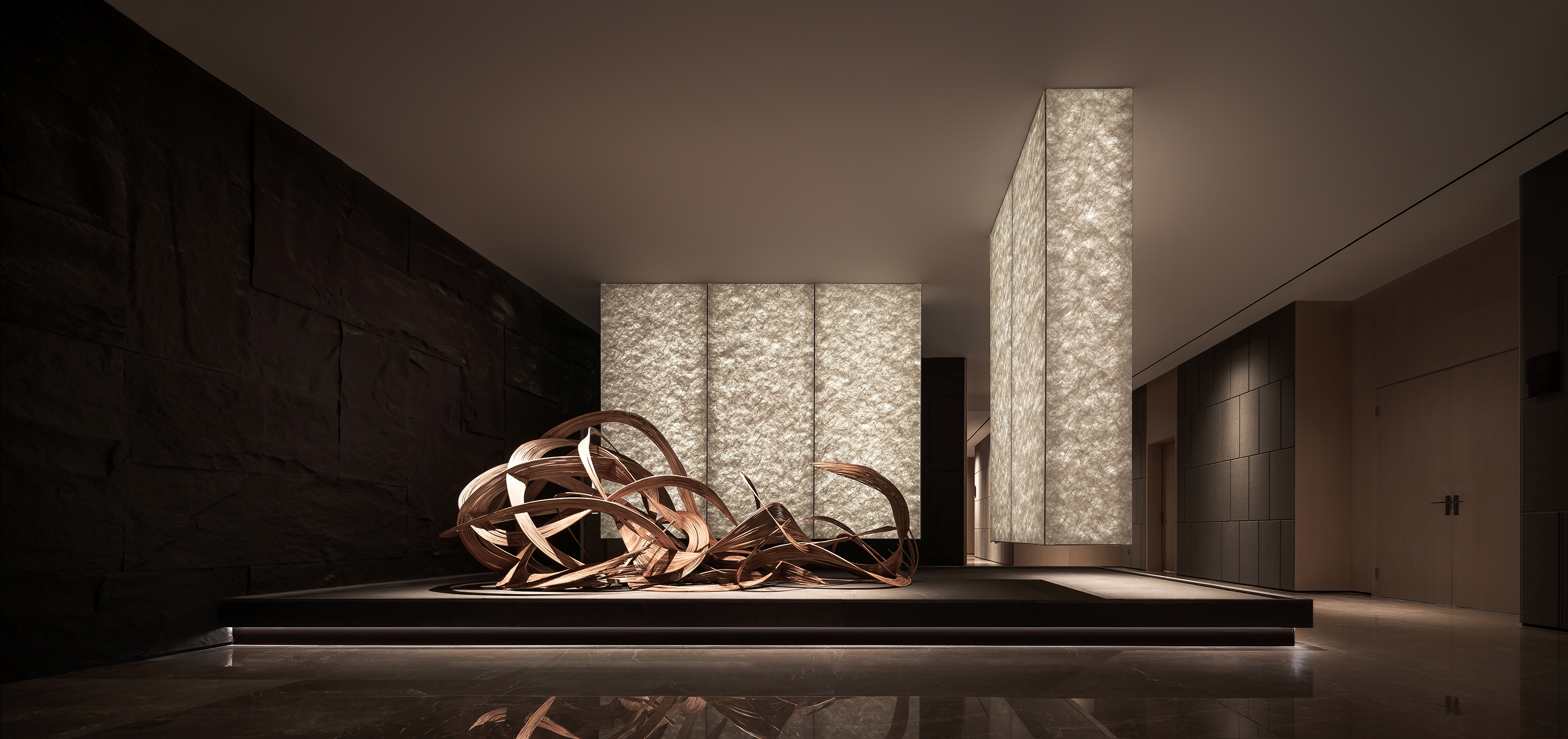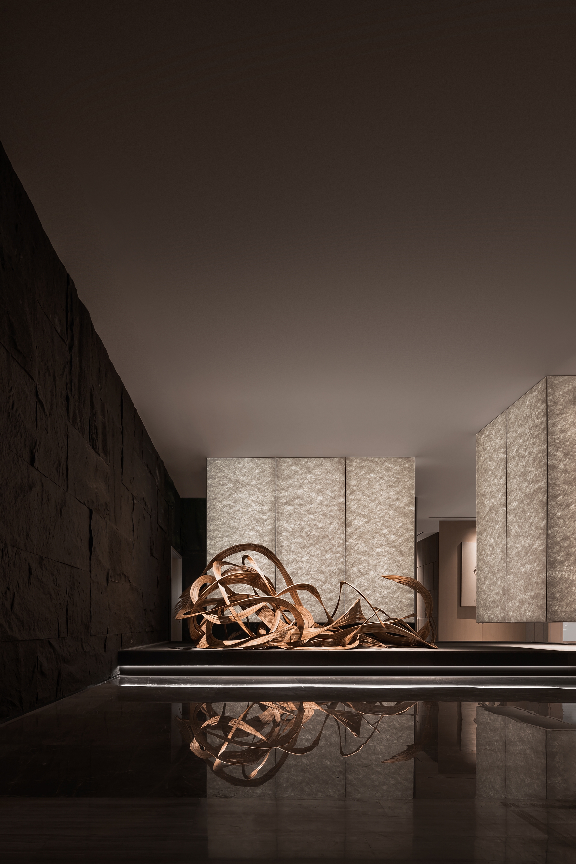 In the hall, the artistic landscape installation stands majestically, with interlaced textures on both sides of the partition facades, imbuing it with infinite imagination and humanistic spirit. The interwoven lines in the middle of the installation are like the raging waves, blending with the reflection of mirror brick and stone into a vast expanse of waves, thus fully interpreting the fighting spirit of Taizhou people who are tough to make a living in the stormy waves.