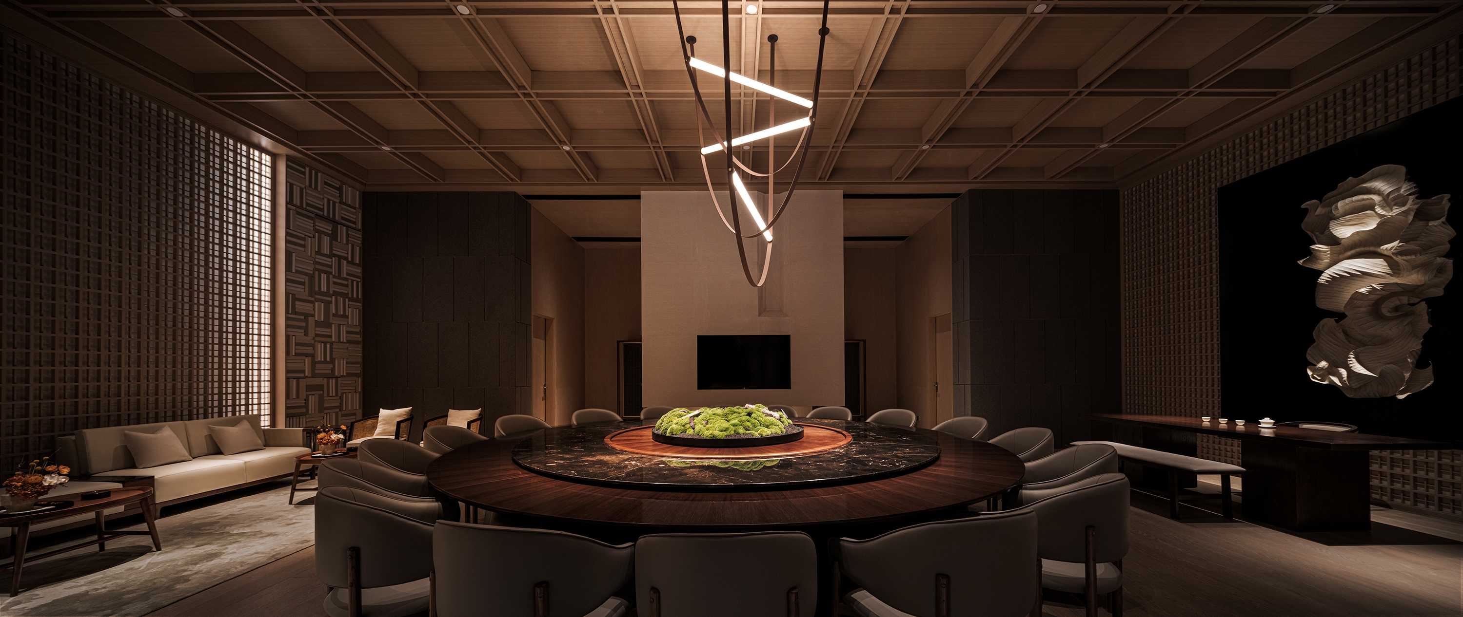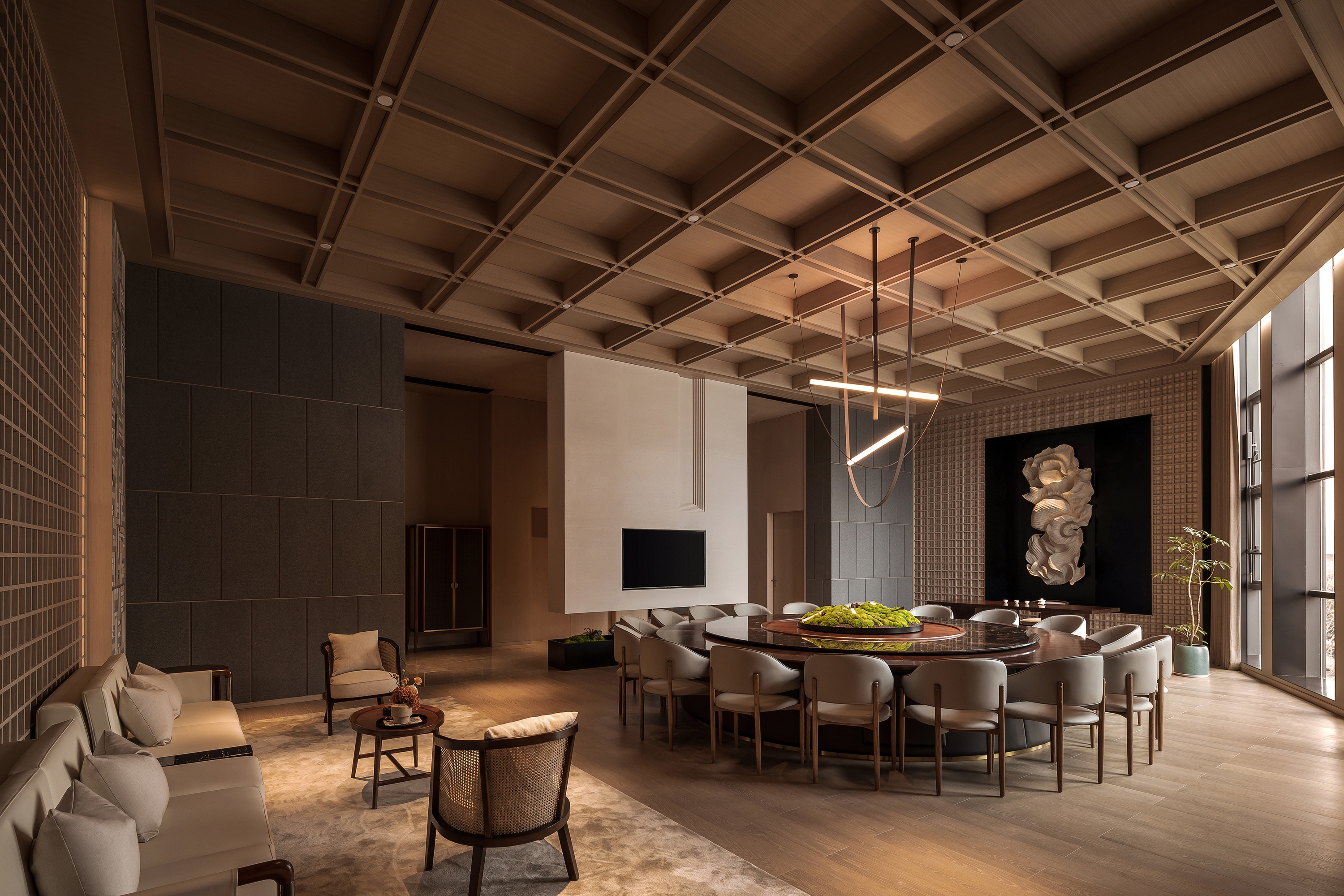 Taizhou has picturesque and rugged mountains with unique scenery. In the space design with the theme of "mountain", the private room is specially customized with cloud and store engraving; the clever combination of heavy rocks and the clouds with deeply attached gestures reflects the openness and shock of the splendid residence of Taizhou.