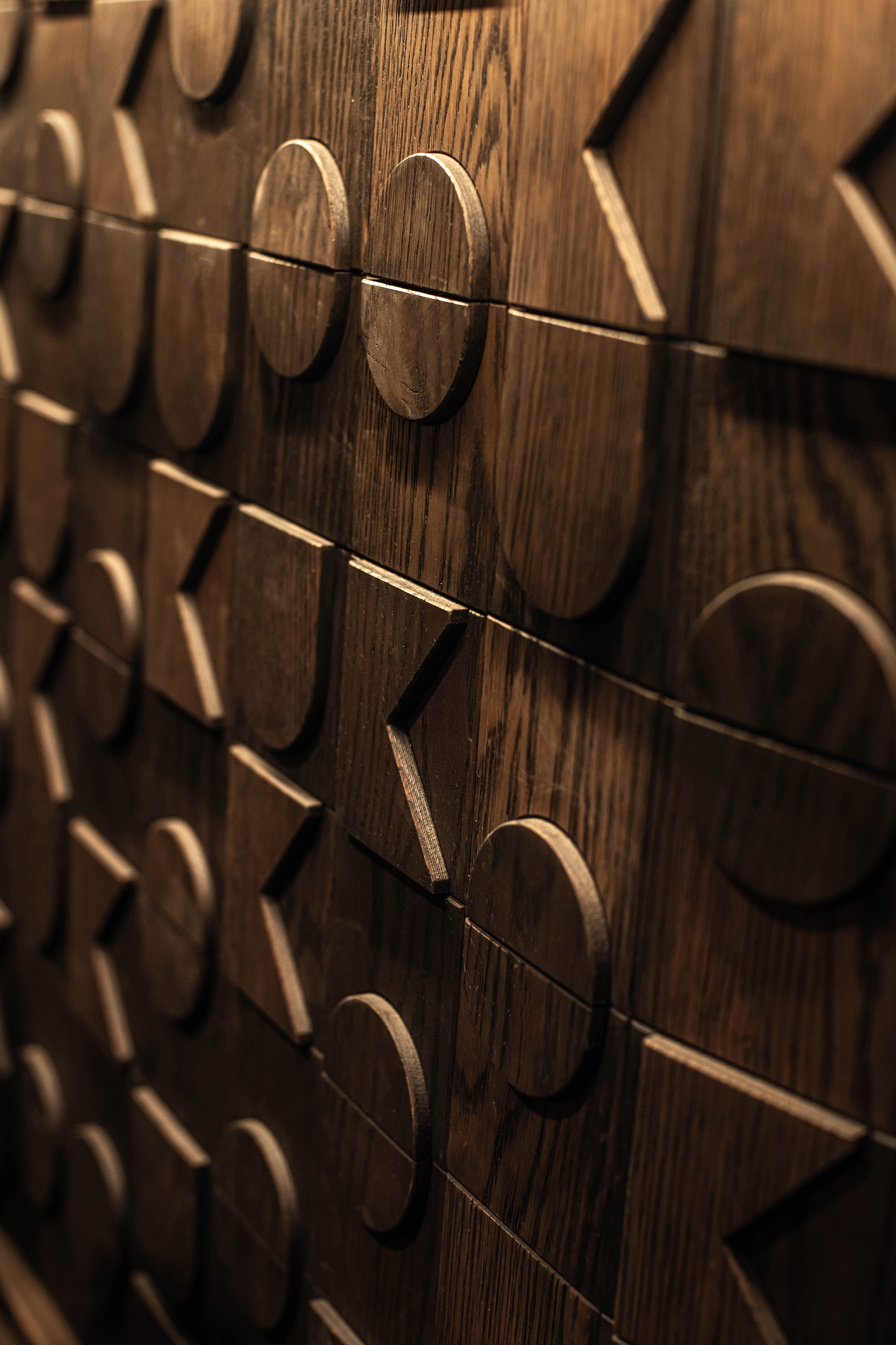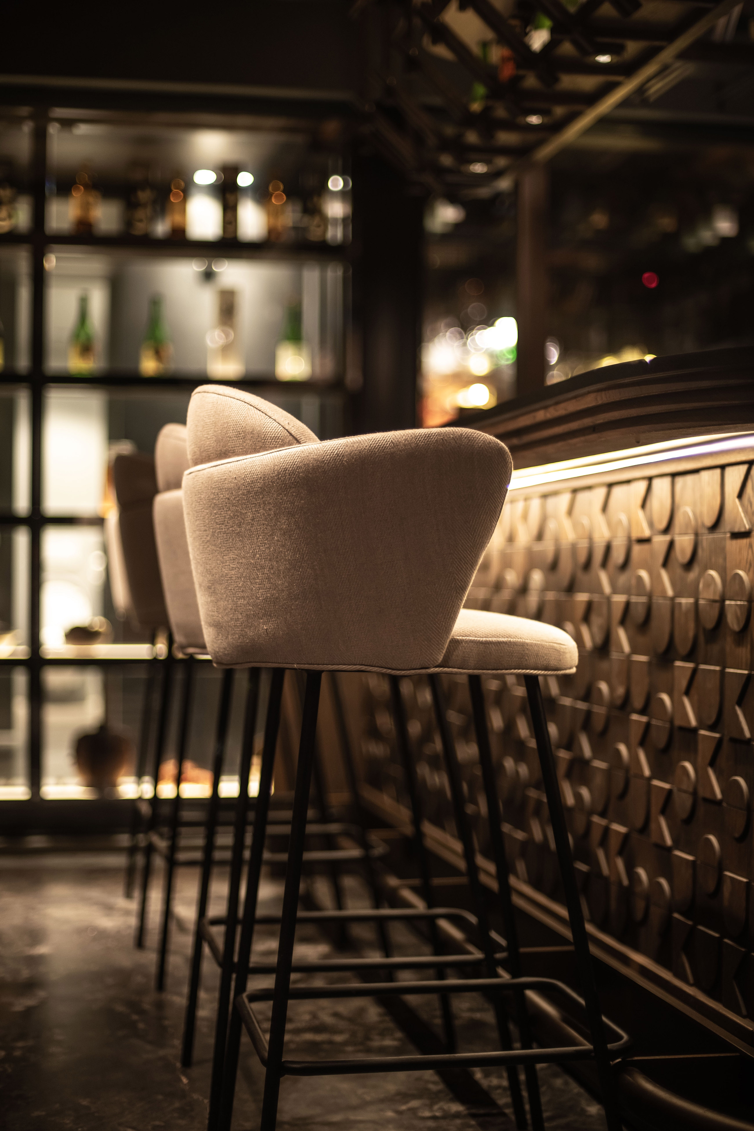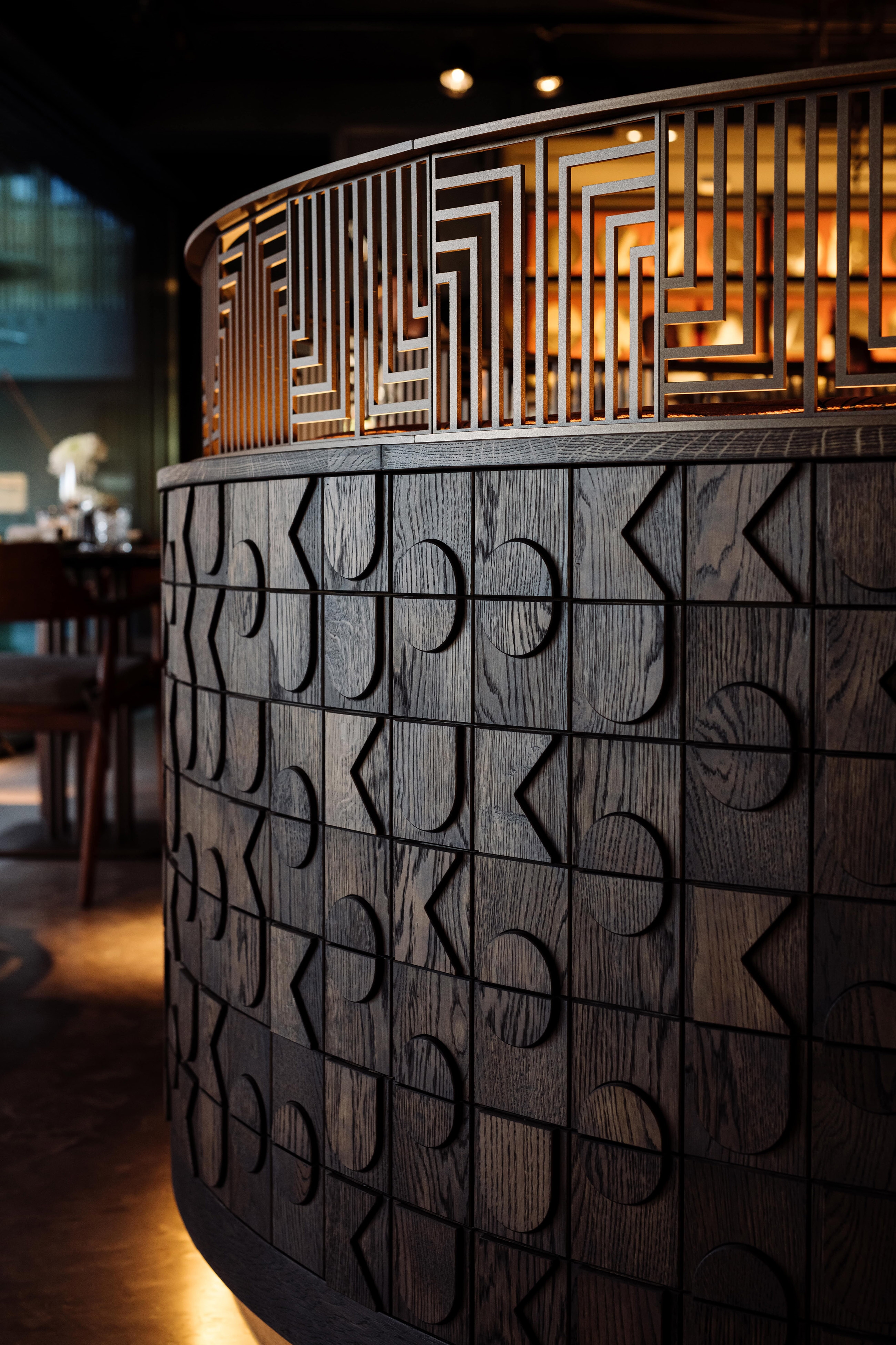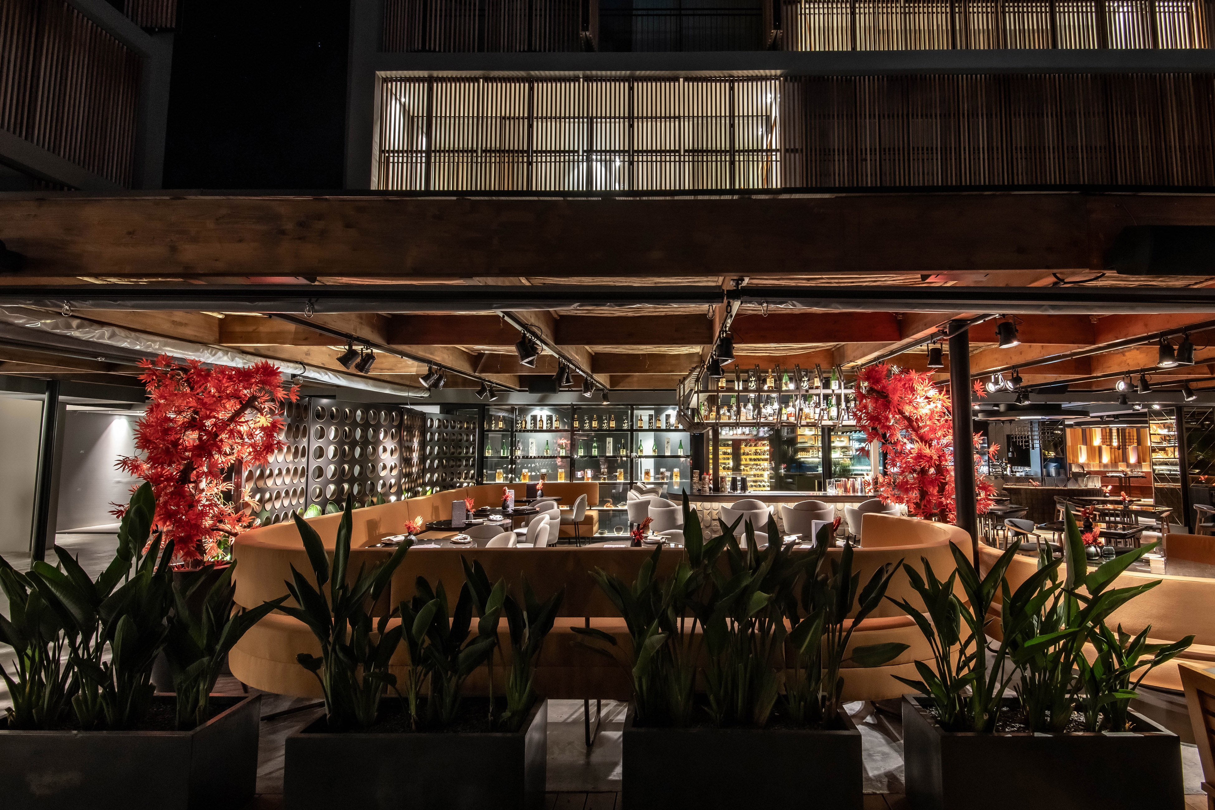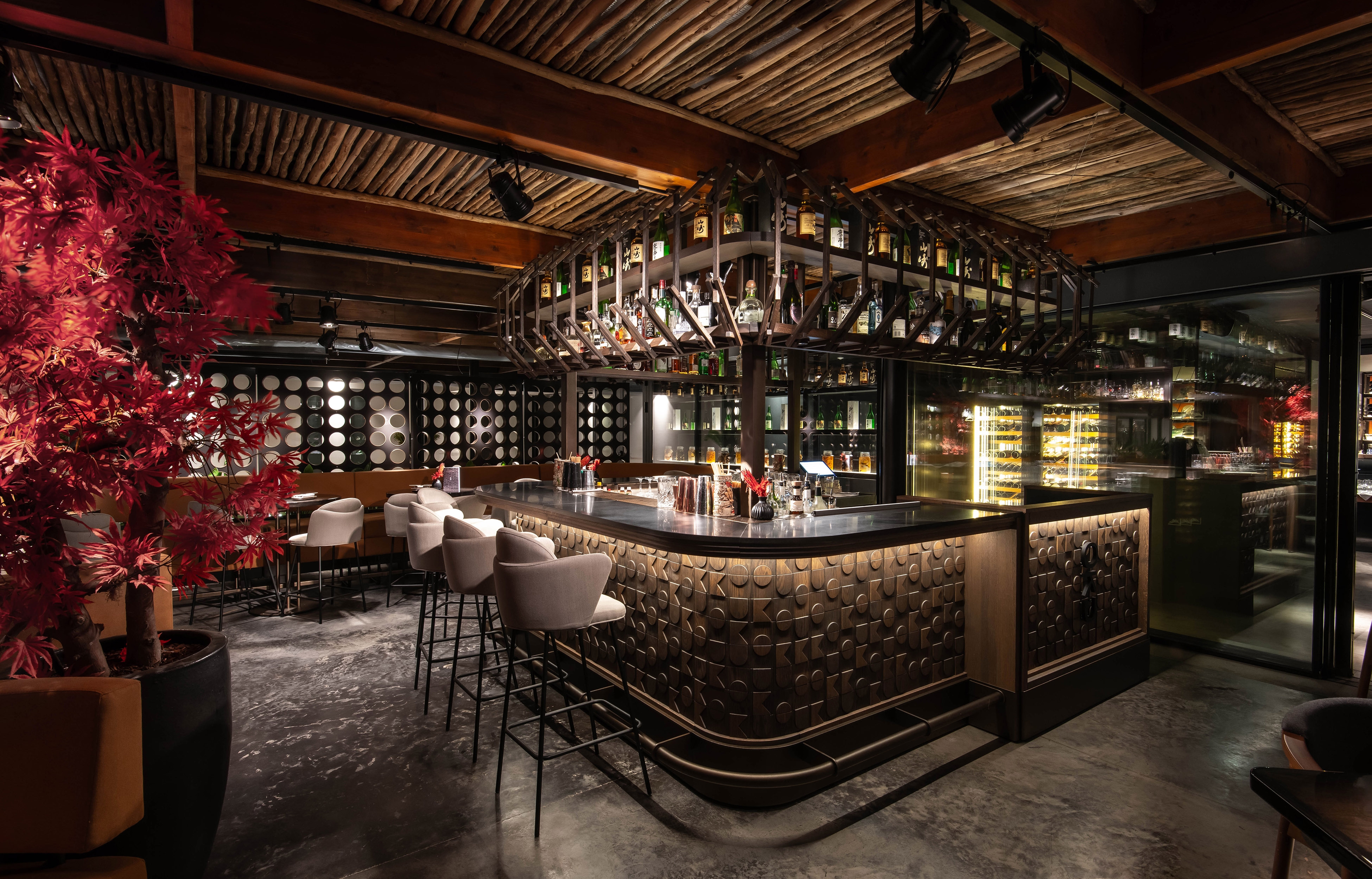 Interiors reflect the Japanese inspiration with fan-like shapes and minimalist metal work that echoes the Japanese ryokan style, creating a completely different concept from the hotel whilst holding international allure for future expansion. Design showcases modern oblique lines, warm bronze mirrors, and flashes of vibrant orange (a nod to the bird of paradise flower seen alongside the hotel’s pool). Elements are inspired by nature, from the indoor-outdoor concept of the terrace, to the textures of ash wood panels, bamboo, washed linen, natural stone and earthenware crockery; combining for a striking ambiance to enjoy our signature fusion delicacies. Drawing much inspiration from the Japanese Wabi-Sabi principle, the restaurant celebrates the ancient aesthetic vision of finding ‘beauty in imperfection’ in using natural and rustic elements across the interiors and architecture, from earthenware crockery to the linen tableware and brushed concrete floors. The new bar section is inspired by the traditional Japanese Isakaya sake bars with caged feature shelves and wooden panelling with the letters O, K, and U cleverly hidden throughout, an homage to the inner-space meaning of OKU.