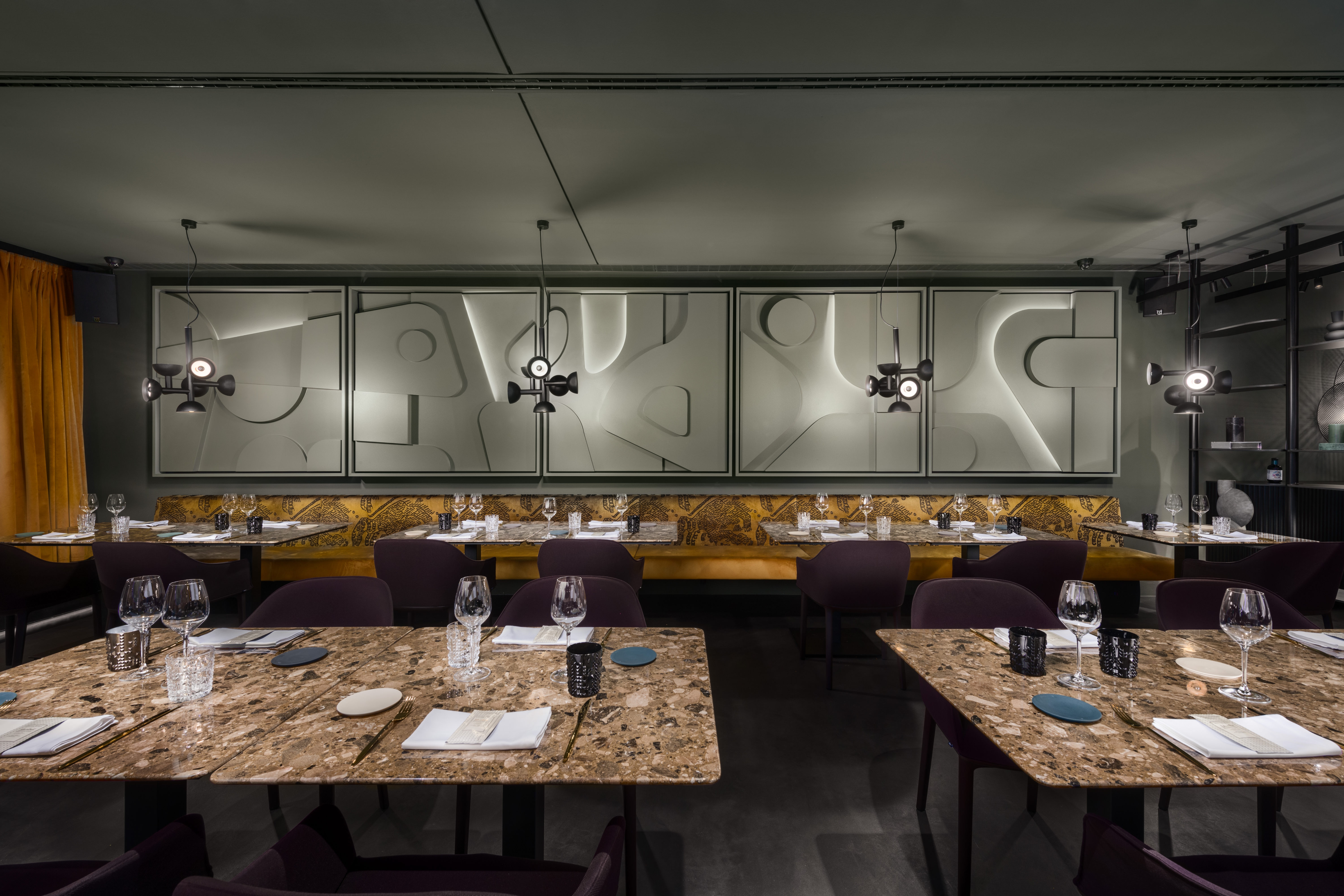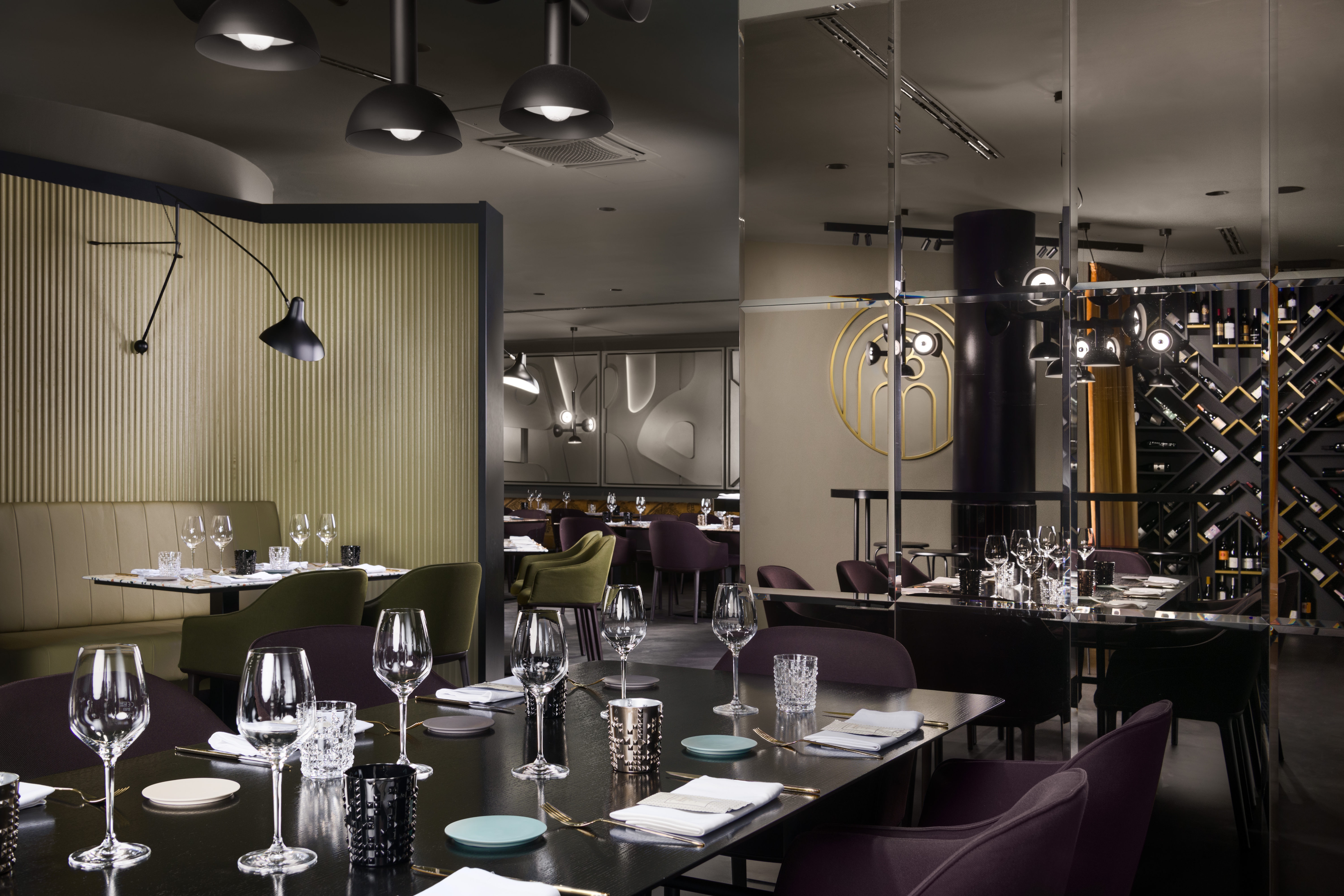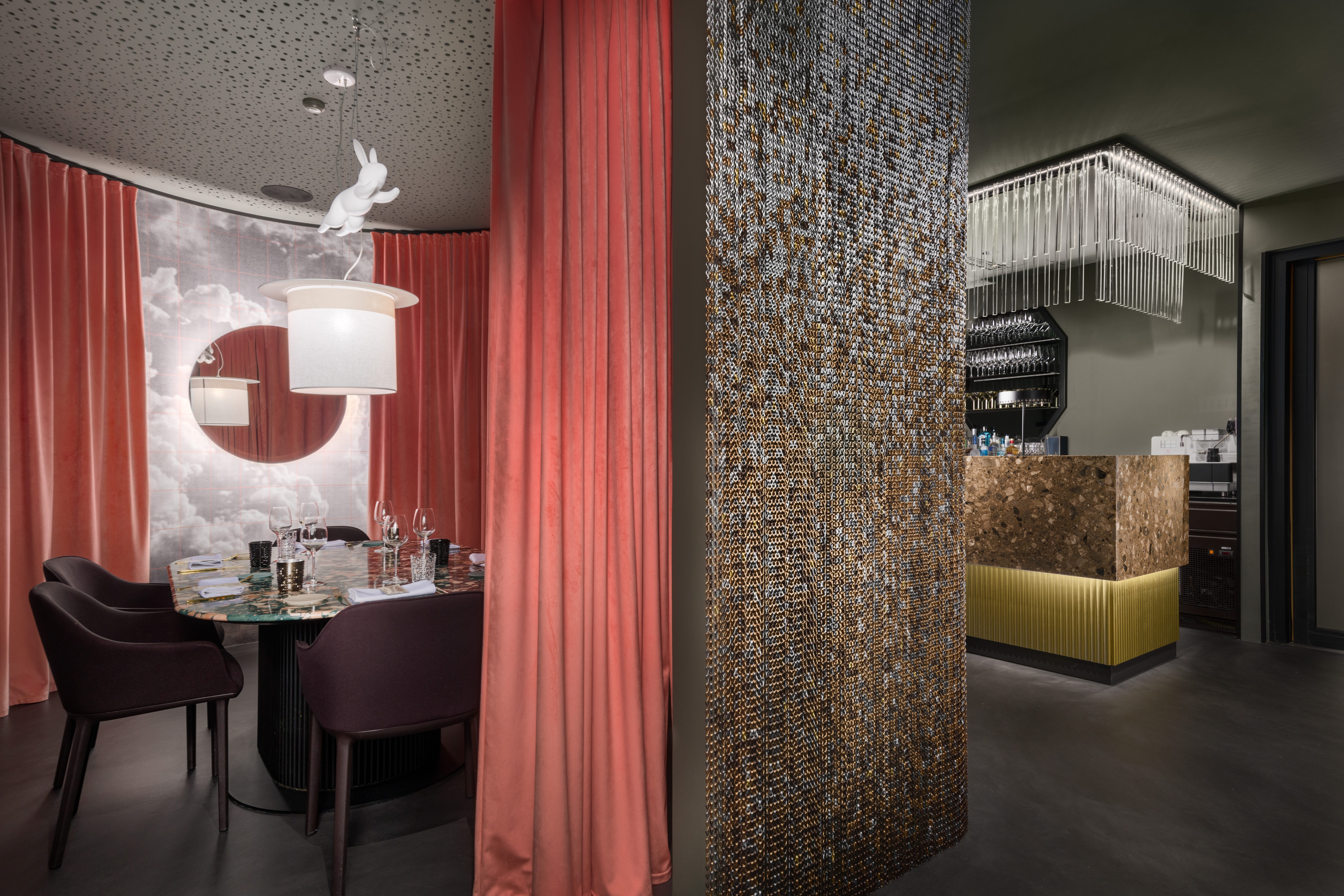 In 2022 the Architects designed and carried out the renovation of the exisitng restaurant; today named Magnet. Space has a size of approx. 300m2 and offers 80 seats inside and 40 seats outside. The entire image of the interior is strung around a cylindrical concrete core, which represents a structural element of the office building in which the restaurant is located. Left side of the restaurant is dedicated to bar and wine corner and more unformal normal and medium-high seating. On the central core are attached upholstered separes which create first visual impression upon arrival. Right side of the restaurant offers high community table seating and flexible seating along long bench equiped with a special custom made artwork. Restaurant offers a smaller multifunctional stage for dinning or live music performances during dinning. Inside of main structural core is used for the purpose of a private dinning, offering high level of privacy. Range of materials used in interior goes from resin floor, natural stone used for counters and table tops, design fabrics for upholstery, custom made wooden millwork panelling, custom made metal table lamps and chandelier and antique mirrors.