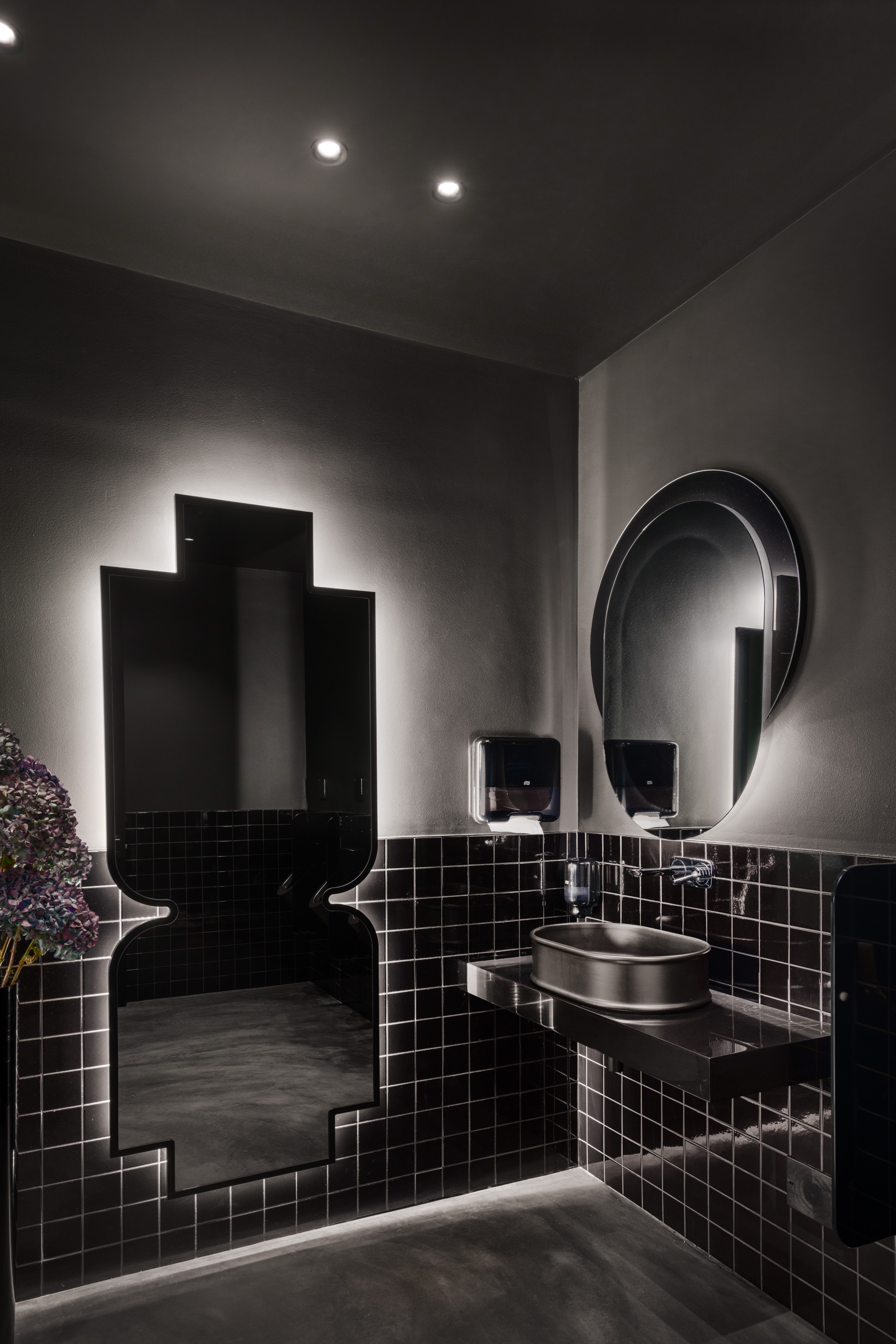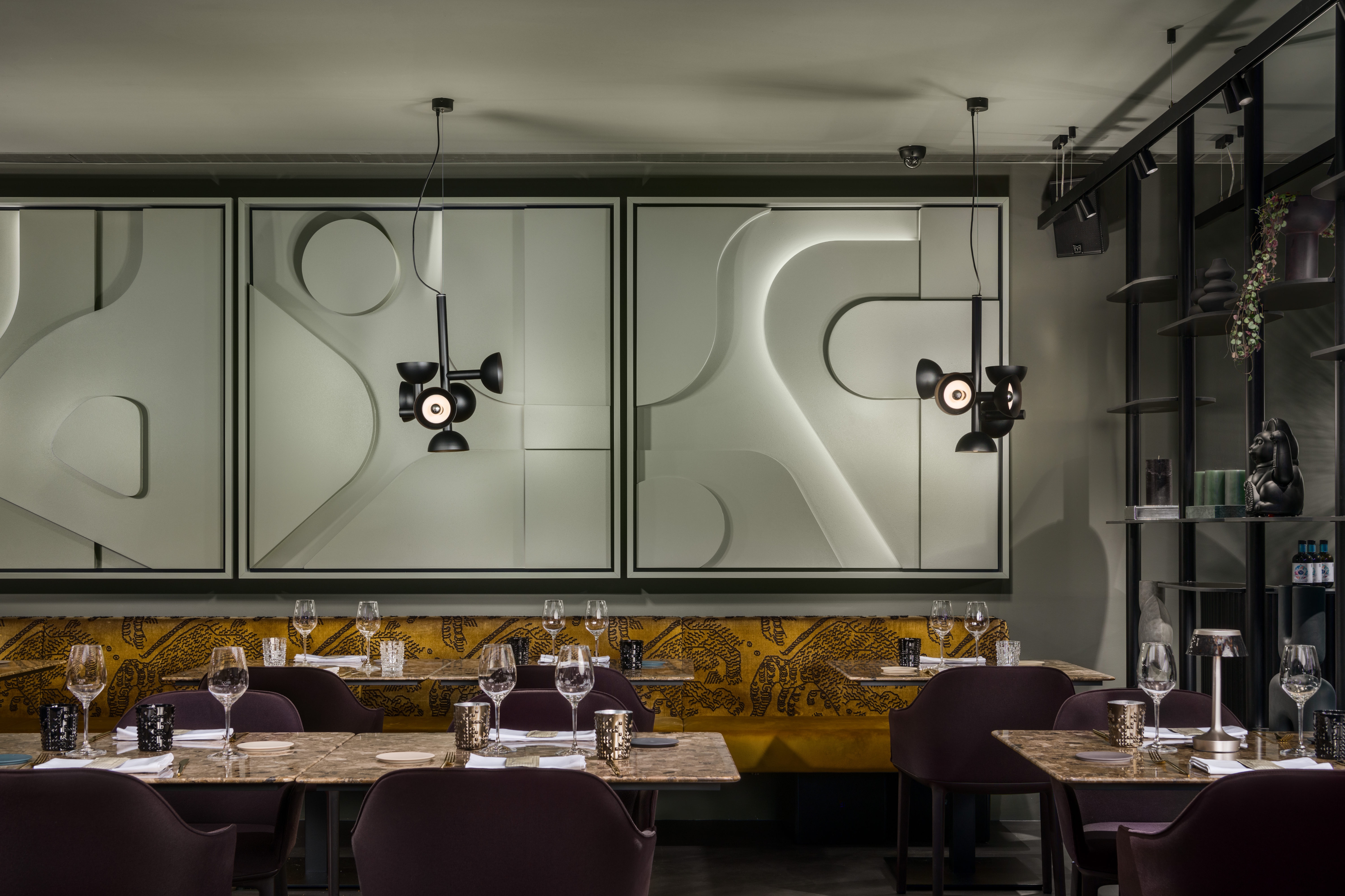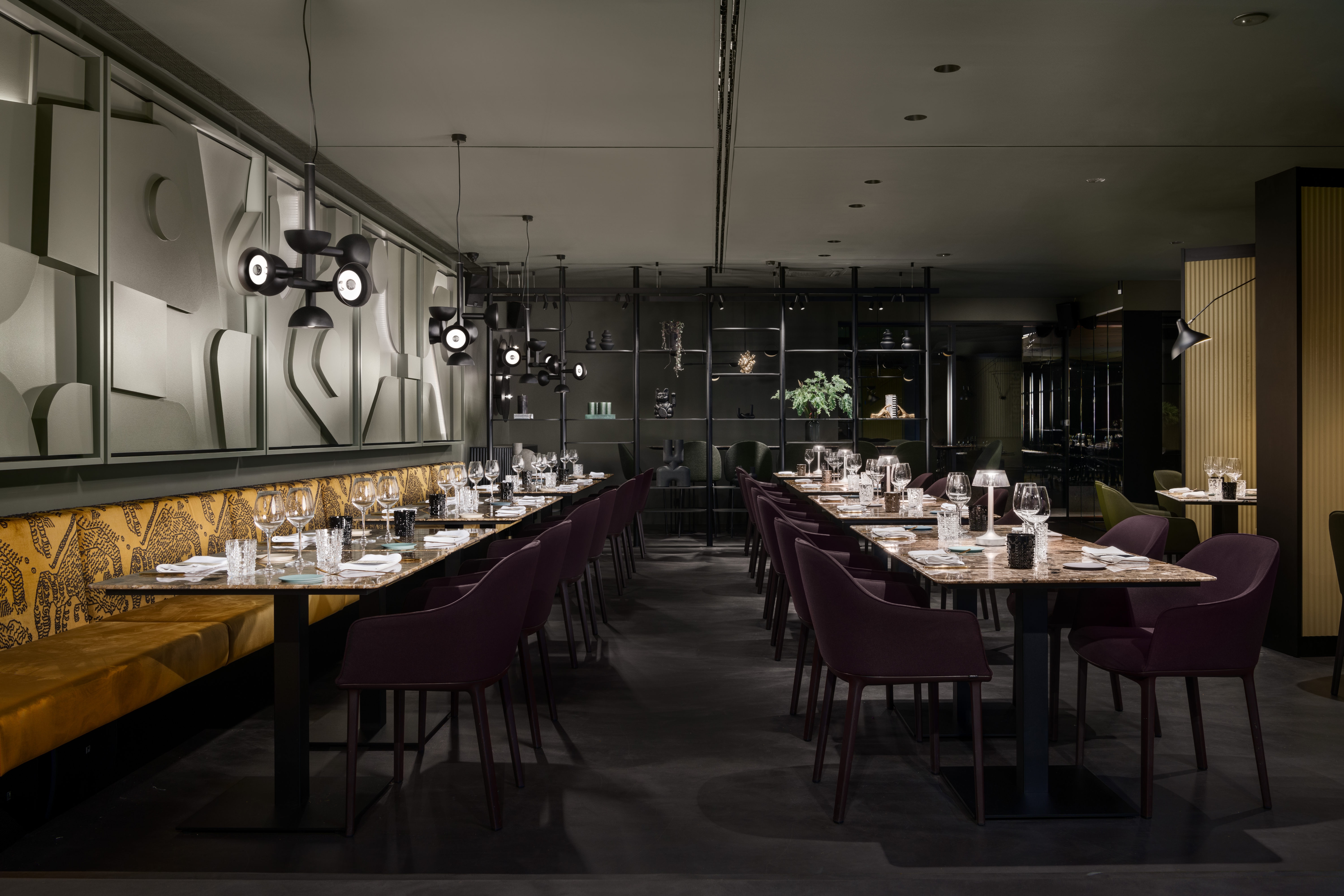 In 2022 the Architects designed and carried out the renovation of the exisitng restaurant; today named Magnet. Space has a size of approx. 300m2 and offers 80 seats inside and 40 seats outside. The entire image of the interior is strung around a cylindrical concrete core, which represents a structural element of the office building in which the restaurant is located. Left side of the restaurant is dedicated to bar and wine corner and more unformal normal and medium-high seating. On the central core are attached upholstered separes which create first visual impression upon arrival. Right side of the restaurant offers high community table seating and flexible seating along long bench equiped with a special custom made artwork. Restaurant offers a smaller multifunctional stage for dinning or live music performances during dinning. Inside of main structural core is used for the purpose of a private dinning, offering high level of privacy. Range of materials used in interior goes from resin floor, natural stone used for counters and table tops, design fabrics for upholstery, custom made wooden millwork panelling, custom made metal table lamps and chandelier and antique mirrors.