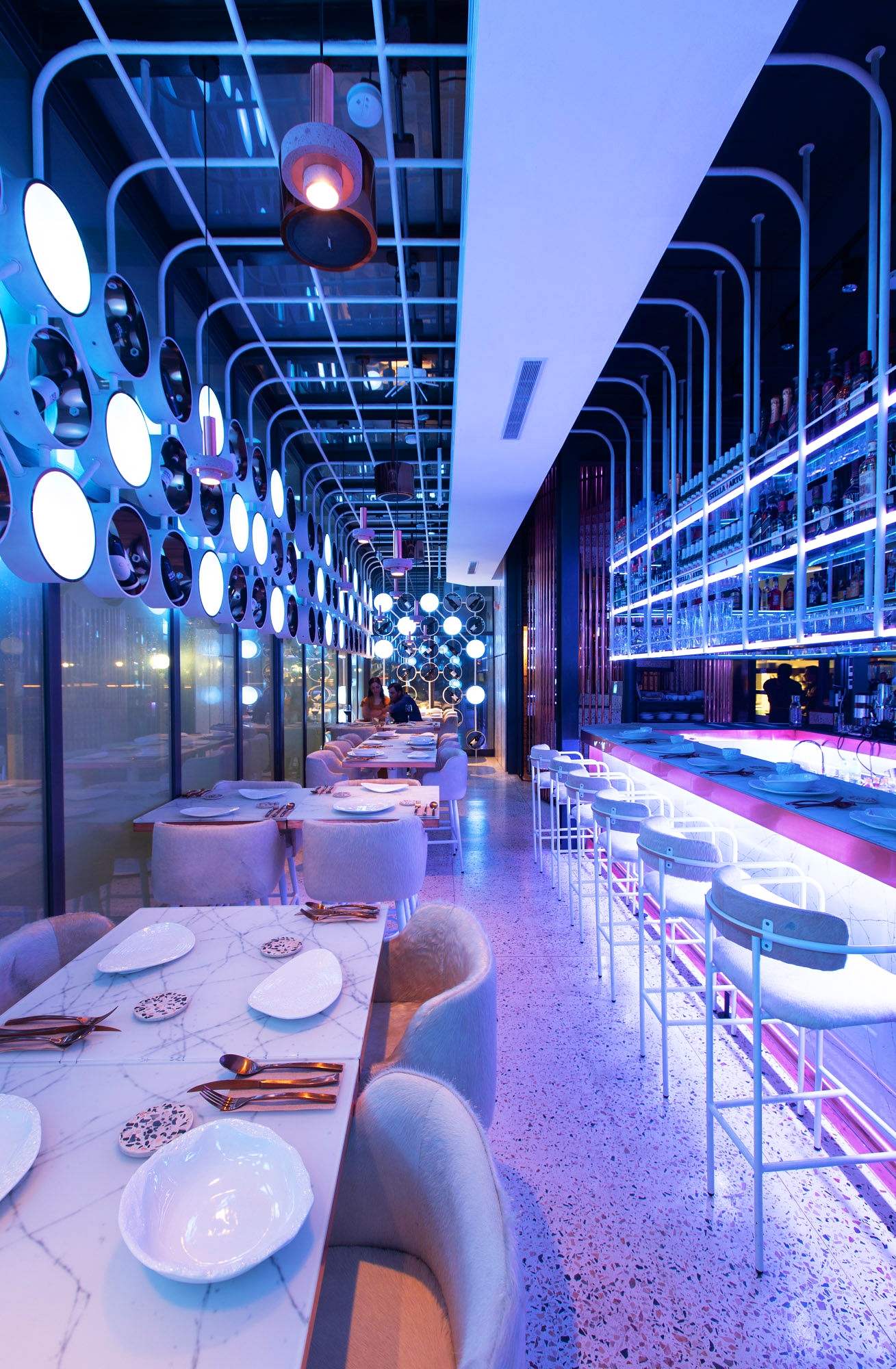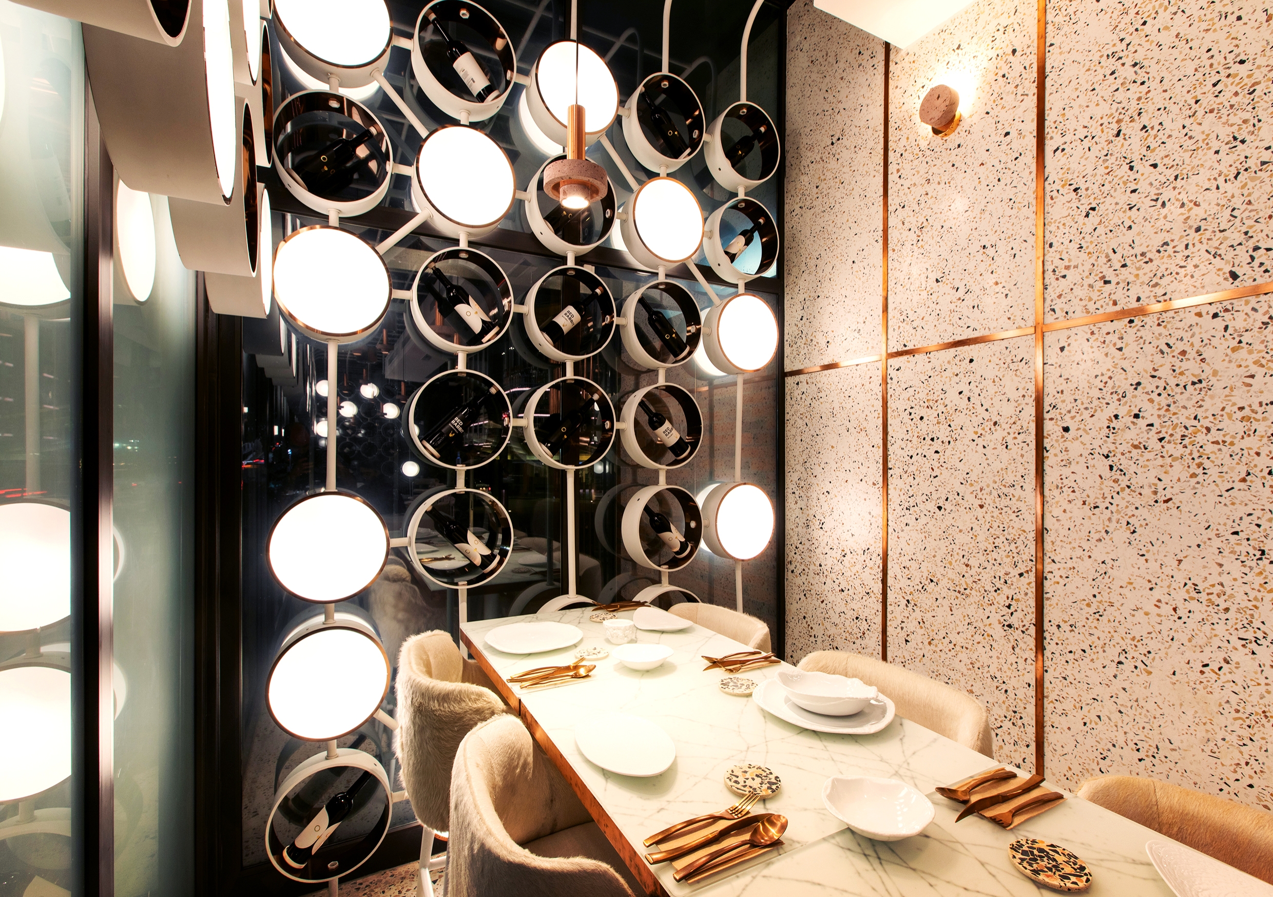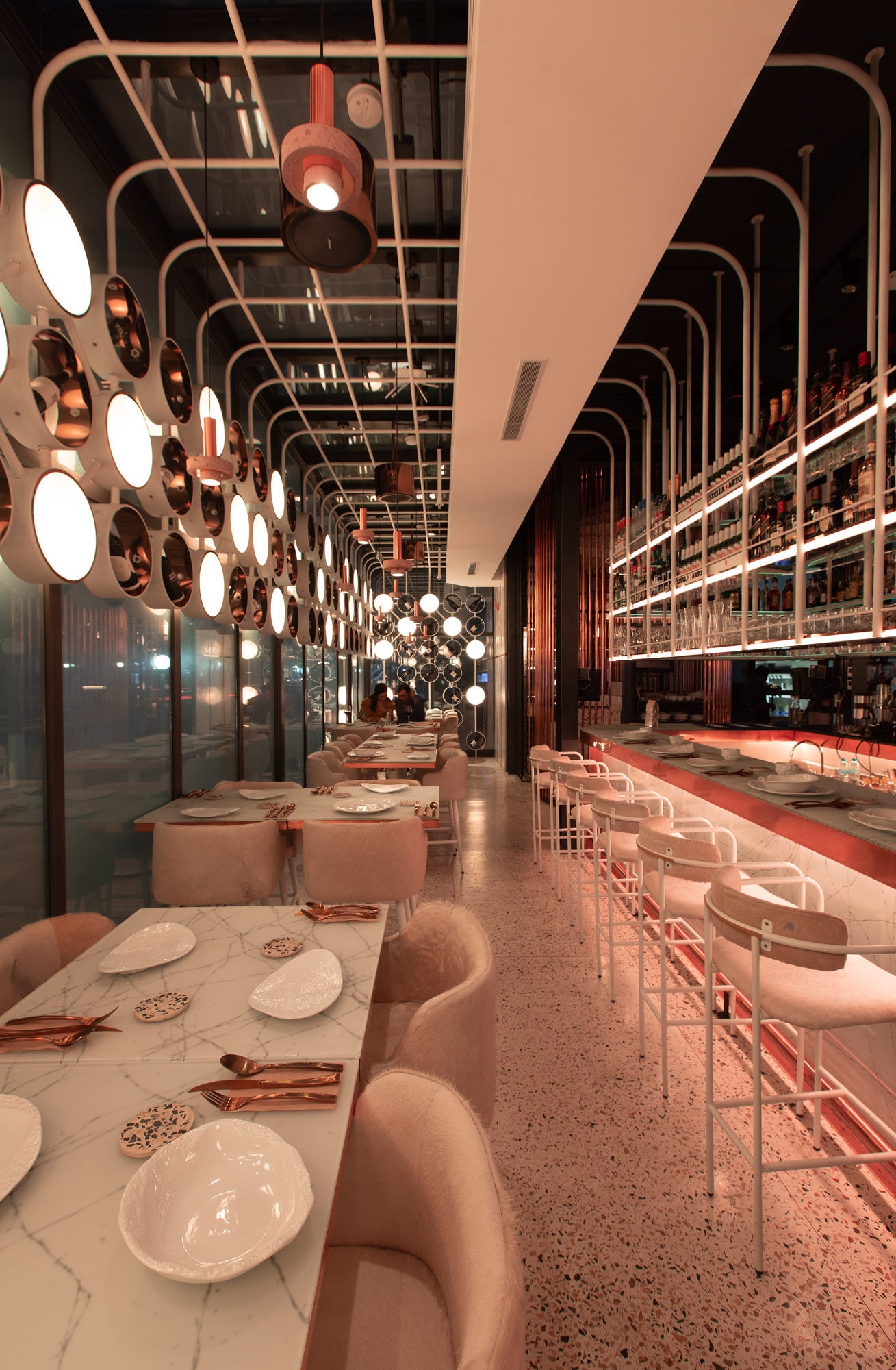 Inspired by the old distilleries, alcohol perfumed the environment through copper pipes and travelled to settle in the huge alembics. A metal structure and glazed walls enclose the contemporary version of these historic workshops; copper pipes, arranged to elegantly embrace the passage of time, take the leading role in the restaurant. The terrazzo floors and walls, the polished copper and the leather detail in the furniture complement the artisan style of Mexican cuisine and design.