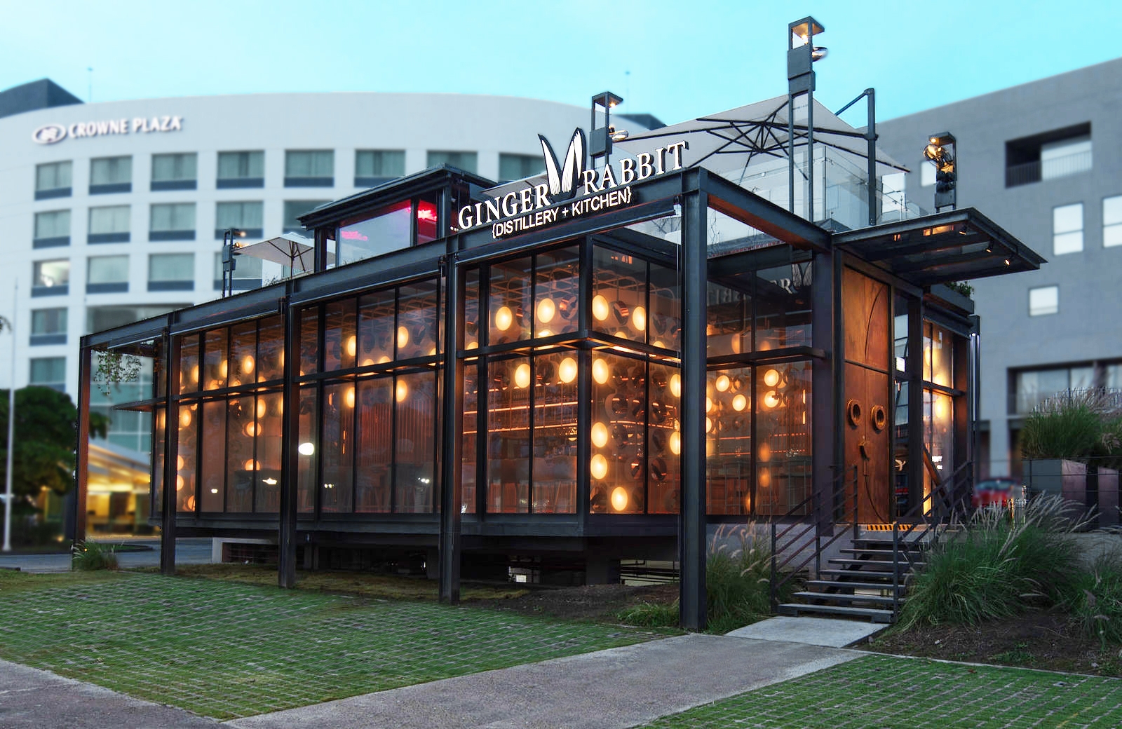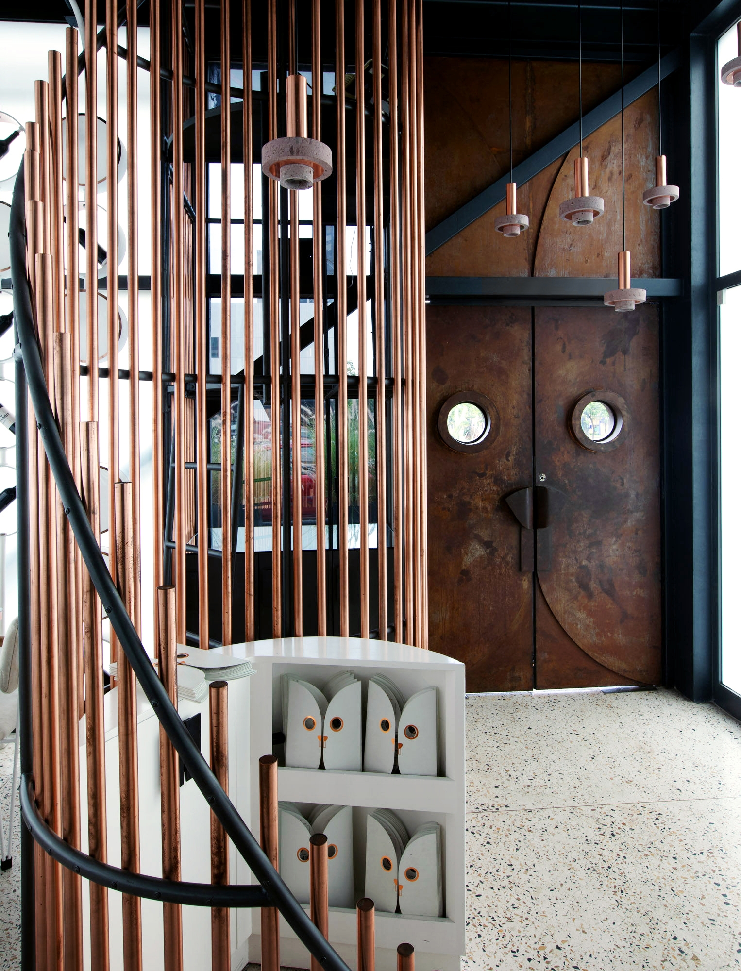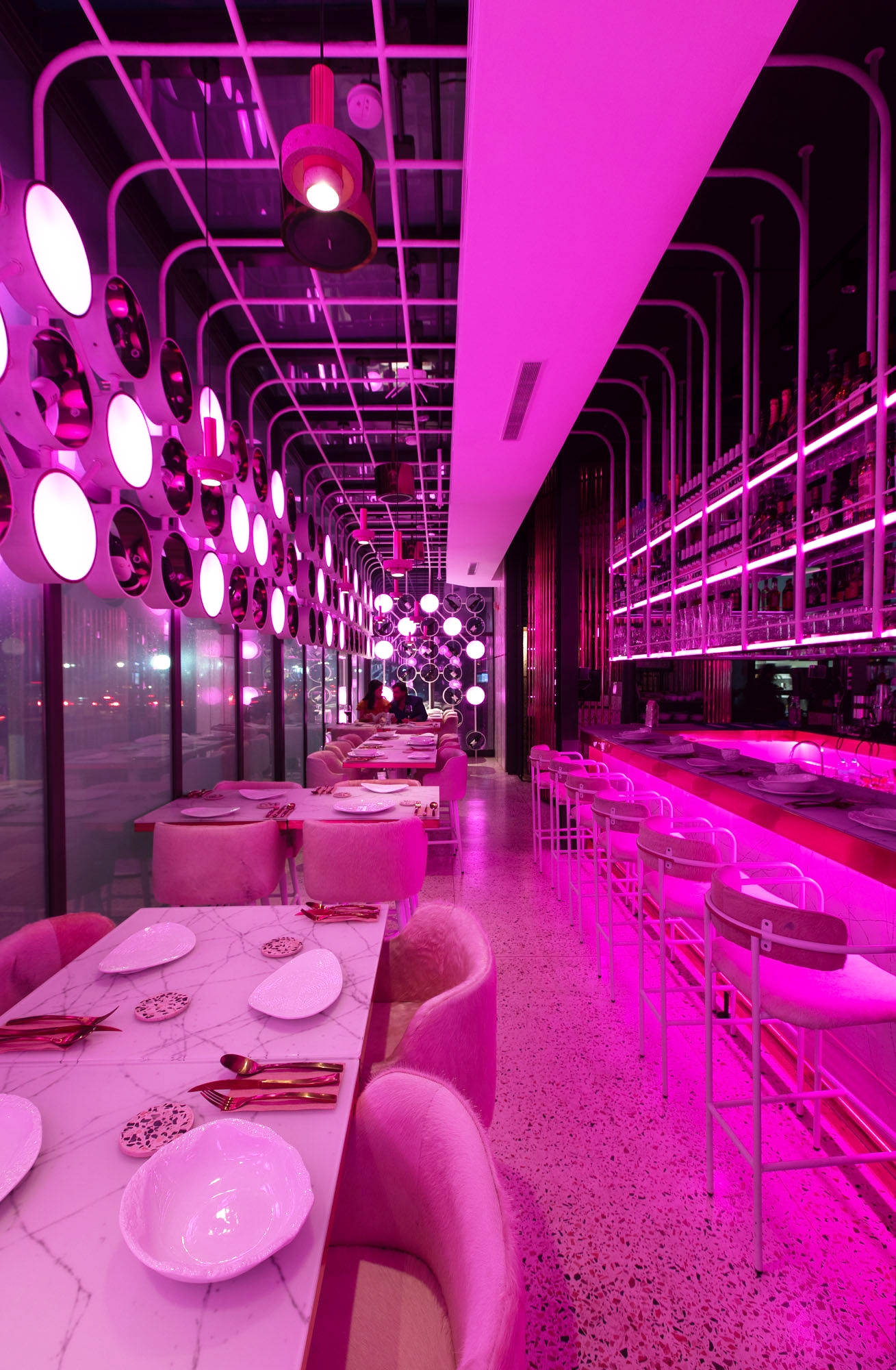 Inspired by the old distilleries, alcohol perfumed the environment through copper pipes and travelled to settle in the huge alembics. A metal structure and glazed walls enclose the contemporary version of these historic workshops; copper pipes, arranged to elegantly embrace the passage of time, take the leading role in the restaurant. The terrazzo floors and walls, the polished copper and the leather detail in the furniture complement the artisan style of Mexican cuisine and design.