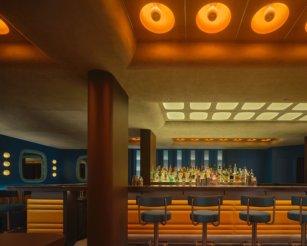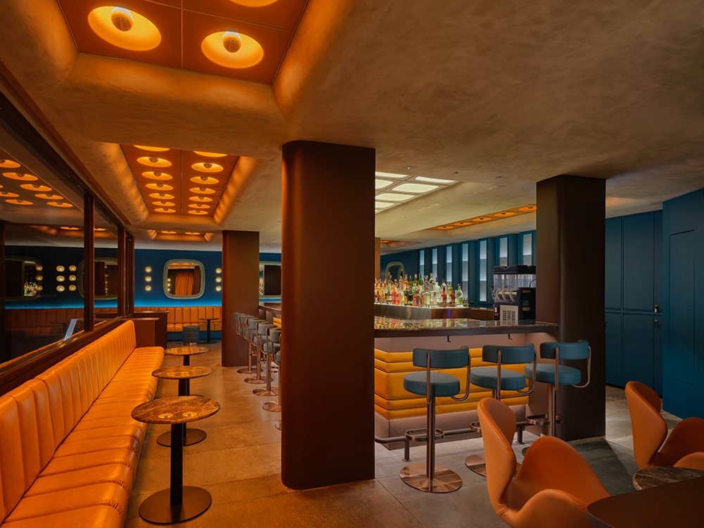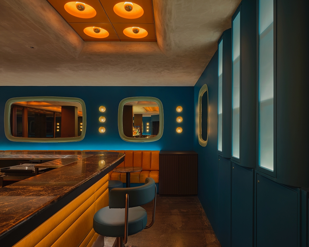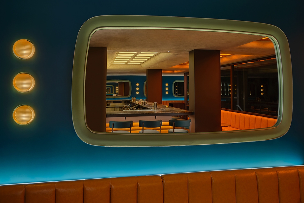 The bar's interior design encapsulates the spirit of the 1960s, drawing inspiration from Bauhaus, Modernism, Brutalism, and Postmodernism to craft a unique retro-futuristic ambiance. The entrance pathway, reminiscent of a '60s cinema with high-gloss, retro-styled TVs, serves as a time portal for patrons, leading them into an interactive environment. The bar layout promotes engagement, allowing customers to observe and interact with mixologists, fostering a convivial atmosphere. Seating arrangements cater to both individual patrons and larger groups, encouraging socialization. The design melds textured concrete and a color palette inspired by brutalism with lively orange-green hues from postmodernism, creating a playful yet raw vibe. Lighting is a key feature, with acrylic and frosted glass diffusing light for a contemporary touch, while retro chromed bulbs offer controlled illumination. The décor integrates shapes from '60s televisions into the bar's architecture, with curved forms and innovative geometries that are both nostalgic and avant-garde.
