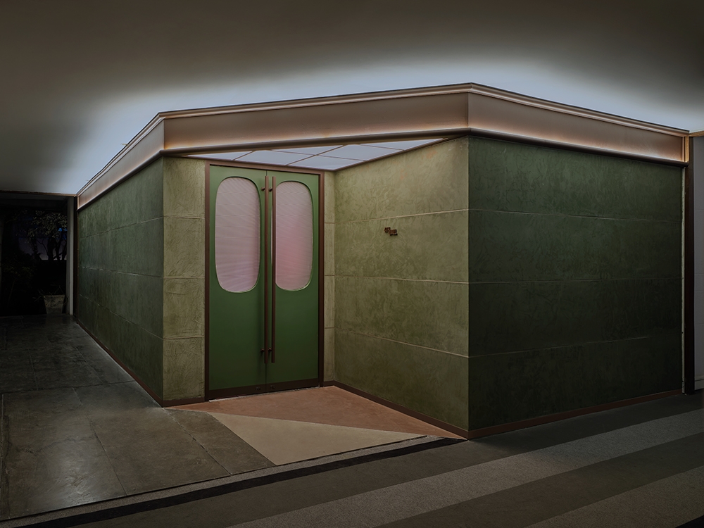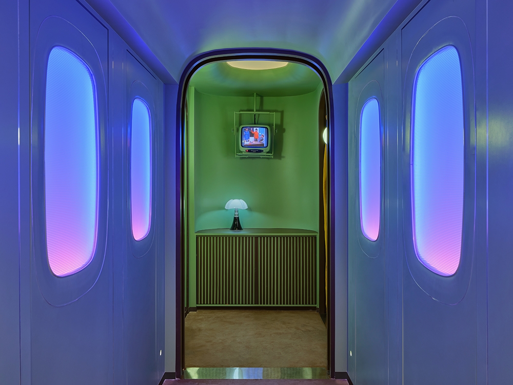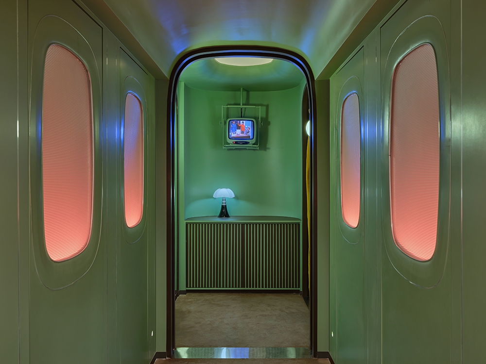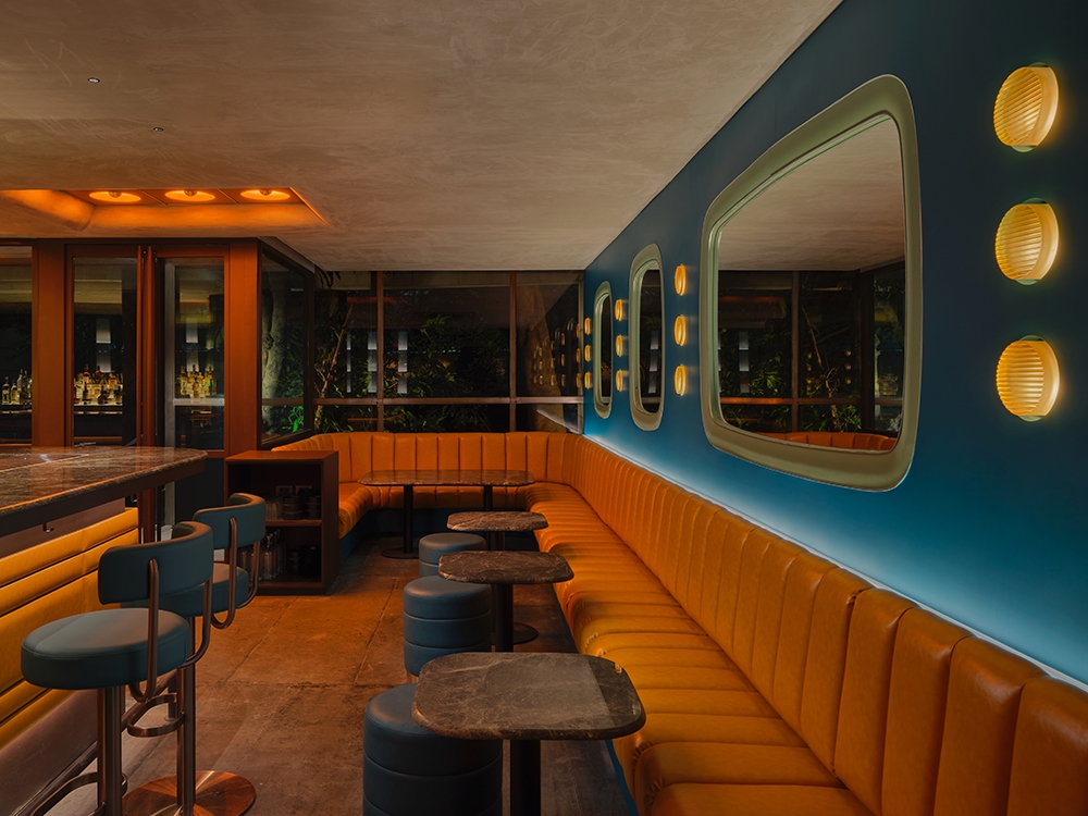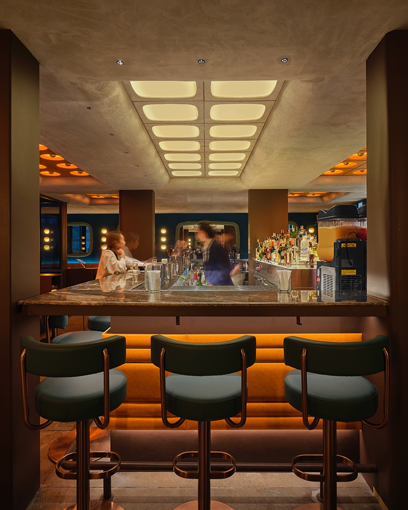 The bar's interior design encapsulates the spirit of the 1960s, drawing inspiration from Bauhaus, Modernism, Brutalism, and Postmodernism to craft a unique retro-futuristic ambiance. The entrance pathway, reminiscent of a '60s cinema with high-gloss, retro-styled TVs, serves as a time portal for patrons, leading them into an interactive environment. The bar layout promotes engagement, allowing customers to observe and interact with mixologists, fostering a convivial atmosphere. Seating arrangements cater to both individual patrons and larger groups, encouraging socialization. The design melds textured concrete and a color palette inspired by brutalism with lively orange-green hues from postmodernism, creating a playful yet raw vibe. Lighting is a key feature, with acrylic and frosted glass diffusing light for a contemporary touch, while retro chromed bulbs offer controlled illumination. The décor integrates shapes from '60s televisions into the bar's architecture, with curved forms and innovative geometries that are both nostalgic and avant-garde.